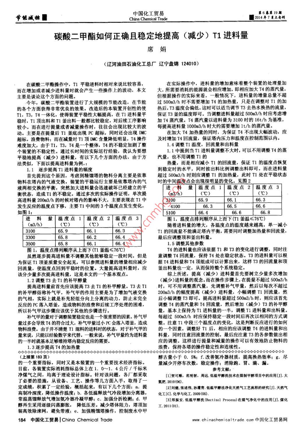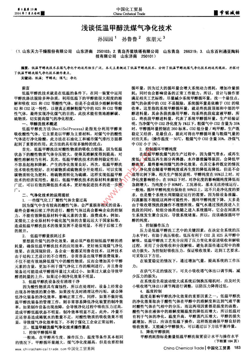 幕6幕19騮中國化工貿(mào)易2014年7周上旬利圓China Cmheical Trade■節(jié)能臧雄淺談低溫甲醇洗煤氣凈化技術(shù)孫園園1孫魯魯2張朋元3(1.山東天力干燥股份有限公司山東濟南250103;2青島齊星鐵塔有限公司山東青島266319:3.山東百利通亞陶科技有限公司山東濟南250101)擠要:低溫甲醇洗技術(shù)在煤氣凈化中的運用相當廣泛。本文主要概逑了低溫甲醇洗技術(shù),分析了低溫甲醇洗煤氣凈化技術(shù)的運用現(xiàn)狀,并探討了低溫甲醇洗煤氣凈化技術(shù)操作要點鍵詞:低溫;甲醇洗;煤氣;凈化前言循環(huán)量,因為過大的循環(huán)量會增大系統(tǒng)動力消耗,增加冷量損低溫甲醇洗技術(shù)就是在低溫的條件下,在同一裝置中運用耗,同時也會影響設(shè)備的正常工作能力。所以,設(shè)計與操作要甲醇洗滌法脫除多種雜質(zhì),利用低溫下的甲醇能很大程度的溶滿足相關(guān)工藝標準,盡量減少系統(tǒng)甲醇循環(huán)量,找一個最佳點解和吸收H2S和C02等酸性氣體、但是不會或很少溶解和吸收煤氣的雜質(zhì)中的C02不易脫除,系統(tǒng)循環(huán)量是依賴于C02的吸H2和C02這一特性,以便真正溶解粗煤氣中的H2S和C02等酸收率。這里指的系統(tǒng)甲醇循環(huán)量,就是終洗段頂部和中部的甲性氣體,最終實現(xiàn)凈化煤氣的目的。此技術(shù)能有效地溶解碳、醇進料量,其余各段洗滌用甲醇,均系終洗段底富液甲醇,所硫物質(zhì),切實提高煤氣的凈化程度。以,終洗段甲醇進料量,代表了系統(tǒng)甲醇循環(huán)量。生產(chǎn)經(jīng)驗證、甲醇洗技術(shù)概述明,當凈煤氣中C02凈化度為1%以下,粗煤氣中C02含量為35%低溫甲醇洗方法( RectiSolProcess)是指充分利用甲醇來時,甲醇循環(huán)量控制在260標米。C02組分量/噸甲醇,生產(chǎn)既吸收酸性氣體。它主要是以甲醇為主要材料,對煤氣中的酸性穩(wěn)定又經(jīng)濟,是最佳點,據(jù)此可得出甲醇循環(huán)量與粗煤氣量的氣體進行凈化除酸,此方法在石油化工和城市煤氣排污方面都對應(yīng)關(guān)系;(操作溫度一50℃,粗煤氣中C02含量35%,凈煤氣起到了重要的作用。此方法的具有很多獨特的優(yōu)點:中CO2小于1%)首先,低溫甲醇洗法對酸性物質(zhì)的吸收力較強。因為低溫2.控制循環(huán)甲醇純度狀態(tài)下的酸性物質(zhì)氣體分壓較大,使得其溶解度得到提高,對在低溫甲醇洗煤氣的生產(chǎn)過程中,因為煤氣帶水,或再生酸性溶解相當有利。其次,低溫甲醇洗技術(shù)的溶劑穩(wěn)定性好,度低,或低壓再生部分再沸器,水冷器泄漏等原因,會降低甲不容易起泡和降解,產(chǎn)生的凈化效果良好。再次,低溫甲醇洗醇濃度,最終影響到煤氣的凈化效果,在其它條件既定的情況技術(shù)吸收性較好。在對碳物質(zhì)或硫物質(zhì)分開處理后,可以實現(xiàn)下,凈化度會隨著甲醇純度或再生度的降低而降低,但是不會碳物質(zhì)轉(zhuǎn)化為肥料、將硫物質(zhì)轉(zhuǎn)化為硫磺,這樣實現(xiàn)低溫甲醇成等比例下降。相關(guān)生產(chǎn)情況說明,甲醇純度在95%以上時,對技術(shù)的經(jīng)濟實用性。最后,低溫甲醇洗技術(shù)的原材料來源較為凈化度影響較小;在95%以下時,對凈化度的影響隨純度降低而廣泛,可以有效的降低技術(shù)成本,更好地促進技術(shù)的進一步推急劇增大,當純度小于80%時,工況惡化,基本無法持續(xù)運行一般地,循環(huán)甲醇純度應(yīng)保持在98%以上,這不只是凈化度的要、氣凈化技術(shù)的運用現(xiàn)狀求,也是整個系統(tǒng)長周期穩(wěn)定運行的需要。因為除設(shè)備泄漏1.一些煤氣化工廠酸性氣體含量過高閃蒸膨脹不徹底這兩種可能性外,循環(huán)甲醇純度下降,大多是因為煤氣中含有較高的酸性氣體,會嚴重損害相關(guān)的設(shè)備,由于吸收塔預(yù)洗段操作不理想所致。煤氣水通過預(yù)洗段進入主最終會影響后續(xù)工序的進行,酸性氣體過高會影響企業(yè)的控制洗段的同時,輕組分油類也隨之進入系統(tǒng)循環(huán),它會在閑蒸再力,不能有效降低原材料中硫元素的含量,浪費成本。例如,生系統(tǒng)發(fā)生聚合反應(yīng),導致系統(tǒng)堵塞,所以,應(yīng)該確保循環(huán)甲某煤化工企業(yè)原材料中硫化氫氣體的含量遠遠大于國家標準,醇的純度。造成低溫甲醇洗技術(shù)的效果發(fā)揮不是很明顯,不利于后續(xù)工作3.控制操作壓力的展開。壓力是低溫甲醇洗工藝中的關(guān)鍵因素,在決定全系統(tǒng)的壓2.低溫甲醇量損耗過多力水平時,有助于高壓吸收,低壓有利于C02及H2S從甲醇中要想提升煤氣的凈化效果,就必須嚴格控制低溫甲醇的消解吸。低溫甲醇洗工藝充分應(yīng)用了壓力變化來促進吸收和解吸耗量,確保低溫甲醇洗技術(shù)的應(yīng)用效率,更好地實現(xiàn)煤氣凈化過程,采用了分段吸收和分段解吸。避免表面?zhèn)鬟f過程中的推效果。在我國現(xiàn)階段,各企業(yè)一般都采用魯奇技術(shù),這種技術(shù)動力損失。為控制好吸收壓力,保證吸收效果,達到工藝要求由于結(jié)構(gòu)工藝設(shè)計的不合理性,非常容易出現(xiàn)甲醇浪費現(xiàn)象可采取以下方法。不僅不能有效地降低煤氣中的酸性物質(zhì),反而會增加其中甲醇在裝置穩(wěn)定的情況下,通過增加氣量,提高系統(tǒng)的工作壓元素的含量,更加不利于煤氣凈化工作的順利進行。并且魯奇力;裝備還