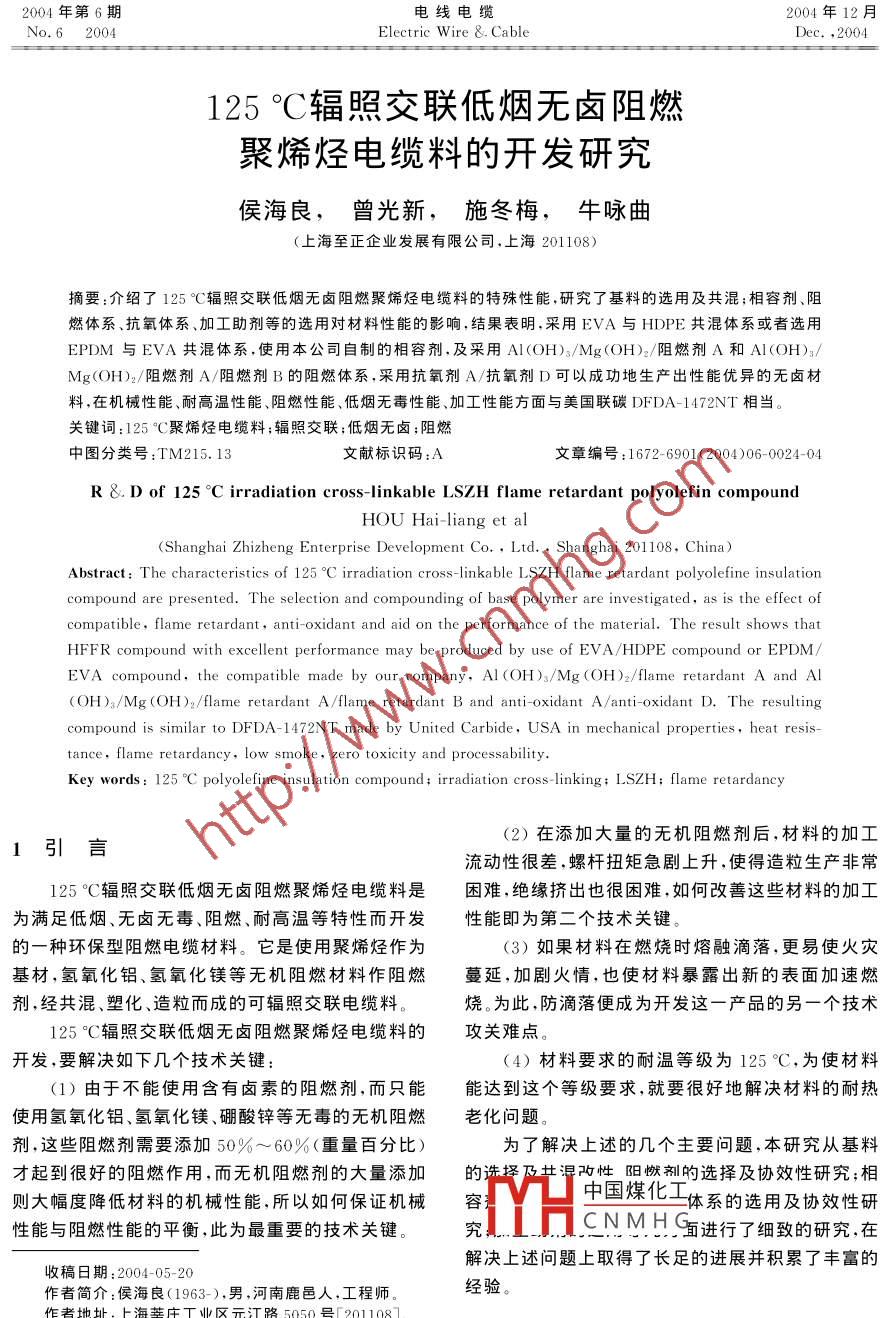 125 C輻照交聯低煙無鹵阻燃聚烯烴電纜料的開發(fā)研究