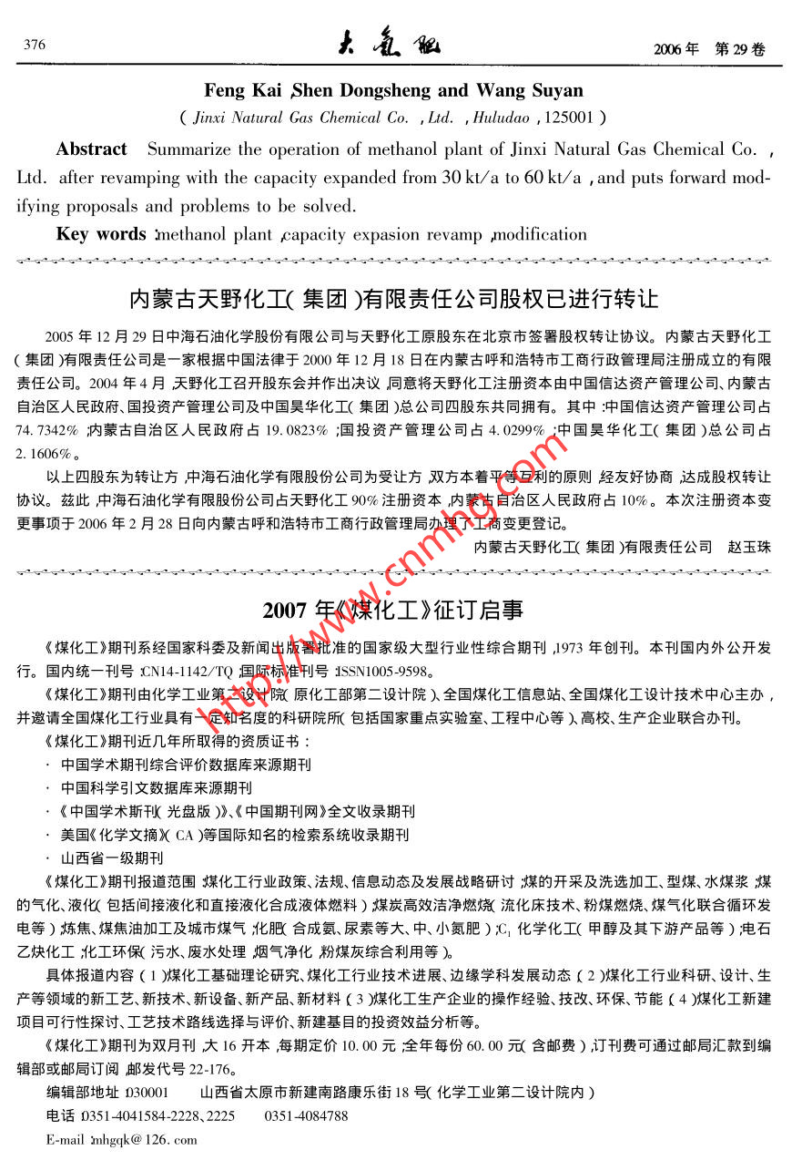2006年12月大氛觸Dec.2006第29卷第6期_Large Scale Nitrugenous. Fertilizer IndustryVol. 29 No.6甲醇裝置擴(kuò)產(chǎn)改造后運(yùn)行總結(jié)馮凱沈東升王素巖(錦西天然氣化工有限責(zé)任公司遼寧葫蘆島,125001 )摘要總結(jié)錦西天然 氣化工有限責(zé)任公司30kt/a 甲醇裝置擴(kuò)產(chǎn)改造至60kt/a后的運(yùn)行情況結(jié)合裝置存在的問題提出了整改措施。關(guān)鍵詞甲醇裝置擴(kuò)產(chǎn)改造整改中圖分類號:TQ223. 12文獻(xiàn)標(biāo)識碼B文章編號:1002-5782( 2006 )06-0374-031概述1。這也是布朗型合成氨和甲醇聯(lián)產(chǎn)的最大優(yōu)錦西天然氣化工有限責(zé)任公司30k/a甲醇勢。裝置其工藝流程為原料氣壓縮、脫硫、轉(zhuǎn)化、合成4)甲醇合成用離心式壓縮機(jī)進(jìn)行部分改造。氣壓縮、甲醇合成、預(yù)精餾、主精餾、甲醇回收、甲因去除了部分惰性氣體后循環(huán)氣減少所以只對醇貯存及工藝?yán)淠夯厥盏取?002 年11月投入壓縮機(jī)的轉(zhuǎn)子、定子等進(jìn)行改造并更換了大功率運(yùn)行后發(fā)現(xiàn)存在幾個問題:①因布朗型合成氨_二電機(jī)。段爐加入50%的過量空氣導(dǎo)致二段轉(zhuǎn)化氣中的5)對30kt/a甲醇合成工段進(jìn)行設(shè)備、管道.惰性氮?dú)夂枯^高,甲醇循環(huán)氣中的氮?dú)夂扛叩群怂隳軌驖M足60kt/a甲醇生產(chǎn)能力的要求,達(dá)40% ,甲醇合成的轉(zhuǎn)化率較低弛放氣量增加;維持不變。②大量的惰性氣體導(dǎo)致循環(huán)氣量加大增加了壓6 )精餾工序預(yù)精餾塔和主精餾塔的殼體不縮機(jī)的功耗③氫碳比失調(diào)④合成氨裝置能力有變更換了填料。主精餾塔底增加1臺再沸器。限制約甲醇裝置擴(kuò)產(chǎn)的能力。針對以上問題決7 )新增工藝?yán)淠浩崴?臺。定將該裝置擴(kuò)產(chǎn)至60kt/a生產(chǎn)規(guī)模。甲醇裝置擴(kuò)產(chǎn)改造后于2004年8月投入運(yùn)行截至2006年6月,已累計(jì)運(yùn)行22個月期間2甲 醇改造內(nèi)容及運(yùn)行對裝置進(jìn)行了72h考核各項(xiàng)技術(shù)指標(biāo)如表1所1)取消原30kt/a甲醇裝置從合成氨二段爐示。為考察裝置的生產(chǎn)能力系統(tǒng)負(fù)荷比設(shè)計(jì)值后引甲醇合成氣的原料氣路線增加1臺外熱式略高。的一段蒸汽轉(zhuǎn)化爐單獨(dú)生產(chǎn)甲醇合成氣轉(zhuǎn)化爐表160kt/a 甲醇考核指標(biāo)的壓力和溫度分別控制在3.0MPa和8479C其項(xiàng)目設(shè)計(jì)值考核值出口的甲烷含量小于5%盡可能降低甲醇合成原料氣用量/m3. h-163397554氣中的惰性氣體含量。-段爐出口增加1臺廢熱燃料氣用量/m3. h-'37504036鍋爐用來回收熱量產(chǎn)生低壓蒸汽。加入的二氧化碳量/m3. h -15381159弛放氣量/m3. h-'833393602)增加1臺二氧化碳壓縮機(jī)向原料氣中補(bǔ).噸甲醇電耗/kW387374充加入CO2 ,調(diào)節(jié)氫碳比適宜( 2. 05左右)。增加甲醇產(chǎn)量/ h-17.587.882臺往復(fù)式原料天然氣壓縮機(jī)給-段爐供氣。3裝置存在問題及解決措施.3 )甲醇弛放氣一部分返回合成氨的二段爐收稿日期2006-06-08 ;收到修改稿日期2006-10-19。繼續(xù)作為原料氣使用,因布朗型合成氨二段爐加作者簡介馮凱男1990年畢業(yè)于沈陽化工學(xué)院高級工入了50%的過量空氣在其冷箱工段會將多余的程師現(xiàn)在錦西天然氣化工有限責(zé)任公司生產(chǎn)處從事合成氨工藝氮?dú)饫淠WC了合成氨所需工藝氣氫碳比為3管理工作。聯(lián)系電話0429-2907087。376大氛配2006年第29卷Feng Kai Shen Dongsheng and Wang Suyan( Jinxi Natural Gas Chemical Co. , Ltd. , Huludao , 125001 )AbstractSummarize the operation of methanol plant of Jinxi Natural Gas Chemical Co. ,Ltd. after revamping with the capacity expanded from 30 kt/a to 60 kt/a , and puts forward mod-ifying proposals and problems to be solved.Key words :methanol plant capacity expasion revamp ,modification內(nèi)蒙古天野化工(集團(tuán))有限責(zé)任公司股權(quán)已進(jìn)行轉(zhuǎn)讓2005年12月29日中海石油化學(xué)股份有限公司與天野化工原股東在北京市簽署股權(quán)轉(zhuǎn)讓協(xié)議。內(nèi)蒙古天野化工(集團(tuán))有限責(zé)任公司是-家根據(jù)中國法律于2000年12月18日在內(nèi)蒙古呼和浩特市工商行政管理局注冊成立的有限責(zé)任公司。2004年4月天野化工召開股東會并作出決議同意將天野化工注冊資本由中國信達(dá)資產(chǎn)管理公司、內(nèi)蒙古自治區(qū)人民政府、國投資產(chǎn)管理公司及中國昊華化工(集團(tuán))總公司四股東共同擁有。其中:中國信達(dá)資產(chǎn)管理公司占74. 7342% ;內(nèi)蒙古自治區(qū)人民政府占19. 0823% ;國投資產(chǎn)管理公司占4. 0299% ;中國昊華化工(集團(tuán))總公司占2.1606%。以上四股東為轉(zhuǎn)讓方中海石油化學(xué)有限股份公司為受讓方雙方本著平等互利的原則經(jīng)友好協(xié)商達(dá)成股權(quán)轉(zhuǎn)讓協(xié)議。茲此中海石油化學(xué)有限股份公司占天野化工90%注冊資本,內(nèi)蒙古自治區(qū)人民政府占10%。本次注冊資本變更事項(xiàng)于2006年2月28日向內(nèi)蒙古呼和浩特市工商行政管理局辦理了工商變更登記。內(nèi)蒙古天野化工(集團(tuán))有限責(zé)任公司趙玉珠2007年《煤化工》征訂啟事《煤化工》期刊系經(jīng)國家科委及新聞出版署批準(zhǔn)的國家級大型行業(yè)性綜合期刊,1973年創(chuàng)刊。本刊國內(nèi)外公開發(fā)行。國內(nèi)統(tǒng)