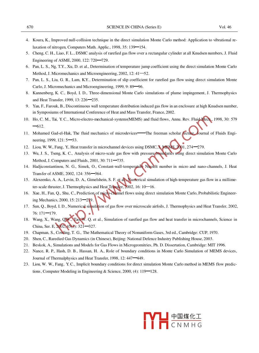 Vol. 46 No. 6SCIENCE IN CHINA(Series E)December 2003Similarity of ideal gas flow at different scalesWANG Moran(王沫然)& LI Zhixin(李志信)Department of Engineering Mechanics, Tsinghua University, Beijing 100084, ChinaCorrespondenceshouldbeaddressedtoWangMoran(email:moralwang99@mails.tsinghua.edu.cn)Received March 7. 2003Abstract The similarity of ideal gas flow at different scales is investigated analytically and numeri-cally. With the compressible and rarefied effects considered, two dimensionless parameters, Machnumber and Knudsen number, are proposed as the similarity criterions, because the Reynoldnumber can be expressed by the mach number and the Knudsen number of ideal gases. A DSMCmethod is used to simulate flows at different scales with the same Ma and Kn, including subsonicchannel flows and the supersonic flows over a hot plate. Comparisons between the results of different scales show that the normalized fields of macroscopic quantities are the same. This confirmsthe similarity. Especially, the results indicate that the micro flow are similar to the rarefied flow ofideal gas, which suggests that many transformations are available from the existing rarefied flowresults to the micro flowKeywords: similarity, ideal gas flow, direct simulation Monte CarloDOI:10.1360/02ye0072When the molecular mean free path becomes comparable with an important characteristiclength of the flow system, the continuum assumption breaks down and the particle nature of fluidmust be explicitly taken into account!. Such flows, generally named rarefied gas flows, havebeen investigated widely and deeply due to their important applications in aeronautics and astronautics. The rarefied gas flow can be described by the Boltzmann equation from a molecular pointof view. However, it is rather difficult to obtain analytical and numerical solutions of the boltz-mann equation. The direct simulation Monte Carlo(DSMC) method proposed by Bird offers avaluable tool for predicting the high Kn flow behavior. The dSMC method has been proved andwidely applied to the analysis of rarefied gas flow problems in the past several decades 3-9In recent years, MEMS/NEMS have been developed and the micro flow has become a hottopic!lo. In micro/nano gas flow, the Knudsen number can be quite high even though the gas is ofNomenclature a, sound speed; P, pressure: Cm, most probable molecular speed; Re, Reynolds number; d, molecular dameter; T, overall temperature; H, height of the computed domain; Tg, gas temperature on wall surfaces; k, Boltamann constant;Kn, Knudsen number; Tin translational temperature; Kn cal, local Knudsen number; Trot, rotational temperature; L, characteristic中國煤化工Mach numbermolecular mean velocity; n, number density; v,moCNMHG;H, dynamic viscosity: 7, mean free path: v, kinetic viscosity; P, density; Erot, rotational energyDer or nternal degree of freedom:or,totalcross-section;At, time step: e, translational energy; Ar, size of a cell; co, freestream; tr, translational mole: w, walot. rotational mode.662SCIENCE IN CHINA (Series E)high density due to the small characteristic length of the micro system. The classical N-s equations are not able to describe the flow accurately, so the dsmc method has been tried and usedto predict micro gas flow and heat transfer since the middle of the 1990s 2-18Since the rarefied gas flows on an original size scale have been investigated maturely and thunderstanding of micro/nano flow mechanism may have a significant bearing on the developmentand design of MEMS/NEMS, the current paper is an attempt to discuss the similarity of ideal gasflow at different scales. Firstly, the similarity is theoretically analyzed. Then, the DSMC method isdeveloped to simulate gas flows and heat transfer at different scales to verify the similarity numericallySimilarity analyIf the traditional incompressible flows in two different-Size systems are considered similarthe dimensionless parameter, Reynolds number, must be equal. For a compressible flow, a moredimensionless parameter, Mach number, plays an important role as well, while in the rarefied ormicro gas flow, the Knudsen number must be also considered since it affects the velocity and tem-perature boundary conditions directly. However, there is a relationship between the three parameters, and one can be expressed in terms of the other twoThe Reynolds number is the ratio of inertial forces to viscous onewhere v is the gas kinetic viscosityThe Mach number is the ratio of flow velocity to the speed of soundwhere a is the sound speed in gasThe Mach number is a dynamic measure of fluid compressibility and may be considered asthe ratio of inertial forces to elastic onesAccording to the molecular theory of gas, for the ideal gas made of smooth rigid elasticherical molecules with a repelling force from each other, the kinematic viscosity is related to themean free path/19)v=P=0.499Xvm≈vmwhere u is the gas dynamic viscosity, i the molecular mean free path and vm the mean molecularspeed, somewhat higher than the sound speed aarhi中國煤化工CNMHGwhere y is the gas specific heat rateNo 6SIMILARITY OF IDEAL GAS FLOW AT DIFFERENT SCALESCombining eqs. (1)-(4), the required relation can be obtainedKn2 ReEq(5)shows that as long as two of the three dimensionless numbers are specific, the third isalso determinate. Then, arbitrary two of the three numbers can be proposed as the similarity criteions In the present paper the Mach number and Knudsen number are selected as the similaritycriterions for ideal gas flow in different-scale systems. That is to say, when the pressure is not toohigh (P< 1000 atm), the temperature is not too high or too low (30 K
