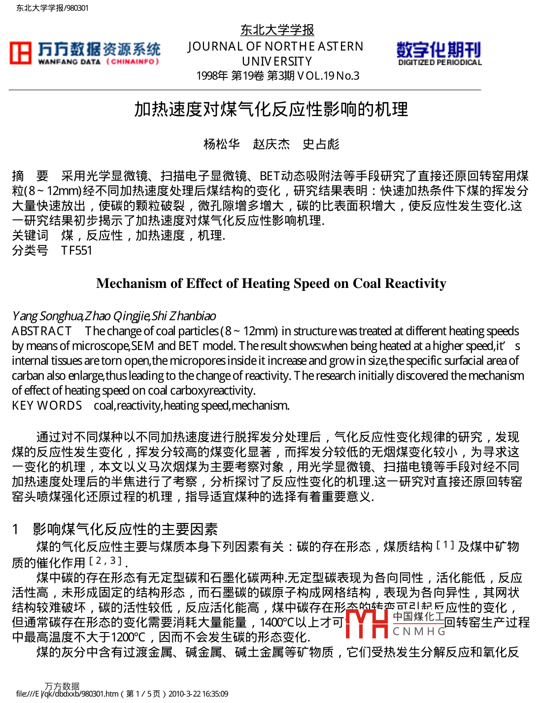 東北大學(xué)學(xué)報(bào)/980301東北大學(xué)學(xué)報(bào)舊資源系統(tǒng) JOURNAL OF NORTHEASTERN數(shù)穿化期刊WANFANG DATA( CHINAINFo)UNIVERSITYDIGITIZED PERIODICAL1998年第19卷第3期VOL.19No3加熱速度對(duì)煤氣化反應(yīng)性影響的機(jī)理?xiàng)钏扇A趙慶杰史占彪摘要采用光學(xué)顯微鏡、掃描電子顯微鏡、BET動(dòng)態(tài)吸附法等手段研究了直接還原回轉(zhuǎn)窯用煤粒(8~12mm經(jīng)不同加熱速度處理后煤結(jié)構(gòu)的變化,研究結(jié)果表明:快速加熱條件下煤的揮發(fā)分大量快速放岀,使碳的顆粒破裂,微孔隙増多增大,碳的比表面積增大,使反應(yīng)性發(fā)生變化這研究結(jié)果初步揭示了加熱速度對(duì)煤氣化反應(yīng)性影響機(jī)理.關(guān)鍵詞煤,反應(yīng)性,加熱速度,機(jī)理.分類號(hào)TF551Mechanism of Effect of Heating Speed on Coal reactivityYang Songhua, Zhao Qingjie Shi ZhanbiaoABStRact The change of coal particles(8-12mm)in structure was treated at different heating speedsby means of microscope SEM and BET model. the result shows when being heated at a higher speed,it sinternal tissues are torn open, the micropores inside it increase and grow in size, the specific surfacial area ofcarban also enlarge, thus leading to the change of reactivity. The research initially discovered the mechanismof effect of heating speed on coal carboxyreactivityKEY WORDS coal, reactivity, heating speed, mechanism通過(guò)對(duì)不同煤種以不同加熱速度進(jìn)行脫揮發(fā)分處理后,氣化反應(yīng)性變化規(guī)律的研究,發(fā)現(xiàn)煤的反應(yīng)性發(fā)生變化,揮發(fā)分較高的煤變化顯著,而揮發(fā)分較低的無(wú)煙煤變化較小,為尋求這變化的機(jī)理,本文以義馬次煙煤為主要考察對(duì)象,用光學(xué)顯微鏡、掃描電鏡等手段對(duì)經(jīng)不同加熱速度處理后的半焦進(jìn)行了考察,分析探討了反應(yīng)性變化的機(jī)理這一研究對(duì)直接還原回轉(zhuǎn)窯窯頭噴煤強(qiáng)化還原過(guò)程的機(jī)理,指導(dǎo)適宜煤種的選擇有著重要意義.影響煤氣化反應(yīng)性的主要因素煤的氣化反應(yīng)性主要與煤質(zhì)本身下列因素有關(guān):碳的存在形態(tài),煤質(zhì)結(jié)構(gòu)[1及煤中礦物質(zhì)的催化作用[2,3]煤中碳的存在形態(tài)有無(wú)定型碳和石墨化碳兩種.無(wú)定型碳表現(xiàn)為各向同性,活化能低,反應(yīng)活性高,未形成固定的結(jié)構(gòu)形態(tài),而石墨碳的碳原子構(gòu)成網(wǎng)格結(jié)構(gòu),表現(xiàn)為各向異性,其網(wǎng)狀結(jié)構(gòu)較難破壞,碳的活性較低,反應(yīng)活化能高,煤中碳存在形杰的埜巒可掃亍應(yīng)性的變化,但通常碳存在形態(tài)的變化需要消耗大量能量,1400°C以上才可行y中國(guó)煤化回轉(zhuǎn)窯生產(chǎn)過(guò)程中最高溫度不大于1200℃,因而不會(huì)發(fā)生碳的形態(tài)變化CNMHG煤的灰分中含有過(guò)渡金屬、堿金屬、堿土金屬等礦物質(zhì),它們受熱發(fā)生分解反應(yīng)和氧化反file///E ak/dbdxxb/980301 htm($51/55)2010-3-22 16: 35: 09東北大學(xué)學(xué)報(bào)/980301應(yīng)脫離碳網(wǎng)格時(shí),會(huì)使碳的網(wǎng)格結(jié)構(gòu)發(fā)生扭曲變形,降低碳反應(yīng)活化能對(duì)于同一種煤來(lái)說(shuō)其中礦物質(zhì)的組成及含量相同,因而不會(huì)造成同一煤種反應(yīng)性的差異.煤質(zhì)結(jié)構(gòu)是指煤的孔隙度,碳晶格扭曲程度.由于碳的氣化反應(yīng)是一個(gè)氣-固兩相相界反應(yīng)反應(yīng)在碳的外表面及碳粒內(nèi)部孔隙或裂縫的內(nèi)表面上進(jìn)行,裂紋越多,孔隙率越大,比表面積越大,越有利于氣化反應(yīng)的進(jìn)行;碳晶格在應(yīng)力作用下扭曲變形會(huì)使碳參加化學(xué)反應(yīng)的活化能降低,有利于氣化反應(yīng)的進(jìn)行綜上所述,在直接還原回轉(zhuǎn)窯窯頭噴煤條件下,煤反應(yīng)性變化將主要由于煤質(zhì)結(jié)構(gòu)的變化而造成因此確定研究的主要著眼點(diǎn)為煤的結(jié)構(gòu)變化與反應(yīng)性的關(guān)系.2經(jīng)不同加熱速度處理后煤質(zhì)結(jié)構(gòu)的變化放大鏡下觀察不同煤種經(jīng)不同加熱速度處理后的半焦發(fā)現(xiàn):除無(wú)煙煤外各高揮發(fā)分煤經(jīng)加熱處理后宏觀裂紋均較原煤有所增加,加熱速度愈快,裂紋增加愈多,系統(tǒng)觀察義馬煤經(jīng)不同加熱速度處理后的各試樣,313°C/min速度加熱處理后半焦上裂紋細(xì)小,并極為發(fā)達(dá),整個(gè)煤粒呈開(kāi)花狀加熱速度稍慢的如經(jīng)κ8°℃Cmin處理得到的半焦裂紋粗大,且數(shù)量較少,而經(jīng)低速加熱處理(6°C/mn,1.5°/mn)所得半焦裂紋甚少,與原煤無(wú)明顯差別用光學(xué)顯微鏡觀察,無(wú)煙煤經(jīng)不同加熱速度處理后煤的微裂紋和孔隙僅有少量增加,而高揮發(fā)分的義馬次煙煤經(jīng)加熱后微裂紋和孔隙急劇增加,加熱速度越快裂紋和孔隙增加越多,見(jiàn)圖1.125圖1義馬煤經(jīng)不同加熱速度處理后煤巖相圖(a)-原煤;(b)-6°C/min加熱處理;()--313/min加熱處理.用313°/min速度加熱處理所得半焦的碳顆粒被撕裂為小塊,孔隙、孔洞數(shù)量明顯增多,這無(wú)疑增加了碳?xì)饣磻?yīng)反應(yīng)面,有利于氣化反應(yīng)性α的提高經(jīng)掃描電鏡觀察,義馬原煤中碳結(jié)構(gòu)呈大塊分布,孔洞較少,而經(jīng)快速(313°℃/min加熱處理后碳旳結(jié)構(gòu)被撕裂為小塊,微