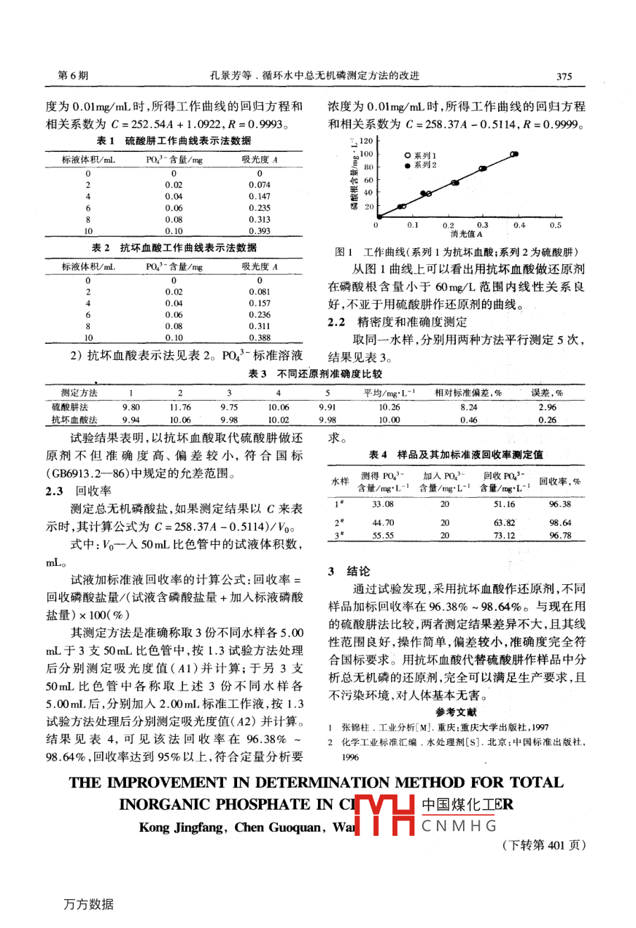 00年12月第32卷第6期Large Scale Nitrogenous Fertilizer IndustrVol 32 No 6循環(huán)水中總無(wú)機(jī)磷測(cè)定方法的改進(jìn)孔景芳陳國(guó)權(quán)王維莉丁敬增(河南煤業(yè)化工集團(tuán)中原大化公司,河南灌陽(yáng),457004)摘要對(duì)鉬蘭比色法測(cè)定循環(huán)水中總無(wú)機(jī)磷酸鹽的方法進(jìn)行了改進(jìn)。原鉬蘭比色法測(cè)定循環(huán)水中總無(wú)機(jī)磷的還原劑釆用對(duì)人體有害的硫酸肼,改用抗壞血酸作還原劑,結(jié)果準(zhǔn)確度高,偏差小,加標(biāo)回收率在6.38%~98.64%。關(guān)鍵詞鉬蘭比色法循環(huán)水總無(wú)機(jī)磷測(cè)定方法總無(wú)機(jī)磷酸鹽包括正磷酸鹽和聚磷酸鹽(六1.3試驗(yàn)方法偏磷酸鈉和多聚磷酸鹽),聚磷酸鹽經(jīng)酸煮后水解用移液管取10mL過(guò)濾后水樣于50mL比色為磷酸鹽,與鉬酸鈉反應(yīng)生成磷鉬黃,再用硫酸肼管中,加亼1nL5%檸檬酸氫二銨,再加入還原成磷鉬蘭進(jìn)行比色測(cè)定。由于硫酸肼對(duì)人呼5mLl%亞硫酸鈉、5mL硫酸一鉬酸鈉溶液,稀釋吸道有強(qiáng)烈刺激性,同時(shí)也污染環(huán)境。而抗壞血至20mL混勻,在沸水浴中煮沸10min后加入酸成本低廉,使用方便。因此,采用抗壞血酸代替1mL100mgL抗壞血酸,混勻,煮沸10min用流水硫酸肼做還原劑分析循環(huán)水中的總無(wú)機(jī)磷酸鹽,冷卻,用脫鹽水稀釋至刻度,混勻后用2cm比色皿,取得了滿意效果。于60m波長(zhǎng)處,以試劑空白做參比,測(cè)其吸光度。14標(biāo)準(zhǔn)曲線的繪制1試驗(yàn)部分取一組50mL比色管分別加入磷酸根工作液11儀器與試劑0,2,0,4.0,6.0,8.0,10.0mL,加水稀釋至10mL左儀器:7200型分光光度計(jì)。右,其余按1.3實(shí)驗(yàn)方法進(jìn)行,以磷酸根含量為縱試劑:5%檸檬酸氫二銨;1%亞硫酸鈉;硫酸坐標(biāo),以吸光度為橫坐標(biāo),做標(biāo)準(zhǔn)曲線。鉬酸鈉溶液:量取100mL濃硫酸慢慢加入1.5結(jié)果計(jì)算900m水中,冷至室溫后加入10g鉬酸鈉,混勻即磷酸根的含量可按下式計(jì)算可;硫酸肼溶液:稱取0.75g硫酸肼溶液于500mLC=KA/V去離子水中;抗壞血酸:100mg/L。式中:C一磷酸根含量,mg/L;標(biāo)液儲(chǔ)備液濃度:(PO43-0.5mg/mL)稱取K一標(biāo)準(zhǔn)曲線系數(shù),K=258.37;0.716g于105℃干燥的磷酸二氫鉀,溶于蒸餾水A一測(cè)定的吸光度;中,轉(zhuǎn)入LL容量瓶中,稀釋至刻度搖勻,此溶液每取水樣的體積,mL毫升含0.5mg磷酸根。工作液濃度:取10mL標(biāo)液儲(chǔ)備液稀釋至2結(jié)果與討論500mL容量瓶中,則每毫升含0.01mg磷酸根。2.1工作曲線1.2試驗(yàn)原理121)硫酸肼表示法見(jiàn)表1。PO43標(biāo)準(zhǔn)溶液濃總無(wú)機(jī)磷酸鹽包括正磷酸鹽和聚磷酸鹽(六偏磷酸鈉和多聚磷酸鹽),聚磷酸鹽經(jīng)酸煮后水解TH中國(guó)煤化工CNMHG助理工程師,206年河為磷酸鹽,與鉬酸鈉反應(yīng)生成磷鉬黃,再用還原劑北科技大學(xué)環(huán)境工程專業(yè)畢業(yè),理學(xué)學(xué)士,現(xiàn)在河南煤業(yè)化工集還原成磷鉬蘭進(jìn)行比色測(cè)定團(tuán)中原大化公司中心化驗(yàn)室工作。聯(lián)系電話:15936707779。第6期孔景芳等.循環(huán)水中總無(wú)機(jī)磷測(cè)定方法的改進(jìn)375度為0.01mg/m時(shí),所得工作曲線的回歸方程和濃度為0.01mg/m時(shí),所得工作曲線的回歸方程相關(guān)系數(shù)為C=252.54A+1.0922,R=0.9993。和相關(guān)系數(shù)為C=258.37A-0.5114,R=0.999表1硫酸肼工作曲線表示法數(shù)據(jù)標(biāo)液體積/mLO43-含量/mg吸光度A024680.0740.040.147曾如塔0.060.2350,080.3130.3930.5消光值A(chǔ)表2抗壞血酸工作曲線表示法數(shù)據(jù)圖1工作曲線(系列1為抗壞血酸;系列2為硫酸肼)標(biāo)液體積/mLPO43-含量/mg吸光度A從圖1曲線上可以看出用抗壞血酸做還原劑024680.020.081在磷酸根含量小于60mg/L范圍內(nèi)線性關(guān)系良0,040.15好,不亞于用硫酸肼作還原劑的曲線。0.060,2360.080.3112.2精密度和準(zhǔn)確度測(cè)定0.10取同一水樣,分別用兩種方法平行測(cè)定5次2)抗壞血酸表示法見(jiàn)表2。PO3標(biāo)準(zhǔn)溶液結(jié)果見(jiàn)表3表3不同還原劑準(zhǔn)確度比較測(cè)定方法5平均/m相對(duì)標(biāo)準(zhǔn)偏差,%差,%硫酸肼法11.768.242.96抗壞血酸法10.00試驗(yàn)結(jié)果表明,以抗壞血酸取代硫酸肼做還求。原劑不但準(zhǔn)確度高、偏差較小,符合國(guó)標(biāo)表4樣品及其加標(biāo)準(zhǔn)液回收率測(cè)定值(GB6913.2-86)中規(guī)定的允差范圍。水樣測(cè)得PO加入PO2回收PO2.3回收率含量/mgL-1含量/mgL1含量/mg“L-1回收率,%測(cè)定總無(wú)機(jī)磷酸鹽,如果測(cè)定結(jié)果以C來(lái)表33.08示時(shí),其計(jì)算公式為C=25837A-0.5114)/Vo244.7000063.8298.64式中:Vo-入50mL比色管中的試液體積數(shù)3結(jié)論試液加標(biāo)準(zhǔn)液回收率的計(jì)算公式:回收率=回收磷酸鹽量/(試液含磷酸鹽量+加人標(biāo)液磷酸通過(guò)試驗(yàn)發(fā)現(xiàn),采用抗壞血酸作還原劑,不同鹽量)×100(%樣品加標(biāo)回收率在96.38%~98.64%。與現(xiàn)在用其測(cè)定方法是準(zhǔn)確稱取3份不同水樣各500的硫酸肼法比較,兩者測(cè)定結(jié)果差異不大,且其線mL于3支50mL比色管中,按1.3試驗(yàn)方法處理性生范圍良好,操作簡(jiǎn)單,偏差較小,準(zhǔn)確度完全符后分別測(cè)定吸光度值(A1)并計(jì)算;于另3支合國(guó)標(biāo)要求。用抗壞血酸代替硫酸肼作樣品中分50mL比色管中各稱取上述3份不同水