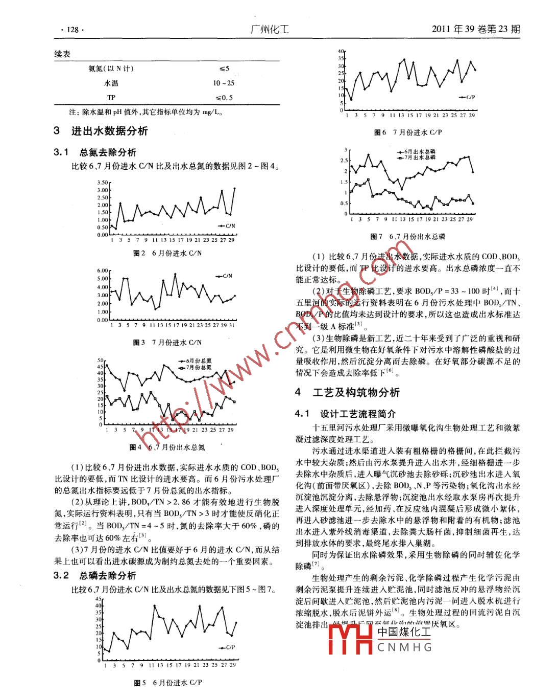2011年39卷第23期廣州化工.127●城市污水污水處理廠氮磷去除的研究劉傳偉,孫書群(合肥工業(yè)大學資源與環(huán)境工程學院,安徽合肥230000)摘要:城市污水處理廠的氮磷的去除成為較難控制的目標,已經(jīng)成為我國目前多數(shù)污水處理廠的現(xiàn)狀。本文從十五里河污水處理廠設計工藝流程,實際運行條件出發(fā),選取污水處理廠運行兩個月的數(shù)據(jù)分析人手,分析進水條件,實際控制條件,得出氮磷不達標的原因,同時給出結(jié)論和建議。關(guān)鍵詞:城市污水處理廠;氨氮;總磷;混凝Research of Nitrogen and Phosphorus Removal in Urban SewageWastewater Treatment PlantLIU Chuan - wei, SUN Shu - qun( School of Resources and Environmental Enginering, Hefei University of Technology , Anhui Hefei 230000, China)Abstract: The nitrogen and phosphorus removal in urban sewage treatment plant became more difficult to control ,and was the present situation of most sewage treatment plants. From ten miles river sewage treatment plant design process ,and the actual operation conditions and the data of two months’operation of the plant were analyzed. The water condi-tions, and actual control condition were aslo analyzed. The reason of nitrogen and phosphorous non - compliance was gotand the conclusions were proposed.Key words: the wastewater treatment plants ; ammonia nitrogen; total phosphorus ; coagulation表1十五里河污水處理廠 設計進水水質(zhì)1項目概況項目設計水質(zhì)合肥市十五里河污水處理廠工程規(guī)模為5萬m'/d,是利用BOD,150 ~ 180亞洲開發(fā)銀行貸款-合肥市城市環(huán)境改善項目之- -。工藝為氧COD320 ~380化溝工藝" ,經(jīng)深度處理后排水十五里河,最終進入巢湖。十五里河污水處理廠出水執(zhí)行《城鎮(zhèn)污水處理廠污染物排放標準》ss166 -200GB18918 -2002中- -級標準的A級標準。工藝流程見圖1。33 -40微風機房{切藥間h [設備問]25 ~30反沖水、5TI4-5.水溫/C10~25pH6~9國流圬混注:除水溫和pH值外,其它指標單位均為mg/L。剩余污! r-{沖洗水樓水池表2 +五里河污水處理廠設計出水水質(zhì)出水(mg/L)圖1工藝流程≤102進出水水質(zhì)情況≤50中國煤化工:10表1為2011年6月1日到7月29日+五里河污水處理廠設計進水水質(zhì)數(shù)據(jù),表2為十五里河污水處理廠設計出水水質(zhì)總氮(以NMHCN MH G1s數(shù)據(jù)。作者簡介:劉傳偉(1981 - ),男,研究生,主要從事水污染控制I程方向研究。.●128.廣州化工2011年39卷第23期續(xù)表氨氮(以N計)≤5水溫10-25TP≤0.5wvMvM→CP注:除水溫和pH值外,其它指標單位均為mg/L。1 357911131517 1921232527 293進出水數(shù)據(jù)分析團67月份進水C/P3.1 總氮去除分析古猾出李冒霜比較6.7月份進水C/N比及出水總氮的數(shù)據(jù)見圖2-圖4。3.50r3.000.s+CN0.00年1357911131517 1921 2325 2729 "圈7 6.7 月份出水總磷團2 6月份進水C/N(1)比較6.7月份進出水數(shù)據(jù),實際進水水質(zhì)的COD .BOD,5.00比設計的要低,而TP比設計的進水要高。出水總磷濃度-直不能正常達標。(2)對于生物除磷工藝,要求BOD,/P=33 - 100時4),而十.00IVMmn五里河的實際的運行資料表明在6月份污水處理中BOD,/TIN.BOD,/P的比值均未達到設計的要求,所以這也造成出水標準達357 9 113151719212229 2527291不到一級A標準'5團37月份進水C/N(3)生物除磷是新工藝,近二十年來受到了廣泛的重視和研究。它是利用微生物在好氧條件下對污水中溶解性磷酸鹽的過七月份總款量吸收作用,然后沉淀分離而去除磷。在好氧部分碳源不足的情況下會造成去除率低下(0。4工藝及構(gòu)筑物分析wMwMwN4.1設計工藝流程簡介1131517192123252729十五里河污水處理廠采用微曝氧化溝生物處理工藝和微絮凝過濾深度處理工藝。團46.7 月份出水總氮污水通過進水渠道進人裝有粗格柵的格柵間,在此攔截污(1)比較6.7月份進出水數(shù)據(jù),實際進水水質(zhì)的CoD、BOD,水中較大雜質(zhì):然后由污水泵提升進人出水井.經(jīng)細格柵進- 步比設計的要低,而TN比設計的進水要高。而6月份污水處理廠去除水中雜質(zhì)后,進人曝氣沉砂池去除砂礫;沉砂池出水進入氧的總氮出水指標要遠低于7月份總氮的出水指標?;瘻?前面帶厭氧區(qū)) ,去除BOD, .N.P等污染物;氧化溝出水經(jīng)(2)從理論上講, BOD,/TN>2.86才能有效地進行生物脫沉淀池沉淀分離, 去除懸浮物;沉淀池出水經(jīng)取水泵房再次提升氮,實際運行資料表明,只有當BOD,/TN >3時才能使反硝化正進入深度處理單元,經(jīng)加藥、在反應池內(nèi)混凝后形成微小絮體,常運行2。當BOD/TN=4~5時,氮的去除率大于60% ,磷的再進入砂濾池進-步去除水中的懸浮物和附著的有機物:濾池去除率也可達60%左右甲。出水進入紫外線消毒渠道,去除糞大腸桿菌,抑制細菌再生,達里1(3)7月份的進水CN比值要好于6月的進水C/N,而從結(jié)到排放水體的要求,最終尾水排入巢湖。果上也可以看出進水碳源成為制約總氮去處的一一個重要因素。除磷["]同時為保證出水除磷效果,采用生物除磷的同時輔佐化學3.2總磷去除分析比較6.7月份進水CN比及出水總氮的數(shù)據(jù)見下圖5~圖7。生物處理產(chǎn)生的剩余污泥、化學除磷過程產(chǎn)生化學污泥由剩余污泥泵提升連續(xù)進人貯泥池.同時濾池反沖的懸浮物經(jīng)沉淀后間歇進人貯泥池,然后貯泥池內(nèi)污泥一同進 人脫水機進行濃縮脫水脫水后泥餅外運”1。生物處理過程的回流污泥自沉淀池排出pNwM中國煤化工MHCNMH G .135791511921232729圄5 6月份進水C/P.2011年39