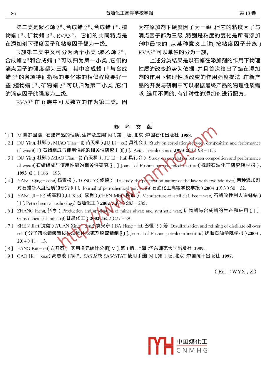 第18卷第1期石油化工高等學(xué)校學(xué)報(bào)Vol. 18 No. 12005年3月JOURNAL OF PETROCHEMICAL UNIVERSITIESMar.2005文章編號(hào):1006 - 396X( 2005 )01 - 0083 -04添加劑對(duì)石蠟物理改性的分類研究路宏,佟毅(遼寧石油化工大學(xué)理學(xué)院,遼寧撫順113001 )摘要:蠟和添加到蠟中的添加劑蠟都是有機(jī)化合物的復(fù)雜混合物(C,H2n+2的直鏈或支鏈飽和的有機(jī)化合物),它們的化學(xué)組成和物理結(jié)構(gòu)也很復(fù)雜,由于蠟的產(chǎn)源不同可以將蠟(添加劑)分為動(dòng)物蠟、植物蠟、礦物蠟和合成蠟等。但試驗(yàn)的結(jié)果表明,它們作為添加劑所表現(xiàn)出的對(duì)原料蠟例如58#全煉蠟)物理性質(zhì)的改變卻不一定完全相同。使用主成份分析和聚類分析方法通過(guò)蠟在不同添加劑(蠟)作用下所表現(xiàn)出來(lái)的物理性質(zhì)的變化趨勢(shì)將添加劑蠟分為若干不同的族、類在同-族、 類中添加劑對(duì)蠟可以有相同或相近的物理改性作用。關(guān)鍵詞:石蠟;主成分;聚類;添加劑中圖分類號(hào): TE626. 8文獻(xiàn)標(biāo)識(shí)碼:A石蠟及其在添加劑作用下的產(chǎn)品是石化企業(yè)的種添加劑;確定滴溶點(diǎn)、運(yùn)動(dòng)粘度、針入度( 25.4 C、重要產(chǎn)品之一。研制石蠟高附加值產(chǎn)品,進(jìn)行深加38.8C、43.3C)為在添加劑下的物理特征變化指工提高石蠟產(chǎn)品的技術(shù)含量能進(jìn)-步提高石蠟產(chǎn)標(biāo)并分別取添加劑的質(zhì)量分?jǐn)?shù)在1%、5%、10%三品市場(chǎng)競(jìng)爭(zhēng)力。研究石蠟在添加劑的作用下物理性個(gè)水平下的特征指標(biāo)值共計(jì)有15 個(gè)變量。質(zhì)的變化趨勢(shì)是實(shí)現(xiàn)石蠟產(chǎn)品創(chuàng)新的重要基礎(chǔ)理論研究1-7。.2石蠟改性的主成分分析模型國(guó)外石蠟深加工產(chǎn)品高度發(fā)展國(guó)內(nèi)石蠟生產(chǎn)由于石蠟在添加劑的作用下的指標(biāo)變量較多,嚴(yán)重過(guò)剩,而石蠟深加工產(chǎn)品市場(chǎng)潛力巨大。面對(duì)為了突出主要矛盾,采用主成分分析的方法8。X這種現(xiàn)狀我們有必要進(jìn)-步開展石蠟產(chǎn)品深加工=(X1.X2..,X18)T是18x15的樣本觀測(cè)矩陣,的研發(fā)。研究添加劑對(duì)石蠟物理性能改變規(guī)律通其中的18行分別表示18種添加劑,15 列分別表示過(guò)添加能與石蠟互溶的蠟添加劑來(lái)改善石蠟的物理15個(gè)原料蠟在添加劑的作用下的指標(biāo)變量。首先性能。通過(guò)建立主成分分析和聚類分析的統(tǒng)計(jì)模計(jì)算樣本相關(guān)系數(shù)矩陣的前3個(gè)特征根及貢獻(xiàn)率型我們將產(chǎn)源不同的動(dòng)物蠟、植物蠟、礦物蠟和合(見(jiàn)表1)成蠟等根據(jù)它們作為添加劑所表現(xiàn)出的對(duì)原料蠟表1 樣本相關(guān)系數(shù)矩陣的特征值及貢獻(xiàn)率(例如58#全煉蠟)物理性質(zhì)的改變趨勢(shì)不同而分為Table 1 Eigenvalues and contribution rate of sample若干不同的族、類,在同--族、類中添加劑對(duì)蠟可以related coefficient matrix有相同或相近的物理改性作用。主分量特征值差值貢獻(xiàn)率累計(jì)貢獻(xiàn)率第一主成分7.3558 4. 13270. 490 40.49041添加劑的選擇及特征變量確定第二主成分3.2231 1.631 20.21490.705 3選擇礦物蠟( 1#~3# )聚乙烯蠟( 1#~2# )第三主成分1.591 90.2776 0.1061 0.811 4EVA蠟1#~4# )合成樹脂(1#~2# )合成蠟1#中國(guó)煤化工~2# )植物蠟1#~3# )和動(dòng)物蠟1#~2# )共計(jì)18TYHcNMHG主成分的累計(jì)貢獻(xiàn)率已經(jīng)達(dá)到0.811 4 ,可以盡可能多地保留原來(lái)15個(gè)收稿日期2004-07- 17變量的信息并且它們還不相關(guān)。接下來(lái)我們計(jì)算作者簡(jiǎn)介路宏( 1981- )女遼寧朝陽(yáng)市在讀碩士。.基金項(xiàng)目:中油股份集團(tuán)基金資助項(xiàng)目( 010305-01 )。樣本相關(guān)系數(shù)矩陣的特征向量及原變量的因子得分*通訊聯(lián)系方數(shù)據(jù)(見(jiàn)表2)84石油化工高等學(xué)校學(xué)報(bào)第18卷由表2可以看出,第一主分量的針入度變量的分量的運(yùn)動(dòng)粘度變量的因子得分都在0.5以上可因子得分多數(shù)都在0.3以上,僅有25 C針入度1%以表征粘度的描述因子;第三主分量的滴熔點(diǎn)變量和37.8 C針入度1%小于0.3 ,說(shuō)明添加量較少且的因子得分都在0.3以上,可以表征溶點(diǎn)的描述因溫度較低時(shí)對(duì)硬度的影響較小,而添加量增大時(shí)對(duì)子。表3給出了18種添加劑的各描述因子得分。硬度的影響較大可以作為硬度的描述因子第二主表2樣本相關(guān)系數(shù)矩陣的特征向量及原變量的因子得分Table 2 Eigenvector sample related coefficient matrix and score of former variable編號(hào)原變量第一主成分得分第二主成分得分 第三主成分得分滴溶點(diǎn)1%-0.1780-0. 19400.3645滴溶點(diǎn)5%-0.204 4- 0.22640.5438滴溶點(diǎn)10%0.2096- 0.222 20.526 2運(yùn)動(dòng)粘度1%- 0.088 70.506 20.195 15運(yùn)動(dòng)粘度 5%- 0.07000.525 80.1749運(yùn)動(dòng)粘度10%-0.065 50.51630.167 325 C針入度1%0.1342-0.006 8- 0.026425C針入度5%0.317 00.066 50.089 8925C針入度10%0.32290.027 4-0.01581037.8 C針入度1%0.233 70.173 10.277 71137.8 C針入度5%0.337 90.047 40.226 21237.8 C針入度10%0.351 2-0.011 60.164513 43.3 C針入度1%0.3492-0.104 3.0.121 71443.3 C針入度5%0.337 8- 0.084 20.101 3I543.3 C針入度10%0.338 5-0.0839.0.0920.注:原變量中1%、5%和10%表示添加劑添加量。表318 種添加劑