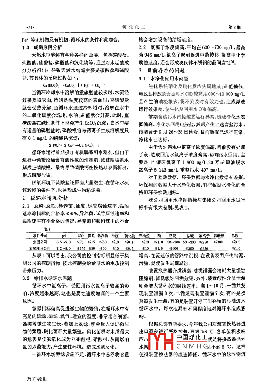 第31卷第8期的壯工VoL 31 Na 8循環(huán)水腐蝕性分析及建議楊英杰,段振國中國石油化工股份有限公司石家莊煉化分公司河北石家莊050032)摘要]循環(huán)水的水質(zhì)直接影響裝置水冷器及管路的安全運(yùn)行,水質(zhì)超標(biāo),對換熱器形成腐蝕造成泄漏泄漏進(jìn)一步使水質(zhì)惡化,惡化的水質(zhì)再對冷換設(shè)備加重腐蝕形成惡性循環(huán),嚴(yán)重時造成裝置停產(chǎn)[關(guān)鍵詞]循環(huán)水;污水回用:水冷器:腐蝕[中圖分類號]TQ085.4文獻(xiàn)標(biāo)識碼]B[文章編號]1003-5095(2008)08-0053-03中國石油化工股份有限公司石家莊煉化分公司02+2H0→40H催化車間循環(huán)水投用污水回用水以來從裝置冷卻器Fe*+ 2 OH-Fe(OH)2 4檢修的情況來看,有腐蝕加劇的趨勢,大多數(shù)情況是由于Fe(OH2的不穩(wěn)定性,在溶解氧存在的情況循環(huán)水側(cè)腐蝕,尤其是管板管子和焊縫腐蝕最嚴(yán)重,下有以下反應(yīng):許多管束的管板管子的焊縫產(chǎn)生裂紋。4 Fe(OH2+2 H 0+0 +4 Fe(OHD),冷卻水重復(fù)利用是節(jié)水減排的必然趨勢,但也不最終產(chǎn)生黑色的四氧化三鐵,其反應(yīng)如下:是無條件的。一方面在水的重復(fù)利用過程中,隨著水2 Fe(Odd,+ Fe(oHD). +4 H-O分的蒸發(fā),水中的溶解鹽類、懸浮固體及非揮發(fā)性有以上產(chǎn)物多數(shù)沉積于金屬設(shè)備的內(nèi)表面,形成了機(jī)物濃度逐步增大,超過一定濃度時在管道設(shè)備特宏觀上的腐蝕產(chǎn)物,呈現(xiàn)出大小不等的小鼓包清除別是在換熱面上發(fā)生結(jié)垢另一方面在水中有溶解掉腐蝕產(chǎn)物后,金屬表面上呈現(xiàn)出大小不等的凹坑氧存在的條件下,以鐵的陽級發(fā)生反應(yīng)可促進(jìn)形成有的呈點狀蝕坑有的呈潰瘍狀蝕坑嚴(yán)重者出現(xiàn)穿腐蝕電池造成嚴(yán)重的垢下腐蝕污垢覆蓋下的貧氧孔泄漏區(qū)與裸露的富氧區(qū)之間也能形成氧濃差電池使金屬1.1.2C02引起的腐蝕遭受局部腐蝕。反之,腐蝕也必然改變金屬的表明性C2的存在使水呈酸性在pH值降到7以下時,狀使結(jié)垢加劇。這樣,結(jié)垢腐蝕相輔相成相互促反應(yīng)可以生成H2,這樣腐蝕就可以不斷地進(jìn)行下去進(jìn)形成錯綜復(fù)雜的協(xié)同效應(yīng)影響甚至破壞生產(chǎn)系具體反應(yīng)如下:統(tǒng)的正常運(yùn)行。CO2+H0→H+HQ3H+2e→H2↑1腐蝕結(jié)垢的原因分析1.1電化學(xué)反應(yīng)過程的FeCO2腐蝕發(fā)生后,生成的Fe隨水流走,金屬在循環(huán)水處理過程中,大多數(shù)單位用自來水補(bǔ)表面沒有沉積的腐蝕產(chǎn)物,只能使設(shè)備的金屬表面不充而自來水中一般都溶解有一定量的Cl、O2、這斷變薄。些物質(zhì)都會與循環(huán)水設(shè)備形成原電池。1.2微生物腐蝕1.1.1氟引起的腐蝕循環(huán)水中鐵細(xì)菌硫細(xì)菌等微生物能加速電化學(xué)在含有C的水中,由于Cl所起的電荷轉(zhuǎn)移作腐蝕。鐵細(xì)菌將Fe氧化成Fe,硫酸鹽還原菌消耗用鐵原子失去兩個電子,變成二價鐵離子氧和水得H1,具體的反應(yīng)如下到電子而變成氫氧根離子,二價鐵離子與氫氧根離子Fe2→Fe+e結(jié)合生成氫氧化亞鐵具體的反應(yīng)過程如下:Fe-2e→Fe中國煤化工Fe+8°2+4H0[收稿日期]200804CNMHG條件有厭氧介質(zhì)、[作者簡介楊英杰1971-),男工程師從事設(shè)備管理工作.pH=5.5~85、水溫30~40℃;含有硫酸鹽、PO}、河北化工第8期Fe等無機(jī)物及有機(jī)物,循環(huán)水的條件和此吻合。格會增加設(shè)備的結(jié)垢速度。1.3成垢原因分析2.2氯離子濃度偏高,平均在600~700mg/L,最高天然水中溶解有各種各樣的鹽類,包括碳酸鹽、為945mg/L,氯離子起到促進(jìn)電荷轉(zhuǎn)移提高電化學(xué)硫酸鹽、硅酸鹽、磷酸鹽和氯化物等。通過對水垢的成腐蝕速度,還會形成奧氏體不銹鋼的晶間腐蝕凹分分析得出:導(dǎo)致天然水結(jié)垢主要是碳酸鹽和磷酸3目前存在的問題鹽,其具體的反應(yīng)過程如下3.1水凈化回用水問題ca(HCJ)2→CaC03↓+H0+CO2↑生化系統(tǒng)硝化反硝化反應(yīng)失調(diào)造成pH值偏低;當(dāng)循環(huán)冷卻水中溶解的重碳酸鹽較多時,水流經(jīng)電脫鹽排放的含鹽污水COD較高4000100g,t換熱器表面特別是溫度較高的表面時重碳酸鹽且產(chǎn)生的油渣很多,得不到及時有效處理造成浮選就會受熱分解;當(dāng)循環(huán)水通過冷卻塔時,溶解在水中運(yùn)行效果差,使生化及回用水COD偏高。的二氧化碳就會逸出,水的阻值就會升高,此時,重前期含硫污水汽提裝置運(yùn)行異常,造成凈化水氨碳酸鹽在堿性條件下也會產(chǎn)生CaCO2沉淀。當(dāng)水中溶氮偏高。凈化水回用電脫鹽然后產(chǎn)生上述含鹽污水。有適量的磷酸鹽時磷酸根將與鈣離子生成溶解度只該裝置于9月26~28日檢修,目前裝置已運(yùn)行正常,有0.1mg/幾的磷酸鈣沉淀:凈化水已達(dá)標(biāo)。2PQ+3Ca2-Ca2(PO2↓由于含油污水中氯離子濃度偏高,目前沒有處理循環(huán)水運(yùn)行前期投加有機(jī)瞬系列水穩(wěn)劑但由于手段,造成回用水氯離子濃度偏高,影響污水回用主運(yùn)行中頻繁投加含有活性氯的消毒劑致使阻垢劑水要是1罐區(qū)氯離子1800g/L,20萬四原油脫水解成正磷酸根,最終導(dǎo)致磷酸鈣在換熱器表面析出氯離子5143mg/L,重整污水497mg/L形成磷酸鹽垢對于監(jiān)測數(shù)據(jù),環(huán)保數(shù)據(jù)與水凈化數(shù)據(jù)有差別氧環(h