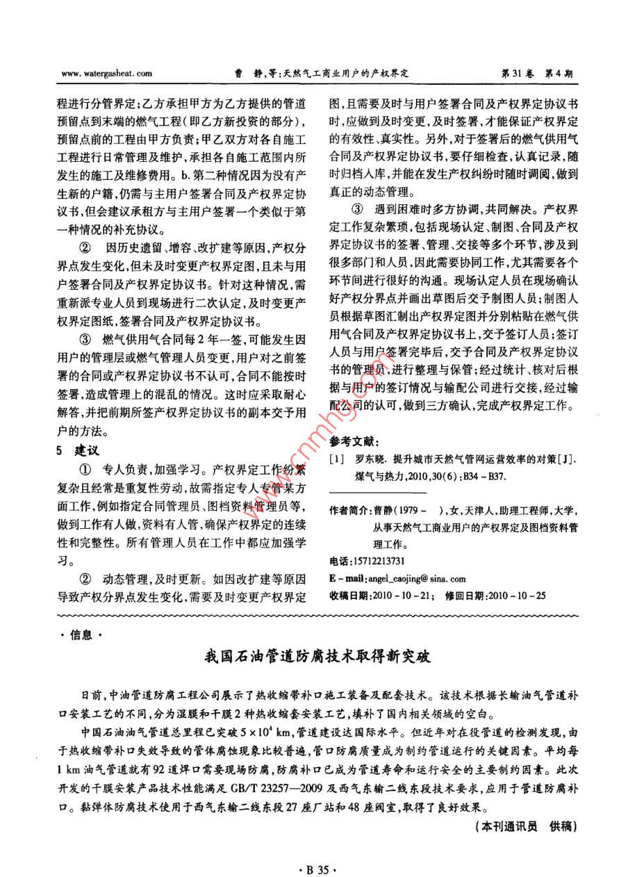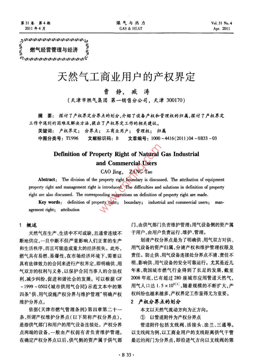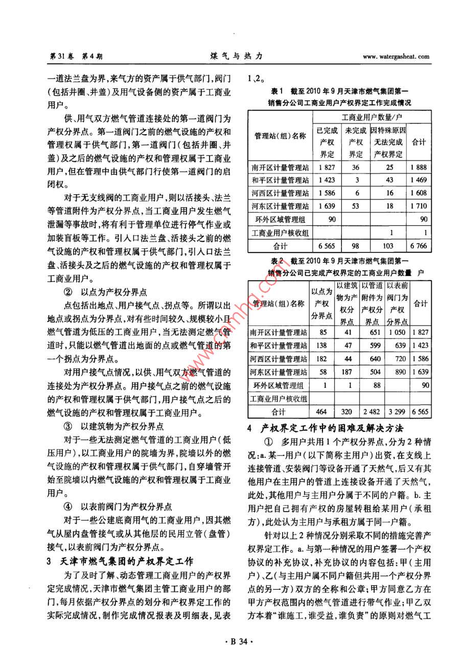 第31卷第4期煤氣與熱力Vol.31 No.42011年4月GAS & HEATApr. 2011燃?xì)饨?jīng)營管理與經(jīng)濟(jì)天然氣工商業(yè)用戶的產(chǎn)權(quán)界定曹靜,臧濤(天津市燃?xì)饧瘓F(tuán)第一銷售分公司,天津300170)摘要:探討了產(chǎn)權(quán)界定分界點(diǎn)的劃分,介紹了設(shè)備產(chǎn)權(quán)和管理權(quán)的歸屬,探討了產(chǎn)權(quán)界定工作中遇到的困難及解決方法,提出了產(chǎn)權(quán)界定工作的相關(guān)建議。關(guān)鍵詞:產(chǎn)權(quán)界定; 分界點(diǎn); 工商業(yè)用戶; 管理權(quán);歸屬中圖分類號(hào): TU996文獻(xiàn)標(biāo)識(shí)碼: B文章編號(hào): 1000 -4416(2011 )04 -0B33 -03Definition of Property Right of Natural Gas Industrialand Commercial UsersCAO Jing,ZANG TaoAbstract: The division of the property night boundary is discussed. The attribution of equipmentproperty right and management right is introduced. The dificulties and solutions in definition of propertyright are also discussed. The corresponding suggestions on definition of property right are made.Key words: definition of property right; boundary; industrial and commercial users; man-agement right; atribution1概述門,由供氣部門負(fù)責(zé)維護(hù)管理;用氣設(shè)備側(cè)的資產(chǎn)屬天然氣在生產(chǎn)、生活中不可或缺,且通常連續(xù)不于用戶,由用戶負(fù)責(zé)運(yùn)行維護(hù)、管理。斷地供應(yīng),一旦中斷不但嚴(yán)重影響人們正常的生產(chǎn)劃清產(chǎn)權(quán)分界點(diǎn)是為了明確供用氣雙方對(duì)供、和生活秩序,而且可能造成重大的經(jīng)濟(jì)損失。此外,用氣設(shè)備的資產(chǎn)歸屬,分清產(chǎn)權(quán)和維護(hù)管理權(quán)限及燃?xì)饩哂幸兹?、易爆?在市場經(jīng)濟(jì)環(huán)境下,需要以責(zé)任。防止供、用氣設(shè)備連接處分界點(diǎn)不清、責(zé)任不具有法律效力的合同來進(jìn)行產(chǎn)權(quán)界定,即明確供、用明,影響供、用氣設(shè)備的安全可靠運(yùn)行。尤其是近幾氣雙方的權(quán)利與義務(wù),以保護(hù)合同當(dāng)事人的合法權(quán)年來,我國城市燃?xì)庑袠I(yè)得到了長足的發(fā)展,截至利,減少糾紛,促進(jìn)和諧社會(huì)的發(fā)展??梢愿鶕?jù)GF2008年底,已有超過280座城市應(yīng)用管道天然氣,-1999-0502《城市供用氣合同》示范文本中的第用氣人口達(dá)1.5x 1085[1i, 隨著規(guī)模的不斷擴(kuò)大,產(chǎn)四條“供、用氣設(shè)施產(chǎn)權(quán)分界與維護(hù)管理”明確產(chǎn)權(quán)權(quán)糾紛也越來越多 ,產(chǎn)權(quán)界定工作顯得尤為重要。維護(hù)分界點(diǎn)。2產(chǎn)權(quán)分界點(diǎn)的劃分依據(jù)《天津市燃?xì)夤芾項(xiàng)l例》第四章第二十一本文以天然氣流動(dòng)方向?yàn)檎较?。條,所謂產(chǎn)權(quán)維護(hù)分界點(diǎn)(以下簡稱產(chǎn)權(quán)分界點(diǎn)),①以管道附件為產(chǎn)權(quán)分 界點(diǎn)是指供氣部門和用戶的用氣設(shè)備連接處。產(chǎn)權(quán)分界管道附件包括支線閥、活接頭、法蘭、三通等。點(diǎn)兩端的設(shè)備,一般由產(chǎn)權(quán)擁有者負(fù)責(zé)維護(hù)管理。以支線閥為例,以工商業(yè)用戶的支線距離供氣干管在確定產(chǎn)權(quán)分界點(diǎn)以后,供氣側(cè)的資產(chǎn)屬于供氣部最近的閥門為分 界點(diǎn),即沿進(jìn)氣方向以支線閥的第●B33.第31卷第4期煤氣與熱力www. watergasheat. com一道法蘭 盤為界,來氣方的資產(chǎn)屬于供氣部門,閥門1、2。(包括井圈、井蓋)及用氣設(shè)備側(cè)的資產(chǎn)屬于工商業(yè)表1截至2010年9月天津市燃?xì)饧瘓F(tuán)第一用戶。銷售分公司工商業(yè)用戶產(chǎn)權(quán)界定工作完成情況供用氣雙方燃?xì)夤艿肋B接處的第一道閥門為工商業(yè)用戶數(shù)量/戶產(chǎn)權(quán)分界點(diǎn)。第- -道閥門之前的燃?xì)庠O(shè)施的產(chǎn)權(quán)和管理站(組)名稱已完成|未完成因特殊原因管理權(quán)屬于供氣部門,第一道閥門(包括井圈、井產(chǎn)權(quán)無法完成|合計(jì)界定產(chǎn)權(quán)界定蓋)及之后的燃?xì)庠O(shè)施的產(chǎn)權(quán)和管理權(quán)屬于工商業(yè)用戶,但在管理中由供氣部門行使第一道閥門的啟南開區(qū)計(jì)量管理站1 827362:1 888和平區(qū)計(jì)量管理站1 4234閉權(quán)。對(duì)于無支線閥的工商業(yè)用戶,則以活接頭、法蘭河西區(qū)計(jì)量管理站1 586161608等管道附件為產(chǎn)權(quán)分界點(diǎn),當(dāng)工商業(yè)用戶發(fā)生燃?xì)夂訓(xùn)|區(qū)計(jì)量管理站1 63953181 710泄漏等事故時(shí),將有利于管理單位進(jìn)行停氣作業(yè)或環(huán)外區(qū)域管理組90|90 |加裝盲板等工作。引人口法蘭盤、活接頭之前的燃工商業(yè)用戶核收組合計(jì)6 565381036 766氣設(shè)施的產(chǎn)權(quán)和管理權(quán)屬于供氣部門,引入口法蘭:盤、活接頭及之后的燃?xì)庠O(shè)施的產(chǎn)權(quán)和管理權(quán)屬于表2截至2010年9月天津市燃?xì)饧瘓F(tuán)第一銷售分公司已完成產(chǎn)權(quán)界定的工商業(yè)用戶數(shù)量戶工商業(yè)用戶。②以點(diǎn)為產(chǎn)權(quán)分界點(diǎn)以點(diǎn)為以建筑以管道以表前點(diǎn)包括出地點(diǎn)用戶接氣點(diǎn)拐點(diǎn)等。所謂以出管理站(組)名稱產(chǎn)權(quán)物為產(chǎn)附件為 閥門為合地點(diǎn)或拐點(diǎn)為分界點(diǎn),對(duì)有些時(shí)間較久、規(guī)
