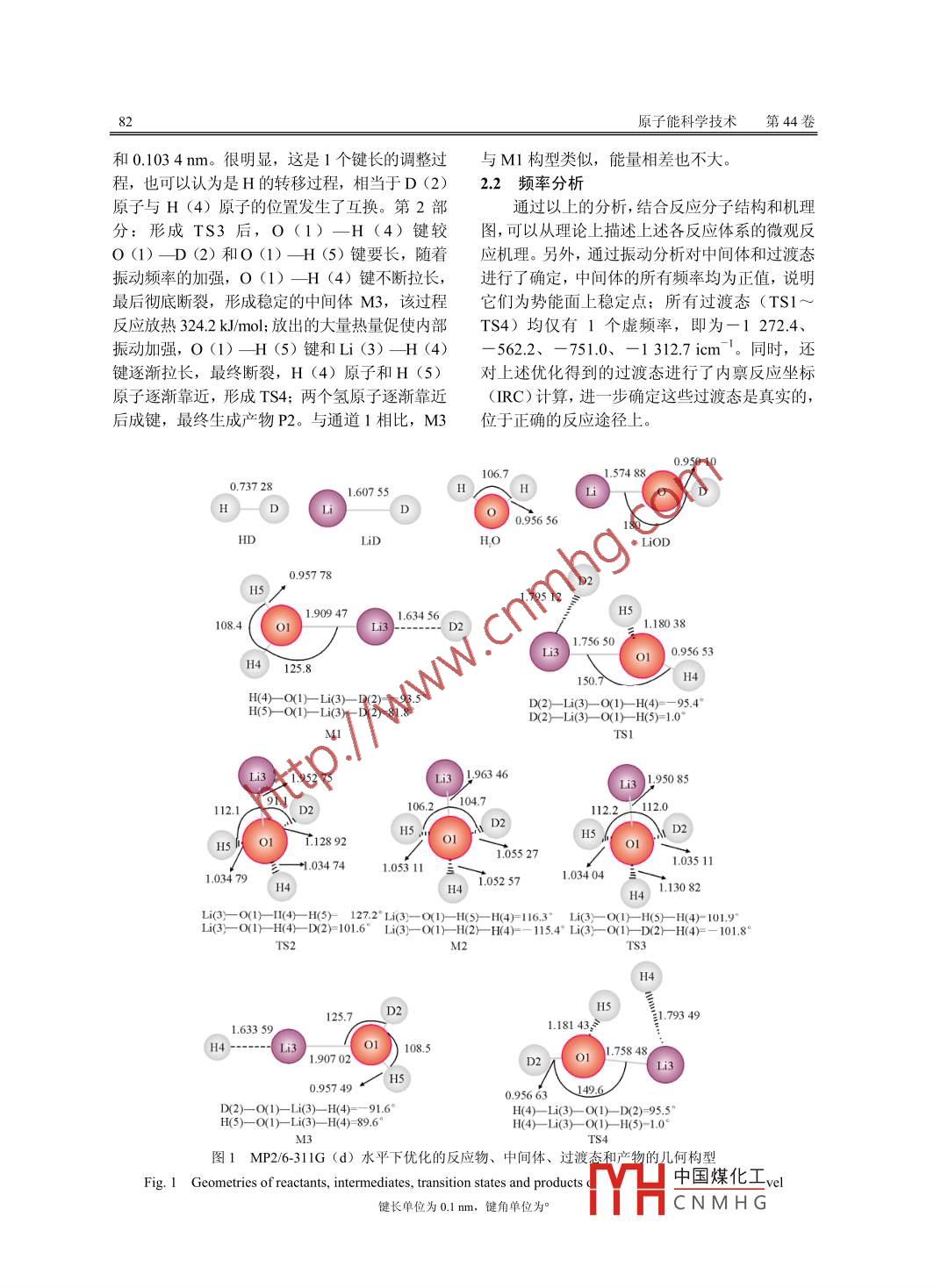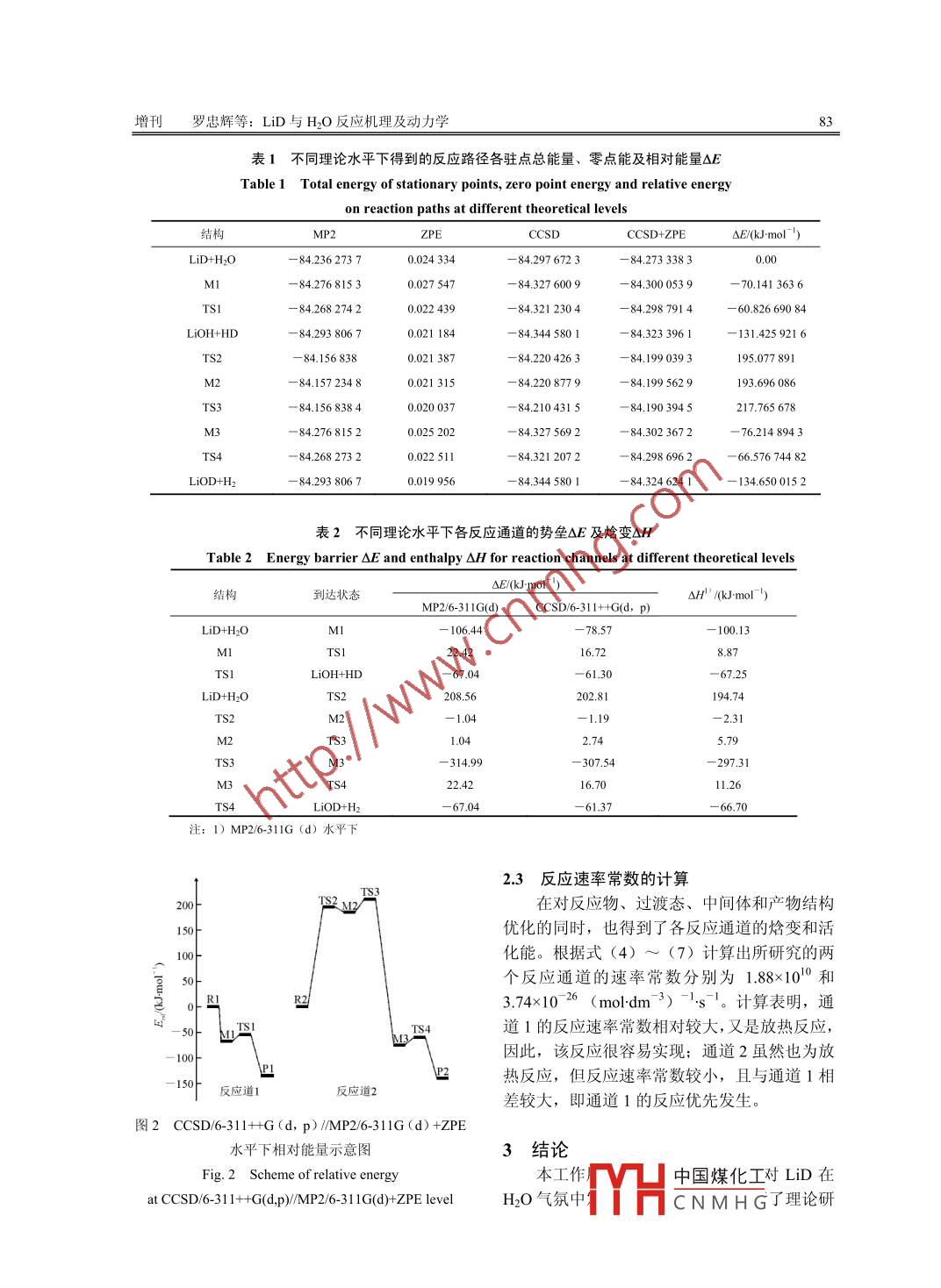 第44卷增刊原子能科學(xué)技術(shù)Vol. 44, Suppl2010年9月Atomic Energy Science and TechnologySep.2010LiD與H2O反應(yīng)機理及動力學(xué)羅忠輝,何彬1,牛莉博12,尹武林(1.第二炮兵工程學(xué)院,陜西西安710025:2.二炮裝備研究院,北京100085)摘要:在6-31lG(d)水平下,采用微擾理論的MP2方法,研究了LiD與H2O的反應(yīng)。結(jié)果表明,反應(yīng)存在兩個通道:LiD+H2O→LiOH+HD(R1);LiD+H2O→LOD+H2(R2)。298K下,兩通道的勢壘高度分別為931和19508 kJ/mol,反應(yīng)速率常數(shù)分別為1.88×100和3.74×10-26( mold-3)-ls關(guān)鍵詞:LiD;H2O;反應(yīng)機理;速率常數(shù)中圖分類號:O561.1文獻標(biāo)志碼:A文章編號:1000-6931(2010)S0-0080-05Theoretical Study on Mechanism and Kineticsfor Reaction of LiD With H2oLUO Zhong-hui, HE Bin, NIU Li-bo, YIN Wu-li(1. The Second Artillery Engineering University, Xi'an 710025, China2. The Second Institute of the Second Artillery equipment Academy, Beijing 100085, China)Abstract: The reaction of LiD with H2O was investigated by disturbation theory at theMP2/6-311G(d)level. Two channels were identified: LID+H20-LiOH+HD (R1)LiD+H20-LiOD+H2(R2). The energy barriers are 9.31 and 195.08 kJ/mol, the rate constantsarel.88×10°and3.74×10-26( moldm-3) s for rl and r, respectivelyKey words: LiD: H2O; mechanism; rate constantLiD是一種重要的核能材料,廣泛應(yīng)用于化下,氘化鋰粉末與O2、CO2和水氣的反應(yīng)動力學(xué)和能源工業(yè),LiD的化學(xué)活性很強,易與空氣學(xué)。結(jié)果表明,氘化鋰與O2、CO2的反應(yīng)很微中的H2O、CO2等反應(yīng)。H2O與LD反應(yīng)生成弱,與水氣的反應(yīng)速率相對要大得多。LiD在LiOH和LiOD,反應(yīng)的化學(xué)方程式為H2O氣氛存在下的反應(yīng)過程及機理是十分復(fù)雜2LiD(s)+2H,0(g)=LiOH (s)+的,國內(nèi)尚未見關(guān)于氘化鋰與水反應(yīng)的理論研LiOD(s)+H2(g)+HD(g)(1)究,因此,研究LiD和H2O的化學(xué)反應(yīng)微觀機LHD部件是由氫化鋰和氘化鋰做成的極重理對深入認(rèn)識這種復(fù)雜反應(yīng)體系具有積極意義。要部件,該部件失效是一種漸變形失效,因潮解而使LHD的物理品位逐漸降低,至低到不符合1計算方法設(shè)計要求而令其退役,例如,LHD部件的物理本工作在CCSD6-311++G(d,p)MP2/6-品位S不得低于97.6%2氘化鋰易潮解,為此,311G(d)水平下研究了LiD與H2O反應(yīng)的兩在LHD部件的表面上涂一薄層防潮物質(zhì),但薄個反應(yīng)通道層只能使潮解減弱而已。文獻[研究了28℃Lil中國煤化工(2)CNMHG收稿日期:2010-06-23:修回日期:2010-08-2作者簡介:羅忠輝(1985—),男,湖南長沙人,碩士研究生,核技術(shù)及應(yīng)用專業(yè)增刊羅忠輝等:LiD反應(yīng)機理及動力學(xué)LiD+H2O→LiOD+H2(3)原子結(jié)合形成的中間體M1能量最低,而不是LiD采用微擾理論3的MP2方法,在6311G(d)中的D原子。在中間體M1中Li(3)D(2)水平下全參數(shù)優(yōu)化了反應(yīng)路徑上各駐點(反應(yīng)鍵和O(1)-H(4,5)鍵基本沒有變化,也物、中間體、過渡態(tài)和產(chǎn)物)的幾何構(gòu)型。經(jīng)就是隨兩原子的靠近直接生成穩(wěn)定的中間體。該振動分析及內(nèi)稟反應(yīng)坐標(biāo)(IRC)計算,對中間步反應(yīng)無反應(yīng)活化能,而且還要放出70.1kJ/mol體(M)和過渡態(tài)(TS)的真實性進行確認(rèn)。的熱量,此能量推動中間體M1振動頻率的增采用 Gaussian o3,在CCSD6311+G(d,p)加,進一步發(fā)生異構(gòu)化。由于L原子比D原子水平上對各駐點進行單點能計算,并進行零點易失去最外層電子,所以,O(1)原子與L(3)能(ZPE)校正。原子要成鍵,形成了過渡態(tài)TS1。從此過渡態(tài)看反應(yīng)的摩爾焓變(即熱效應(yīng))計算公式為S1中的Li(3)D(2)鍵和O(1)-H(5)△Hm=EHm(產(chǎn)物)一∑Hn(反應(yīng)物)(4)鍵明顯增長,發(fā)生了H的轉(zhuǎn)移,未轉(zhuǎn)移的H(4)Ea=Ea(TS)-Ee(M反應(yīng)物)(5)和O(1)、Li(3)幾乎成直線,且Li(3)-O(1)式中:An為反應(yīng)通道的反應(yīng)熱;E1為反應(yīng)活鍵縮短約10%比較M1與TS1的構(gòu)型可看出,化能,其值為過渡態(tài)與中間體或反應(yīng)物的能量形成中間體后,Li(3)D(2)鍵逐漸拉長,(經(jīng)零點能校正)之差值;E為相對能D(2)與H(5)原子逐漸靠近,這一步反應(yīng)采用經(jīng)典過渡態(tài)理論,考慮量子化矯正的活化能僅為9.31kJ/mol。隨著過渡態(tài)TSl內(nèi)部的振動,Li(3)—D(2)伸縮振動頻率增強計算得到反應(yīng)的速率常數(shù)為:Li(3)—D(2)鍵和O(1)H(5)鍵繼續(xù)k=Aexp(-Ea/RT)(6)拉長,導(dǎo)致兩個鍵徹底斷裂,而D(2)原子和式中:A為指前因子:T為熱力學(xué)溫度:R為普H(5)原子逐漸靠近成鍵,最后形成產(chǎn)物P1適氣體常數(shù)。(LiOH和HD)。由于該反應(yīng)通道控制步驟的A可用下式得到活化能只有9.31kJ/mol,所以,該反應(yīng)很容易A:k Ten+a; S/R)(7)自發(fā)進行,由反應(yīng)物和產(chǎn)物的能量比較,可得到該反應(yīng)同時放出大量的熱量,是放熱反應(yīng)式中:kB為玻爾茲曼常數(shù);h為普朗克常數(shù);其反應(yīng)熱為1314kJ/mol△S表示反應(yīng)物到過渡態(tài)或中間體的熵變。2)通道2的反應(yīng)歷程由式(6)可計算出理論反應(yīng)速率常數(shù)由圖2可知,通道2的反應(yīng)歷程較通道1要復(fù)雜,反應(yīng)先后經(jīng)過了TS2、M2、TS3、M32結(jié)果與討論和TS4,最后形成產(chǎn)物P2(LiOD和H2)。可將21反應(yīng)通道的理論計算通道2的反應(yīng)過程分為兩個部分,第1部分:反圖1示出MP2631G(d)水平下優(yōu)化得應(yīng)物相互靠近,吸收一定熱量,經(jīng)過1個較高