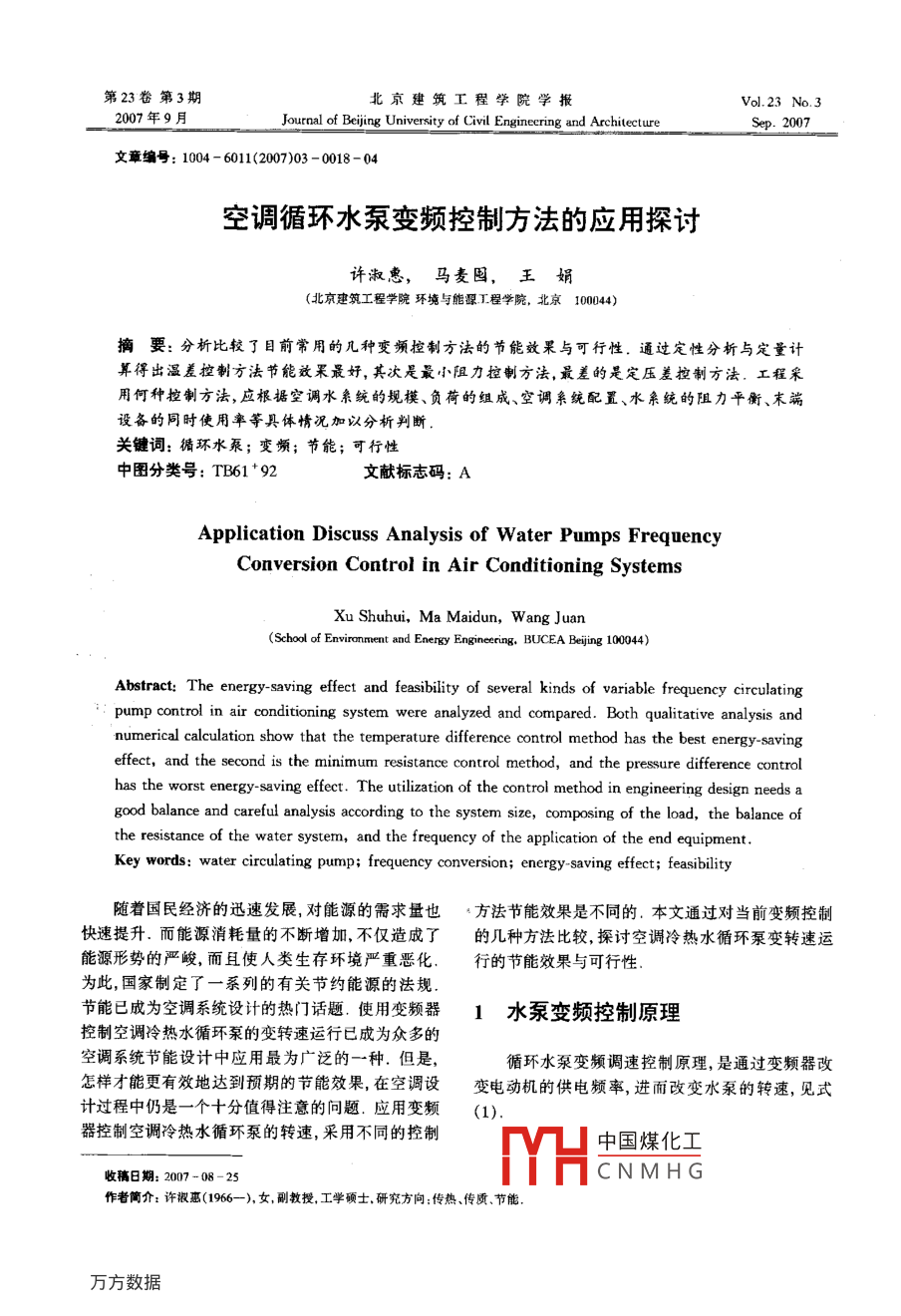 第23卷第3期北京建筑工程學(xué)院學(xué)報Vol.23 No.32007年9月Journal of Beijing University of Civil Enginecring and ArchitectureSep.2007文章編號: 1004 - 6011(2007)03 -0018-04空調(diào)循環(huán)水泵變頻控制方法的應(yīng)用探討許淑惠,馬麥囤,王娟(北京建筑工程學(xué)院環(huán)境與能源工程學(xué)院,北京10044)摘要:分析比較了目前常用的幾種變頻控制方法的節(jié)能效果與可行性.通過定性分析與定量計算得出溫差控制方法節(jié)能效罘最好,其次是最小阻力控制方法,最差的是定壓差控制方法.工程采用何種控制方法,應(yīng)根據(jù)空調(diào)水系統(tǒng)的規(guī)模、負荷的組成、空調(diào)系統(tǒng)配置、水系統(tǒng)的阻力平衡、末端設(shè)備的同時使用率等具體情況加以分析判斷.關(guān)鍵詞:循環(huán)水泵;變頻;節(jié)能;可行性中圖分類號: TB61+92文獻標志碼: AApplication Discuss Analysis of Water Pumps FrequencyConversion Control in Air Conditioning SystemsXu Shuhui, Ma Maidun, W ang Juan(School of Environment and Energy Engncering. BUCEA Beijing 10044Abstract: The energy- saving effect and feasibility of several kinds of variable frequency circulatingpump control in air conditioning system were analyzed and compared. Both qualitative analysis andnumerical calculation show that the temperature diference control method has the best energy -savingeffect, and the second is the minimum resistance control method, and the pressure difference controlhas the worst energy-saving efct. The utilization of the control method in engineering design needs agood balance and careful analysis according to the system size, composing of the load, the balance ofthe resistance of the water system, and the frequency of the appliation of the end equipment.Key words: water circulating pump; frequency conversion; energy saving effect; feasibility隨著國民經(jīng)濟的迅速發(fā)展,對能源的需求量也。 方法節(jié)能效果是不同的.本文通過對當(dāng)前變頻控制快速提升.而能源消耗量的不斷增加,不僅造成了的幾種方法比較,探討空調(diào)冷熱水循環(huán)泵變轉(zhuǎn)速運能源形勢的嚴峻,而且使人類生存環(huán)境嚴重惡化.行的節(jié)能效果與可行性.為此,國家制定了一系列的有關(guān)節(jié)約能源的法規(guī).節(jié)能已成為空調(diào)系統(tǒng)設(shè)計的熱門話題.使用變頻器1 水泵變頻控制原理控制空調(diào)冷熱水循環(huán)泵的變轉(zhuǎn)速運行e成為眾多的空調(diào)系統(tǒng)節(jié)能設(shè)計中應(yīng)用最為廣泛的一種.但是,循環(huán)水泵變頻調(diào)速控制原理,是通過變頻器改怎樣才能更有效地達到預(yù)期的節(jié)能效果,在空調(diào)設(shè)變電動機的供電頻率,進而改變水泵的轉(zhuǎn)速,見式計過程中仍是-一個十分值得注意的問題.應(yīng)用變頻(1).器控制空調(diào)冷熱水循環(huán)泵的轉(zhuǎn)速,采用不同的控制中國煤化工收稿日期: 2007 -08 - 25MYHCNMHG作者簡介:許衩惠(1966-),女,副教授,工學(xué)碩士.研究方向:傳熱、傳質(zhì)、節(jié)能.第3期許淑惠等:空調(diào)循環(huán)水泵變額控制方法的應(yīng)用探討1處于全開狀態(tài)的控制方法.n=60f(1)(4)溫差控制.控制供、回水干管水溫差保持式中, n為轉(zhuǎn)子轉(zhuǎn)速, r/ min;60為換算系數(shù), s/ min; .恒定的控制方法,稱為溫差控制[3].當(dāng)負荷下降時,f為電源頻率, Hz;s為定子與轉(zhuǎn)子之間的轉(zhuǎn)差率;如流量保持不變,則回水溫度下降,溫差相應(yīng)變小,m為電動機繞組的極對數(shù).由式(1)可見,轉(zhuǎn)數(shù)與要保持溫差不變,可通過控制溫差控制器、變頻器來頻率成正比,改變頻率就可以實現(xiàn)水泵調(diào)速.降低水泵轉(zhuǎn)速,臧少水流量,此時水泵能耗以轉(zhuǎn)速三根據(jù)水泵的相似定律,兩種流體應(yīng)滿足幾何相次方的關(guān)系遞減.似、動力相似和運動相似,則水泵的轉(zhuǎn)速、流量揚程和功率之間存在以下關(guān)系[":3控制方法的節(jié)能效果比較Q= n(2)圖1是不同控制方式下水泵運行工況示意圖.是=(衛(wèi)”(3)采用 不同的控制方式,所對應(yīng)的管路特性曲線各不相同采用定揚程控制,曲線A為水力特性曲線,N=(衛(wèi)(4)水泵工作點揚程始終為H.采用定末端壓差控制,式(2)-(4)中,n為水泵轉(zhuǎn)速, r/min;Q為水泵流曲線B為水力特性曲線,H是末端環(huán)路要求保持量,m/h;H為水泵揚程, m;N為水泵功率,kW.的壓差, Q=0時,△H= H.采用最小阻力控制, .曲線C為水力特性曲線,Q=0時,0H=H2.采用把(2)式代入(4)式得到溫差控制,曲線D是的水力特性曲線,此曲線即為是=器!”(5)空調(diào)水系統(tǒng)原有的管路特性曲線, Q=0時,管路系式(5)表明,水泵所耗功率與流量的三次方成正比.統(tǒng)阻力△H=0.水泵變頻控制節(jié)能分析以此為理論依據(jù),但在實際H應(yīng)用中,式(5)只在極少情況下成立(21.2控制方法當(dāng)前應(yīng)用較多的空調(diào)冷熱水循環(huán)泵變轉(zhuǎn)速調(diào)節(jié)方法有定壓差控制、定末端壓差控制、最小阻力控制和溫差控制.(1)定壓差控制.控制供、回水干管壓差保持圖1幾種控制方 法的比較恒定的控制方法稱為定壓差控制.供、回水干管壓采用單一調(diào)節(jié)閥控制時,比較前述4種控制方差不變時水泵提供的揚程保持恒定,故定壓差控制法的節(jié)能效果.當(dāng)流量從Qo減小到Qi時,定揚程又稱為定揚程控制.此控制方法做法是:根據(jù)冷熱控制的工作點從a.定揚程移到b.定末端壓差控制水循環(h