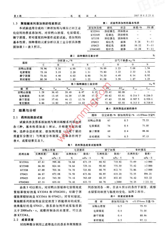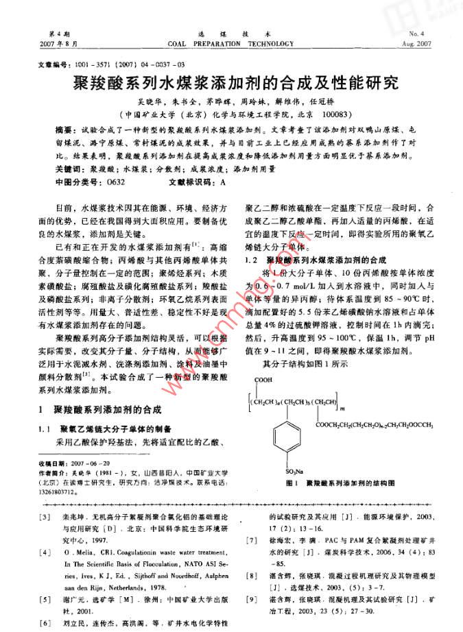選媒末COAL PREPARATION TECHNOLOCY文章編號(hào):101-3571(2007104-0037-03聚羧酸系列水煤漿添加劑的合成及性能研究吳曉華,朱書全,茅曄輝,周玲蛛,解維偉,任冠橋中國(guó)礦業(yè)大學(xué)(北京)化學(xué)與環(huán)境工程學(xué)院,北京10083)摘要:試恥合成了一種新型的聚羧酸系列水煤漿添加劑。文章考查了該添加劑對(duì)雙鴨山原煤、屯留泥、路寧原煤、常村煤泥的成菜效果,并與目前工業(yè)上已經(jīng)應(yīng)用成熟的幕系添加劑作了對(duì)比。結(jié)果表明,聚羧酸系列添加劑在堤高威漿濃度和降低添加劑用量方面明顯優(yōu)于幕系添加劑關(guān)鍵詞:聚羧酸;水煤漿;分散劑;成漿濃度;添加劑用量中圖分類號(hào):0632文獻(xiàn)標(biāo)識(shí)碼:A目前,水煤漿技術(shù)因其在能源、環(huán)境、經(jīng)濟(jì)方聚乙二醇和濃硫酸在一定溫度下反應(yīng)一段時(shí)間,合面的優(yōu)勢(shì),已經(jīng)在我國(guó)得到大面積應(yīng)用。要制備優(yōu)成聚乙二醇乙酸單酯,再加入適量的丙烯酸,在適良的水煤漿,添加劑是關(guān)鍵。宜的溫度下反應(yīng)一定時(shí)間,即得實(shí)驗(yàn)所用的聚氧乙已有和正在開發(fā)的水煤漿添加劑有:高縮烯鏈大分子單體合度萊磺酸縮合物;丙烯酸與其他丙烯酸單體共1.2聚羧酸系列水煤漿添加劑的合成聚,分子量控制在一定的范圍;聚烯烴系列;木質(zhì)將1份大分子單體、10份丙烯酸按單體濃度素磺酸鹽;腐殖酸鹽及磺化腐殖酸鹽系列;羧酸鹽為0.6-0.7mo/L加入到水溶液中,同時(shí)加入與及磷酸鹽系列;非離子分散劑;環(huán)氧乙烷系列表面單體等量的異丙醇;待體系溫度到85-90℃時(shí)活性劑等等。用量大、普適性差、穩(wěn)定性不好是現(xiàn)滴加配置好的5.5份苯乙烯磺酸鈉水溶液和占單體有水煤漿添加劑存在的問(wèn)題總量4%的過(guò)硫酸鉀溶液,控制時(shí)間在1h內(nèi)滴完;聚羧酸系列高分子添加劑結(jié)構(gòu)靈活,可以根據(jù)然后,升高溫度到95~100℃,保溫Ih,調(diào)節(jié)pH實(shí)際需要,改變其分子量、分子結(jié)構(gòu),從而能夠廣值在9-11之間,即得聚羧酸水煤漿添加劑泛用于水泥減水劑、洗滌劑添加劑、涂料及油墨中其分子結(jié)構(gòu)如圖1所示顏料分散劑口。本試驗(yàn)合成了一種新型的聚羧酸c系列水煤漿添加劑。CH:CH(HCH知(CH21聚羧酸系列添加劑的合成1.1聚氧乙烯鏈大分子單體的制備H=CH, CHyOOCCH采用乙酸保護(hù)羥基法,先將適宜配比的乙酸、收稱日期:2007-06-20作者簡(jiǎn)介:吳曉華(1981-),,山西昌陽(yáng)人,中國(guó)礦業(yè)大學(xué)So, Na,)在讀爆士研究生,研究方:凈娛術(shù)。聯(lián)系電話圖1蹶羧系列添加荊的結(jié)構(gòu)圖13261803712。[3]秦兆坤,無(wú)機(jī)高分子絮凝劑聚合氯化鋁的基礎(chǔ)理論的試驗(yàn)研充及其應(yīng)用[]·能源環(huán)堆保護(hù),2003,與應(yīng)用研究(D],北京:中國(guó)科學(xué)院生態(tài)環(huán)境研究中心,19977]徐海宏,李滿,PAC與PAM復(fù)合冢凝劑處理礦井[4 0. Melia, CRI Coagulationin waste water treatmen水的研究]·煤炭科學(xué)技術(shù),2006,34(4):83ns,ⅳe,K,E, Sijthoff and Noord, Alphen[8湛含輝,張曉琪,凝過(guò)程機(jī)理研究及其物理模型aan den Rijn, Netherlands, 1978.J!,選煤技術(shù),2003,(5);3-75]謝廣元,選礦學(xué)[M].徐州:中國(guó)礦業(yè)大學(xué)出版[9]湛含輝,張曉璞,混凝機(jī)理及其試驗(yàn)研究[J],礦社冶T程,2003,23(5);27-30[61劉立民,連傳杰,高拱鬧,等,礦井水電化學(xué)特性一枝長(zhǎng)200年8月25日1.3聚羧酸系列添加劑的的性能試表1試治用添加劑的基本性質(zhì)本試驗(yàn)選用合成的三種添加劑與現(xiàn)在已經(jīng)工業(yè)添加劑名稱濃度/%PH化應(yīng)用的萘系添加劑,對(duì)雙鴨山原煤、屯留煤泥KY334A黃色固體粉末常村煤泥四種煤作成漿試驗(yàn)。添加劑的KY33棕黃色固體粉末、四種煤的元素分析以及工業(yè)分析具體數(shù)棕紅色28據(jù)如裘1~表3所示粽紅色液體10.329-11粽紅色液體12289-11表2四種煤的元素分析分析基/%空氣干燥基wn/%潞寧原煤常村煤泥表3四種煤的工業(yè)分析山原煤6.5555.4屯倒煤泥17.2368.6283.610.21470.2165路寧原煤44.1212.763.02476355.880.90750.9261案村燥泥9711.8211.9272.9083.030.31330.3162結(jié)果與分析藥劑選試驗(yàn)的條件2.1藥劑的篩選試驗(yàn)煤樣設(shè)定濃度/%添加劑用量/%<004m含量%試驗(yàn)共涉及萘系添加劑與聚丙烯酸系列添加劑雙鴨山原煤各三種,基本性質(zhì)如表1所示,并根據(jù)不同的煤種,選擇合適的濃度、添加劑用量(以噸干煤的質(zhì)量百分?jǐn)?shù)計(jì))與粒度分布制漿,具體條件列于常村螺泥4表4,成漿結(jié)果見表5。表5藥劑篩選成漿試驗(yàn)結(jié)果屯留煤泥略寧原煤常村煤泥藥劑名稱實(shí)測(cè)濃度/黏度/實(shí)測(cè)濃度/黏度/實(shí)測(cè)濃度黏度/實(shí)測(cè)濃度/黏度>2000824.6609703.36725.88812.773.8666.87672.0850675,86619.20070423672374.166968.35832.474.42923.22635.01622.720074.251221.01由表5可以看出,對(duì)雙鴨山原煤和屯留煤泥成列添加劑各一種,在表6所示的條件下制漿,觀察漿結(jié)果較好的是KY34A和07042401;對(duì)路寧原水煤漿的濃度與黏度的變化,如圖2所示煤效果較好的是KY334A和070421;對(duì)常村煤泥,聚羧酸系列淋加劑在設(shè)定濃度下都能很好的成漿添加劑川量/<004mm含量/效果最好的是070421,萘系添加劑所成漿黏度都雙鴨山原煤大于2000mPa·8,觀察所制備的水煤漿