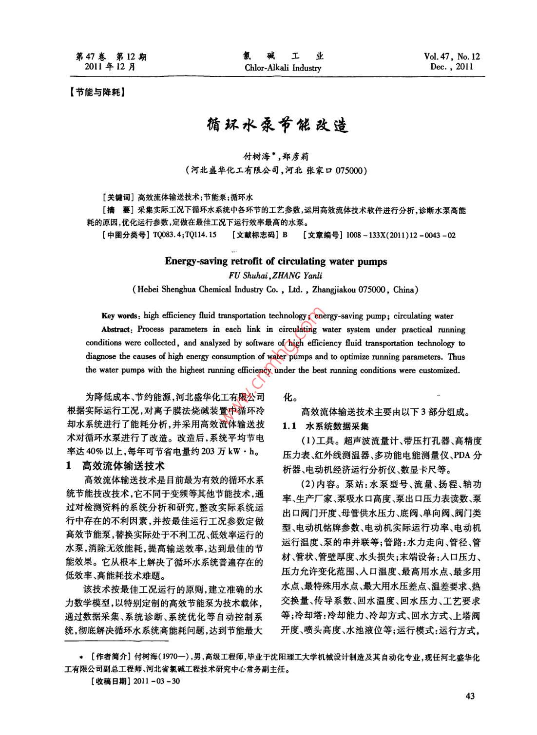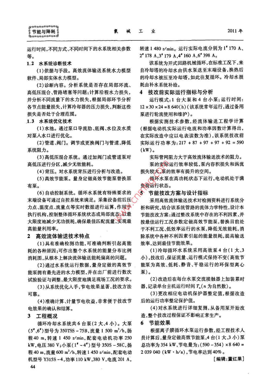 第47卷第12期氯堿工業(yè)2011年12月Chlor-Alkali IndustryD2011【節(jié)能與降耗】循環(huán)水錄節(jié)能改造付樹?!?鄭彥莉(河北盛華化工有限公司,河北張家口075000[關(guān)鍵詞]高效流體輸送技術(shù);節(jié)能泵;循環(huán)水[摘要]采集實際工況下循環(huán)水系統(tǒng)中各環(huán)節(jié)的工藝參數(shù),運用高效流體技術(shù)軟件進行分析,診斷水泵高能耗的原因,優(yōu)化運行參數(shù),定做在最佳工況下運行效率最高的水泵。[中圖分類號]T00834;TQ11415[文獻標(biāo)志碼]B[文章編號]1008-133X(2011)12-0043-02Energy-saving retrofit of circulating water pumpsFU Shuhai. ZHANG YanliHebei Shenghua Chemical Industry Co., Ltd, Zhangjiakou 075000, China)Key words: high efficiency fluid transportation technology; energy-saving pump; circulating waterAbstract: Process parameters in each link in circulating water system under practical runningconditions were collected, and analyzed by software of high efficiency fluid transportation technology todiagnose the causes of high energy consumption of water pumps and to optimize running parameters. Thusthe water pumps with the highest running efficiency under the best running conditions were customized為降低成本、節(jié)約能源,河北盛華化工有限公司化。根據(jù)實際運行工況,對離子膜法燒堿裝置中循環(huán)冷高效流體輸送技術(shù)主要由以下3部分組成。卻水系統(tǒng)進行了能耗分析,并采用高效流體輸送技1.1水系統(tǒng)數(shù)據(jù)采集術(shù)對循環(huán)水泵進行了改造。改造后,系統(tǒng)平均節(jié)電(1)工具。超聲波流量計、帶壓打孔器、高精度率達40%以上,每年可節(jié)省電量約203萬kWb壓力表紅外線測溫器、多功能電能測量儀、PDA分1高效流體輸送技術(shù)析器、電動機經(jīng)濟運行分析儀數(shù)顯卡尺等高效流體輸送技術(shù)是目前最為有效的循環(huán)水系2)內(nèi)容。泵站:水泵型號、流量、揚程、軸功統(tǒng)節(jié)能技改技術(shù),它不同于變頻等其他節(jié)能技術(shù),通率、生產(chǎn)廠家泵吸水口高度泵出口壓力表讀數(shù)泵過對檢測資料的系統(tǒng)分析和研究整改實際系統(tǒng)運出口閥門開度、母管供水壓力底閥單向閥、閥門類行中存在的不利因素,并按最佳運行工況參數(shù)定做高效節(jié)能泵,替換實際處于不利工況低效率運行的型、電動機銘牌參數(shù)、電動機實際運行功率、電動機水泵消除無效能耗提高輸送效率達到最佳的節(jié)運行溫度、泵的串并聯(lián)等;管路水力走向、管徑、管能效果。它從根本上解決了循環(huán)水系統(tǒng)普遍存在的材、管狀、管壁厚度、水頭損失;末端設(shè)備:人口壓力低效率、高能耗技術(shù)難題。壓力允許變化范圍、入口溫度、最高用水點、最多用該技術(shù)按最佳工況運行的原則建立準(zhǔn)確的水水點最特殊用水點、最大用水壓差點溫差要求熱力數(shù)學(xué)模型,以特別定制的高效節(jié)能泵為技術(shù)載體,交換量、傳導(dǎo)系數(shù)回水溫度、回水壓力、工藝要求通過數(shù)據(jù)釆集、系統(tǒng)診斷、系統(tǒng)優(yōu)化等自動控制系等;冷卻塔:冷卻能力、冷卻方式、回水方式、上塔閥統(tǒng)徹底解決循環(huán)水系統(tǒng)高能耗問題,達到節(jié)能最大開度、噴頭高度、水池液位等;運行模式:運行方式[作者簡介]付樹海(1970),男高級工程師畢業(yè)于沈陽理工大學(xué)機械設(shè)計制造及其自動化專業(yè),現(xiàn)任河北盛華化工有限公司副總工程師河北省氯堿工程技術(shù)研究中心常務(wù)副主任。[收稿日期]2011-03-30∮s節(jié)能與降耗氯堿工業(yè)2011年ess運行時間,不同方式不同時間下的水系統(tǒng)相關(guān)參數(shù)轉(zhuǎn)速l480r/min。運行實際電流分別為1·170A、等2178A,3·179A,4"160A,6′°398A。1.2水系統(tǒng)診斷技術(shù)該系統(tǒng)為開式回路機械循環(huán),在標(biāo)準(zhǔn)工況下,來(1)依據(jù)與手段。高效流體輸送系統(tǒng)水力模型自冷卻塔的冷卻水由供水泵送至末端設(shè)備,換熱后軟件、局部實體水力模型。的冷卻水被壓至冷卻塔,如此往復(fù)循環(huán)。冷卻水損(2)診斷內(nèi)容。分析系統(tǒng)是否存在局部環(huán)流、耗由補水系統(tǒng)補給。高低壓混合、管路堵塞等問題;計算沿程水力損失,4技改前實際運行指標(biāo)與分析并分析不同流量下的水力損失,根據(jù)局部環(huán)節(jié)分析運行模式:1臺大泵和4臺小泵;運行時間:各節(jié)點能量損失,計算冷卻器的壓力損失,判斷這些12×30×24=8640(h)(該系統(tǒng)常年運行,通過備用損失是否處于合理范圍。泵進行輪流使用和維護)。13水系統(tǒng)優(yōu)化技術(shù)根據(jù)實測技術(shù)參數(shù),經(jīng)流體輸送工程學(xué)計算(1)水池。通過泵口導(dǎo)流肋、底閥、水位及水質(zhì)(根據(jù)電動機實際運行電流和功率因數(shù)計算得出,對泵入水口進行優(yōu)化。在實際改造中應(yīng)以電表讀數(shù)為準(zhǔn)),該系統(tǒng)技改前2)管道、閥門。調(diào)節(jié)或更換閥門與管道降低實際運行功率為:217+87+97+97+92=590系統(tǒng)阻力。(kW)。(3)高低壓混合系統(tǒng)。通過加閥門或管道泵對實際管網(wǎng)阻力大于高效流體輸送技術(shù)的阻力。高低壓進行分區(qū),減少無效能耗。泵的實際運行效率較低,泵內(nèi)容積損失和渦流(4)背壓。對水系統(tǒng)背壓進行分析與改造。損失較大,泵的效率有提升