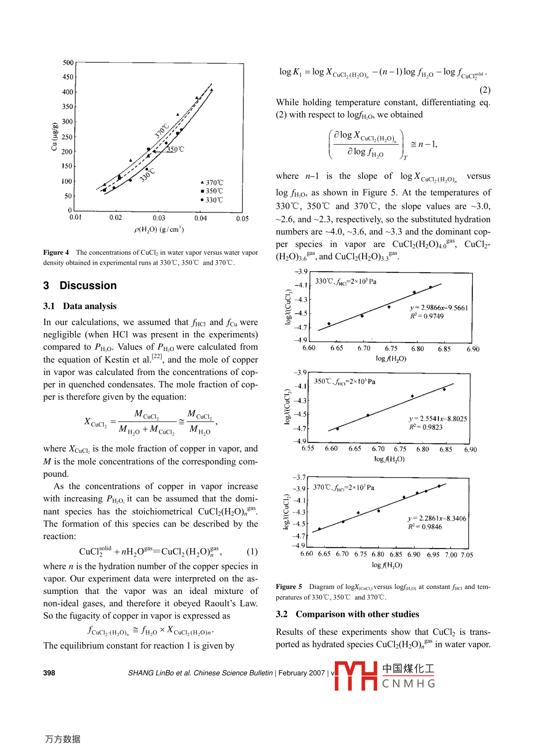Chinese Science Bulletin@ 2007 Science in China PressSpringer-VerlagAn experimental study on the solubility of copperbichloride in water vaporSHANG LinBo*, BI XianWu, HU RuiZhong & FAN WenLingState Key Laboratory of Ore Deposit Geochemistry, Institute of Geochemistry, Chinese Academy of Sciences, Guiyang 550002,ChinaUsing the solubility method, the solubility of CuCl2 in liquid-undersaturated HCl-bearing water vaporwas investigated experimentally at temperatures of 330- 370C and pressures of 4.2- 10 MPa. The re-sults have shown that hydration could significantly enhance copper solubility and the concentrationsof copper were positively correlated with Pr,o. The solubility of copper in vapor phase increased withincreasing Pr,o at the constant temperature. CuCl2 was transported as hydrated species CuCl2(H2O)ngasin water vapor. The formation of complexes is proposed to be the result of the following reaction: .CuClzaolid + nH2Oas = CuCI2 (H2O),gasThe hydration number n decreased slightly with increasing temperature. Statistical hydration numbersare 4.0, 3.6 and 3.3 at 330, 350 and 370"C, respectively.CuCl2, water vapor, solubilit, experimental studyThe vapor transport of metals is an important geo-solubility of metals in vaporThe high concentra-chemical process. For example, the condensates of vol-tions of the transition metal copper in vapor can be takencanic gases commonly contain appreciable concentra-as a typical example. The highest concentration of cop-tions of metalst- ; the high concentrations of metalsper reported is 8.4x10 in the condensates of volcanichave been detected in vapor -rich fluid inclusions8-12]gases", and recent LA-ICP-MS analyses have revealedand the condensates of metal compounds usually exist in that its concentrations are as high as 3.3wt% in vapor-the dash of flue in the process of metallurgyl'5s. Previousrich fluid inclusions' 10. The available copper volatilityexperimental research on metals in vapor focused on the data can not explain the high concentrations of copper involatility of metals or their compounds, and it was con-vapor-rich fluid inclusionst19. In order to shed light onsidered that only highly volatile metals could be trans- the mechanisms of the dissolution and transport of cop-ported in vapor.per in vapor, more experiments need to be done. Up toBut more and more weakly volatile metals (Cu, Au,now, only Archibald et al."4 described the behavior ofZn, Pb, Fe and so on) have been detected in vapor,copper in water vapor at 280 to 320C. The resultswhich makes researchers have to think about whether orshowed that water vapor could enhance the solubility ofnot the metal transport in vapor is solely related withcopper in vapor. But at higher temperatures, little isthe volatility of metals. In addition to the voltility ofknown about the behavior of copper differing in valencemetals, which factors enhance the solubility of metalsin vapor. This paper presents the results of experimentsin vapor? How significant are the metallic elementsReceived April 12, 2006; accepted June 13, 2006transported in vapor? In recent years, the vapor transportdoi: 10.1007/s11434-007-0039-xof metals has attracted ever increasing attention, andCorresponding author (email: s 2000@sina. com)results of experimental research have shown that sol-Supported jointly by the Knowledge Innovation Program of the Chinese Academy ofSciences (Grant No. KZCX3-SW-125), the National Natural Science Foundation ofvents such as H2O, HCl and H2S could enhance theChina (Grant Nos.40503007 and 40373020) and the Westem Light Programwww.scichina.com www.springerlink.comChinese Science中國煤化工no. 3 | 395-400MYHCNMHG.for the solubility of CuCl2 in HCl-bearing water vapor at330 to 370"C.1 Experimental methodThe experimental method used in this study is identicalto that employed by Migdisov et al.l4] and Archibald etal.!I7!. The experiments were conducted in titaniumautoclaves at temperatures between 330°C and 370°Cand pressures up to 10 MPa. Each of the autoclaves wasconditioned with nitric acid to produce a protective layerof TiO2 on the inner surface. Autoclave volumes were( H,0determined by flling the autoclaves with 25°C distilled( HCIwater from a Teflon flask, and this flask was weighedbefore and after flling. This pressure was calculated inCuC,(H,O);和terms of the autoclave volume and the equation of statefor water of Kestin et a1.44 . The autoclaves were heatedin a forced draft oven (Sx2-6-6). The temperature gra-dient in the furnace was less than 0.5C over the height( H,Oof the autoclave. .The autoclave was loaded with one open quartz am-HCIHC)poule containing CuCl2 2H2O (Figure 1). A known massof H2O-HCl solution (HCl, optima -grade) with a prede-(HO)termined composition was placed at the bottom of theautoclave using a syringe in order to prevent contact ofCuclgdsolid CuCl2 and liquid. Care was taken to ensure that themass introduced did not saturate the system with liquidunder the experimental conditions, and CuCl2 only dis-solved in dry vapor. After each run, the autoclaves wereremoved from the oven and quenched in cold water, andthe condensates were collected for analysis. Several mil-liliters of 1:5 HNO3 were added to dissolve any copperprecipitated on the walls of the autoclaves. The concen-58mm,trations of dissolved copper in the condensates andwashing solutions were determined by atom absorptionFigure 1 Sketch of a titanium autoclave used in this study. The auto-spectroscopy (PE5 100).clave contains a CuCl2 reagent-bearing quartz capsule.2 Experimental resultsTable 1 Solubility of CuCl2 in vapor phase as a function of timeTime (d)_T(C)_fruo(x10'Pa)Cuyapor (ug/g)To determine the duration required for the reaction to3303.914.22reach equilibrium, a series of kinetic experiments were3.92118.78performed for 1 to 16 days. At the given temperature,3337.02equilibrium was attained 8 days later (Table 1 and Fig-53.11ure 2). Figure 2 shows that once equilibrium wa8.69.21070.90reached, the solub