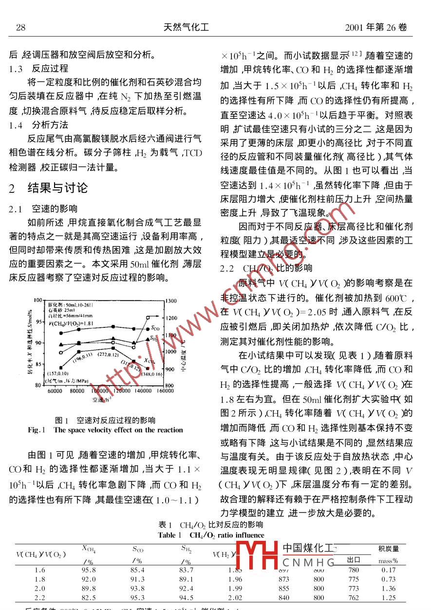 第1期陶家林等押烷氧化制合成氣300m3J/d規(guī)模擴試y3<>y甲烷氧化制合成氣300規(guī)模擴試技>>x>x發(fā)>陶家林*李慶康星武林世滸于作龍中國科學院成都有機化學研究所成都610041)摘要在自制催化劑上進行了甲烷氧化制合成氣工藝300m3/d規(guī)模的擴大實驗。實驗表明在原料氣中加入少量水蒸氣抑制了反應初期表面N晶粒的燒結尤其是抑制了床層上部催化劑N晶粒的燒結提高催化劑活性甲烷轉化率、CO和H2選擇性分別可達到94%~96%、90%-92%、94%-99%在 VCHyVO2yWH2O)=1.90/1/0.22、千氣空速1.3×105/h、30m3/d規(guī)模20h壽命實驗中甲烷轉化率和〔O選擇性均大于90%而H選擇性高達9%以上催化劑顯示了較好的活性和穩(wěn)定性實驗也表明在髙密度放熱狀態(tài)下甲烷催化部分氧化制合成氣工藝具備可操作性和工業(yè)化潛力但工藝參數(shù)的優(yōu)化有賴于工程模型的建立需要進一步旳擴大實驗。關鍵詞押烷氧化洽成氣試中圖分類號:E665.3文獻標識碼∶文章編號1001-92192001)1-27040前言和出現(xiàn)飛溫結果不同于一般反應其放大效應將更為明顯、對催化劑的要求和工藝過程控制將更由于石油資源的日漸減少和我國大量新的夭為苛刻因而反應規(guī)模的逐級放大研究對該過程然氣資源的發(fā)現(xiàn),用天然氣轉化為液體產品向工業(yè)化發(fā)展是至關重要的。MeOh dme液體燃料等(GTL過程)以取代部本文通過對Ni擔載量、不同的載體、助劑、貴分石油資源調整我國能源結構及其消費結構的金屬添加劑等催化劑制備技術的全面考察開發(fā)出失衡現(xiàn)象是我國能源結構調整的重要戰(zhàn)略目標,了含少量P的負載Ni金屬催化劑311在1ml催是關系到我國國民經濟在下世紀能否持續(xù)快速發(fā)化劑下完成500h壽命試驗表明催化劑具有較高展的基礎所以天然氣的綜合利用近年來受到人的活性、穩(wěn)定性和抗積炭能力。本文考察了在放大們的廣泛重視。而天然氣化工產品中60%的產狀態(tài)下反應溫度、壓力、空速、原料氣組成對催化品成本和裝置投資在于造氣部分12所以一直劑活性、催化劑及工藝過程穩(wěn)定性的影響。制備個主要過程水蒸汽重整、()重整和催化直接氧1實驗部分化或上述3個過程間的組合過程沖催化直接氧1.1催化劑的制備化法是溫和的放熱過程,它具有能耗低、產生適于本文所用催化劑為浸漬法制備具體制備過FT合成和合成醇的合成氣(V(H2yV(CO)程見文獻1132)超高空速≥1×105h-1河大大地提高生產效1.2反應裝置率等優(yōu)點被視為是最有開發(fā)前景的工藝是降低脫硫后的天然氣經質量流量計計量后(天然造氣成本和投資的最可行方法。氣組成為:甲烷,92.25%;乙烷3.14%;丙烷雖然甲烷直接部分氧化制合成氣為弱放熱反0.75%汀烷混合物0.16%戎烷混合物0.12%應但由于反應空速大放熱密度高停留時間短,二中國煤化工%主要為氮氣;平均使得過程散熱困難易于在催化劑床層形成熱點分子CNMHG打入的經氣化后的收稿日期20007-10基金來源油中國科學院技術水蒸汽混合然后在與經質量流量計計量并預熱重點項目資助作者簡介陶家林男,1962年生副研后的氧氣99.5%在T型混合器混合。天然氣、究員;興通訊聯(lián)系人O和水蒸氣在保溫下流經預熱器加熱到400℃然后在反應器反應尾氣經盤管冷卻除去冷凝水28天然氣化工2001年第26卷后經調壓器和放空閥后放空和分析。×105h-1之間。而小試數(shù)據(jù)顯示121隨著空速的1.3反應過程増加,甲烷轉化率、O和H’的選擇性都逐漸增將一定粒度和比例的催化劑和石英砂混合均加當大于1.5×10h-以后CH4轉化率和H2勻后裝填在反應器中,在純N2下加熱至引燃溫的選擇性有所下降而CO的選擇性仍有所提高度切換混合原料氣待反應穩(wěn)定后取樣分析直至空速達4.0×105h1以后趨于平衡。對照表1.4分析方法明擴試最佳空速只有小試的三分之二這是因為反應尾氣由高氯酸鎂脫水后經六通閥進行氣采用了更薄的床層即更小的高徑比對于不同直相色譜在線分析。碳分子篩柱為載氣,TCD徑的反應管和不同裝量催化劑高徑比)其氣體檢測器校正碳歸一法計量。線速度最佳值是不同的。從圖1也可以看出當2結果與討論空速達到1.4×105h-1,雖然轉化率下降但由于床層阻力增大使催化劑柱前壓力上升空間熱量2.1空速的影響密度上升導致了飛溫現(xiàn)象。如前所述甲烷直接氧化制合成氣工藝最顯因而對于不同反應器、床層高徑比和催化劑著的特點之一就是其高空速運行,設備利用率高粒度阻力)其最適空速不同涉及這些因素的工但同時卻帶來傳質和傳熱困難這是加劇放大效程模型建立是必要的應的重要因素之一。本文采用50m催化劑薄層2.2CH/O2比的影響床反應器考察了空速對反應過程的影響。原料氣中WCH4yW(O2)影響考察是在非控溫狀態(tài)下進行的。催化劑被加熱到600℃,在CH4yWO2)=2.05時通入原料氣在反E9511200KCH小應被引燃后即關閉加熱爐,依次降低C/O,比,題→測定其對催化劑性能的影響。1(272.12在小試結果中可以發(fā)現(xiàn)見表1)隨著原料900氣中C/O2比的增加CH4轉化率降低而CO和H的選擇性提高,一般選擇ⅸCH4yVO2)在6000080000100000120000140000160000空速8左右為宜。但在50m催化劑擴大實驗中如圖1空速對反應過程的影響圖2所示)AH4轉化率隨著W(CH4yV(O2舶Fig. 1 The space velocity effect on the reaction增加而降低而(O和H’選擇性則基本保持不變或略有下降這與小試結果是不同的顯然結果