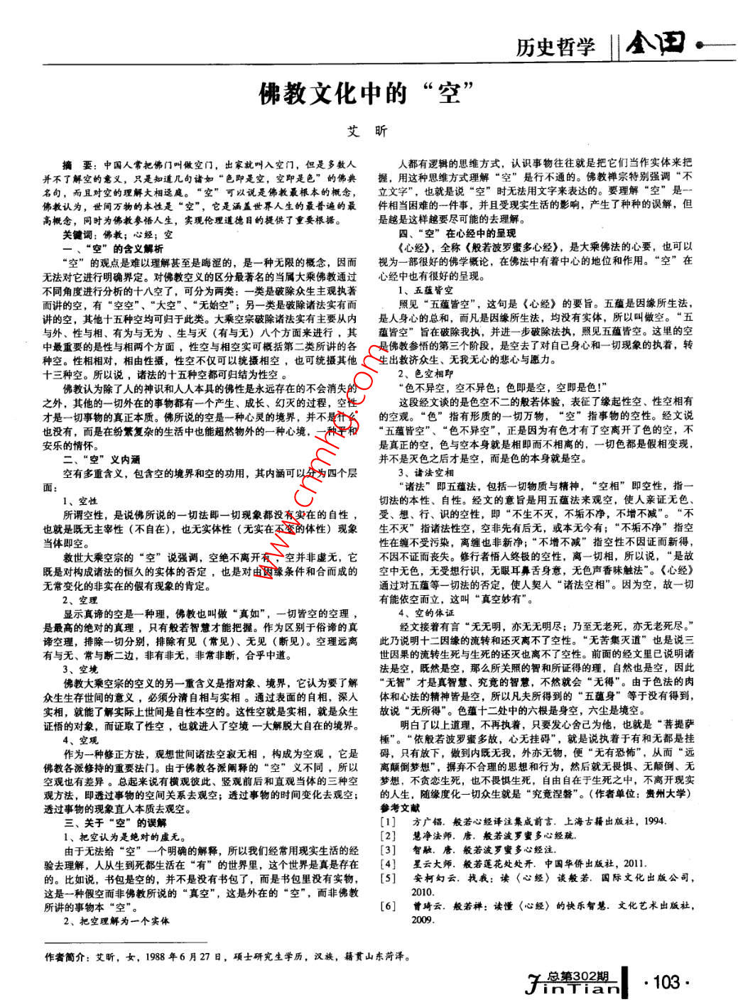 歷史哲學(xué)A口佛教文化中的“空”艾昕摘要:中國人常把佛門叫做空門,出家就叫入空門,但是多數(shù)人人都有邏輯的思維方式,認(rèn)識事物往往就是把它們當(dāng)作實體來把并不了解空的意義,只是知道幾句諸如“色即是空,空即是色”的佛典握,用這種思維方式理解“空”是行不通的。佛教禪宗特別強調(diào)“不名句,而且對空的理解大相逕庭?!翱铡笨梢哉f是佛教最根本的概念,立文字”,也就是說“空”時無法用文字來表達(dá)的。要理解“空”是佛教認(rèn)為,世間萬物的本性是“空”,它是涵蓋世界人生的最普遍的最件相當(dāng)困難的一件事,并且受現(xiàn)實生活的影響,產(chǎn)生了種種的誤解,但高概念,同時為佛教參悟人生,實現(xiàn)倫理道德目的提供了重要根據(jù)。是越是這樣越要盡可能的去理解。關(guān)鑣詞:佛教;心經(jīng);空四、“空”在心經(jīng)中的呈現(xiàn)一、“空”的含義解析《心經(jīng)》,全稱《般若波羅蜜多心經(jīng)》,是大乘佛法的心要,也空”的觀點是難以理解甚至是晦澀的,是一種無限的概念,因而視為一部很好的佛學(xué)概論,在佛法中有著中心的地位和作用。“空”在無法對它進(jìn)行明確界定。對佛教空義的區(qū)分最著名的當(dāng)屬大乘佛教通過心經(jīng)中也有很好的呈現(xiàn)。不同角度進(jìn)行分析的十八空了,可分為兩類:一類是破除眾生主觀執(zhí)著1、五蘊皆空而講的空,有“空空”、“大空”、“無始空”;另一類是破除諸法實有而照見“五蘊皆空”,這句是《心經(jīng)》的要旨。五蘊是因緣所生法,講的空,其他十五種空均可歸于此類。大乘空宗破除諸法實有主要從內(nèi)是人身心的總和,而凡是因緣所生法,均沒有實體,所以叫做空?!拔迮c外、性與相、有為與無為、生與滅(有與無)八個方面來進(jìn)行,其蘊皆空”旨在破除我執(zhí),并進(jìn)一步破除法執(zhí),照見五蘊皆空。這里的空中最重要的是性與相兩個方面,性空與相空實可概括第二類所講的各是佛教參悟的第三個階段,是空去了對自己身心和一切現(xiàn)象的執(zhí)著,轉(zhuǎn)種空。性相相對,相由性攝,性空不僅可以統(tǒng)攝相空,也可統(tǒng)攝其他生出救濟(jì)眾生、無我無心的悲心與愿力。十三種空。所以說,諸法的十五種空都可歸結(jié)為性空2、色空相即佛教認(rèn)為除了人的神識和人人本具的佛性是永遠(yuǎn)存在的不會消失的“色不異空,空不異色;色即是空,空即是色!”之外,其他的一切外在的事物都有一個產(chǎn)生、成長、幻滅的過程,空性這段經(jīng)文談的是色空不二的般若體驗,表征了緣起性空、性空相有才是一切事物的真正本質(zhì)。佛所說的空是一種心靈的境界,并不是什么的空觀?!吧敝赣行钨|(zhì)的一切萬物,“空”指事物的空性。經(jīng)文說也沒有,而是在紛繁復(fù)雜的生活中也能超然物外的一種心境,一種平和“五蘊皆空”、“色不異空”,正是因為有色才有了空離開了色的空,不安樂的情懷是真正的空,色與空本身就是相即而不相離的,一切色都是假相變現(xiàn)二、“空”義內(nèi)涵并不是滅色之后才是空,而是色的本身就是空??沼卸嘀睾x,包含空的境界和空的功用,其內(nèi)涵可以分為四個層3、諸法空相諸法”即五蘊法,包括一切物質(zhì)與精神,“空相”即空性,指1、空性切法的本性、自性。經(jīng)文的意旨是用五蘊法來觀空,使人親證無色所謂空性,是說佛所說的一切法即一切現(xiàn)象都沒有實在的自性,受、想、行、識的空性,即“不生不滅,不垢不凈,不增不減”?!安灰簿褪羌葻o主宰性(不自在),也無實體性(無實在不變的體性)現(xiàn)象生不滅”指諸法性空,空非先有后無,或本無今有;“不垢不凈”指空當(dāng)體即空性在纏不受污染,離纏也非新凈;“不增不減”指空性不因證而新得,救世大乘空宗的“空”說強調(diào),空絕不離開有,空并非虛無,它不因不證而喪失。修行者悟入終極的空性,離一切相,所以說,“是故既是對構(gòu)成諸法的恒久的實體的否定,也是對由因緣條件和合而成的空中無色,無受想行識,無眼耳鼻舌身意,無色聲香味觸法”。《心經(jīng)無常變化的非實在的假有現(xiàn)象的肯定。通過對五蘊等一切法的否定,使人契入“諸法空相”。因為空,故一切2、空理有能依空而立,這叫“真空妙有”。顯示真諦的空是一種理,佛教也叫做“真如”,一切皆空的空理4、空的體證是最高的絕對的真理,只有般若智慧才能把握。作為區(qū)別于俗諦的真經(jīng)文接著有言“無無明,亦無無明盡;乃至無老死,亦無老死盡?!敝B空理,排除一切分別,排除有見(常見)、無見(斷見)。空理遠(yuǎn)離此乃說明十二因緣的流轉(zhuǎn)和還滅離不了空性?!盁o苦集滅道”也是說三有與無、常與斷二邊,非有非無,非常非斷,合乎中道世因果的流轉(zhuǎn)生死與生死的還滅也離不了空性。前面的經(jīng)文里已說明諸3、空境法是空,既然是空,那么所關(guān)照的智和所證得的理,自然也是空,因此佛教大乘空宗的空義的另一重含義是指對象、境界,它認(rèn)為要了解“無智”才是真智慧、充競的智慧,不然就會“無得”。由于色法的肉眾生生存世間的意義,必須分清自相與實相。通過表面的自相,深入體和心法的精神皆是空,所以凡夫所得到的“五蘊身”等于沒有得到,實相,就能了解實際上世間是自性本空的。這性空就