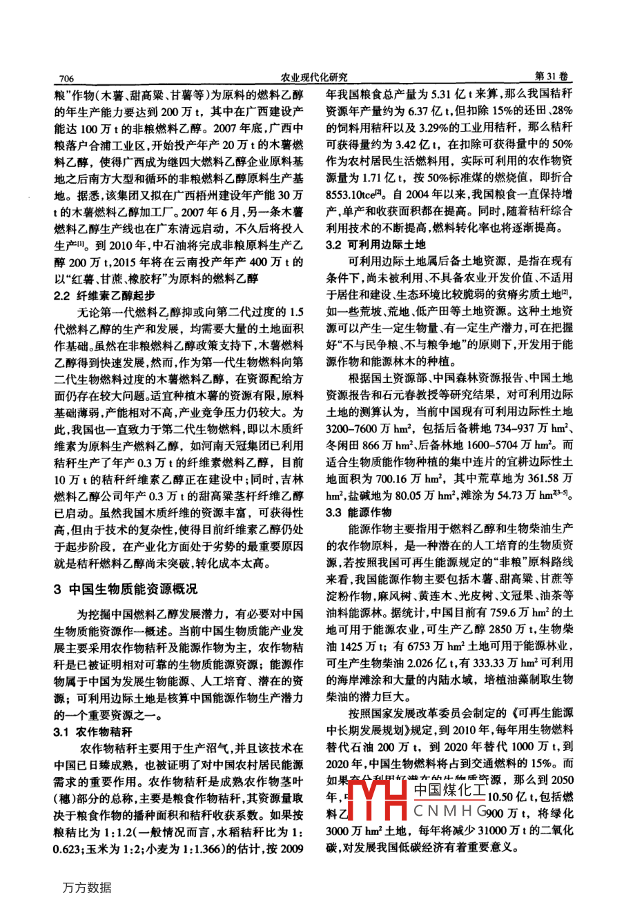 第31卷第6期農(nóng)業(yè)現(xiàn)代化研究Vol 31 No 6200年1月 RESEARCH OF AGRICULTURAL MODERNIZATIONNov.2010低碳經(jīng)濟下中國燃料乙醇的發(fā)展策略馮獻,詹玲,李寧輝(中國農(nóng)業(yè)科學(xué)院農(nóng)業(yè)經(jīng)濟與發(fā)展研究所,北京100081)摘要:工業(yè)化進程的加快已使得我國碳排放量逐漸增加,氣候問題嚴(yán)峻,對兩型杜會的建設(shè)造成了一定的威脅。展以燃料乙醇與石油混合替代化石燃料,對節(jié)能減排有著重要意義。本文通過分析能源供給緊張和碳排放量增加背景下,認(rèn)為當(dāng)前中國燃料乙醇發(fā)展已從第一代生物燃料向第二代生物燃料轉(zhuǎn)變,非糧燃料乙醇發(fā)展迅速。在此基礎(chǔ)上,針對中國生物質(zhì)能資源狀況,認(rèn)為發(fā)展燃料乙醇,應(yīng)貫徹落實科學(xué)發(fā)展觀,堅持因地制宜、循環(huán)農(nóng)業(yè)和技術(shù)進步的原則,著重從基地建設(shè)出發(fā),加快產(chǎn)業(yè)結(jié)構(gòu)升級轉(zhuǎn)型,發(fā)展多元化原料,從而提高產(chǎn)業(yè)經(jīng)濟效益和社會效益。關(guān)鍵詞:低磯經(jīng)濟;燃料乙醇;發(fā)展策略;非糧原料中圖分類號:S216文獻標(biāo)識碼:A文章編號:10000275(2010060704-04Development Strategy of Fuel Rthanol Under the Route of Low Carbon RconomyFENG Xian, ZHAN Ling, LI Ning-hui(nstitute of Agricultural Economics and Development, Chinese Academy of Agricultural Sciences, Beijing 100081, China)Abstract: The rapid development of industrialization has brought the increasingly growth of carbon emission in ChinaClimate change problems become more and more rigorous. It is import to develop fuel ethanol that to mix the gasoline toreplace fossil fuels in order to reduce the carbon emission and conserve energy. After analyzed the background of energyconflict and carbon emission, the author analyzed the biomass resources in China and proposed the guiding ideology andbasic principles in developing fuel ethanol The author proposed that in the future development of the fuel ethanol, scientificconcept of development should be implemented In the future development, we should insist on adjusting measures to localconditions, developing recycle agriculture and technological progress. At the end of this paper, the author proposedonsidered that in the future development, more policies should be focused on the resource base construction. Meanwhile,accelerating industry upgrading and expanding feedstock structure are important as well. Basing on the strategy, Chinesefuel ethanol industry will presented more economic and social benefitsKey words: low carbon economy; fuel ethanol; development strategy, non-grain raw material改革開放30年來,中國工業(yè)化進程不斷加快,發(fā)展建立了一個友好的平臺,促進了全球化經(jīng)濟形所取得的成績非常顯著。然而,在經(jīng)濟發(fā)展過程中,勢下中國經(jīng)濟的穩(wěn)定、健康和可持續(xù)發(fā)展。帶來了資源的耗竭、環(huán)境惡化等問題。據(jù)測算,1978中國的生物燃料乙醇起步于2002年,雖然發(fā)展年中國碳CO2)排放量為1380億t,2008年達到65.較晚但自《車用乙醇汽油“十五”發(fā)展專項規(guī)劃》提30億t,1978-2008年化石能源燃燒排放的CO2年出開始中國液態(tài)燃料乙醇得到快發(fā)展。到2008年均增長達到532%。據(jù)EIA預(yù)測,2006-2030年中國燃料乙醇年產(chǎn)量已達到15180萬t,躍居世界第三CO2排放年均增長28%??梢?化石燃料消費的增位,成為繼美國、巴西后的世界燃料乙醇主產(chǎn)國,隨加已使得環(huán)境氣候問題凸顯,對建設(shè)兩型社會造成著生物燃料技術(shù)的不斷提高,纖維素乙醇產(chǎn)業(yè)將得了重大威脅。為此,中國自2005年制定《可再生能源到較快發(fā)展。據(jù)麥肯錫2009年研究報告分析:到法》以來,一直致力于風(fēng)能水能生物質(zhì)能等可再生2020年,中國纖維素乙醇可替代3100萬t汽油,使能源的研究與開發(fā)。2010年4月22日,溫家寶總理得中國對外石油依存度下降10%,同時每年還能減在國家能源委員會第一次全體會議中提出:應(yīng)加快排9000萬t二氧化碳。能源結(jié)構(gòu)調(diào)整,大力培育新能源產(chǎn)業(yè),下大力氣落實2020年非化石能源消費比重提高到15%的目標(biāo)加1中國能源供求形勢嚴(yán)峻,亟需尋求替代性快農(nóng)村地區(qū)、邊遠地區(qū)、民族地區(qū)能源發(fā)展構(gòu)建低能源碳經(jīng)濟體系。這對減少碳排放量,推動節(jié)能和替代能中國能源消費主要由石油、天然氣煤炭構(gòu)成。源的發(fā)展,有著重要推動作用,為氣候問題及可持續(xù)2008中國煤化工12%為化石燃料?!?009年農(nóng)業(yè)部農(nóng)業(yè)資源與區(qū)劃課題“我國木薯產(chǎn)業(yè)發(fā)展研究”;2000年中央CNMHG項資金資助項目(編號作者簡介:馮獻(1986-),女,廣西桂平人,碩士研究生,主要研究方向為農(nóng)業(yè)政策;詹玲(1978-),女,福建平潭人,助理研究員,主要研究農(nóng)業(yè)多功能農(nóng)業(yè)政策休閑農(nóng)業(yè)、農(nóng)業(yè)生物質(zhì)能產(chǎn)業(yè)收稿日期:201009-02,修回日期:20009-18第馮獻等:低碳經(jīng)濟下中國燃料乙醇的發(fā)展策略隨著經(jīng)濟的發(fā)展能源的消費不斷增加但能源供求的缺口也逐年增加,其中2007年缺口達到最大2中國燃料乙醇發(fā)展現(xiàn)狀值,為3.02億t標(biāo)準(zhǔn)煤(圖1)。19902008年間,中由于石油、天然氣和煤炭等化石燃料的不可再國能源消費量增長了289倍年均增長55‰;中國生性,碳排放量高,可再生能源的