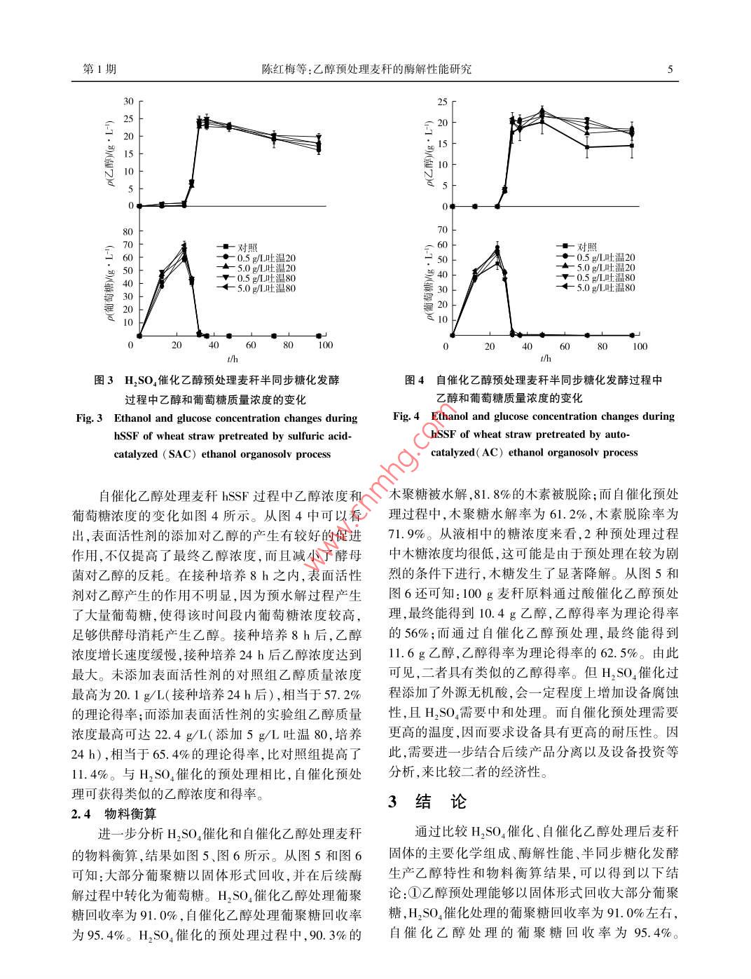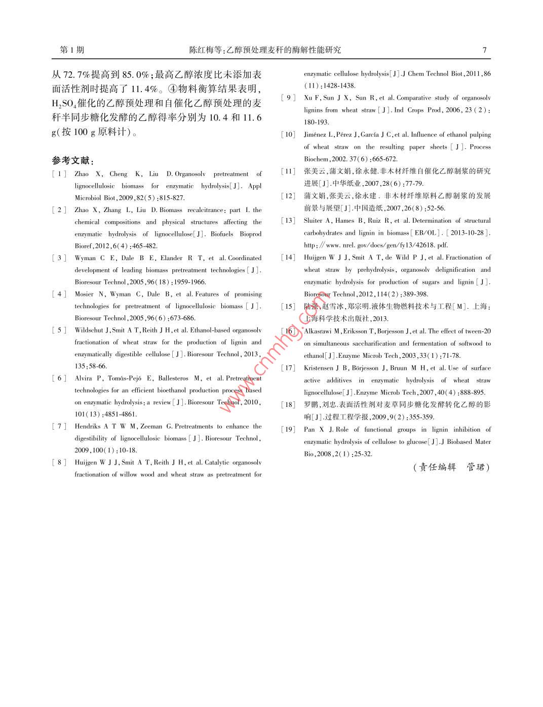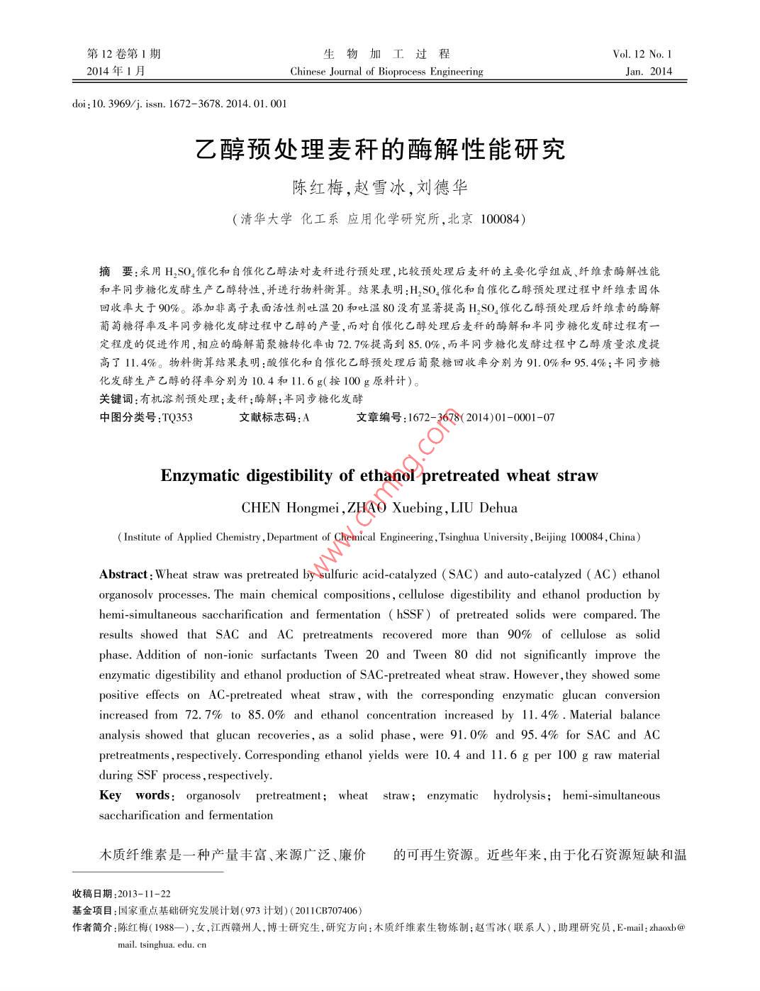 第12卷第1期生物加工過程Chinese Journal of Bioprocess EngineeringJan.2014doi:10.3969/j.isn.l672-3678.2014.01.001乙醇預(yù)處理麥稈的酶解性能研究陳紅梅,趙雪冰,劉德華(清華大學(xué)化工系應(yīng)用化學(xué)研究所,北京100084)摘要:采用H2SO催化和自催化乙醇法對麥稈進(jìn)行預(yù)處理,比較預(yù)處理后麥稈的主要化學(xué)組成、纖維素酶解性能和半同步糖化發(fā)酵生產(chǎn)乙醇特性,并進(jìn)行物料衡算。結(jié)果表明:HSO催化和自催化乙醇預(yù)處理過程中纖維素固體收率大于90%。添加非離子表面活性劑吐溫20和吐溫δ0沒有顯著提高HSO催化乙醇預(yù)處理后纖維素的酶解茼笥糖得率及半同步糖化發(fā)酵過程中♂醇的產(chǎn)量,而對自催化乙醇處理后麥稈的酶解和半冏步糖化發(fā)酵過程有定程度的促進(jìn)作用,相應(yīng)的酶解葡聚糖轉(zhuǎn)化率由72.7%提高到85.0%,而半冋步糖化發(fā)酵過程中乙醇質(zhì)量濃度提高了11.4%。物料衡算結(jié)果表明:酸催化和自催化乙醇預(yù)處理后萄聚糖回收率分別為9.0%和95.4%;半同步糖化發(fā)酵生產(chǎn)乙醇的得率分別為10.4和11.6g(按100g原料計(jì))關(guān)鍵詞:有機(jī)溶劑預(yù)處理;麥稈;酶解;半同步糖化發(fā)酵中圖分類號:TQ353文獻(xiàn)標(biāo)志碼:A文章編號:1672-3678(2014)01-0001-07Enzymatic digestibility of ethanol pretreated wheat strawCheN Hongmei. ZHAO Xuebing. LIU DehuaInstitute of Applied Chemistry, Department of Chemical Engineering, Tsinghua University, Beijing 100084, China)Abstract: Wheat straw was pretreated by sulfuric acid-catalyzed(SAC) and auto-catalyzed(AC) ethanolorganosolv processes. The main chemical compositions, cellulose digestibility and ethanol production byhemi-simultaneous saccharification and fermentation hSSF of pretreated solids were comparedthat SAC and AC pretreatments recovered more than 90% of cellulose as sophase. Addition of non-ionic surfactants Tween 20 and Tween 80 did not significantly improve theenzymatic digestibility and ethanol production of SAC-pretreated wheat straw. However, they showed somepositive effects on AC-pretreated wheat straw, with the corresponding enzymatic glucan conversionincreased from 72. 7%o to 85. 0%0 and ethanol concentration increased by 11. 4%0. Material balanceanalysis showed that glucan recoveries, as a solid phase, were 91.0% and 95. 4% for SAC and ACpretreatments, respectively. Corresponding ethanol yields were 10. 4 and 11.6 g per 100 g raw materialduring SSF process, respectively.Key words: organosolv pretreatment; wheat straw; enzymatic hydrolysis; hemi-simultaneoussaccharification and fermentation木質(zhì)纖維素是一種產(chǎn)量豐富、來源廣泛、廉價的可再生資源。近些年來,由于化石資源短缺和溫收稿日期:2013-11-22基金項(xiàng)目:國家重點(diǎn)基礎(chǔ)研究發(fā)展計(jì)劃(973計(jì)劃)(20CB707406)作者簡介:陳紅梅(1988—),女,江西贛州人,博士研究生,研究方向:木質(zhì)纖維素生物煉制;趙雪冰(聯(lián)系人),助理研究員,Eml: zhaoxu@生物加工過程第12卷室氣體排放量大幅增加,木質(zhì)纖維素轉(zhuǎn)化生產(chǎn)燃料等試劑均為市售分析純。高效液相色譜(HPLC)用和化學(xué)品受到世界各國的廣泛關(guān)注。但由于木標(biāo)準(zhǔn)品,包括葡萄糖、木糖、纖維二糖、阿拉伯糖、糠質(zhì)纖維素本身結(jié)構(gòu)復(fù)雜,特別是半纖維素和木質(zhì)素醛、甲酸、乙酸、乙醇等購自 Sigma- Aldrich上海分公限制了纖維素的酶催化水解性能。因此,木質(zhì)纖維司。纖維素酶為諾維信公司生產(chǎn)的 Ellice Ctec2。素原料往往需要經(jīng)過預(yù)處理以破壞其抗生物降解1.2主要儀器和設(shè)備屏障從而提高纖維素酶對纖維素的可及性2。木預(yù)處理反應(yīng)器為天舟海泰(北京)科技有限公質(zhì)纖維素生物轉(zhuǎn)化的預(yù)處理方法有多種,常用的包司的TFCF5-5型5L不銹鋼高壓反應(yīng)釜。液相色括稀酸預(yù)處理、蒸汽爆破(或超臨界CO爆破)、熱譜儀為日本島津公司的HPLC系統(tǒng),色譜柱為Bio-水預(yù)處理、氨纖維素爆破、氨水循環(huán)滲透和石灰預(yù)Rad公司的 Aminex hpx-87H(300mmx7.8mm)處理等3-。有機(jī)溶劑預(yù)處理是采用有機(jī)溶劑或其填充柱,檢測器為島津公司RD-10A差示折光檢水溶液在添加或不添加催化劑的條件下對木質(zhì)纖測器。流動相為5mmol/L稀H2SO4,流速為0.8維素原料進(jìn)行預(yù)處理的方法。在有機(jī)溶劑預(yù)處理mL/min,柱溫為65℃。紫外分光光度計(jì)為上海天過程中,由于木質(zhì)素和半纖維素的脫除,原料孔隙美科學(xué)儀器有限公司的UI-VS85系列紫外/可見率增加,從而提高了纖維素與纖維素酶的可接觸面分光光度計(jì)。積5。有機(jī)溶劑預(yù)處理一方面可以有效提高纖維1.3實(shí)驗(yàn)方法素的酶解性能,另一方面在預(yù)處理過程中可水解半1.3.1自催化乙醇處理纖維素、溶解木質(zhì)素,因而是一種分級預(yù)處理,有利自催化乙醇是在筆者所在實(shí)驗(yàn)室之前優(yōu)化后于實(shí)現(xiàn)原料的分級加工利用的條件下進(jìn)行的。150g麥稈置于高壓反應(yīng)釜中,加乙醇預(yù)處理是目前研究較多的有機(jī)溶劑預(yù)處人1500mL體積分?jǐn)?shù)65%的乙醇水溶液,在300理方法8。乙醇具有低毒、揮發(fā)性大、易回收利用r/min下進(jìn)行預(yù)處理。預(yù)處理溫度為220℃,保溫20的特點(diǎn)。目前,將乙醇作為溶劑處理木質(zhì)纖維素原min。反應(yīng)結(jié)束后冷卻到40℃以下,離心,收集液料研究較多的