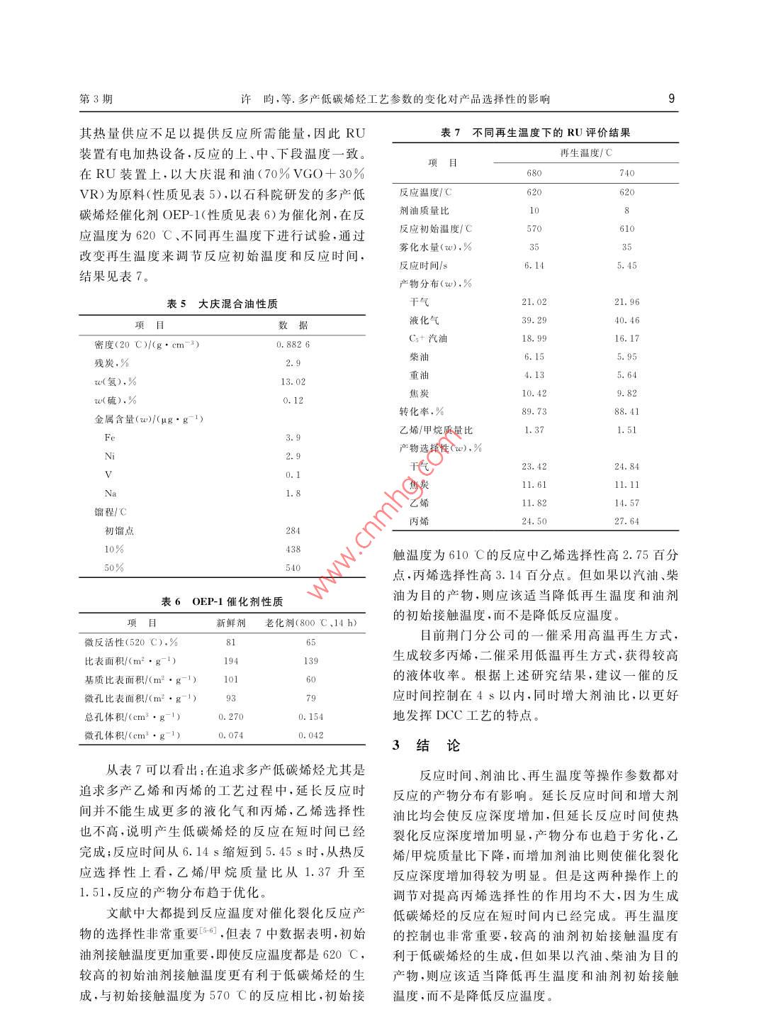 石油煉制與化工2014年3月基礎(chǔ)研究PETROLEUM PROCESSING AND PETROCHEMICALS第45卷第3期多產(chǎn)低碳烯烴工藝參數(shù)的變化對產(chǎn)品選擇性的影響許昀', 田輝平,劉宇鍵',朱亞東2(1.中國石化石油化工科學(xué)研究院,北京100083; 2.中國石化荊門分公司)摘要:針對中國石化荊門分公司現(xiàn)有兩套催化裂化裝置(- - 催和二催)的目的產(chǎn)品不同(一催多產(chǎn)低碳烯烴,二催保持較高的液體收率和汽油產(chǎn)率),希望通過調(diào)整工藝參數(shù)滿足要求。通過實(shí)驗(yàn)考察了反應(yīng)時(shí)間、劑油比和再生溫度對產(chǎn)物分布和選擇性的影響。結(jié)果表明:延長反應(yīng)時(shí)間,熱裂化反應(yīng)深度會顯著增加,干氣選擇性和氫氣產(chǎn)率明顯增加,熱裂化指數(shù)明顯上升;增加劑油比是保持丙烯收率、增加總液體收率的優(yōu)選方案;較高的初始油劑接觸溫度有利于低碳烯烴的生成,但如果以汽油、柴油為目的產(chǎn)物,則應(yīng)該適當(dāng)降低再生溫度和油劑的.初始接觸溫度,而不是降低反應(yīng)溫度。關(guān)鍵詞:低碳烯烴操作參數(shù)反應(yīng)時(shí)間劑油比再生溫度中國石化荊門分公司(簡稱荊門分公司)現(xiàn)有合油,催化劑為中國石化石油化工科學(xué)研究院(簡兩套催化裂化裝置。第一套催化裂化裝置(簡稱稱石科院)研發(fā)的多產(chǎn)低碳烯烴催化劑OEP-1.反-催)為DCC- II型,規(guī)模為0.8 Mt/a,由原1 Mt/a應(yīng)溫度為620C,考察高溫再生、小劑油比操作方蠟油催化裂化燒焦罐式高效再生裝置改造而來,案和低溫再生、大劑油比操作方案對產(chǎn)物分布和.主要特點(diǎn)為:①采用全提升管零床層反應(yīng)器,反應(yīng)選擇性的影響。溫度低于DCC-I型工藝,與常規(guī)FCC接近;②直2結(jié)果與討論立加長提升管,提升管停留時(shí)間為5s。第二套(簡稱二催)為重油催化裂化裝置,在原0.8 Mt/a重油2.1反應(yīng)時(shí)間的影響催化裂化裝置的基礎(chǔ)上改造而成,反應(yīng)時(shí)間為3s。在ACE裝置上.以荊門分公司一催DCC裝置兩套裝置反應(yīng)溫度均為530C,-.催采用高再生.原料油(性質(zhì)見表1)為原料,以一催平衡劑為催化溫度(700~710 C)、小劑油比(劑油質(zhì)量比為劑,在反應(yīng)溫度為525 C、劑油質(zhì)量比為7的條件6.5)操作方案,二催采用低再生溫度(660 ~下,通過改變空速來調(diào)節(jié)反應(yīng)時(shí)間,考察反應(yīng)時(shí)間670 C)、大劑油比(劑油質(zhì)量比為7)操作方案。對產(chǎn)物分布及選擇性的影響,結(jié)果見表2。從表2荊門分公司希望一.催多產(chǎn)低碳烯烴,二催保持高可以看出:在其它工藝條件和催化劑相同的情況液體收率和汽油產(chǎn)率,并且希望通過調(diào)整工藝操下,只改變空速(即反應(yīng)時(shí)間)時(shí),產(chǎn)物分布發(fā)生相作參數(shù)滿足上述要求。本課題在實(shí)驗(yàn)室考察了反應(yīng)變化;質(zhì)量空速從16 h-'降到5 h-'時(shí),反應(yīng)時(shí)應(yīng)時(shí)間、劑油比和再生溫度對產(chǎn)物選擇性的影響,.間相應(yīng)由1.6s 延長到5.0 s,轉(zhuǎn)化率從72. 1%增:以期為指導(dǎo)工業(yè)生產(chǎn)提供基礎(chǔ)數(shù)據(jù)。加到76.3%,增加了4.2百分點(diǎn),重油裂化能力增實(shí)驗(yàn)強(qiáng),隨著反應(yīng)時(shí)間的延長,反應(yīng)深度增加;但從產(chǎn)試驗(yàn)在ACE-MODEL R + Multi- Mode(簡稱物選擇性上看,隨反應(yīng)時(shí)間的延長,丙烯選擇性稍ACE)實(shí)驗(yàn)室小型評價(jià)裝置和小型提升管流化裂有增加,而熱裂化反應(yīng)深度增加得更為顯著,干氣化實(shí)驗(yàn)裝置(簡稱RU)上進(jìn)行。ACE試驗(yàn)原料油選擇性明顯增加,氫氣產(chǎn)率及選擇性亦增加近1倍,為荊門分公司一催DCC裝置原料油,催化劑為荊門收稿日期: 2013-07 10;修改稿收到日期: 2013-10-22。分公司- -催DCC裝置平衡劑,反應(yīng)溫度為525 C,主要考察劑油比和反應(yīng)時(shí)間對產(chǎn)物分布和選擇性作者簡介:許昀(1975- ).女,博士,高級工程師、從事催化裂化催化劑的研制與開發(fā)工作。的影響,劑油比分別為7和5,質(zhì)量空速分別為通訊聯(lián)系人:許昀,E mail:xuyun. ripp@ sinopec. com。4h-和16h-'。RU試驗(yàn)原料油為大慶VGO混基金項(xiàng)目:中國石油化工股份有限公司合同項(xiàng)目(106023)。第3期午昀,等.多產(chǎn)低碳烯烴工藝參數(shù)的變化對產(chǎn)品選擇性的影響7表1原料油性質(zhì)熱裂化指數(shù)(指產(chǎn)品中干氣與異構(gòu)C.烴的質(zhì)量項(xiàng)目數(shù)據(jù)比)明顯上升,總液體收率不但沒有增加,還稍有密度(20 C>)/(kg. m-3)920.3下降。由于DCC工藝專用催化劑含有擇形分子折射率(70 C)1. 4982篩,因此采用延長反應(yīng)時(shí)間來裂化汽油中的烯烴凝點(diǎn)/C2.四組分組成(w).%得到高丙烯收率的操作要非常慎重,需要選擇合飽和烴61.6適的反應(yīng)時(shí)間。芳烴26.0重油制低碳烯烴工藝的反應(yīng)溫度普遍高于膠質(zhì)11.4瀝青質(zhì)1.0普通FCC工藝,因此必須深入研究催化反應(yīng)和熱殘?zhí)?%3.14裂化反應(yīng)。石科院長期研究重油制低碳烯烴工黏度(80 C>)(mm2●s-1)18. 86藝04,認(rèn)為熱裂化反應(yīng)與催化裂化反應(yīng)一.樣,反相對分子質(zhì)量416w(堿性氮).%0.115應(yīng)過程復(fù)雜,且具有選擇性,并提出以產(chǎn)物中乙w0(碳),%86.48烯與甲烷的質(zhì)量比作為簡單的熱裂化選擇性衡w(氫),%12. 17量