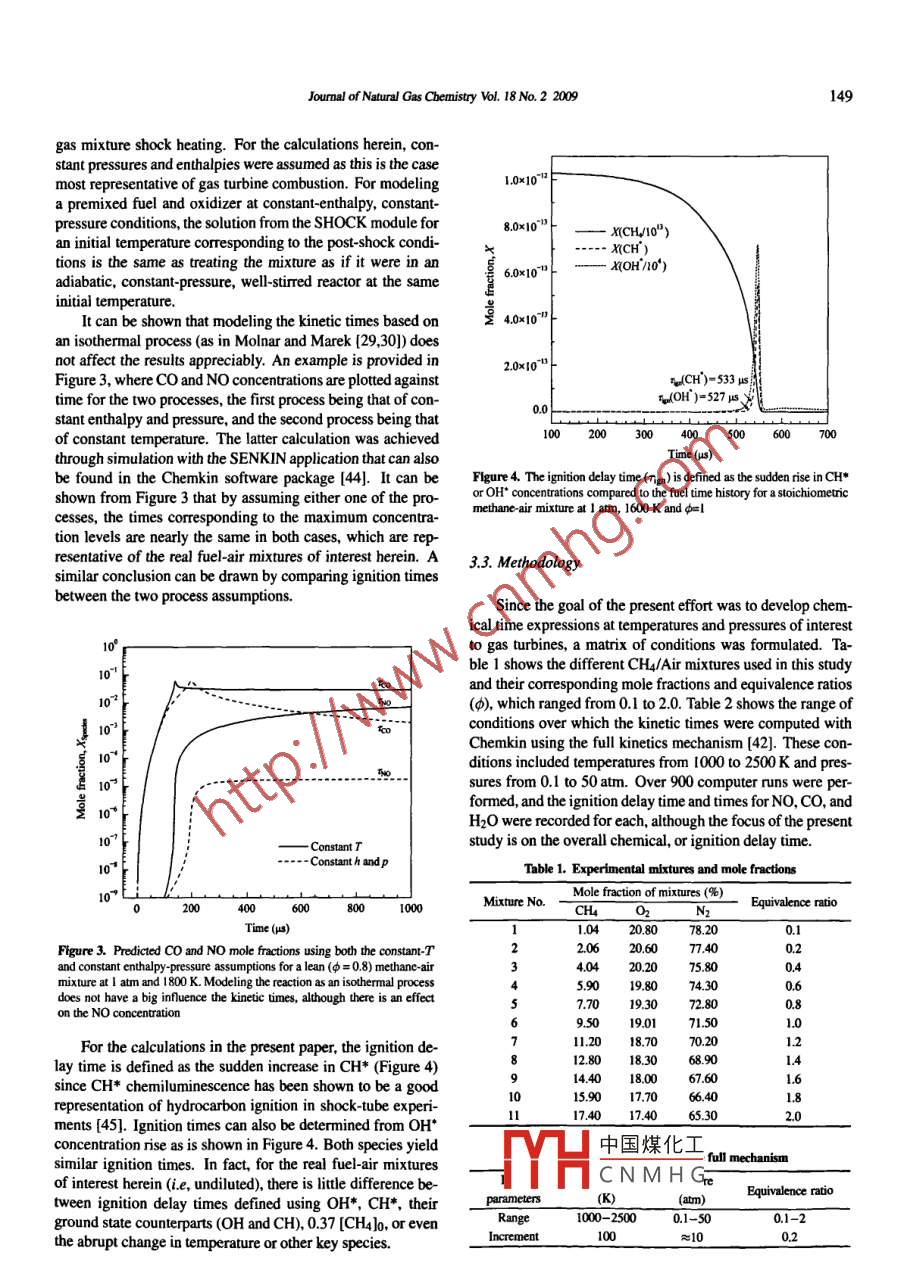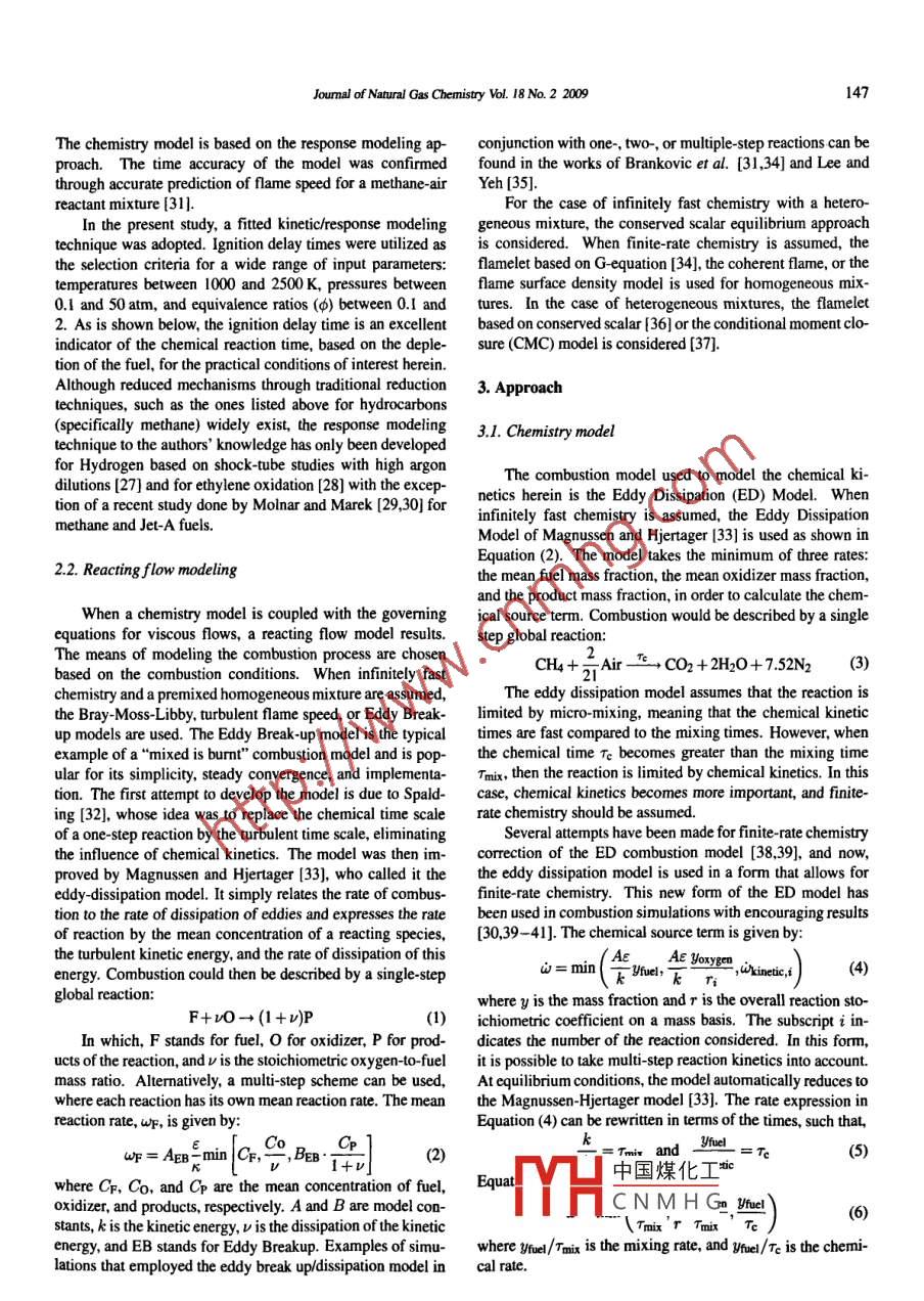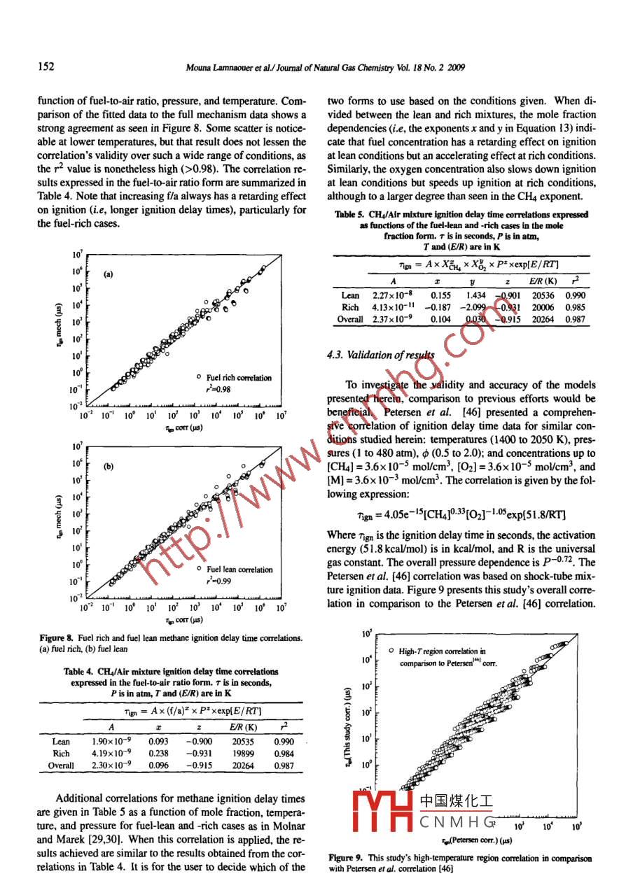 參Availableonlineatwww.sciencedirect.comScienceDirectINGC NATURAL GASCHEMISTRYELSEVIERJoumal of Natural Gas Chemistry 18(2009)145-155www.elsevicr.com/locate/jngcReduced combustion time model for methane in gas turbine flow fieldsMouna Lamnaouer!, Robert C. Ryder, Andreja Brankovic, Eric L. Petersen2*1. Graduate Research Assistant, Mechanical, Materials Aerospace Engineering University of Central Florida, Orlando, F4, 32816, USA;2. Associate Professor, Department of Mechanical Engineering, Texas A&M Universiry, College Station, TX, 77843, USA3. President, Engineering, Flow Parametrics, Ivoryton, CT, USA; 4. Vice President, Flow Parametrics, Ivoryton, CT, USReceived November 29, 2008; Revised January 5, 2009; Available online June 2, 2009]AbstractComputational fluid dynamics(CFD)modeling of the complex processes that occur within the bumer of a gas turbine engine has become acritical step in the design process. However, due to computer limitations, it is very difficult to completely couple the fluid mechanics solverwith the full combustion chemistry. Therefore, simplified chemistry models are required, and the topic of this research was to provide reducedchemistry models for CH,/O2 gas turbine flow fields to be integrated into CFD codes for the simulation of flow fields of natural gas-fueledburners. The reduction procedure for the CH,/O2 model utilized a response modeling technique wherein the full mechanism was solved overa range of temperatures, pressures, and mixture ratios to establish the response of a particular variable, namely the chemical reaction time. Theconditions covered were between 1000 and 2500 K for temperature, 0. I and 2 for equivalence ratio in air, and 0. I and 50 atm for pressure. Thekinetic time models in the form of ignition time correlations are given in Arrhenius-type formulas as functions of equivalence ratio, temperature,and pressure; or fuel-to-air ratio, temperature, and pressure. A single ignition time model was obtained for the entire range of conditions, andseparate models for the low-temperature and high-temperature regions as well as for fuel-lean and rich cases were also derived. Predictionsusing the reduced model were verified using results from the full mechanism and empirical correlations from experiments. The models areintended for( but not limited to)use in CFD codes for flow field simulations of gas turbine combustors in which initial conditions and degree ofmixedness of the fuel and air are key factors in achieving stable and robust combustion processes and acceptable emission levels. The chemicalme model was utilized successfully in CFD simulations of a generic gas turbine combustor with four different cases with various levels offuel-air premixingKey wordsCH4; ignition time correlations: reduced kinetic mode1. Introductionchemical kinetics models that require minimal computationaltime for combustion simulations has led to the developmentModeling the interaction between flow fields and chem- of reduced mechanismsical reactions is a complicated process due to the excessiveOne, two, and multi-step reduced mechanisms forcomputational resources required to couple the full chemistry methane oxidation were developed by Westbrook andwith a full-scale numerical flow solver. Combustion model- Dryer[1]. Similarly, Bilger developed a four-step reduceding using detailed chemistry is important to accurately pre- mechanism [2], as did Seshadri and Peters [3]. Five, six,dict certain combustion phenomena in a gas turbine design seven, and nine-step mechanisms were developed by Malphase. However, detailed chemistry contains many reactions lampalli et aL. [4]. Several other reduced mechanisms haveand species, and since the computational cost and time asso- been developed for methane [5, 6] as summarized by Smookeciated with a given reaction mechanism are directly affected [7]. The accuracy of these mechanisms has been investigatedby the number of species, the process becomes very compu- by Cao and Pope [8] and Volchkov et al. [9]. In general,tationally expensive. Hence, there is a demand for reliable the fewer-step mechanisms have been used more extensivelymodels that use less computational time yet still accurately in combustion modeling due to their simplicity. For instance,reproduce some of the important aspects of the combustion one-step methane combustion has been modeled with goodphenomena. This awareness of the importance of accurate resul中國煤化工Corresponding author. Tel: 979-845-1257: Fax: 979-845-3081: E-mail: petersen @eThe work was supported by a University Turbine Systems Research grant from theCNMHGdies, contract number 04-01Copyrighto2009, Dalian Institute of Chemical Physics, Chinese Academy of Sciences. All rights reserved.doi:0.1016s10039953(08600936Mouna Lamnaouer et al/ Joumal of Natural Gas Chemistry Vol. 18 No. 2 2009and Dryers, provide good agreement with experimental data tion method [22](CSP), and the intrinsic low-dimension manfor flame speed results [1], they fail to reproduce some of the ifold method [23, 24](ILDM). The skeletal mechanism canimportant aspects of combustion phenomena over the range of be reduced further based on the quasi steady state approxi-operating conditions for gas turbines. This lack of accuracy mation through what is called the systematical reduction ofis primarily due to the development of reduced mechanisms the detailed mechanism to a few global steps. This methodfrom experimental results and the many unrealistic assump- was initiated by Peters [20] and Peters and Williams[21]tions made to fit the data. In cases where the reduced mecha- The computational singular perturbation method [19](CSP)nisms are accurate. they either have too many species leading through which the selection of QSSA species can be autoto an increased computational time, or fail to predict results mated, and the intrinsic low-dimensional manifold approach,for a wider range of gas turbine operating conditionsas the ILDM technique pro
