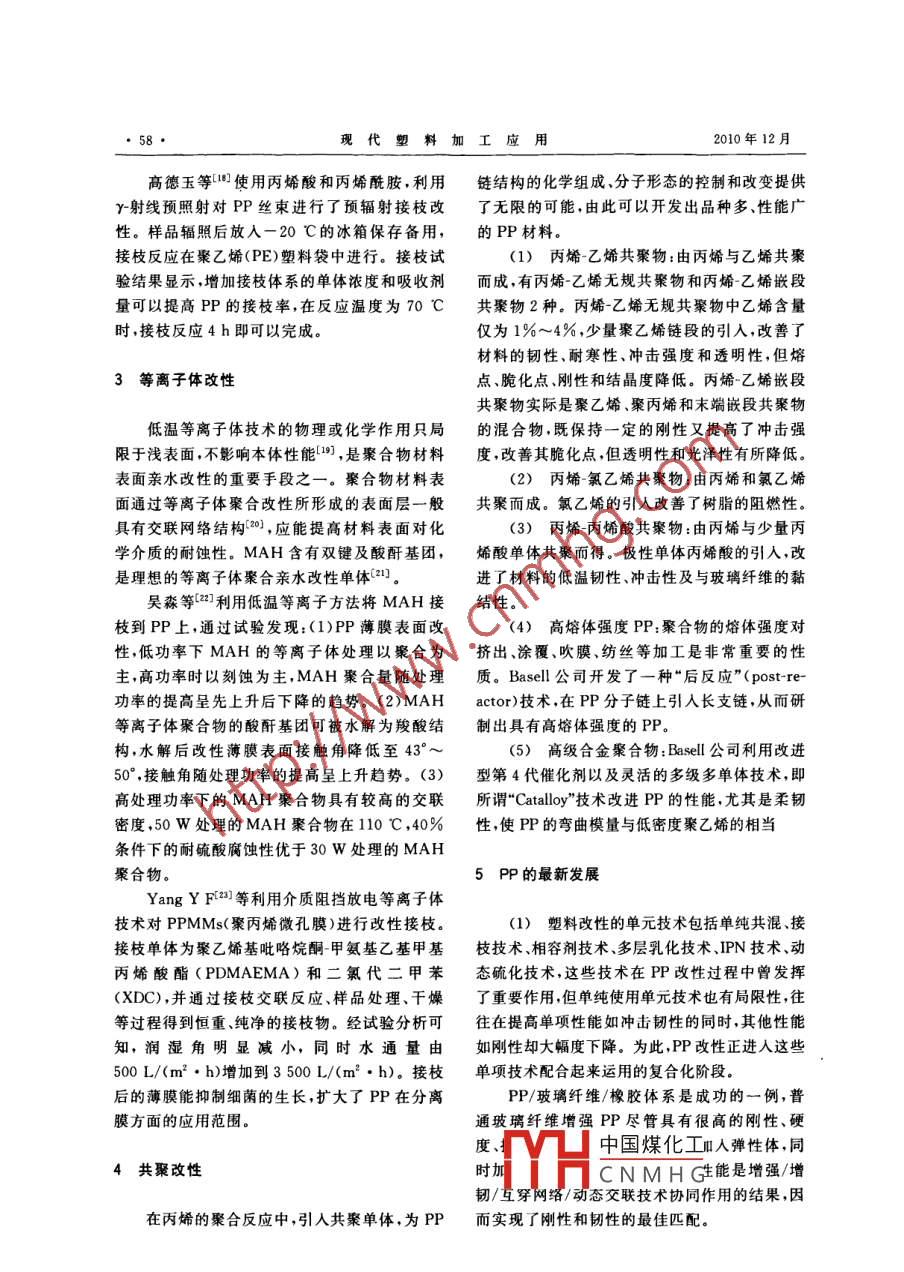果黑加限Qx3SNC年P(guān)置綜述聚丙烯化學(xué)改性方法王鑒王緒文李安蓮趙洪坤喬巖(東北石油大學(xué)化學(xué)化工學(xué)院,黑龍江大慶,163318)摘要:綜述了聚丙烯的化學(xué)改性方法,包括接枝、交聯(lián)、共聚等,接枝主要包括熔融接枝、溶液接枝、懸浮接枝、輜射接枝超臨界CO2協(xié)助接枝、固相接枝及非極性單體在PP上的接枝,交聯(lián)改性主要包括有機氧化物交聯(lián)、氮化物交聯(lián)、輻射交聯(lián)及等離子體交聯(lián),最后簡要介紹了共聚改性以及PP改性的最新進展關(guān)鍵詞:聚丙烯接枝交聯(lián)共聚改性技術(shù)發(fā)展趨勢The Way of Chemical Modification of PolypropyleneWang Jian Wang Xuwen Li Anlian Zhao Hongkun Qiao YanChemistry and Chemical Engineering College, Northeast PetroleumUniversity, Daqing, Heilongjiang, 163318)Abstract: The chemical modification of polypropylene was introduced, includinggrafting, crosslinking, copolymerization and so on. The melt grafting, solution graftingsuspention grafting, radiation grafting, solid state grafting with assistance of SC cO,andnon-polar monomer grafting onto PP were included in grafting copolymerization. The crosslinked organic oxides, nitrieds, radiation and plasma were included in crosslinking modifica-tion. In the end, the copolymerization and the latest develoling on modification of pP arebriefly descriptedKey words: polypropylene; graft; crosslink; copolymerization; modifying technologyne trend of development化學(xué)改性的方法主要有接枝、共聚、交聯(lián)和烯酸及其酯類可用于該法。由于該法直接在等離子體改性處理等,其原理是通過化學(xué)反應(yīng)在加工設(shè)備上接枝PP不需溶劑,工序簡單,可以聚丙烯(PP)分子鏈上引λ其他鏈節(jié)和功能基大批量連續(xù)生產(chǎn)。MAH接枝PP是熔融法研究團由此可以提高材料的力學(xué)耐侯、抗老化和黏最多的體系2結(jié)性能等。S. Al-Malaika及E. Eddiyanto3研究了利用熔融法接枝甲基丙烯酸縮水甘油酯(GMA),1接枝改性同時對比考查了加入共單體的方法來提高GMA的接枝率。試驗顯示加入少量的二乙烯1.1熔融接枝基苯(DVB)和三羥甲基丙烷三丙烯酸酯(TRIS)該法是目前廣泛使用的接枝方法,它是在PP熔融狀態(tài)下加入單體與引發(fā)劑,從而發(fā)生接中國煤化工,2010020枝反應(yīng)。一般是在單、雙螺桿擠出機等加工設(shè)備NMHG±生導(dǎo)師,研究方向上進行的。由于加工溫度一般要在180℃以上,edu故要求單體的沸點要高,馬來酸酐(MAH)、丙基金項目:黑龍江省教育廳面上項目資助(編號11551010)現(xiàn)代塑料加工應(yīng)用2010年12月有利于GMA的接枝反應(yīng)。加入少量的過氧化MAH是可行的,接枝產(chǎn)物顆粒呈淡紅色,質(zhì)感物引發(fā)劑會發(fā)生單體自聚、GMA接枝反應(yīng)以及好,無異味。而且,這種方法成本低、廢液易處交聯(lián)反應(yīng);加入DVB更會促進GMA的接枝反理。根據(jù)試驗結(jié)果得知,在MAH濃度為0.4應(yīng)。同時共單體加入能夠減輕接枝反應(yīng)過程的mol/L、APS濃度為0.020mol/L、反應(yīng)溫度85降解,并且GMA共聚幾乎不會發(fā)生?!?、反應(yīng)時間90min時,產(chǎn)物可達到1.1%的接J.M. Garcia-Martinez等利用熔融法改性枝率。通過MAH的循環(huán)利用,MAH的利用率無規(guī)PP,接枝單體為琥珀酸酐(SA)、pPBM(p可以提高3倍多phenylen-bis-maleamic acid)??赏ㄟ^一步法將SA1.4輻射接枝改性和pPBM接枝到無規(guī)PP的骨架上,還可以通過射接枝改性是用高能射線照射PP產(chǎn)生兩步法將琥珀酸熒光粉接枝到無規(guī)PP上。反應(yīng)自由基,再與單體形成接枝共聚物。輻射接枝反溫度保持140℃不變,極性單體質(zhì)量分數(shù)0.5%~應(yīng)無需添加劑,可保持聚合物材料本身的純凈17.5%以不同的攪拌速率進行混合。接枝改性性;接枝反應(yīng)可改變聚合物材料表面結(jié)構(gòu),而保后PP的玻璃化溫度從剛開始的-2.4℃提高到持基體材料的原有性能不變;輻射接枝反應(yīng)可在0℃,從而擴展了PP的使用領(lǐng)域較低溫度、在較黏稠的介質(zhì)中等寬松條件下進1.2溶液接枝法行;可在較厚的聚合物中均勻進行,也可將輻射溶液接枝法,就是在接枝過程中首先將PP接枝反應(yīng)限制在表面層或特定厚度內(nèi)進行。溶解在適當(dāng)?shù)挠袡C溶劑中(通常為甲苯或二甲Feng Yuan等利用Co照射的方法將丙苯),然后再進行接枝。該反應(yīng)過程溫度相對較烯酸丁酯(BA)接枝到PP基質(zhì)上。首先將BA低(110~140℃),PP降解程度輕,副產(chǎn)物少,接和交聯(lián)劑DVB溶解到去離子水中混合溶液倒枝單體的接枝率和利用率相對較高。但使用大玻璃管中,將一定量的PP纖維浸入溶液中量有毒溶劑往往造成環(huán)境污染且反應(yīng)時間長混合溶液用氮氣鼓泡5~7min,之后輻照30h,(1~3h),生產(chǎn)成本高,因而在工業(yè)上很少采用。總的輻射量為30kGy,之后取出用乙醇清洗Mehrdad Yazdani-Pedram等利用2,5-二24h,干燥稱重。結(jié)果發(fā)現(xiàn)當(dāng)DⅤB質(zhì)量分數(shù)為甲基2,5-雙(叔丁過氧基)己烷(L101)做引發(fā)2%、BA質(zhì)量分數(shù)為10%時,最高接枝率為劑、二甲基衣康酸(DMA)為接枝單體在沸的二20.53%對接枝后的PP進行吸油性研究,發(fā)現(xiàn)甲苯和十氫萘中進行接枝反應(yīng),考察了反應(yīng)時 PP-g-BA對甲苯的吸附量為19.74g/g,對煤油間、溫度、引發(fā)劑用量、單體濃度對接枝率的影的吸附量為18.8g/g。可見,該材料可為油田響。發(fā)現(xiàn)在最佳的反應(y