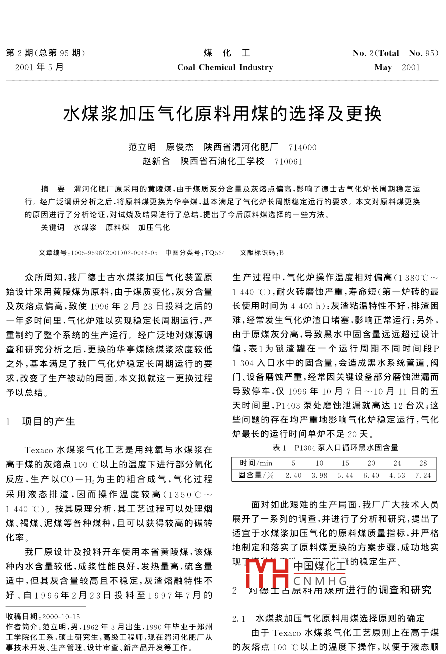 水煤漿加壓氣化原料用煤的選擇及更換