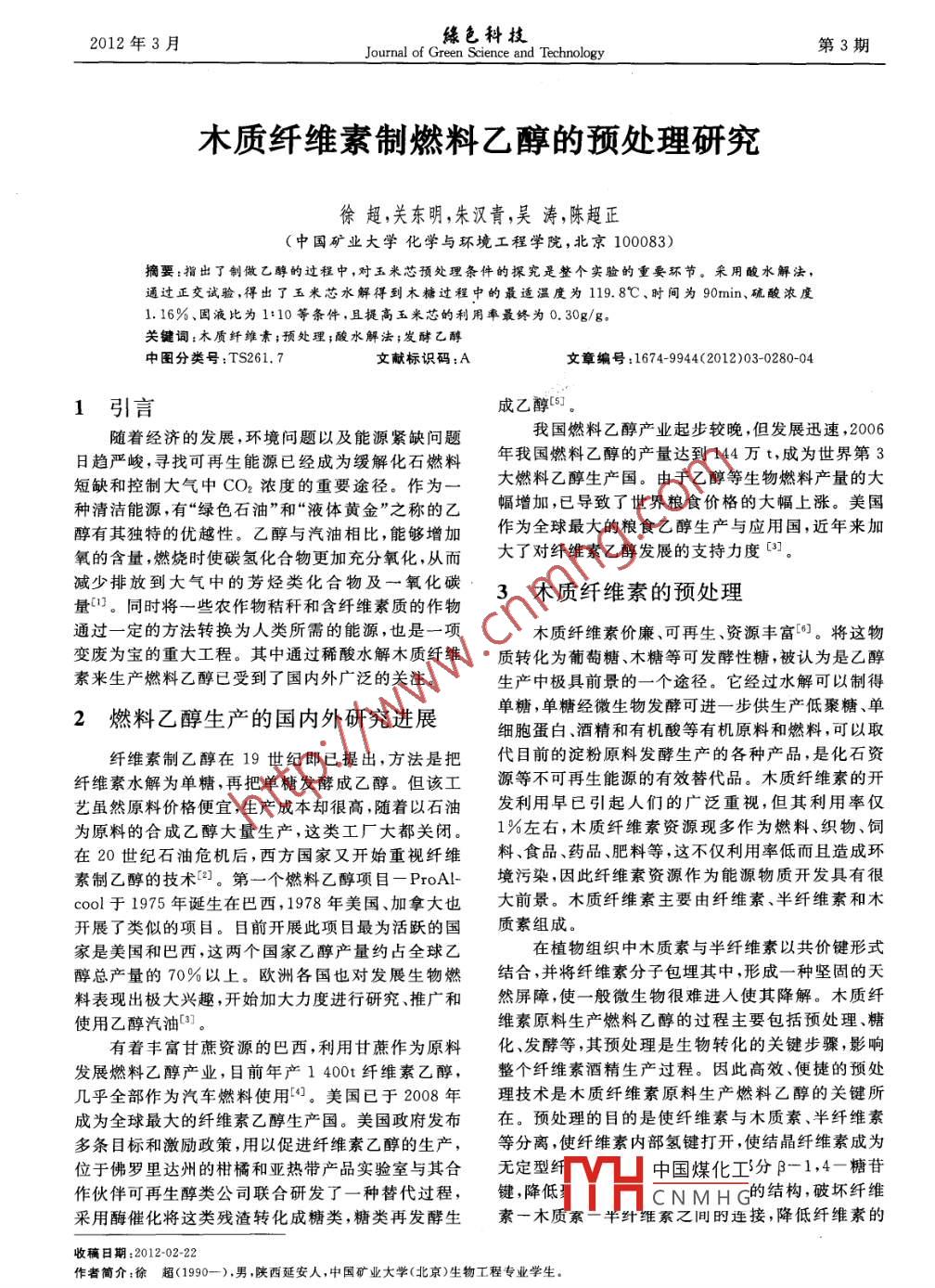 2012年3月臻色科技Journal of Green Science and Technology第3期木質(zhì)纖維素制燃料乙醇的預(yù)處理研究徐超,關(guān)東明,朱漢青,吳濤,陳超正(中國(guó)礦業(yè)大學(xué)化學(xué)與環(huán)境工程學(xué)院,北京100083)摘要:指出了劊做乙醇的過(guò)程中,對(duì)玉米芯預(yù)處理?xiàng)l件的探究是整個(gè)實(shí)驗(yàn)的重要環(huán)節(jié)。采用酸水解法,通過(guò)正交試驗(yàn),得出了玉米芯水解得到木糖過(guò)程中的最適溫度為119.8℃、時(shí)間為90min、硫酸濃度1.16%、固液比為1:10等條件,且提高玉米芯的利用奉最終為0.30g/g關(guān)鍵詞:木質(zhì)纖維素;預(yù)處理;酸水解法;發(fā)酵乙中圖分類號(hào):TS261.7文獻(xiàn)標(biāo)識(shí)碼:A文章編號(hào):1674-9944(2012)03-0280-041引言成乙醇5。隨著經(jīng)濟(jì)的發(fā)展,環(huán)境問題以及能源緊缺問題我國(guó)燃料乙醇產(chǎn)業(yè)起步較晚,但發(fā)展迅速,2006日趨嚴(yán)峻,尋找可再生能源已經(jīng)成為緩解化石燃料年我國(guó)燃料乙醇的產(chǎn)量達(dá)到144萬(wàn)t,成為世界第3短缺和控制大氣中CO2濃度的重要途徑。作為大燃料乙醇生產(chǎn)國(guó)。由于乙醇等生物燃料產(chǎn)量的大種清潔能源,有“綠色石油”和“液體黃金”之稱的乙幅增加,已導(dǎo)致了世界糧食價(jià)格的大幅上漲。美國(guó)醇有其獨(dú)特的優(yōu)越性。乙醇與汽油相比,能夠增加作為全球最大的糧食乙醇生產(chǎn)與應(yīng)用國(guó),近年來(lái)加氧的含量燃燒時(shí)使碳?xì)浠衔锔映浞盅趸?從而大了對(duì)纖維素乙醇發(fā)展的支持力度。減少排放到大氣中的芳烴類化合物及一氧化碳量.同時(shí)將一些農(nóng)作物秸稈和含纖維素質(zhì)的作物3木質(zhì)纖維素的預(yù)處理通過(guò)一定的方法轉(zhuǎn)換為人類所需的能源,也是一項(xiàng)木質(zhì)纖維素價(jià)廉、可再生資源豐富。將這物變廢為寶的重大工程。其中通過(guò)稀酸水解木質(zhì)纖維質(zhì)轉(zhuǎn)化為葡萄糖、木糖等可發(fā)酵性糖,被認(rèn)為是乙醇素來(lái)生產(chǎn)燃料乙醇已受到了國(guó)內(nèi)外廣泛的關(guān)注。生產(chǎn)中極具前景的一個(gè)途徑。它經(jīng)過(guò)水解可以制得2燃料乙醇生產(chǎn)的國(guó)內(nèi)外研究進(jìn)展單糖,單糖經(jīng)微生物發(fā)酵可進(jìn)一步供生產(chǎn)低聚糖、細(xì)胞蛋白、酒精和有機(jī)酸等有機(jī)原料和燃料,可以取纖維素制乙醇在19世紀(jì)即已提出,方法是把代目前的淀粉原料發(fā)酵生產(chǎn)的各種產(chǎn)品,是化石資纖維素水解為單糖,再把單糖發(fā)酵成乙醇。但該工源等不可再生能源的有效替代品。木質(zhì)纖維素的開藝雖然原料價(jià)格便宜,生產(chǎn)成本卻很高,隨著以石油發(fā)利用早已引起人們的廣泛重視,但其利用率僅為原料的合成乙醇大量生產(chǎn),這類工廠大都關(guān)閉。1%左右,木質(zhì)纖維素資源現(xiàn)多作為燃料、織物、飼在20世紀(jì)石油危機(jī)后,西方國(guó)家又開始重視纖維料、食品、藥品、肥料等,這不僅利用率低而且造成環(huán)素制乙醇的技術(shù)。第一個(gè)燃料乙醇項(xiàng)目一ProA-境污染,因此纖維素資源作為能源物質(zhì)開發(fā)具有很cool于1975年誕生在巴西,1978年美國(guó)、加拿大也大前景。木質(zhì)纖維素主要由纖維素、半纖維素和木開展了類似的項(xiàng)目。目前開展此項(xiàng)目最為活躍的國(guó)質(zhì)素組成。家是美國(guó)和巴西,這兩個(gè)國(guó)家乙醇產(chǎn)量約占全球乙在植物組織中木質(zhì)素與半纖維素以共價(jià)鍵形式醇總產(chǎn)量的70%以上。歐洲各國(guó)也對(duì)發(fā)展生物燃結(jié)合,并將纖維素分子包埋其中,形成一種堅(jiān)固的天料表現(xiàn)出極大興趣,開始加大力度進(jìn)行研究、推廣和然屏障,使一般徵生物很難進(jìn)入使其降解。木質(zhì)纖使用乙醇汽油維素原料生產(chǎn)燃料乙醇的過(guò)程主要包括預(yù)處理、糖有著豐富甘蔗資源的巴西,利用甘蔗作為原料化、發(fā)酵等,其預(yù)處理是生物轉(zhuǎn)化的關(guān)鍵步驟,影響發(fā)展燃料乙醇產(chǎn)業(yè),目前年產(chǎn)1400t纖維素乙醇,整個(gè)纖維素酒精生產(chǎn)過(guò)程。因此高效、便捷的預(yù)處幾乎全部作為汽車燃料使用。美國(guó)已于2008年理技術(shù)是木質(zhì)纖維素原料生產(chǎn)燃料乙醇的關(guān)鍵所成為全球最大的纖維素乙醇生產(chǎn)國(guó)。美國(guó)政府發(fā)布在。預(yù)處理的目的是使纖維素與木質(zhì)素、半纖維素多條目標(biāo)和激勵(lì)政策,用以促進(jìn)纖維素乙醇的生產(chǎn),等分離,使纖維素內(nèi)部氫鍵打開,使結(jié)晶纖維素成為位于佛羅里達(dá)州的柑橘和亞熱帶產(chǎn)品實(shí)驗(yàn)室與其合無(wú)定型中國(guó)煤化工分-1,4一糖苷作伙伴可再生醇類公司聯(lián)合研發(fā)了一種替代過(guò)程,鍵,降低CNMHG的結(jié)構(gòu)破壞纖維采用酶催化將這類殘?jiān)D(zhuǎn)化成糖類糖類再發(fā)酵生素一木質(zhì)冢半維系乙間時(shí)連接,降低纖維素的收稿日期:222作者簡(jiǎn)介:徐超(199-),男,陜西延安人,中國(guó)礦業(yè)大學(xué)(北京)生物工程專業(yè)學(xué)生數(shù)據(jù)徐超等:木質(zhì)纖維素制燃料乙醇的預(yù)處理研究工程技術(shù)結(jié)晶度以及提高基質(zhì)的孔隙率常用的預(yù)處理方法