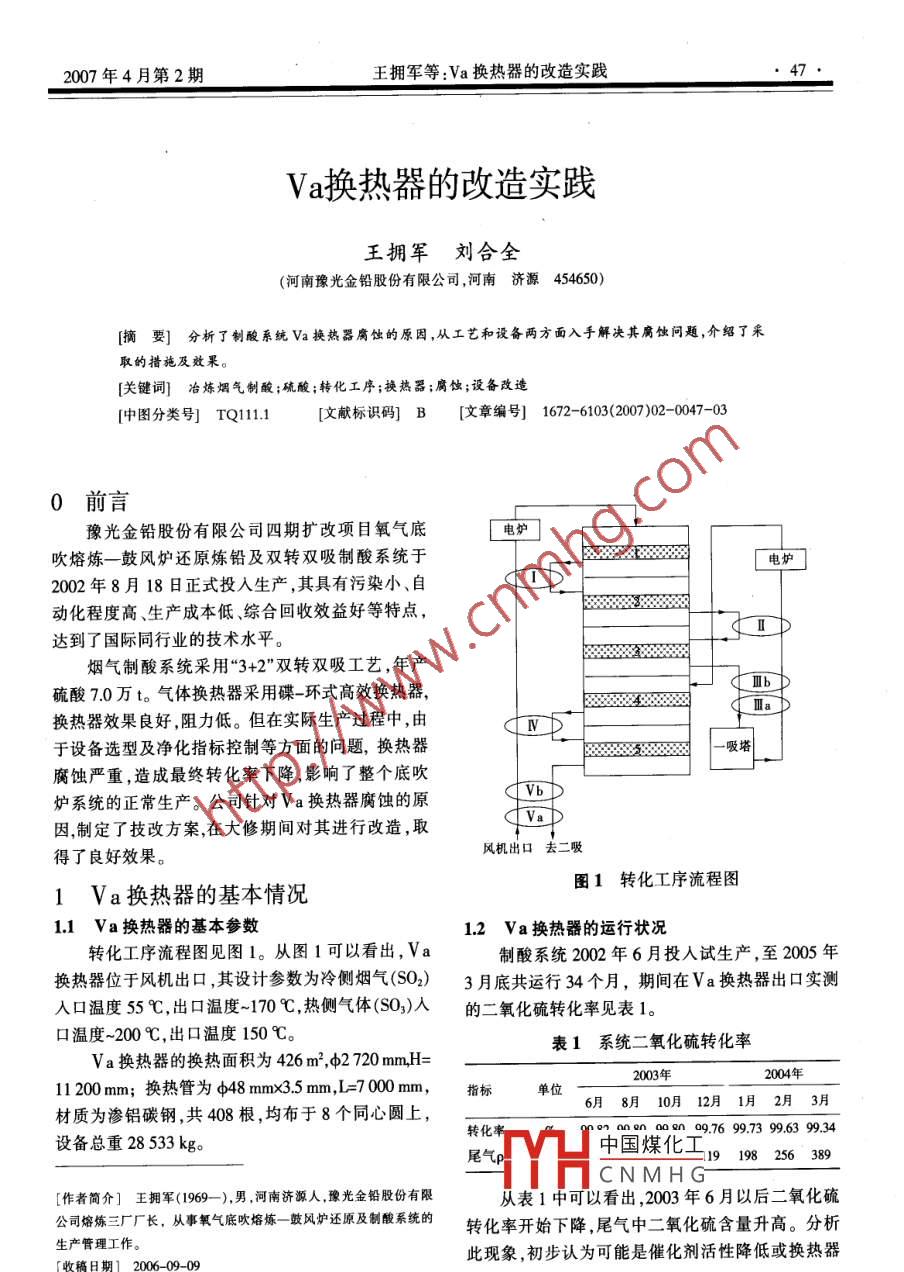 2007年4月第2期王擁軍等:Va換熱器的改造實(shí)踐47Va換熱器的改造實(shí)踐王擁軍劉合全(河南豫光金鉛股份有限公司,河南濟(jì)源454650)摘要]分析了制酸系統(tǒng)Va換熱器腐蝕的原因,從工藝和設(shè)備兩方面入手解決其腐蝕問題,介紹了采取的措施及效果。關(guān)鍵詞]冶煉煙氣制酸;硫酸;轉(zhuǎn)化工序;換熱器;腐蝕;設(shè)備改造中圖分類號]TQ111文獻(xiàn)標(biāo)識碼]B[文章編號]1672-6103(2007)02-0047-030前言豫光金鉛股份有限公司四期擴(kuò)改項(xiàng)目氧氣底電爐吹熔煉—鼓風(fēng)爐還原煉鉛及雙轉(zhuǎn)雙吸制酸系統(tǒng)于2002年8月18日正式投入生產(chǎn),其具有污染小、自動(dòng)化程度高、生產(chǎn)成本低、綜合回收效益好等特點(diǎn)839達(dá)到了國際同行業(yè)的技術(shù)水平。煙氣制酸系統(tǒng)采用“3+2”雙轉(zhuǎn)雙吸工藝,年產(chǎn)硫酸70萬t。氣體換熱器采用碟-環(huán)式高效換熱器,換熱器效果良好,阻力低。但在實(shí)際生產(chǎn)過程中,由于設(shè)備選型及凈化指標(biāo)控制等方面的問題,換熱器88588833腐蝕嚴(yán)重,造成最終轉(zhuǎn)化率下降,影響了整個(gè)底吹爐系統(tǒng)的正常生產(chǎn)。公司針對Va換熱器腐蝕的原因,制定了技改方案,在大修期間對其進(jìn)行改造,取得了良好效果。風(fēng)機(jī)出口去二吸1Va換熱器的基本情況圖1轉(zhuǎn)化工序流程圖11Va換熱器的基本參數(shù)12Va換熱器的運(yùn)行狀況轉(zhuǎn)化工序流程圖見圖1。從圖1可以看出,Ⅴ制酸系統(tǒng)2002年6月投入試生產(chǎn),至2005年換熱器位于風(fēng)機(jī)出口,其設(shè)計(jì)參數(shù)為冷側(cè)煙氣(SO2)3月底共運(yùn)行34個(gè)月,期間在Ⅴa換熱器出口實(shí)測入口溫度55℃,出口溫度-170℃,熱側(cè)氣體(SO)的二氧化硫轉(zhuǎn)化率見表1口溫度~200℃,出口溫度150℃。表1系統(tǒng)二氧化硫轉(zhuǎn)化率Va換熱器的換熱面積為426m2,d2720mmH=2003年11200mm;換熱管為d48mm×3.5mm,L=7000mm,指標(biāo)單位6月8月10月12月1月2月3月材質(zhì)為滲鋁碳鋼,共408根,均布于8個(gè)同心圓上,設(shè)備總重28533kg轉(zhuǎn)化率0 0nn0976997399639934尾氣中國煤化工CNMHG作者簡介]王擁軍(1969—),男,河南濟(jì)源人,豫光金鉛股份有限從表1中可以看出,2003年6月以后二氧化硫公司熔煉三廠廠長,從事氧氣底吹熔煉一鼓風(fēng)爐還原及制酸系統(tǒng)的轉(zhuǎn)化率開始下降,尾氣中二氧化硫含量升高。分析生產(chǎn)管理工作。[收稿日期]200609-09此現(xiàn)象,初步認(rèn)為可能是催化劑活性降低或換熱器中國有色泊食□設(shè)備及自動(dòng)化列管漏氣,但是在依次對轉(zhuǎn)化各段及Va換熱器進(jìn)出口二氧化硫轉(zhuǎn)化率測試后發(fā)現(xiàn),在Va換熱器出表2凈化工序出口煙氣實(shí)測值g/m3口處所檢測的二氧化硫轉(zhuǎn)化率比其進(jìn)口處低,確認(rèn)2003年004年Va換熱器列管發(fā)生了泄漏。9月工藝要求va換熱器是雙轉(zhuǎn)雙吸裝置中一次轉(zhuǎn)化的入口含塵003600304104300502和二次轉(zhuǎn)化的出口,列管泄漏使部分二氧化硫未經(jīng)水份005轉(zhuǎn)化直接從尾氣中排出,造成二氧化硫排放濃度偏酸霧0.0200002001001876001953002104<0005高,不僅對環(huán)境造成一定程度的污染,還減少了硫酸產(chǎn)量,直接影響企業(yè)的經(jīng)濟(jì)效益。份均超過了工藝要求值。酸泥和酸沫被夾帶至Ⅴa13Va換熱器的腐蝕情況換熱器沉積在下管板上,長期運(yùn)行引起滲鋁管腐蝕。2004年3月,對Va換熱器進(jìn)行檢查,發(fā)現(xiàn)下管原設(shè)計(jì)中雖然估計(jì)到Va換熱器的腐蝕危險(xiǎn)但在材板沉積了50~80mm厚的酸泥,上部疏松,底部堅(jiān)硬,料選擇上沒有給予足夠的重視因此造成了設(shè)備腐蝕滲鋁管有16根腐蝕滲漏,滲漏點(diǎn)均分布在距下管板約50mm范圍內(nèi)。至2004年10月10日,已有49根3Va換熱器的改造實(shí)踐列管漏氣(其分布見圖2),2005年3月底大修檢查31改造措施時(shí)發(fā)現(xiàn)有150根列管腐蝕漏氣,其它列管有不同程公司從優(yōu)化凈化指標(biāo)和改造va換熱器兩個(gè)方度的腐蝕。面入手,解決Va換熱器腐蝕問題。311優(yōu)化凈化指標(biāo)(1)增加一臺無填料冷卻塔,降低出填料塔凈化煙氣的溫度。工藝要求填料塔出口氣溫不超過38℃,正常情況下應(yīng)在35℃左右,而實(shí)際的煙氣溫度均超過38℃,最高達(dá)42℃,全年平均39℃。降低煙氣溫度有兩種辦法:一是加大板式換熱器的換熱入孔面積提高換熱能力;二是增加循環(huán)水量。經(jīng)過分析比較,最終增加了一臺400m/h無填料冷卻塔,以降低出填料塔凈化煙氣的溫度(2)清洗管式分酸器分酸孔,增加小瓷球環(huán)厚度,減少酸沫飛濺。1-第一層腐蝕26根;2-第二層腐蝕12根;3-第三層腐蝕9(3)增加一臺絲網(wǎng)除沫塔,捕獲酸泥和酸沫。根;4-第四層腐蝕22根·為檢查發(fā)現(xiàn)的腐蝕列管為了減少進(jìn)入轉(zhuǎn)化工序煙氣中塵與酸沫的夾帶量,圖2Va換熱器腐蝕列管分布圖借鑒干吸塔頂部抽屜式絲網(wǎng)除沫器原理,在SO2風(fēng)為了確保尾氣達(dá)標(biāo)排放,采取了臨時(shí)措施,即機(jī)出處增加一臺絲網(wǎng)除沫塔,進(jìn)一步捕獲酸泥和用錐形金屬塞子將漏氣列管兩端封堵維持轉(zhuǎn)化率酸沫。為了不影響整個(gè)系統(tǒng)的氣流參數(shù),同時(shí)提高酸不低于99.7%,但隨著列管封堵數(shù)量的增多,氣體通沫捕獲率,將絲網(wǎng)除