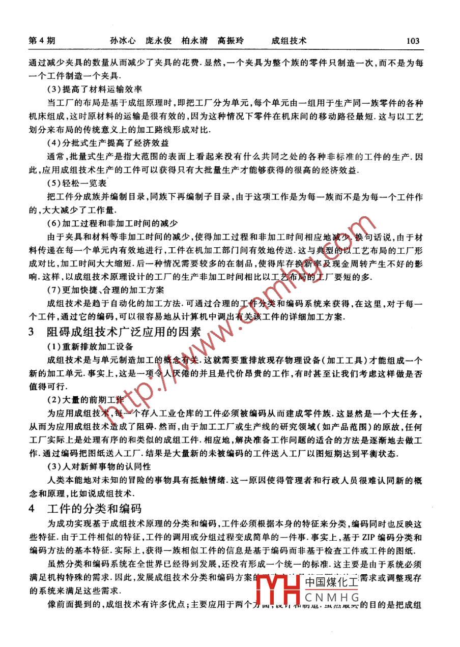 第22卷第4期河北建筑工程學(xué)院學(xué)報(bào)Vol.22No.4.2004年12月JOURNA OF HEBEI INSTITUTE OF ARCHITECTURAL ENCINEERINCDecember 2004成組技術(shù)孫冰心'龐永俊'柏永清'高 振玲21河北建筑工程學(xué)院;2華北航天工業(yè)學(xué)院摘要通過(guò)對(duì)成組技術(shù)概念的介紹,使大家了解到基于成組技術(shù)得到的工件加工工藝方法相比過(guò)去傳統(tǒng)的加工工藝方法具有無(wú)法比擬的優(yōu)越性.從而為成組技術(shù)的推廣創(chuàng)造了條件.關(guān)鍵詞機(jī)械加工;工 藝路線(xiàn);新思路;成組技術(shù);對(duì)比.中圖號(hào)TP20引言成組技術(shù)是制造業(yè)的一個(gè)新技術(shù),它涉及到具有相似或相關(guān)屬性零件的標(biāo)識(shí)和分組,應(yīng)用成組技術(shù)可使產(chǎn)品的設(shè)計(jì)和制造變的更容易更經(jīng)濟(jì).這種新的生產(chǎn)技術(shù)在1920年形成于美國(guó),一個(gè)叫FrederickTaylor的人提出了這種需要特殊操作的分組零件的想法.他的這-觀(guān)點(diǎn)在20世紀(jì)早期就得到了JonesandLamson機(jī)加工公司的認(rèn)同,他們利用了原始的成組技術(shù)形式來(lái)布置機(jī)械加工設(shè)備.他們使用成組技術(shù)的方法就是以產(chǎn)品來(lái)劃分加工部門(mén),而不是以工藝或縮短路徑來(lái)劃分加工部門(mén).今天,通過(guò)優(yōu)化構(gòu)造分類(lèi)、編碼系統(tǒng)、軟件支持的應(yīng)用,利用工件的相似性使成組技術(shù)得到了實(shí)現(xiàn).1適應(yīng)成組技術(shù)發(fā)展的原因由于日益增長(zhǎng)的國(guó)際競(jìng)爭(zhēng)和快速變化的市場(chǎng)需求使現(xiàn)代制造工業(yè)正面臨著許多挑戰(zhàn).在下面例舉的這些挑戰(zhàn)只有在成組技術(shù)中才能解決.(1)工業(yè)生產(chǎn)傾向于產(chǎn)品品種更加楚多樣而每種產(chǎn)品生產(chǎn)的數(shù)量減少,以此來(lái)滿(mǎn)足當(dāng)今社會(huì)不斷增長(zhǎng)的個(gè)性化需求.換句話(huà)說(shuō),工廠(chǎng)中分批式生產(chǎn)的產(chǎn)品占有率越來(lái)越高,預(yù)計(jì)將來(lái)占全部產(chǎn)品的75%是小批量的.(2)介于以上原因,傳統(tǒng)意義上的加工部門(mén)(以加工工藝分類(lèi)的部門(mén)) ,生產(chǎn)效率變得非常的低.因?yàn)樵诟鱾€(gè)機(jī)械加工部門(mén)間產(chǎn)生產(chǎn)品加工路徑的浪費(fèi).(3)為了縮短非加工時(shí)間,整合設(shè)計(jì)和制造階段加工路徑就顯得十分必要,以便于在國(guó)際市場(chǎng)競(jìng)爭(zhēng)中占據(jù)有利形勢(shì).2成組技術(shù)的優(yōu)點(diǎn)(1)產(chǎn)品設(shè)計(jì)的優(yōu)勢(shì)從產(chǎn)品設(shè)計(jì)的角度,成組技術(shù)主要的優(yōu)點(diǎn)是它能夠使產(chǎn)品設(shè)計(jì)者避免“重新發(fā)明輪子”的重復(fù)工作。換句話(huà)說(shuō),由于成組技術(shù)設(shè)計(jì)的易保存和易調(diào)用性使得它消除了重復(fù)設(shè)計(jì)同一個(gè)產(chǎn)品的可能性.一旦要求設(shè)計(jì)的某個(gè)零件被確定,該零件首先被編碼,然后檢索存儲(chǔ)于計(jì)算機(jī)存貯器中的該公司的設(shè)計(jì)庫(kù),找出與這個(gè)碼相匹配的已有設(shè)計(jì),這樣便可以節(jié)省設(shè)計(jì)工作的大量時(shí)間.如果工件的設(shè)計(jì)未包括在公司的計(jì)算機(jī)存儲(chǔ)文件中,與需求接近的設(shè)計(jì)就會(huì)被調(diào)出并被放大以滿(mǎn)足要求.成組技術(shù)的另一個(gè)優(yōu)點(diǎn)是它促進(jìn)了設(shè)計(jì)特征的標(biāo)準(zhǔn)化,這樣使得加工設(shè)備和工件夾具標(biāo)準(zhǔn)化程度大大提高.(2)刀具和裝置的標(biāo)準(zhǔn)化中國(guó)煤化工有相關(guān)性的工件稱(chēng)為-族,這使得為每一族工件設(shè)計(jì)YHCNMHG個(gè)工件使用.這樣收稿日期:2004 -05-10作者簡(jiǎn)介:女,1972年,講師,張家口市,075024第4期孫冰心龐永俊柏永清高振玲成組技術(shù)103通過(guò)減少夾具的數(shù)量從而減少了夾具的花費(fèi).顯然,一個(gè)夾具為整個(gè)族的零件只制造-次, 而不是為每一個(gè)工件制造一個(gè)夾具.(3)提高了材料運(yùn)輸效率當(dāng)工廠(chǎng)的布局是基于成組原理時(shí),即把工廠(chǎng)分為單元,每個(gè)單元由一組用于生產(chǎn)同-族零件的各種機(jī)床組成,這時(shí)原材料的運(yùn)輸是很有效的,因?yàn)檫@種情況下零件在機(jī)床間的移動(dòng)路徑最短.這與以工藝劃分來(lái)布局的傳統(tǒng)意義上的加工路線(xiàn)形成對(duì)比.(4)分批式生產(chǎn)提高了經(jīng)濟(jì)效益通常,批量式生產(chǎn)是指大范圍的表面上看起來(lái)沒(méi)有什么共同之處的各種非標(biāo)準(zhǔn)的工件的生產(chǎn).因此,應(yīng)用成組技術(shù)生產(chǎn)的工件可以獲得只有大批量生產(chǎn)才能夠獲得的很高的經(jīng)濟(jì)效益.(5)輕松一覽表把工件分成族并編制目錄,同族下再編制子目錄,由于這項(xiàng)工作是為每一族而不是為每-個(gè)工件作的,大大減少了工作量.(6)加工過(guò)程和非加工時(shí)間的減少由于夾具和材料等非加工時(shí)間的減少,使得加工過(guò)程和非加工時(shí)間相應(yīng)地減少.換句話(huà)說(shuō),由于材料傳遞在每-一個(gè)單元內(nèi)有效地進(jìn)行,工件在機(jī)加工部門(mén)間有效地傳送.這與典型的以工藝布局的工廠(chǎng)形成對(duì)比,加工時(shí)間大大縮短.后一