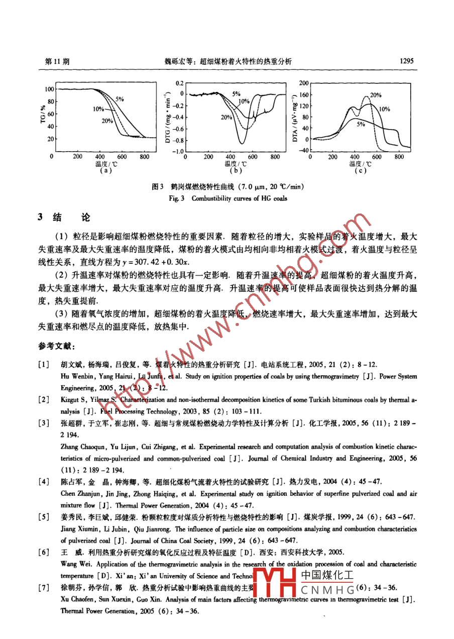 第33卷第11期煤炭學(xué)報Vol 33 No. 112008年11月JOURNAL OF CHINA COAL SOCIETY文章編號:0253-9993(2008)11-1292-04超細煤粉著火特性的熱重分析魏礫宏,李潤東,李愛民!,李延吉,姜秀民(1.沈陽航空工業(yè)學(xué)院清潔能源與環(huán)境工程研究所,遼寧沈陽110034;2.上海交通大學(xué)機械與動力工程學(xué)院,上海200240摘要:采用熱重法,分析了粒度、升溫速率和氧氣濃度對超細煤粉著火特性和燃燒特性的影響實驗結(jié)果表明,減小煤粉粒度,增大氧氣濃度有利于降低煤粉著火溫度,増大煤粉的燃燒速率,提高超細煤粉燃燒性能。升溫速率對煤粉的燃燒特性也有影響,隨著升溫速率的提高超細煤粉的著火溫度升高,最大失重速率增大,最大失重速率對應(yīng)的溫度升高關(guān)鍵詞:超細煤粉;著火特性;失重;熱分析中圖分類號:TQ531文獻標(biāo)識碼:AStudy on ignition characteristics of micro-pulverizedcoal by thermogravimetryWEI Li-hong, Li Run-dong', LI Ai-min, LI Yan-ji', JIANG Xiu-mir(1. institute of Clean Energy and Entironmental Engineering, Shenyang institute of Aeronautical Engineering, Shenyang 110034, China; 2. School ofMechanical Engineering, Shanghai Jiaotong Uninersity, Shanghai 200240, China)Abstract: The effect of particle size, heating rate and oxygen concentration on ignition and combustion characteris-tics of HG coal were investigated by the thermogravimetric technique. The experimental result shows that decreasingparticle size and increasing oxygen concentration are favorable to reduce the ignition temperature, accelerate corbustion rates and improve combustion properties of coal. The ignition temperature, maximum weight loss rate andthe corresponding temperature of maximum weight-loss rate are increased with raising heating-up rate.Key words: micro-pulverized coal; ignition characteristics; weight loss; thermogravimetric analysis煤的著火特性是煤的重要性質(zhì),了解和掌握煤的著火特性可正確啟動點火過程和正確運行動態(tài)優(yōu)化控制,對于燃燒設(shè)備的啟動和燃燒器的容量設(shè)計有很大的指導(dǎo)意義.目前煤粉的著火機制分為均相著火多相著火和均相一多相聯(lián)合著火模式3種類型.影響著火的因素很多,除了加熱速度和煤粉粒徑外,還有煤種、煤質(zhì)特性、環(huán)境氧濃度、加熱條件、流動特性、煤粉顆粒間的相互影響等.超細煤粉是一種新的燃燒方式,在燃燒特性和污染物排放特性等方面與常規(guī)煤粉有較大不同,目前還未見到對超細煤粉著火特性的深入研究.本文主要研究了粒度、升溫速率和氧氣濃度對超細煤粉著火特性的影響,討論其主要原因試驗部分1.1樣品的選取和制備實驗采用鶴崗煤,經(jīng)過碾磨(分為干磨和濕磨),制成細化和超細化煤粉,其中平均粒徑在20μm以中國煤化工收稿日期:2007-11-29責(zé)任編輯:畢永華基金項目:國家高技術(shù)研究發(fā)展計劃(863)基金資助項目(2002AA5270CNMHG(2004D079作者簡介:魏礫宏(1975—),女,黑龍江五大連池人,副教授,博士.Tel:024-89723734,E-mal;weicheng@syuae.edu.cn第11期魏礫宏等:超細煤粉著火特性的熱重分析上的試樣采用干式研磨,平均粒徑小于20μm的試樣通過濕式球磨得到.鶴崗煤的工業(yè)分析和元素分析見表1表1鶴崗煤的工業(yè)分析與元素分析Table 1 Ultimate and proximate analysis of testing coal samples工業(yè)分析/%元素分析/%煤種(代碼)一鶴崗煙煤(HC)1.80520.85032.53044.8154.6780.8260.4873.104根據(jù)w(C)+w(H)+w(N)+(O)+(S)+A+Ms=100計算得到1.2熱重分析本實驗在日本島津公司的60-H型熱重差熱同時分析儀上進行.采用5,10,20℃/min升溫速率不同比例的氧氣(99.99%)和氬氣(99.999%)混合氣體作為氣氛氣體,氣體流量為50mL/min.首先在樣品池中加入煤樣,用高純氬(99.999%)氣吹掃0.5h以趕走爐體內(nèi)的空氣,再通入混合氣體開始燃燒實驗.為求各實驗樣品的著火溫度,本文在上述表2實驗樣品的著火溫度實驗條件下,以高純氬為氣氛氣體,相應(yīng)進行了熱Table 2 Ignition temperature of HG coals解實驗粒徑/比表面積質(zhì)量/升溫速率/氧氣濃T1.3著火溫度的確定(m2·g-1)嗶g(℃·min-1)度/%℃著火是由緩慢的氧化狀態(tài)轉(zhuǎn)變到反應(yīng)能自動加8.718速到高速燃燒狀態(tài)的瞬間過程,相對應(yīng)的溫度即為23.330081320著火溫度,是衡量煤粉可燃性和火焰穩(wěn)定性的一個35重要性質(zhì),記做T,本文采用失重微分曲線52.118.78420(DTG)分界點法和失重曲線(TG)分界點法的平043988952020均值作為超細煤粉的著火溫度,即定義燃燒曲線與7.04.398.861熱解曲線在TG和DTG曲線上的分界點溫度值的平708.74070000均值為著火溫度.各實驗樣品的著火溫度見表22實驗結(jié)果與討論2.1粒度對著火溫度的影響圖1是粒徑為70,23.3,35.9,56,2μm的鶴崗煤在20℃/min和20%氧氣濃度下的燃燒特性曲線由圖1(a)可知,對于粒徑為7.0,23.3,35.9μm的鶴崗煤粉,TG曲線在整個燃燒過程中沒有表現(xiàn)出較大差異,曲線有較多重合.而粒徑為56.2μm鶴崗煤TG曲線與其它3個粒徑煤粉相比明顯向高溫方向移動,說明粒度的增大,對煤粉的燃燒產(chǎn)生不利的影響由表2煤粉粒徑與著火溫度的關(guān)系可知,在7.0~60.0μm范圍內(nèi),隨著粒徑的增大,煤粉的著火溫度也隨著提高,且呈線性關(guān)系:y=307.42+0.30x,R=0.97.這一結(jié)論與 Kizgut等2、張超群等的熱天平試驗結(jié)論及陳占軍等利用煤粉氣流著火溫度測定裝置的試驗結(jié)果一致其原因在于,隨著煤樣粒徑的減小,煤樣的比表面積越大,平均表觀活化能就越小,小粒徑的煤粉更易達到著火溫度.所