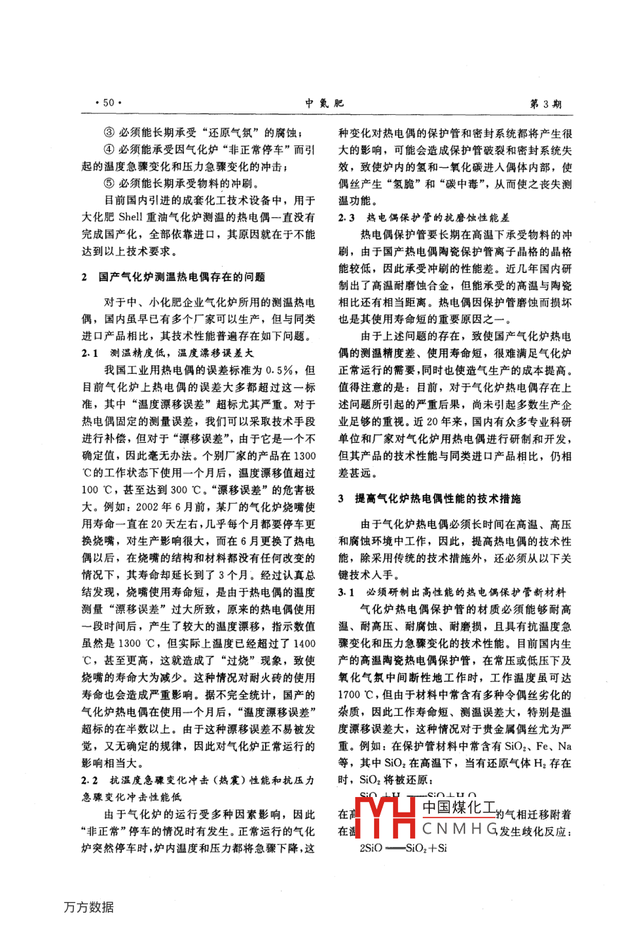 第3期中氮肥No. 32004年5月M-Sized Nitrogenous Fertilizer ProgressMay 2004氣化爐測(cè)溫?zé)犭娕即嬖诘膯?wèn)題和解決方法馬國(guó)敬',王春”,王強(qiáng)*, 徐攀峰',蘇鐵力'(1.遼寧大學(xué),遼寧沈陽(yáng)110036; 2.蘭州石化公司化肥廠,甘肅蘭州730060)[摘要]通過(guò)分析氣化爐測(cè)溫?zé)犭娕即嬖诘膯?wèn)題,闡述其解央的方法和所采用的新材料、新工藝。工業(yè)運(yùn)行試驗(yàn)結(jié)果表明,使用新材料和新工藝所制造的氣化爐熱電偶各項(xiàng)技術(shù)指標(biāo)已達(dá)到或超過(guò)進(jìn)口產(chǎn)品的先進(jìn)水平。[關(guān)鍵詞]氣化爐;熱電偶;納米復(fù)合陶瓷材料;溫度變化沖擊;壓力變化沖擊[中圖分類號(hào)] TQ545 [文獻(xiàn)標(biāo)識(shí)碼] B [文章編號(hào)] 1004-9932(2004)03-0049-03The problem in the thermocouple for the gasifier and its solutionMA Guo- jing',WANG Chun', WANG Qiang', XU Pan-feng' , SU Tie-lil(1. Liaoning University. Shenyang 110036, China;2. Chemical Fertilizer Factory of Lanzhou Chermical Industry Corp, Lanzhou 730060, China)Abstract: The problem concerning the thermocouple for the gasifier is analyzed and its solution isprovided by making use of new materials and technology. The results of the industrial experimentsshow that all the technical indices of the new thermocouple are as good as or better than that of theimported products.Key words: gasifier; thermocouple; nano ceramic compound; shock of thermodynamic change; shockof pressure change液態(tài)排渣,在爐溫控制正常的條件下,耐火磚的1溫 度對(duì)氣化爐的影響表面有一層煤渣層,當(dāng)爐溫控制準(zhǔn)確時(shí),可確保氣化爐運(yùn)行狀態(tài)的好壞、水平的高低是決定耐火磚的表面有厚度適當(dāng)?shù)脑鼘?,這種厚度適當(dāng)化肥企業(yè)和煤氣生產(chǎn)廠經(jīng)濟(jì)效益的關(guān)鍵因素,而的渣層可以減緩氣體和熔渣對(duì)耐火磚表面的沖對(duì)氣化爐的溫度進(jìn)行準(zhǔn)確的測(cè)量和嚴(yán)格的控制,刷。爐內(nèi)溫度過(guò)高時(shí),渣層變薄,會(huì)影響耐火磚則是確保氣化爐正常運(yùn)行的關(guān)鍵因素。氣化爐的的使用壽命。這種因爐溫過(guò)高而使耐火磚壽命大溫度對(duì)氣化爐運(yùn)行有如下三方面的影響。.大減少的情況在中、小化肥企業(yè)的氣化爐中普遍(1)直接影響氣化爐內(nèi)的反應(yīng)是否在理想的存在。工藝條件下進(jìn)行。只有在理想的工藝條件下,才(3)直接影響爐渣能否順利排出。不同產(chǎn)地能確保獲得較高的產(chǎn)氣效率。例如:在Shell粉煤的煤有不同的粘溫特性,不同的粘溫特性要求相氣化技術(shù)中,噴入爐膛的粉煤、純氧和水蒸氣要應(yīng)的氣化爐操作溫度,如果不能準(zhǔn)確地測(cè)量爐溫,控制在1500C的溫度條件下,才能獲得理想的產(chǎn)就不能使氣化爐處于原料煤粘溫特性的最佳值,氣效率。爐渣不能順利排出,氣化爐就不能正常運(yùn)行.因此,(2)對(duì)氣化爐內(nèi)耐火磚使用壽命的長(zhǎng)短有十對(duì)氣化爐的爐溫進(jìn)行準(zhǔn)確測(cè)量至關(guān)重要。分重要的影響。例如:在德士古煤氣化技術(shù)中為由于氣化爐內(nèi)的工況極為苛刻,因此對(duì)測(cè)量爐溫的熱由偶的技術(shù)要求也極高:[收稿日期] 2004-01-06中國(guó)煤化工1500 C的高溫;[作者簡(jiǎn)介]馬國(guó)敬(1964-),男,遼寧沈陽(yáng)人,實(shí)驗(yàn)YHCNMHG8.7MPa的高壓師。(不同的工藝,其要求的溫度和壓力有所不同);●50●中氮肥第3期③必須能長(zhǎng)期承受“ 還原氣氛”的腐蝕;種變化對(duì)熱電偶的保護(hù)管和密封系統(tǒng)都將產(chǎn)生很④必須能承受因氣化爐“非正常停車”而引大的影響,可能會(huì)造成保護(hù)管破裂和密封系統(tǒng)失起的溫度急驟變化和壓力急驟變化的沖擊;效,致使?fàn)t內(nèi)的氫和一氧化碳進(jìn)入偶體內(nèi)部,使⑤必須能長(zhǎng)期承受物料的沖刷。偶絲產(chǎn)生“氫脆”和“碳中毒”,從而使之喪失測(cè)目前國(guó)內(nèi)引進(jìn)的成套化工技術(shù)設(shè)備中,用于溫功能。大化肥Shell 重油氣化爐測(cè)溫的熱電偶-直沒(méi)有2.3熱電偶保護(hù)管的抗磨蝕性能差完成國(guó)產(chǎn)化,全部依靠進(jìn)口,其原因就在于不能熱電偶保護(hù)管要長(zhǎng)期在高溫下承受物料的沖達(dá)到以上技術(shù)要求。刷,由于國(guó)產(chǎn)熱電偶陶瓷保護(hù)管離子晶格的晶格能較低,因此承受沖刷的性能差。近幾年國(guó)內(nèi)研2國(guó)產(chǎn)氣化爐測(cè)溫?zé)犭娕即嬖诘膯?wèn)題制出了高溫耐磨蝕合金,但能承受的高溫與陶瓷對(duì)于中、小化肥企業(yè)氣化爐所用的測(cè)溫?zé)犭娤啾冗€有相當(dāng)距離。熱電偶因保護(hù)管磨蝕而損壞偶,國(guó)內(nèi)雖早已有多個(gè)廠家可以生產(chǎn),但與同類也是其使用壽命短的重要原因之-。進(jìn)口產(chǎn)品相比,其技術(shù)性能普遍存在如下問(wèn)題。由于上述問(wèn)題的存在,致使國(guó)產(chǎn)氣化爐熱電2.1測(cè)溫精度低, 溫度漂移誤差大偶的測(cè)溫精度差、使用壽命短,很難滿足氣化爐我國(guó)工業(yè)用熱電偶的誤差標(biāo)準(zhǔn)為0.5%,但正常運(yùn)行的需要,同時(shí)也使造氣生產(chǎn)的成本提高。目前氣化爐上熱電偶的誤差大多都超過(guò)這一標(biāo)值得注意的是:目前,對(duì)于氣化爐熱電偶存在上準(zhǔn),其中“溫度漂移誤差”超標(biāo)尤其嚴(yán)重。對(duì)于述問(
