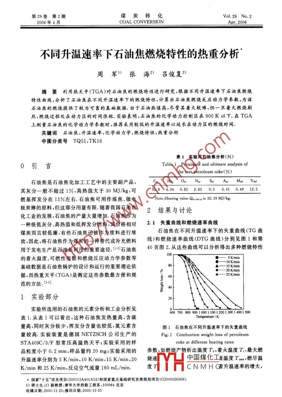 第29卷第2期煤炭轉(zhuǎn)化2006年4月COAL CONVERSIONApr.2006不同升溫速率下石油焦燃燒特性的熱重分析周軍1)張海2)呂俊復(fù)?摘要利用熱天平(TGA)對(duì)石油焦的燃燒特性進(jìn)行研究,根據(jù)不同升溫速率下石油焦燃燒特性曲線,分析了石油焦在不同升溫速率下的燃燒特性,計(jì)算出石油焦燃燒反應(yīng)動(dòng)力學(xué)參數(shù),為該石油焦的燃燒提供了較為可靠的基礎(chǔ)數(shù)據(jù),由于石油熱值高,盡管其著火較難,但一旦著火燃燒劇烈,燃燒過(guò)程處在動(dòng)力區(qū)的時(shí)間很短.實(shí)驗(yàn)表明,石油焦的化學(xué)動(dòng)力控制區(qū)在900K以下,在TGA上測(cè)量石油焦的化學(xué)動(dòng)力學(xué)參數(shù)時(shí),推薦采用較低的升溫速率以延長(zhǎng)在動(dòng)力區(qū)的燃燒時(shí)間關(guān)鍵詞石油焦,升溫速率,化學(xué)動(dòng)力學(xué),燃燒特性,熱重分析中圖分類(lèi)號(hào)TQ51,TK16表1實(shí)驗(yàn)用石油焦分析(%)0引言Table 1 Proximate and ultimate analysis ofthe test petroleum coke(%)石油焦是石油焦化加工工藝中的主要副產(chǎn)品,其灰分一般不超過(guò)1%,高熱值大于30MJ/kg,可91,84.040.832.830.50.410.4912.5燃基揮發(fā)分在13%左右.石油焦可用作煉焦、做電Note: Heating value Qar, net, p is 32 39 MJ/kg極炭棒的原料,但這部分用量有限,隨著我國(guó)石油焦2結(jié)果與討論化工業(yè)的發(fā)展,石油焦的產(chǎn)量大量增加,石油焦作為種極低灰分、高熱值和低揮發(fā)分燃料,其價(jià)格相對(duì)2.1失重曲線和燃燒速率曲線煤炭而言較低廉,有些石油焦還被作為廢料進(jìn)行堆石油焦在不同升溫速率下的失重曲線(TG曲放,因此將石油焦作為煤炭的一種替代或補(bǔ)充燃料線)和燃燒速率曲線(DTG曲線)分別見(jiàn)圖1和第用于發(fā)電生產(chǎn)是石油焦利用的重要途徑石油焦40頁(yè)圖2.從這些曲線可以分析得出多種燃燒特性的著火溫度、可燃性指數(shù)和燃燒反應(yīng)動(dòng)力學(xué)參數(shù)等基礎(chǔ)數(shù)據(jù)是石油焦鍋爐的設(shè)計(jì)和運(yùn)行的重要理論依據(jù),而熱重天平(TGA)是測(cè)定這些參數(shù)最方便和規(guī)5K/min范的方法.35實(shí)驗(yàn)部分實(shí)驗(yàn)所選用的石油焦的元素分析和工業(yè)分析見(jiàn)600700800900100011001200130014001500表1.從表1可以看出,這種石油焦發(fā)熱量高,含碳量高,同時(shí)灰分極少,揮發(fā)分含量也較低,氮元素含圖1石油焦在不同升溫速率下的失重曲線量較高.實(shí)驗(yàn)裝置是德國(guó) NETZSCH公司生產(chǎn)的Fig 1 Combustion weight loss of petroleumSTA409C/3/F型常壓高溫?zé)崽炱?實(shí)驗(yàn)采用的樣coke at different heating rates品粒度小于0.2mm,樣品量約20mg;實(shí)驗(yàn)采用的參數(shù),如燃燒產(chǎn)物析出溫度T,著火溫度T,最大燃升溫速率分別為5K/min,10K/min,15K/min,20燒速中國(guó)煤化工直溫度T-x,燃盡溫K/min和25K/min,反應(yīng)空氣流量160mL/minCNMH著升溫速率的增大國(guó)家“十五”攻關(guān)項(xiàng)目(200113A401A03)和國(guó)家重點(diǎn)基礎(chǔ)研究發(fā)展規(guī)劃項(xiàng)目(G200006309)1)碩士生;2)副教授,清華大學(xué)熱能工程系,100084北京收稿日期:2005-11-25;修回日期:2005-1225煤炭轉(zhuǎn)化2006年009▲-15Kmin25 K/minDTGTemperature600700800900100011001200130014001500圖3著火溫度定義圖Fig 3 Definition of ignition temperature圖2石油焦在不同升溫速率下的燃燒速率曲線Fig 2 Spatial variation of the burning rate ofpetroleum coke at different heating rates燃燒反應(yīng)從低溫段向髙溫段移動(dòng).在5K/min的升溫速率下,反應(yīng)從620K開(kāi)始失重,到900K燃盡燃燒時(shí)間約56min;而在25K/min的升溫速率下反應(yīng)從635K開(kāi)始失重,到1450K燃盡,燃燒時(shí)間只有約32min因此,在升溫速率增大的時(shí)候,反應(yīng)Heating rate/K. min")會(huì)向高溫段移動(dòng)燃燒速率加快,燃燒時(shí)間縮短,燃圖4著火溫度隨升溫速率的變化燒變得更容易而在800K以下的低溫段燃燒速率曲線近似重疊,可見(jiàn)熱天平中石油焦在低溫段的燃gnition temperature燒速率對(duì)升溫速率的變化不敏感著火溫度增大,5K/min下的著火溫度為730K,而熱分析技術(shù)經(jīng)過(guò)多年的發(fā)展日趨成熟,其數(shù)據(jù)25K/min下的著火溫度為765K.而這兩個(gè)升溫速處理也相當(dāng)規(guī)范.將在不同工況下的TGA實(shí)驗(yàn)結(jié)率下開(kāi)始失重的溫度分別為620K和635K.沈伯果進(jìn)行熱分析,可以得到一系列表征熱分析的特性雄等在研究某些石油焦著火溫度的時(shí)候?qū)㈤_(kāi)始失參數(shù),例如著火溫度、可燃性指數(shù)燃燒特性指數(shù)以重的溫度定義為著火溫度,并認(rèn)為升溫速率對(duì)著火及燃燒反應(yīng)動(dòng)力學(xué)參數(shù)等沒(méi)有影響,在此如果也以開(kāi)始失重溫度為著火溫度2.2著火溫度15K的溫差也是可以忽略的,但是根據(jù) TG-DTGTGA中的著火溫度有著不同的定義方法,常用聯(lián)合定義法,25K/min下的著火溫度比5K/min高的方法有:1)溫度曲線突變法,即認(rèn)為在著火燃出約35K,著火溫度隨著升溫速率的增大而變大的燒時(shí)由于燃燒迅速放熱,會(huì)引起TG溫度曲線上出趨勢(shì)是比較明顯的原因可能是,一方面隨著升溫速現(xiàn)突變點(diǎn),將該點(diǎn)定義為著火溫度,有時(shí)候溫度變化率的增大,燃燒反應(yīng)向高溫區(qū)移動(dòng),著火溫度也隨之不明顯,可以用dT/d