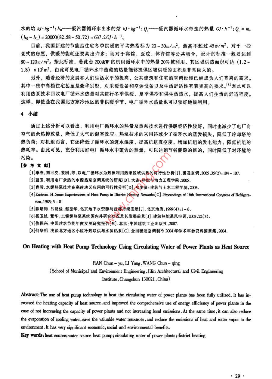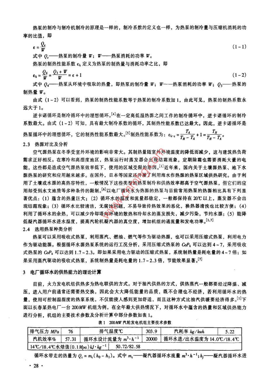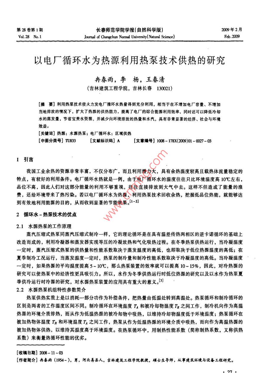 第28卷第1期長春師范學(xué)院學(xué)報(自然科學(xué)版)2009年2月Vol.28 No.1Joumal of Changchun Normal University(Natural Science)Feb.2009以電廠循環(huán)水為熱源利用熱泵技術(shù)供熱的研究冉春雨,李楊,王春清(吉林建筑工程學(xué)院,吉林長春130021)[摘要]利用熱泵技術(shù)使火力發(fā)電廠循環(huán)水熱量得到充分利用,相當(dāng)于在不增加電廠容量、不增加當(dāng)?shù)嘏欧诺那闆r下,擴(kuò)大了熱源的供熱能力,提高了電廠的綜合能源利用效率,同時還可以降低冷卻水的蒸發(fā)量,節(jié)省寶貴水資源,并減少向環(huán)境排放的熱量和水汽,具有非常顯著的經(jīng)濟(jì)、社會與環(huán)境效益。[關(guān)鍵詞]熱源;水源熱泵;電廠循環(huán)水;區(qū)城供熱[中圍分類號] TU833[文獻(xiàn)標(biāo)識碼] A[文章編號] 1008- 18(2009)01 - 0027-031引言我國工業(yè)余熱的資源非常豐富,不僅分布廣,而且利用潛力大,具有余熱溫度較高且載熱體流量穩(wěn)定的特點(diǎn),有較好的利用條件。電廠循環(huán)水熱就是- -例,由于電廠循環(huán)水的溫度往往只比環(huán)境溫度高10C左右,品位不高,因此人們對這部分能量的利用不夠重視,往往直接排放到大氣中去。這樣不但造成了能量的浪費(fèi),還給環(huán)境帶來了熱污染。若以電廠循環(huán)水為熱源,利用熱泵技術(shù)回收余熱,挖掘低品位熱能,就能夠達(dá)到有效地利用能源的目的,從而收到顯著的節(jié)能效果。1-2]2循環(huán)水-熱泵技術(shù)的優(yōu)點(diǎn)2.1水源熱泵的工作原理蒸汽壓縮式熱泵同蒸汽壓縮式制冷--樣,它的理論循環(huán)是在具有溫差傳熱兩相區(qū)的逆卡諾循環(huán)的基礎(chǔ)上改造而成的,利用冷凝器和蒸發(fā)器實現(xiàn)等壓的冷凝放熱和氣化吸熱過程。在冬季熱泵供熱運(yùn)行,當(dāng)冷凝溫度-定時,蒸汽壓縮式熱泵的供熱量和性能系數(shù)取決于蒸發(fā)溫度的高低,也即取決于低位熱源溫度的高低;在夏季制冷工況運(yùn)行,當(dāng)蒸發(fā)溫度- -定時,熱泵的制冷量和制冷性能系數(shù)取決于冷凝溫度的高低。當(dāng)冷凝溫度一定時,如果熱源的平均溫度提高5~ 10C,那么熱泵裝置的效率就可以提高10~ 15%,因此,對冷熱源的研究可以使熱泵中的經(jīng)濟(jì)性更具吸引力。所以,水作為冬季供熱運(yùn)行時低位熱源的研究以及以水作為熱泵夏季供冷運(yùn)行時冷源的研究,對水源熱泵裝置的應(yīng)用具有重大的意義。[3]2.2水源熱泵機(jī)組特性參數(shù)簡介熱泵供熱實質(zhì)上是以消耗一部分功作 為補(bǔ)償條件,把熱量由低溫處轉(zhuǎn)到高溫處。熱泵循環(huán)和制冷循環(huán)的區(qū)別是兩者的工作溫度區(qū)間不同。制冷循環(huán)在環(huán)境溫度Tn和被冷卻物溫度Te之間工作,制冷機(jī)向作為高溫?zé)嵩吹沫h(huán)境介質(zhì)排熱,而從作為低溫?zé)嵩吹谋焕鋮s物中吸熱,以維持冷卻物溫度低于環(huán)境溫度;熱泵循環(huán)在被加熱物體溫度TH和環(huán)境溫度TA之間工作,熱泵從作為低溫?zé)嵩吹沫h(huán)境介質(zhì)中吸熱,而向作為高溫?zé)嵩吹谋患訜嵛矬w供熱,以維持其溫度高于環(huán)境溫度。在熱泵循環(huán)中,用制熱性能系數(shù)(簡稱制熱系數(shù),又稱供熱系數(shù))來衡量熱循環(huán)性能的優(yōu)劣。[收穡日期] 2008-11-03[作者簡介]冉舂雨(1954-), 男,河北易縣人,吉林建筑工程學(xué)院教授,碩士生導(dǎo)師,從事建筑環(huán)境與設(shè)備工程研究。熱泵的制冷與制冷機(jī)制冷的原理是一-樣的,制冷系數(shù)的定義也- -樣, 為熱泵的制冷量與壓縮機(jī)消耗的功率的比值,即=l(1-1)式中Q.-熱泵的制冷量 W; W--熱泵消耗的功率 W。熱泵的制熱性能系數(shù)εh定義為熱泵的制熱量與消耗功率之比,即Q4 03+ wen==ε+1(1-2)式中Q4一熱泵從環(huán)境中吸取的熱量, 即熱泵的制冷量W; W--熱泵消耗的功率 W; Q3-熱泵的制熱量W。由式(1-2)可以看到,熱泵的制熱性能系數(shù)等于熱泵的制冷系數(shù)加1,由此可見,熱泵的制熱系數(shù)永遠(yuǎn)大于1。逆卡諾循環(huán)是制冷循環(huán)中的理想循環(huán)。[4)在--定高低溫?zé)嵩粗g工作的制冷循環(huán)中,逆卡諾循環(huán)的制冷系數(shù)最大。由式(1-2) 可知,具有最大制冷系數(shù)的循環(huán),其制熱性能系數(shù)已達(dá)最大。因此,逆卡諾循環(huán)是T_TH熱泵循環(huán)中的理想循環(huán),它的制熱性能系數(shù)最大。]制熱性能系數(shù)為: er.=元+1=jTH- T2.3 熱源對比及分析空氣源熱泵在冬季受室外環(huán)境的影響非常大。其制熱量隨室外環(huán)境溫度的降低而減少,這與建筑熱負(fù)荷需求正好相反。在寒冷和高濕度地區(qū),熱泵運(yùn)行時蒸發(fā)器會出現(xiàn)結(jié)霜現(xiàn)象,定期除霜也需要消耗大量的電能,這些都是造成空氣源熱泵效率低下,使用的區(qū)域受限的原因。川近年來,國內(nèi)關(guān)于土壤源熱泵、地下水源熱泵的研究和應(yīng)用越來越多。在國外,日本等國家還開展了利用海水作熱源的熱泵區(qū)域供熱研究。由于利用了土壤或水源的高熱容特性,一般情況下這些類型的熱泵制冷和供熱效率都高于空氣源熱泵,但它們的應(yīng)用卻受到水文地質(zhì)等多種條件的限制。[6以電廠循環(huán)水為熱源的熱泵與目前常用熱泵的熱源相比具有下列顯著優(yōu)點(diǎn): (1)蘊(yùn)含的熱量巨大; (2) 循環(huán)水的溫度和流量都穩(wěn
