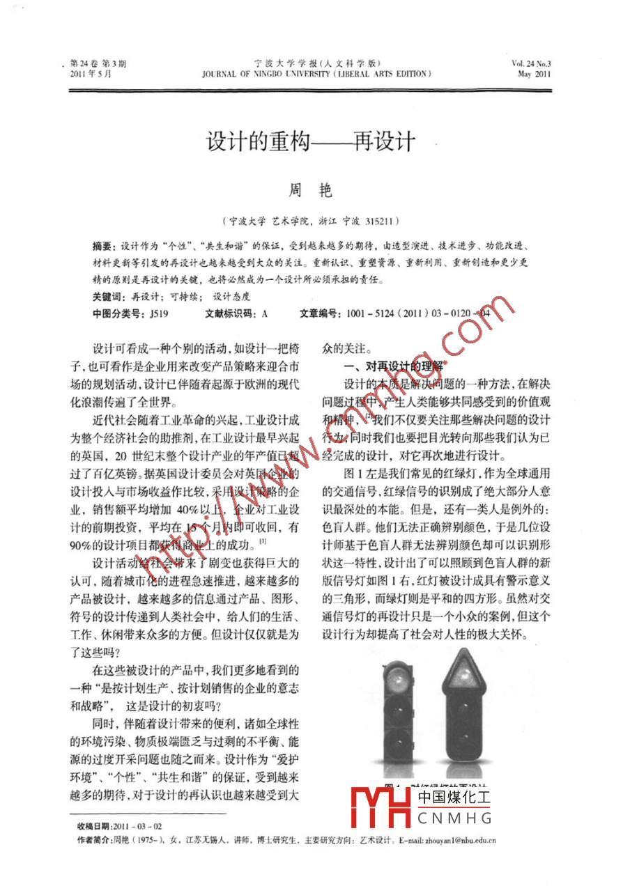 第24卷第3期寧波大學(xué)學(xué)報(bào)(人文科學(xué)版)......Vol. 24 No.32011年5月JOURNAL OF NINGBO UNIVERSTTY ( LJBERAL ARTS EDITION )May 2011設(shè)計(jì)的重構(gòu)一再設(shè)計(jì)周艷(寧波大學(xué)藝術(shù)學(xué)院,浙江寧波315211)摘要:設(shè)計(jì)作為“個(gè)性”、“共生和諧”的保證,受到越來(lái)越多的期待,由造型演進(jìn)、技術(shù)進(jìn)步、功能改進(jìn)、材料更新等引發(fā)的再設(shè)計(jì)也越來(lái)越受到大眾的關(guān)注。重新認(rèn)識(shí)、重塑資源、重新利用、重新創(chuàng)造和更少更精的原則是再設(shè)計(jì)的關(guān)鍵,也將必然成為一個(gè)設(shè)計(jì)所必須承擔(dān)的責(zé)任。關(guān)鍵詞:再設(shè)計(jì);可持續(xù);設(shè)計(jì)態(tài)度中圖分類號(hào): J519文獻(xiàn)標(biāo)識(shí)碼: A文章編號(hào): 1001-5124 (2011) 03 -0120-04設(shè)計(jì)可看成-種個(gè)別的活動(dòng),如設(shè)計(jì)- -把椅眾的關(guān)注。子,也可看作是企業(yè)用來(lái)改變產(chǎn)品策略來(lái)迎合市一、對(duì)再設(shè)計(jì)的理解場(chǎng)的規(guī)劃活動(dòng).設(shè)計(jì)已伴隨著起源于歐洲的現(xiàn)代設(shè)計(jì)的本質(zhì)是解決問(wèn)題的一-種方法,在解決化浪潮傳遍了全世界。問(wèn)題過(guò)程中,產(chǎn)生人類能夠共同感受到的價(jià)值觀近代社會(huì)隨著工業(yè)革命的興起,工業(yè)設(shè)計(jì)成和精神,“我們不僅要關(guān)注那些解決問(wèn)題的設(shè)計(jì)為整個(gè)經(jīng)濟(jì)社會(huì)的助推劑,在工業(yè)設(shè)計(jì)最早興起行為, 同時(shí)我們也要把目光轉(zhuǎn)向那些我們認(rèn)為已的英國(guó),20 世紀(jì)末整個(gè)設(shè)計(jì)產(chǎn)業(yè)的年產(chǎn)值已超經(jīng)完成的設(shè)計(jì),對(duì)它再次地進(jìn)行設(shè)計(jì)。過(guò)了百億英鎊。據(jù)英國(guó)設(shè)計(jì)委員會(huì)對(duì)英國(guó)企業(yè)的圖1左是我們常見(jiàn)的紅綠燈,作為全球通用設(shè)計(jì)投入與市場(chǎng)收益作比較,采用設(shè)計(jì)策略的企的交通信號(hào).紅綠信號(hào)的識(shí)別成了絕大部分人意業(yè),銷(xiāo)售額平均增加40%以上,企業(yè)對(duì)工業(yè)設(shè)識(shí)最深處的本能。 但是,還有-類人是例外的:計(jì)的前期投資,平均在15個(gè)月內(nèi)即可收回,有色盲人群。他們無(wú)法正確辨別顏色,于是幾位設(shè)90%的設(shè)計(jì)項(xiàng)目都獲得商業(yè)上的成功。"計(jì)師基于色盲人群無(wú)法辨別顏色卻可以識(shí)別形設(shè)計(jì)活動(dòng)給社會(huì)帶來(lái)了劇變也獲得巨大的狀這一特性,設(shè)計(jì)出了可以照顧到色盲人群的新認(rèn)可,隨著城市化的進(jìn)程急速推進(jìn),越來(lái)越多的版信號(hào)燈如圖1右,紅燈被設(shè)計(jì)成具有警示意義產(chǎn)品被設(shè)計(jì),越來(lái)越多的信息通過(guò)產(chǎn)品、圖形、的三角形,而綠燈則是平和的四方形。雖然對(duì)交符號(hào)的設(shè)計(jì)傳遞到人類社會(huì)中,給人們的生活、通信號(hào)燈的再設(shè)計(jì)只是一- 個(gè)小眾的案例,但這個(gè)工作、休閑帶來(lái)眾多的方便。但設(shè)計(jì)僅僅就是為設(shè)計(jì)行為卻提高了社會(huì)對(duì)人性的極大關(guān)懷。了這些嗎?在這些被設(shè)計(jì)的產(chǎn)品中,我們更多地看到的一種“是按計(jì)劃生產(chǎn).按計(jì)劃銷(xiāo)售的企業(yè)的意志和戰(zhàn)略”,這是設(shè)計(jì)的初衷嗎?同時(shí),伴隨著設(shè)計(jì)帶來(lái)的便利,諸如全球性的環(huán)境污染、物質(zhì)極端匱乏與過(guò)剩的不平衡、能源的過(guò)度開(kāi)采問(wèn)題也隨之而來(lái)。設(shè)計(jì)作為“愛(ài)護(hù)環(huán)境”、“個(gè)性”、“共生和諧”的保證,受到越來(lái)越多的期待,對(duì)于設(shè)計(jì)的再認(rèn)識(shí)也越來(lái)越受到大中國(guó)煤化工收稿日期2011-03 -02YHCNMHG作者簡(jiǎn)介:周艷(1975-).女。江蘇無(wú)錫人,講師,博士研究生,主要研究方向:藝術(shù)設(shè)計(jì)。E-mail: thouyan 1@nbu edu.n第3期周艷: 設(shè)計(jì)的重構(gòu)一-再設(shè)計(jì)12日本著名設(shè)計(jì)師原研哉曾對(duì)再設(shè)計(jì)進(jìn)行了種管理工具,又可以是一種文化現(xiàn)象?!白鳛楣そ忉?“'RE-DESIGN' 這個(gè)詞的意義,簡(jiǎn)單地具,它本身就是一-種產(chǎn)業(yè),是- -種增進(jìn)價(jià)值、減說(shuō)就是‘再次設(shè)計(jì)’,就是重新面對(duì)自己身邊的少投入、快速見(jiàn)效的工具;作為一種現(xiàn)象,它是日常生活事物,從這些為我們所熟知的日常生活一種態(tài)度,是一種可作為改變社會(huì)消費(fèi)觀念、促中尋求現(xiàn)代設(shè)計(jì)的真諦,給8常生活用品賦予新進(jìn)環(huán)境與人和諧共生的媒介。的生命是我真正感興趣的課題。.... 'RE-DESIGN'這個(gè)詞,也包含了把社會(huì)中人們共有的、熟知的事物進(jìn)行再認(rèn)識(shí)的意義。...用最自然、最合適的方法來(lái)重新審視‘設(shè)計(jì)'這個(gè)概念?!?941筆者認(rèn)為,再設(shè)計(jì)更多的是傳達(dá)- -種信息,自自通過(guò)人類對(duì)已有的設(shè)計(jì)做出某種可視的改變,以期傳播友善的、生態(tài)的、可持續(xù)的設(shè)計(jì)理念,從圉2摩托羅拉的V70和Aura手機(jī)而喚起人們對(duì)所設(shè)計(jì)對(duì)象和設(sh