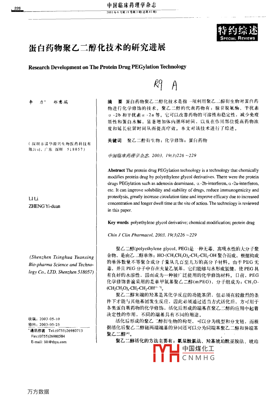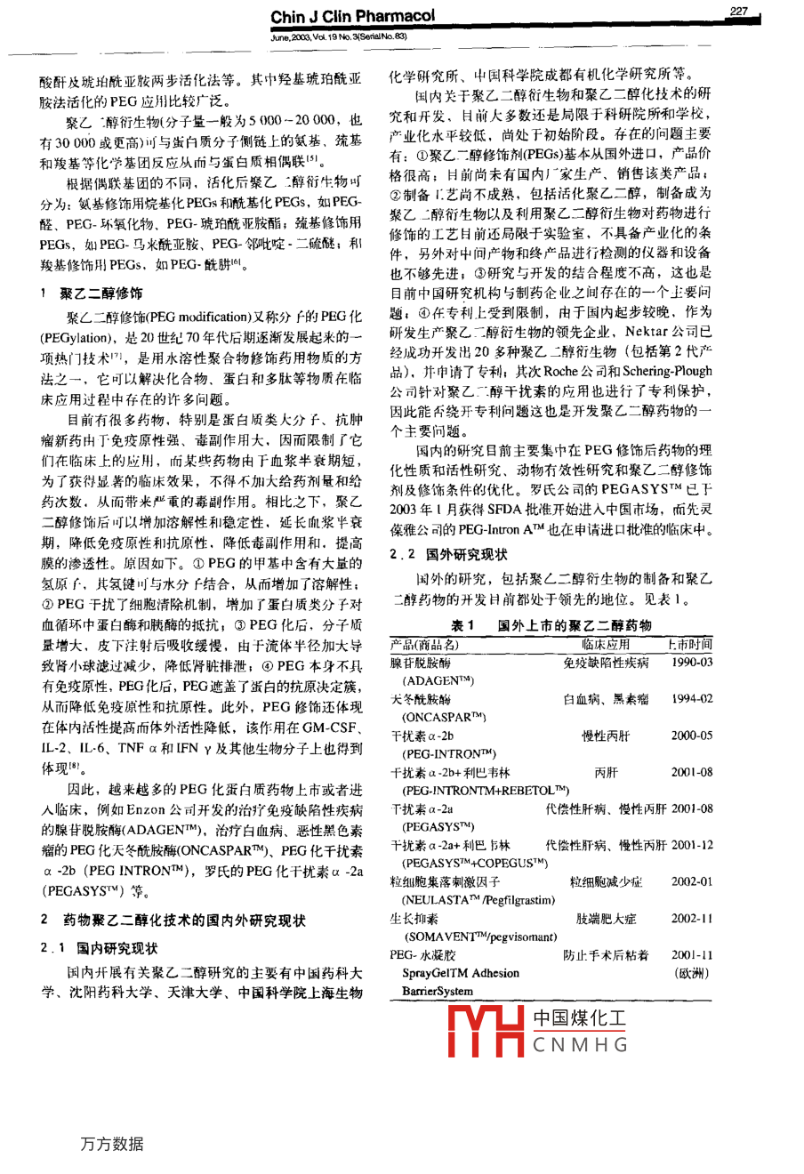 中國臨床藥理學(xué)雜志.。226.。2003年6第19番第了期(總第83期1特約綜述SPECIAL REVIews蛋白藥物聚乙二醇化技術(shù)的研究進(jìn)展Research Development on The Protein Drug PEGylation TechnologyR9 A李力’鄭意端摘要蛋白藥物聚乙二醇化技術(shù)是指-項(xiàng)利用聚乙。二醇衍生物對(duì)蛋白藥物進(jìn)行化學(xué)修飾的技術(shù)。聚乙二醇的代表藥物有:腺苷脫氨酶、干擾崇a -2b和干擾索a -2a等。它可以改善藥物的可溶性和穩(wěn)定性,減少免疫原性和蛋白水解,顯著增加體內(nèi)循環(huán)時(shí)間,以及在作州部位提高藥物濃度和延K駐留時(shí)間從而提高療效。本文對(duì)該技術(shù)進(jìn)行了綜述。(深圳市清華源興生物醫(yī)藥科技有關(guān)鍵詞聚乙二醇衍生物; 化學(xué)修飾,蛋白藥物限公司,廣東深圳518057)中國臨床藥埋學(xué)雜志2003, 19(3)226 ~229Abstract The protein drug PEGylation technology is a technology that chermicallymodifies protein drug by polyethylene glycol derivatives. There were the proteindrugs PEGylation such as adenosin deaminase, x -2b-interferon, a -2a-interferon,ctc. It can improve solubility and stability of drugs. reduce immunogenicity andproteolysis, greatly increase circulation time and improve efficacy due to increasedLILiconcentration and longer dwell time at the site of action. The technology is reviewedZHENG Yi-duanin this paper.Key words polyethylene glycol derivative; chemical modification; protein drugChin J Clin Pharmacol, 2003, 19(3)226 ~229聚厶二醇(polyethylene glycol, PEG)是: .種無毒、 高吸水性的大分子聚(Shenzhen Tsinghua Yuanxing合物,是由憶_醇單體: HO-(CH,CH2O)-CH2-CH2-OH聚合而成,根據(jù)構(gòu)成的單體數(shù)量不等聚合成分子量從幾白至兒萬的高分子材料。由于PEG無Bio-pharma Science and Techno-毒,并APEG分子中存在大量乙氧基,它們能夠與水形成氫鍵,使PEG具logy Co., LTD, Shenzhen 518057)有良好的水溶性,囚而成為一種被)泛使用的化學(xué)修飾材料??谇?,PEG化學(xué)修飾普遍采用的是單甲氧基聚厶二醇(mPEG),分子組成為: CH,O-(CH2CH,2)-CH2-CH2-OH."。聚乙二醇末端的羥基是其化學(xué)反應(yīng)的功能基團(tuán),但必須在較激烈的條件下才能與其他基團(tuán)發(fā)生反應(yīng),因此必須通過適當(dāng)方式活化后,方叮用于各類蛋白質(zhì)藥物的化學(xué)修飾,活化后形成的端基在聚乙二醇的應(yīng)用中起若決定性的作用,不同的端基具有不同的用途。收稿: 2003 05-10活化后形成的聚乙二醇衍生物的構(gòu)型,可以分為線型和分支鏈,而根修網(wǎng): 2003-05-25據(jù)活化后聚C二醇鏈兩端端基的同還可以分為同端基聚乙二醇和異端基°通訊作者Tel:(075526980713Fax:(0755)26980584聚乙二醇'。E-mail: 1ili@thyx.com聚乙二醇活化的方法主要有:氰尿酰氯法、羥基琥珀酰亞胺法、琥珀中國煤化工YHCNMHGChin J Clin Pharmacol27_June,2003.V0lL 19No.3YSereINo.83)酸酐及琥珀酰亞胺兩步活化法等。其中羥基琥珀酰亞化學(xué)研究所、中國科學(xué)院成都有機(jī)化學(xué)研究所等。胺法活化的PEG應(yīng)用比較廣泛。國內(nèi)關(guān)于聚乙二醇衍生物和聚乙二醇化技術(shù)的研聚乙醇衍生物(分子量一般為5 000-20 000,也究和開發(fā),目前大多數(shù)還是局限于科研院所和學(xué)校,有30 000或更高)可與蛋白質(zhì)分子側(cè)鏈上的氨基.巰基產(chǎn)業(yè)化水平較低,尚處于初始階段。存在的問題主要和羧基等化學(xué)基團(tuán)反應(yīng)從而與蛋白質(zhì)相偶聯(lián)51.有:①聚乙: _醇修飾劑(PEGs)基本從國外進(jìn)口,產(chǎn)品價(jià)根據(jù)偶聯(lián)基團(tuán)的不同,話化后聚乙:醇街生物時(shí)格很高; H前尚未有國內(nèi)1“家生產(chǎn)、銷售該類產(chǎn)品,分為:氨基修飾用烷基化PEGs和酰基化PEGs,如PEG-②制備1.藝尚不成熟,包括活化聚乙二醇,制備成為醛、PEG-環(huán)氧化物、PEG- 琥珀酰亞胺酯;巰基修飾用聚乙二醇銜生物以及利用聚乙二醇衍生物對(duì)藥物進(jìn)行PEGs,如PEC- 馬水酰亞胺、PEG- 鄰毗啶。二硫醚,和修飾的工藝目 前還局限于實(shí)驗(yàn)室,不具備產(chǎn)業(yè)化的條羧基修飾用PEGs,如PEG- 酰肼。件,另外對(duì)中間產(chǎn)物和終產(chǎn)品進(jìn)行檢測(cè)的儀器和設(shè)備也不夠先進(jìn),③研究與開發(fā)的結(jié)合程度不高,這也是聚乙二醇修飾目前中國研究機(jī)構(gòu)與制藥企業(yè)之間存在的-一個(gè)主要問聚厶二醇修飾(PEG modification)又稱分f的PEG化題:團(tuán)任專利上受到限制,由于國內(nèi)起步較晚,作為(PEGylation),赴20世紀(jì)70年代后期逐漸發(fā)展起來的一研發(fā)生產(chǎn)聚乙二醇 衍生物的領(lǐng)先企業(yè),Nektar公司已項(xiàng)熱門技術(shù)",是用水溶性聚合物修飾藥用物質(zhì)的方經(jīng)成功開發(fā)出20多種聚乙二酶銜生物(包括第2代產(chǎn)法之-.它可以解決化合物、蛋白和多肽等物質(zhì)在臨品),并申請(qǐng)了專利:其次Roche公司和Schering-Plough床應(yīng)用過程中存在的詐多問題。公司針對(duì)聚乙.:醇干擾素的應(yīng)用也進(jìn)行了專利保護(hù),目前有很多藥物,特別是蛋白質(zhì)類大分子、抗腫因此能否繞開專利問題這也是開發(fā)聚乙二醇藥物的一一瘤新藥由于免疫原性強(qiáng)、毒副作用大,因而限制了它個(gè)主要問題。國內(nèi)的研究目前主要集中在PEG修飾后藥物的理們?cè)谂R床上的應(yīng)用,而某些藥物由F血漿半衰期短,化性質(zhì)和話性研究、動(dòng)物有效性研究和