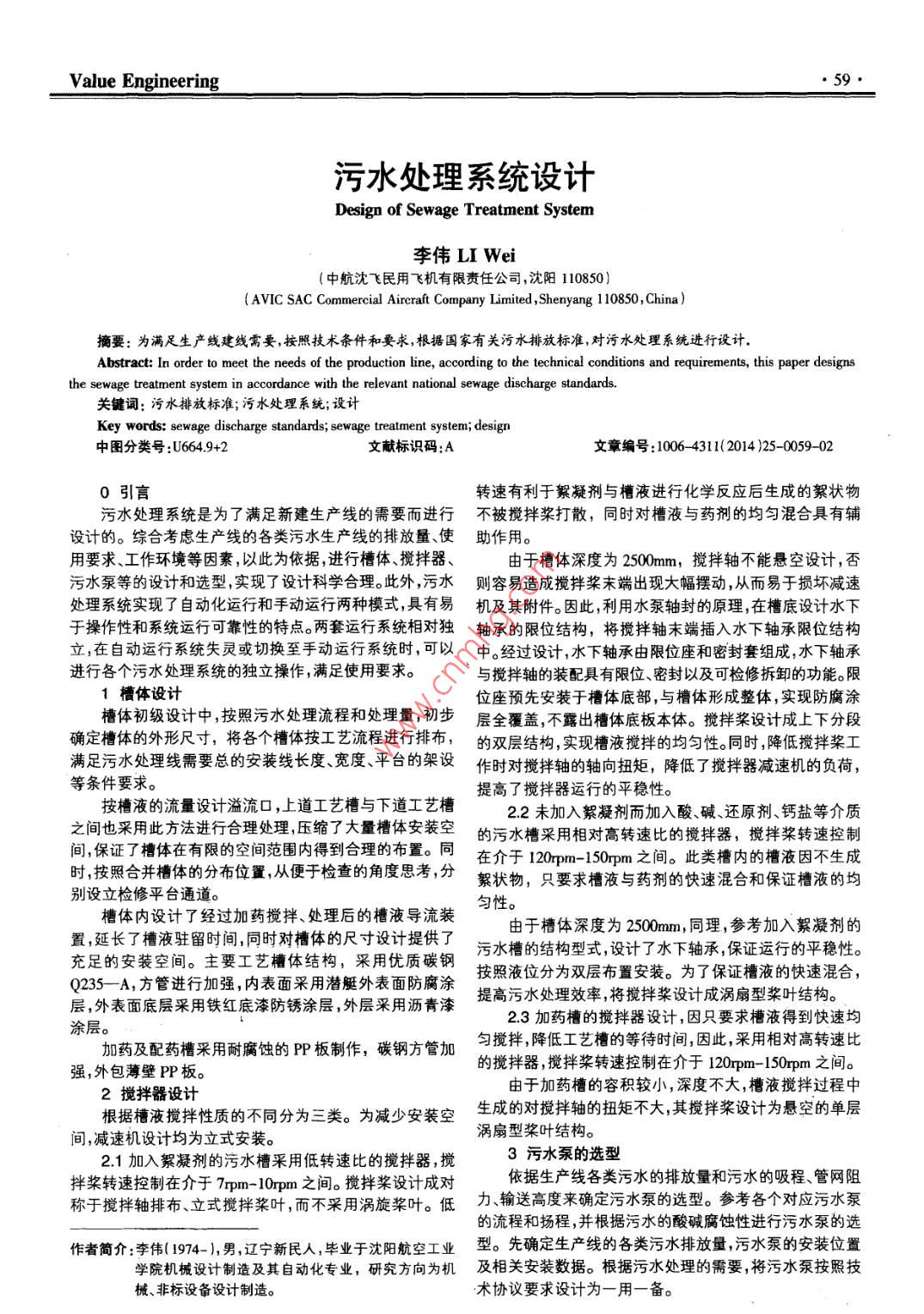 Value Engineering59污水處理系統(tǒng)設(shè)計(jì)Design of Sewage Treatment System李偉 LI Wei(中航沈飛民用飛機(jī)有限責(zé)任公司,沈陽(yáng)110850)AVIC SAC Commercial Aircraft Company Limited, Shenyang 110850, China)摘要:為滿足生產(chǎn)線建線需要,按照技術(shù)條件和要求,根據(jù)國(guó)家有關(guān)污水排放標(biāo)準(zhǔn),對(duì)污水處理系統(tǒng)進(jìn)行設(shè)計(jì)Abstract: In order to meet the needs of the production line, according to the technical conditions and requirements, this paper designsthe sewage treatment system in accordance with the relevant national sewage discharge standards關(guān)鍵詞:污水排放標(biāo)準(zhǔn);污水處理系統(tǒng);設(shè)計(jì)Key words: sewage discharge standards; sewage treatment system; design中圖分類號(hào):U6649+2文獻(xiàn)標(biāo)識(shí)碼:A文章編號(hào):10064311(2014)25-0059020引言轉(zhuǎn)速有利于絮凝劑與槽液進(jìn)行化學(xué)反應(yīng)后生成的絮狀物污水處理系統(tǒng)是為了滿足新建生產(chǎn)線的需要而進(jìn)行不被攪拌槳打散,同時(shí)對(duì)槽液與藥劑的均勻混合具有輔設(shè)計(jì)的。綜合考慮生產(chǎn)線的各類污水生產(chǎn)線的排放量使助作用。用要求、工作環(huán)境等因素,以此為依據(jù),進(jìn)行槽體、攪拌器、由于槽體深度為2500mm,攪拌軸不能懸空設(shè)計(jì),否污水泵等的設(shè)計(jì)和選型,實(shí)現(xiàn)了設(shè)計(jì)科學(xué)合理。此外,污水則容易造成攪拌槳未端出現(xiàn)大幅擺動(dòng),從而易于損壞減速處理系統(tǒng)實(shí)現(xiàn)了自動(dòng)化運(yùn)行和手動(dòng)運(yùn)行兩種模式,具有易機(jī)及其附件。因此,利用水泵軸封的原理,在槽底設(shè)計(jì)水下于操作性和系統(tǒng)運(yùn)行可靠性的特點(diǎn)。兩套運(yùn)行系統(tǒng)相對(duì)獨(dú)軸承的限位結(jié)構(gòu),將攪拌軸末端插入水下軸承限位結(jié)構(gòu)立,在自動(dòng)運(yùn)行系統(tǒng)失靈或切換至手動(dòng)運(yùn)行系統(tǒng)時(shí),可以中。經(jīng)過(guò)設(shè)計(jì),水下軸承由限位座和密封套組成,水下軸承進(jìn)行各個(gè)污水處理系統(tǒng)的獨(dú)立操作,滿足使用要求。與攪拌軸的裝配具有限位、密封以及可檢修拆卸的功能。限1槽體設(shè)計(jì)位座預(yù)先安裝于槽體底部,與槽體形成整體,實(shí)現(xiàn)防腐涂槽體初級(jí)設(shè)計(jì)中,按照污水處理流程和處理量,初步層全覆蓋,不露出槽體底板本體。攪拌槳設(shè)計(jì)成上下分段確定槽體的外形尺寸,將各個(gè)槽體按工藝流程進(jìn)行排布,的雙層結(jié)構(gòu),實(shí)現(xiàn)槽液攪拌的均勻性。同時(shí),降低攪拌槳工滿足污水處理線需要總的安裝線長(zhǎng)度寬度、平臺(tái)的架設(shè)作時(shí)對(duì)攪拌軸的軸向扭矩,降低了攪拌器減速機(jī)的負(fù)荷,等條件要求。提高了攪拌器運(yùn)行的平穩(wěn)性。按槽液的流量設(shè)計(jì)溢流口,上道工藝槽與下道工藝槽22未加入絮凝劑而加入酸、堿、還原劑、鈣鹽等介質(zhì)之間也采用此方法進(jìn)行合理處理壓縮了大量槽體安裝空的污水槽采用相對(duì)高轉(zhuǎn)速比的攪拌器,攪拌槳轉(zhuǎn)速控制間保證了槽體在有限的空間范圍內(nèi)得到合理的布置。同在介于120pm150m之間。此類槽內(nèi)的槽液因不生成時(shí),按照合并槽體的分布位置,從便于檢查的角度思考,分絮狀物,只要求槽液與藥劑的快速混合和保證槽液的均別設(shè)立檢修平臺(tái)通道。槽體內(nèi)設(shè)計(jì)了經(jīng)過(guò)加藥攪拌、處理后的槽液導(dǎo)流桊勻性。置,延長(zhǎng)了槽液駐留時(shí)間,同時(shí)對(duì)槽體的尺寸設(shè)計(jì)提供了由于槽體深度為2500mm,同理,參考加入絮凝劑的充足的安裝空間。主要工藝槽體結(jié)構(gòu),采用優(yōu)質(zhì)碳污水槽的結(jié)構(gòu)型式,設(shè)計(jì)了水下軸承,保證運(yùn)行的平穩(wěn)性。Q235-A,方管進(jìn)行加強(qiáng),內(nèi)表面采用潛艇外表面防腐涂按照液位分為雙層布置安裝。為了保證槽液的快速混合,層,外表面底層采用鐵紅底漆防銹涂層,外層采用瀝青提高污水處理效率,將攪拌槳設(shè)計(jì)成渦扇型槳葉結(jié)構(gòu)。涂層。23加藥槽的攪拌器設(shè)計(jì),因只要求槽液得到快速均加藥及配藥槽采用耐腐蝕的PP板制作,碳鋼方管加勻攪拌降低工藝槽的等待時(shí)間,因此,采用相對(duì)高轉(zhuǎn)速比強(qiáng),外包薄壁PP板的攪拌器,攪拌槳轉(zhuǎn)速控制在介于120mpm-150rm之間。2攪拌器設(shè)計(jì)由于加藥槽的容積較小,深度不大,槽液攪拌過(guò)程中根據(jù)槽液攪拌性質(zhì)的不同分為三類。為減少安裝空生成的對(duì)攪拌軸的扭矩不大,其攪拌槳設(shè)計(jì)為懸空的單層間,減速機(jī)設(shè)計(jì)均為立式安裝。渦扇型槳葉結(jié)構(gòu)。2.1加入絮凝劑的污水槽采用低轉(zhuǎn)速比的攪拌器,攪3污水泵的選型拌槳轉(zhuǎn)速控制在介于7pm-10pm之間。攪拌槳設(shè)計(jì)成對(duì)依據(jù)生產(chǎn)線各類污水的排放量和污水的吸程、管網(wǎng)阻稱于攪拌軸排布、立式攪拌槳葉,而不采用渦旋槳葉。低力輸送高度來(lái)確定污水泵的選型。參考各個(gè)對(duì)應(yīng)污水泵的流程和揚(yáng)程,并根據(jù)污水的酸堿腐蝕性進(jìn)行污水泵的選作者簡(jiǎn)介:李偉(1974-),男,遼寧新民人,畢業(yè)于沈陽(yáng)航空工
