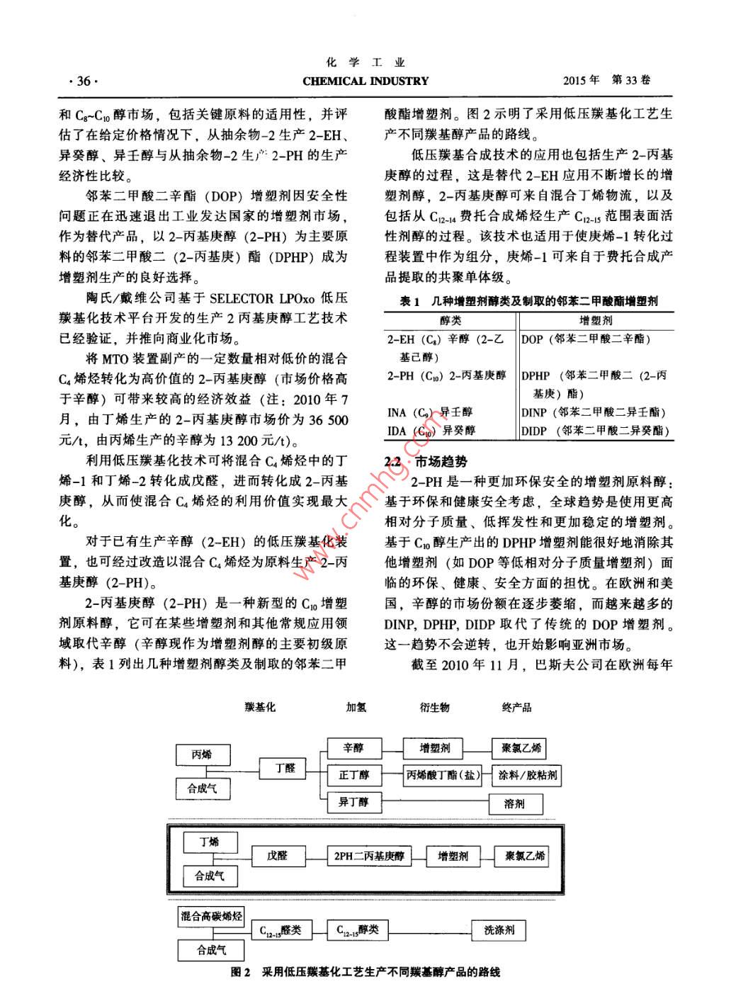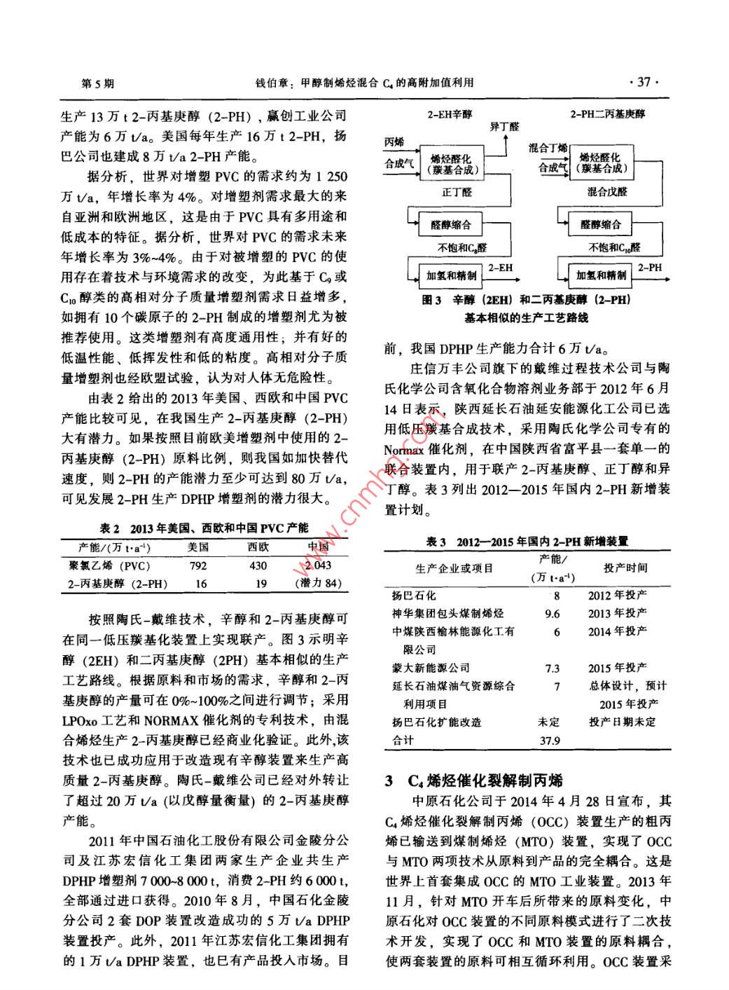 第33卷第5期化學(xué)工業(yè)2015年5月CHEMICAL INDUSTRY●. 35.甲醇制烯烴混合C4的高附加值利用錢伯章(上海擎督信息科技公司金秋傳播公司,上海200127)摘要:全球煽烴原料輕質(zhì)化趨勢將導(dǎo)致C.資源供應(yīng)緊張,甲醇制烯烴副產(chǎn)混合c,將成為緊缺資源。文中討論了提高C4附加值的下游利用路線。關(guān)鍵詞:碳四餾分; 2-丙基庚醇;丁二烯文章編號: 1673- -9647 (2015) 5-0035-05中圖分類號: TQ536.1文獻(xiàn)標(biāo)識碼: A典型的180萬t/a甲醇制60萬Va烯烴項目.脫除脫除異丁烯,副產(chǎn)10萬V/a混合Co,其主要成分為丁烯-1、順副產(chǎn)MTBE丁烯-2、反丁烯-2和異丁烯,另有少量丁二烯、丁烷等。性加袋丁烯-22-丙基庚醇對于不同的甲醇制烯烴(MTO) 技術(shù)-大HCs↓氧化脫氫化所DMTO、中石化SMTO或UOP MTO,以及烯烴裂解/不同的操作條件和工況,所產(chǎn)混合Cs的組分有所混合C4 烯烴轉(zhuǎn)化丁二烯不同。參考神華包頭和中原石化的具體運(yùn)行數(shù)據(jù),圍1 MTO 混合C,下游利用路線混合Cs組分大致范圍是:丁烯-1含量22%-27%,順丁烯-2含量21%-28%,反丁烯-2含量烯后的混合Ca,主要成分就是正丁烯(丁烯-1、31%~37%,異丁烯含量6%~8%。順丁烯-2和反丁烯-2)。1 MTO混合C4下游利用路線丁烯-1是線性低密度聚乙烯(LLDPE) 最常過去,對于以乙烯和丙烯為主要目標(biāo)產(chǎn)物的用的共聚單體,平均用量在7%左右,因此配套了煤(甲醇)制烯烴項目,采用烯烴轉(zhuǎn)化技術(shù)LDPE裝置的煤(甲醇)制烯烴項目,一般會建(OCT)大量增產(chǎn)丙烯,或采用烯烴裂解技術(shù)設(shè)丁烯精餾裝置生產(chǎn)聚合級丁烯-1,用于自有的(OCP/0CC)同時增產(chǎn)乙烯和丙烯是合理的選擇。ILDPE聚合單元。該方案不僅技術(shù)成熟,而且可以同時利用c,和c,提取丁烯-1后,順丁烯-2和反丁烯-2有兩資源。DMTO-I技術(shù)也是將甲醇制晞烴產(chǎn)物中的大利用方向:生產(chǎn)2-丙基庚醇(2-PH), 或生產(chǎn)C*組分回?zé)?,和烯烴裂解工藝類似,實現(xiàn)增產(chǎn)乙丁二烯。2-PH為高附加值精細(xì)化工產(chǎn)品,主要用烯和丙烯的效果,其C;轉(zhuǎn)化反應(yīng)和甲醇轉(zhuǎn)化反應(yīng)于生產(chǎn)新型增塑劑DPHP。由于傳統(tǒng)增塑劑DOP使用同一催化劑。 然而,目前形勢發(fā)生了變化。使用受限,2-PH市場需求穩(wěn)步增長,目前經(jīng)濟(jì)性全球烯烴原料輕質(zhì)化趨勢明顯,北美和中東新增較好。但2-PH工藝流程復(fù)雜,投資較高,如果乙烯和丙烯產(chǎn)能大部分以乙烷和丙烷為原料,將MTO行業(yè)大量建設(shè)將迅速使產(chǎn)能過剩。導(dǎo)致Cs資源供應(yīng)緊張,因此MTO混合c,長期來2丁烯-2生產(chǎn)2- -丙基庚醇(2-PH)看將成為緊缺資源,值得認(rèn)真研究其下游利用。2.1生產(chǎn)工藝圖1示明MTO混合C4下游利用路線。陶氏/戴維現(xiàn)有的羰基醇技術(shù)包括新的UCC/MTO混合C4中丁二烯含量極少(低于2%),戴維公司的2-PH工藝。該公司評價了現(xiàn)有能力利用價值不大,一般通過選擇性加氫的方法脫除。收稿日期: 2015- -02-03而異丁烯則通過“預(yù)反應(yīng)器+催化精餾”組合工.作者簡介:錢伯章(1939-), 男,江蘇省人,教授級高工,從事藝,與甲醇反應(yīng)生產(chǎn)MTBE。脫除丁二烯和異丁石油化工技術(shù)和經(jīng)濟(jì)信息調(diào)研及傳播工作?;瘜W(xué)工業(yè)●36●CHEMICAL INDUSTRY2015年第33卷和Cg~C1o醇市場,包括關(guān)鍵原料的適用性,并評酸酯增塑劑。圖2示明了采用低壓羰基化工藝生估了在給定價格情況下,從抽余物-2生產(chǎn)2-EH、產(chǎn)不同羰基醇產(chǎn)品的路線。異癸醇、異壬醇與從抽余物-2生產(chǎn)2-PH的生產(chǎn)低壓羰基合成技術(shù)的應(yīng)用也包括生產(chǎn)2-丙基經(jīng)濟(jì)性比較。庚醇的過程,這是替代2-EH應(yīng)用不斷增長的增鄰苯二甲酸二辛酯(DOP) 增塑劑因安全性塑劑醇,2-丙基庚醇可來自混合丁烯物流,以及問題正在迅速退出工業(yè)發(fā)達(dá)國家的增塑劑市場,包括從C12-14費(fèi)托合成烯烴生產(chǎn)C12-15 范圍表面活作為替代產(chǎn)品,以2- _丙基庚醇(2-PH)為主要原性劑醇的過程。該技術(shù)也適用于使庚烯-1轉(zhuǎn)化過料的鄰苯二甲酸二(2-丙基庚)酯(DPHP) 成為程裝置中作為組分,庚烯-1可來自于費(fèi)托合成產(chǎn)增塑劑生產(chǎn)的良好選擇。品提取的共聚單體級。陶氏/戴維公司基于SELECTOR LPOxo低壓表1幾種增塑劑醇類及 制取的鄰苯二甲酸酯增塑劑羰基化技術(shù)平臺開發(fā)的生產(chǎn)2丙基庚醇工藝技術(shù)醇類已經(jīng)驗證,并推向商業(yè)化市場。2-EH (C)辛醇(2-乙DOP (鄰苯二甲酸二辛酯)將MTO裝置副產(chǎn)的--定數(shù)量相對低價的混合基己醇)C4烯烴轉(zhuǎn)化為高價值的2-丙基庚醇(市場價格高2-PH (Co) 2-丙基庚醇DPHP (鄰苯二甲酸二(2-丙于辛醇)可帶來較高的經(jīng)濟(jì)效益(注: 2010年7基庚)酯月,由丁烯生產(chǎn)的2-丙基庚醇市場價為36 500INA (C2) 異壬醇DINP (鄰苯二甲酸二異壬酯)IDA (C1n) 異癸醇DIDP (鄰苯二甲酸二異癸酯)元/t,由丙烯生產(chǎn)的辛醇為13 200元/t)。利用低壓羰基化技術(shù)可將混合Ca烯烴中的丁2.2市場趨勢烯-1和丁烯-2轉(zhuǎn)化成戊醛,進(jìn)而轉(zhuǎn)化成2-丙基2-PH是一-種更加環(huán)保安全的增塑劑原料醇:庚醇,從而使混合Ca烯烴的利用價值實現(xiàn)最大基于環(huán)保和健康安全考慮,全球趨勢是使用更高七。相對分子質(zhì)量、低揮發(fā)性和更加