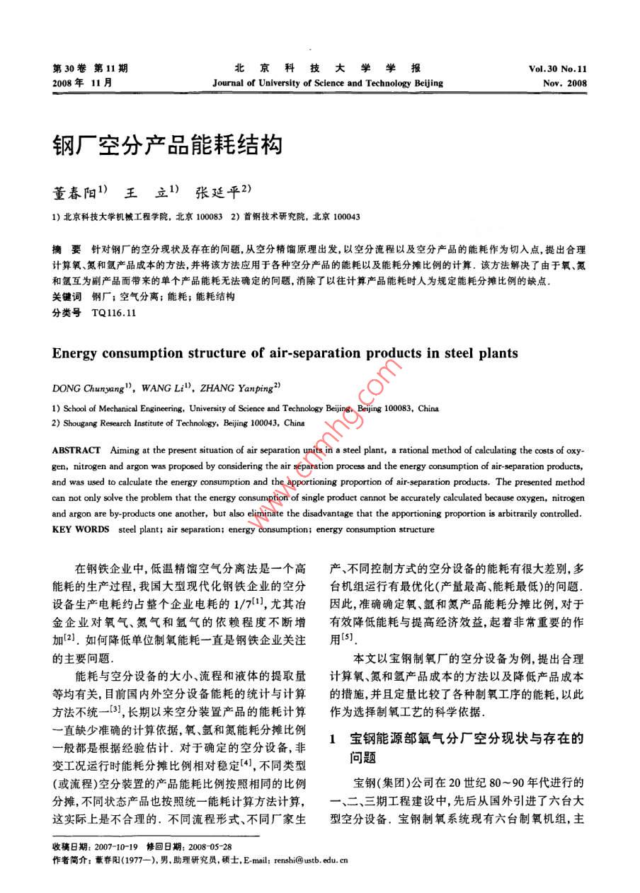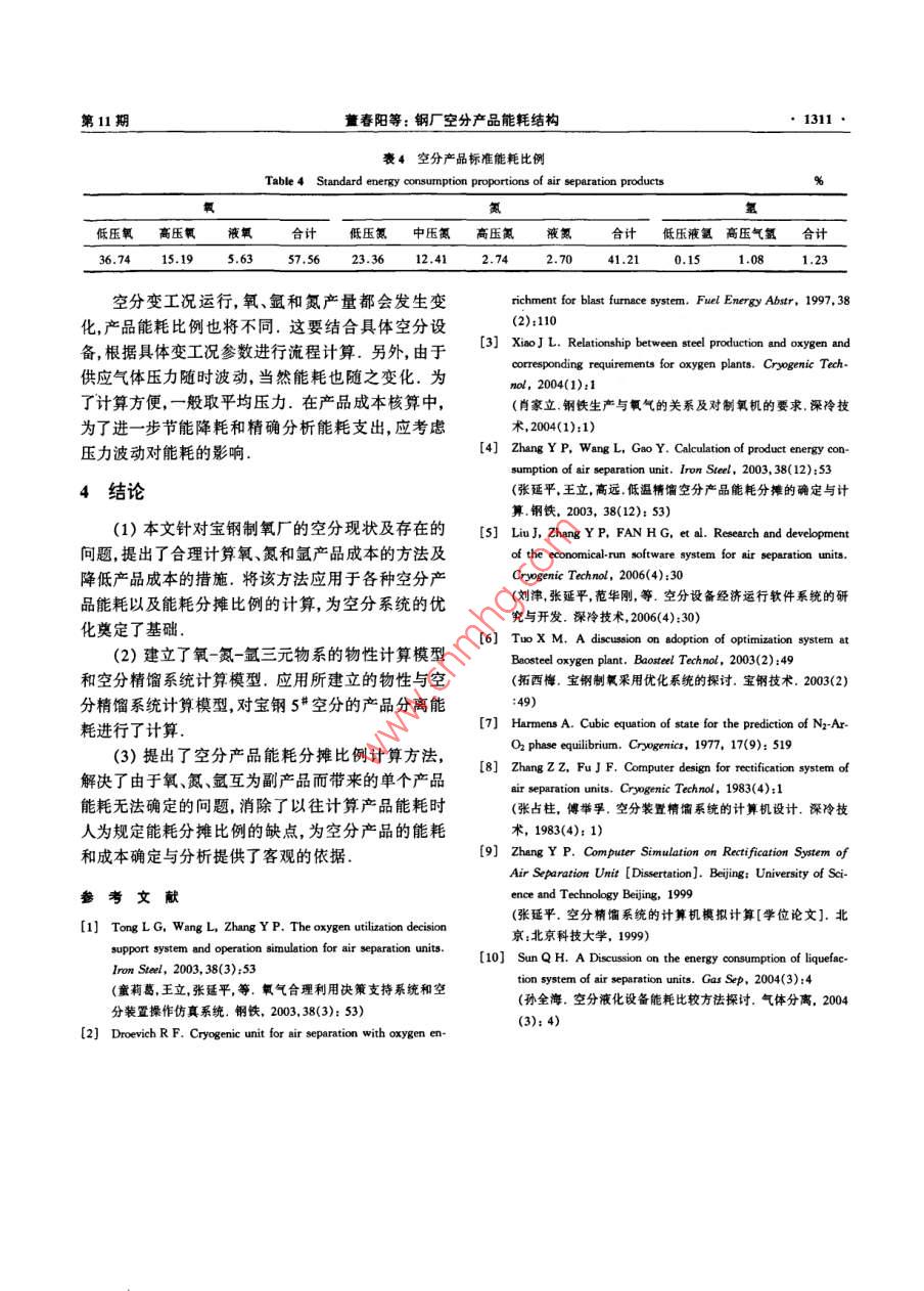 第30卷第11期北京科技大學學報vo.30No.112008年11月Journal of University of Science and Technology BeijingNov,2008鋼廠空分產(chǎn)品能耗結(jié)構(gòu)董春陽1)王立1)張延平2)1)北京科技大學機械工程學院,北京1000832)首鋼技術(shù)研究院,北京100043摘要針對鋼廠的空分現(xiàn)狀及存在的問題,從空分精餾原理出發(fā),以空分流程以及空分產(chǎn)品的能耗作為切入點,提出合理計算氧、氮和氬產(chǎn)品成本的方法,并將該方法應用于各種空分產(chǎn)品的能耗以及能耗分攤比例的計算.該方法解決了由于氧、氮和氬互為副產(chǎn)品而帶來的單個產(chǎn)品能耗無法確定的問題,消除了以往計算產(chǎn)品能耗時人為規(guī)定能耗分攤比例的缺點關(guān)鍵詞鋼廠;空氣分離;能耗;能耗結(jié)構(gòu)分類號TQ116.11Energy consumption structure of air-separation products in steel plaDONG Chunyang", WANG Li", ZHANG Yanping21)School of Mechanical Engineering, University of Science and Technology Beijing, Beijing 100083, China2)Shougang Research Institute of Technology, Beijing 100043, ChinaABSTRACT Aiming at the present situation of air separation units in a steel plant, a rational method of calculating the costs of oxy-gen, nitrogen and argon was proposed by considering the air separation process and the energy consumption of air-separation products,and was used to calculate the energy consumption and the apportioning proportion of air-separation products. The presented methodcan not only solve the problem that the energy consumption of single product cannot be accurately calculated because oxygen, nitrogenand argon are by-products one another, but also eliminate the disadvantage that the apportioning proportion is arbitrarily controlleKEY WORDS steel plant; air separation; energy consumption; energy consumption structure在鋼鐵企業(yè)中,低溫精餾空氣分離法是一個高產(chǎn)不同控制方式的空分設(shè)備的能耗有很大差別,多能耗的生產(chǎn)過程,我國大型現(xiàn)代化鋼鐵企業(yè)的空分臺機組運行有最優(yōu)化(產(chǎn)量最高能耗最低)的問題設(shè)備生產(chǎn)電耗約占整個企業(yè)電耗的1/71,尤其冶因此,準確確定氧氬和氮產(chǎn)品能耗分攤比例,對于金企業(yè)對氧氣、氮氣和氬氣的依賴程度不斷增有效降低能耗與提高經(jīng)濟效益,起著非常重要的作加2.如何降低單位制氧能耗一直是鋼鐵企業(yè)關(guān)注用S]的主要問題本文以寶鋼制氧廠的空分設(shè)備為例,提出合理能耗與空分設(shè)備的大小流程和液體的提取量計算氧、氮和氬產(chǎn)品成本的方法以及降低產(chǎn)品成本等均有關(guān),目前國內(nèi)外空分設(shè)備能耗的統(tǒng)計與計算的措施,并且定量比較了各種制氧工序的能耗,以此方法不統(tǒng)一3,長期以來空分裝置產(chǎn)品的能耗計算作為選擇制氧工藝的科學依據(jù)一直缺少準確的計算依據(jù),氧、氬和氮能耗分攤比例一般都是根據(jù)經(jīng)驗估計.對于確定的空分設(shè)備,非1寶鋼能源部氧氣分廠空分現(xiàn)狀與存在的變工況運行時能耗分攤比例相對穩(wěn)定4,不同類型問題(或流程)空分裝置的產(chǎn)品能耗比例按照相同的比例寶鋼(集團)公司在20世紀80~90年代進行的分攤,不同狀態(tài)產(chǎn)品也按照統(tǒng)一能耗計算方法計算三期工程建設(shè)中先后從國外引進了六臺大這實際上是不合理的.不同流程形式、不同廠家生型空分設(shè)備.寶鋼制氧系統(tǒng)現(xiàn)有六臺制氧機組,主收稿日期:2007-10-19修回日期:200805-28作者簡介1977-),男,助理研究員,碩士,Emal: tenshi@ustb, edu. en北京料技大學學報第30要生產(chǎn)氣體氧、氮和氬,同時機組生產(chǎn)液體氧、氮和值;4*~6#制氧機產(chǎn)品產(chǎn)量可調(diào),產(chǎn)品負荷可調(diào)范氬產(chǎn)品,其中,1#~3#制氧機的產(chǎn)品產(chǎn)量為恒定圍70%-105%6.主要技術(shù)參數(shù)見表1表1寶鋼空分設(shè)備技術(shù)參數(shù)表Table 1 Technical parameters of air separation units of Baoste氧氣產(chǎn)量/(m3h-1)26000260003000060000氮氣產(chǎn)量/(m3h-1)2600030000300008400064000液氧產(chǎn)量/(m3h1)6002000液氮產(chǎn)量/(m3h1)液氬產(chǎn)量/(m3h1)25氧純度/%>99.6>99,6>99.6>99,6氮純度/10-6<10氬純度/1O2+N2<10O2+N2<10O2+N2<-10O2<2,N2<5O2<2,N2<5O2<1,N2<1加工空氣量/(m3hb)50740145680氧提取率/%82,6氫提取率/%制氧電耗/(kWhm-3)0.4610.358壓氧電耗/(kWhm-3)0.1830.1830.175總電耗/(kWhm30.6440.5940.5330.584引進廠商日本神鋼日本神鋼日本神鋼美國APCI美國APCI德國林德簽約/投產(chǎn)年份1980/19841985/198798/19911994/19971996/1999通過寶鋼1#~6#空分設(shè)備的流程變化,反映a=∑∑xP;b=∑x1(2)了近年來大型空分的發(fā)展軌跡.大型空分實現(xiàn)了全低壓流程后,流程上的改進余地不大,主要集中在工其中混合物的臨界性質(zhì)由下列各式求解藝變化,中心是節(jié)能與安全.寶鋼從1#~6“空分機T=(TaT)2(1-K),z=(za+2)/2組,每前進一步都伴隨著能耗的下降,雖然寶鋼氧氣V=[(vci)(vci)3]/8, Pc=RTei zei/vei廠空分設(shè)備在國內(nèi)屬于領(lǐng)先水平,但也面臨著一些(3)問題.比如缺乏空分氣體產(chǎn)品產(chǎn)供能力的實時調(diào)式中,T為臨界溫度,Z。為臨界壓縮因子,V為臨度,造成氧放散率高;多國、多層次設(shè)備聯(lián)網(wǎng)運行匹界摩爾體積,P為臨界壓力K二元相互作用系配壓力等級能耗差異及消耗的問題;各種產(chǎn)品能數(shù),i為氧氮氬組分,K視為溫度的線性函數(shù):耗比例和液體產(chǎn)品外銷的成本確定缺乏依據(jù).降低Ki=ao+a