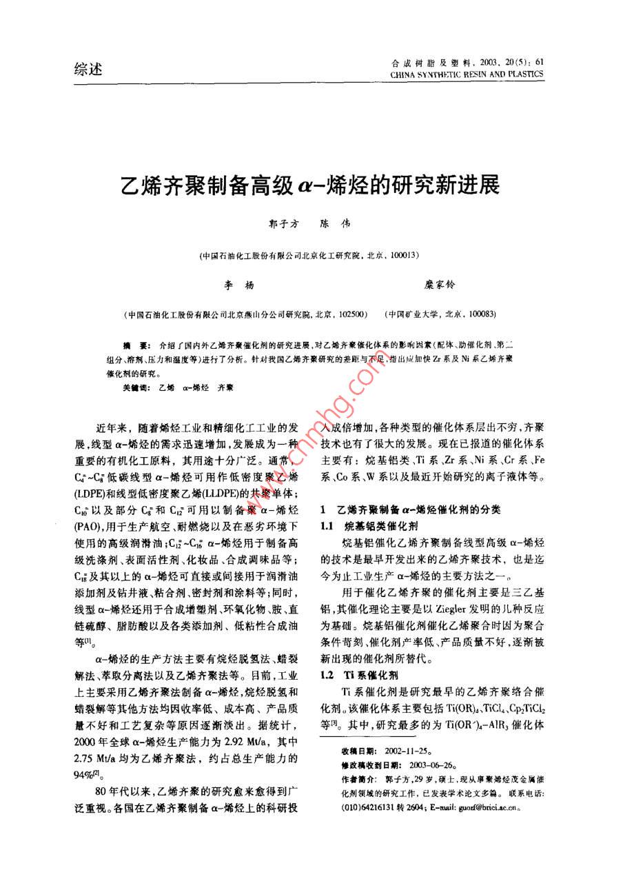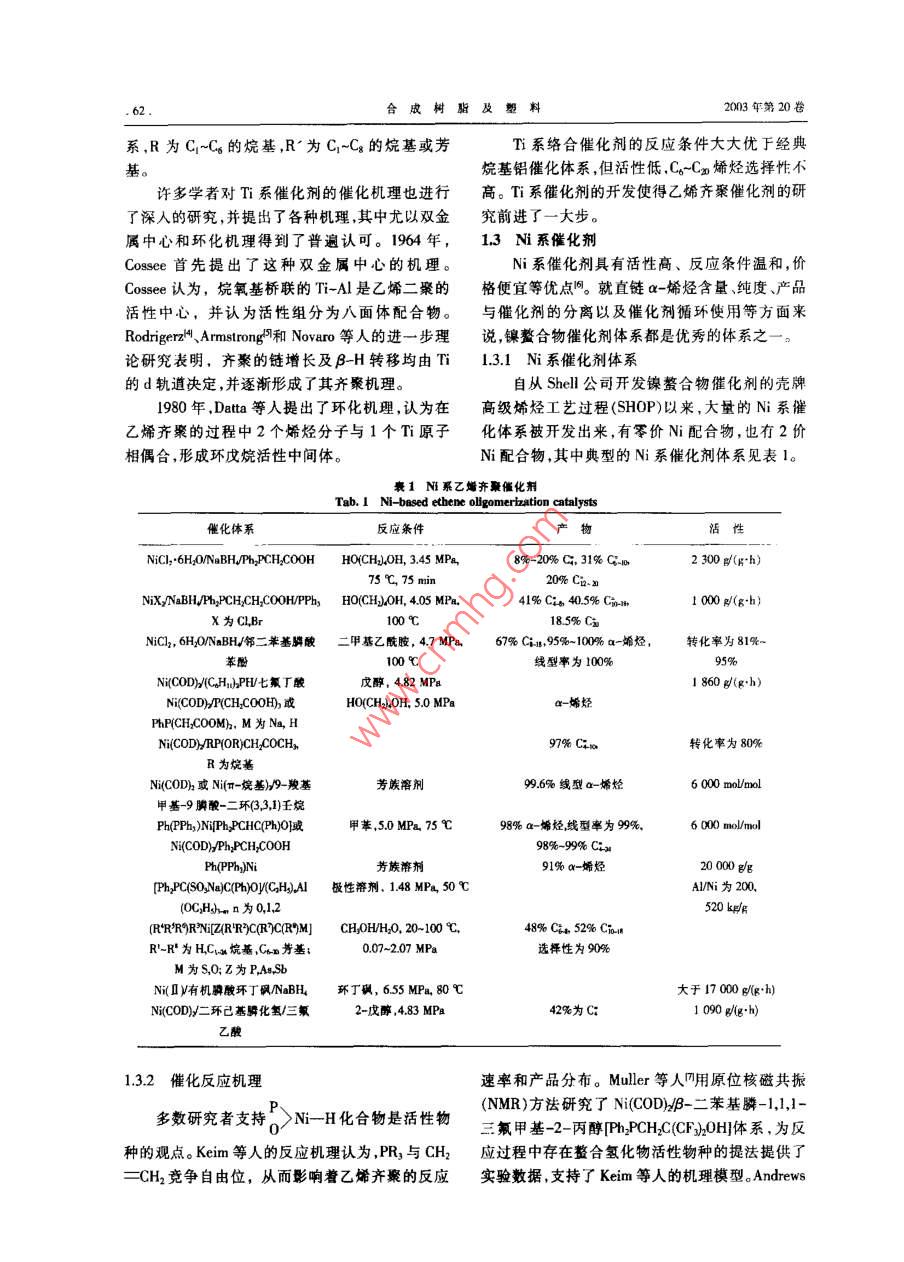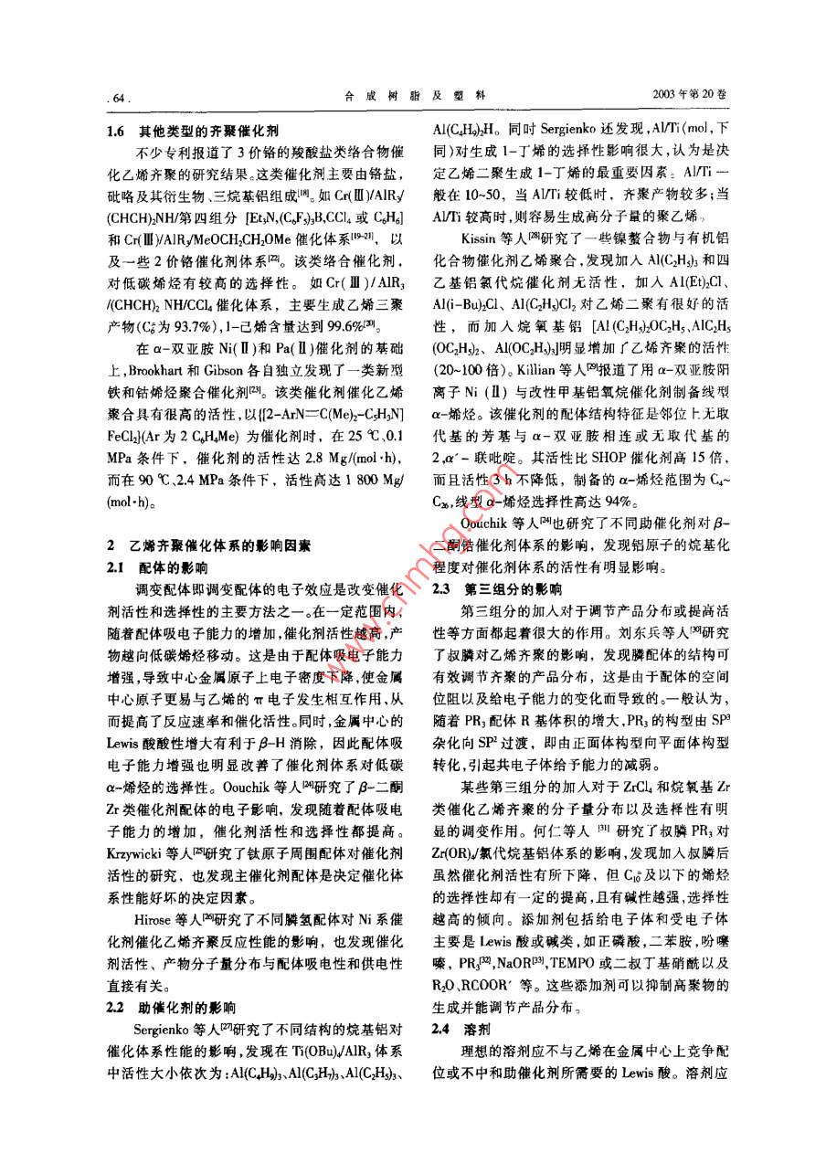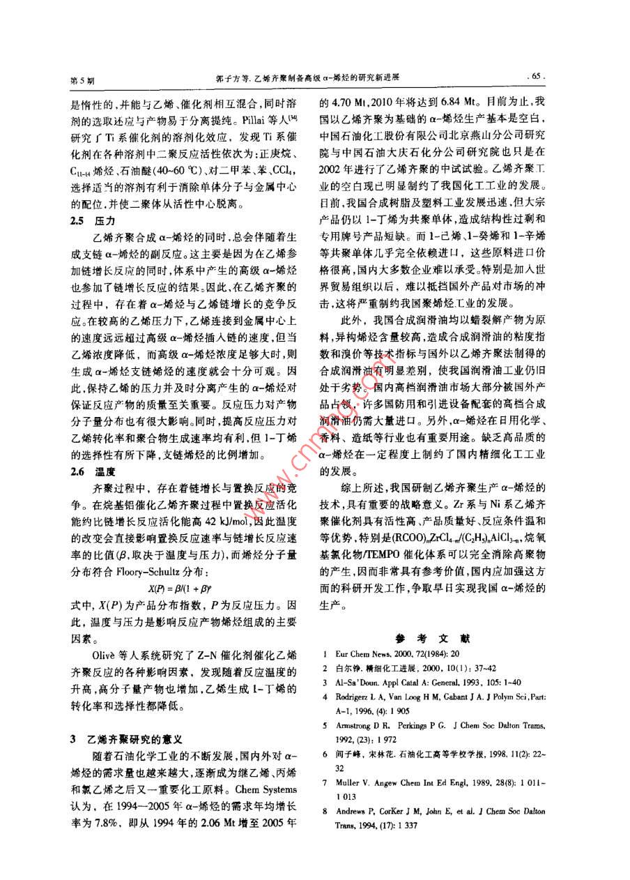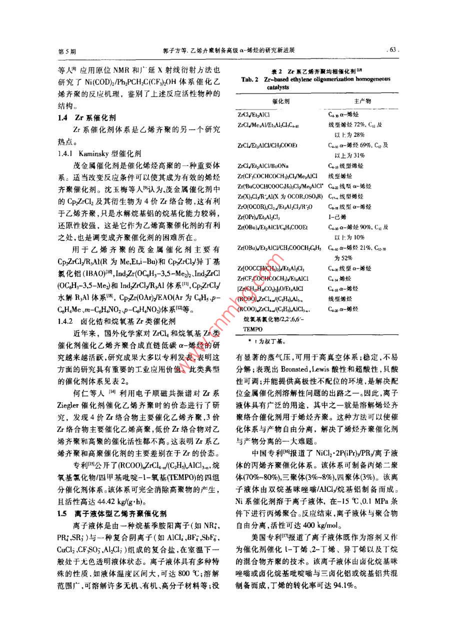 合成樹脂及塑料,2003.20(5): 61綜述CHINA SYNTH:TIC RESIN AND PLSTICS乙烯齊聚制備高級a-烯烴的研究新進(jìn)展郭子方陳偉(中國石油化工股份有限公司北京化工研究院,北京。10013)李楊糜家鈴(中國石油化I股份有限公司北京燕山分公司研究院.北京,102500)(中國礦業(yè)大學(xué),北京,10083)摘要:介紹了國內(nèi)外乙烯齊秦催化劑的研究進(jìn)展,對乙始齊粲催化體系的影響因素(配體助惱化劑第二組分、溶劑、壓力和溫度等)進(jìn)行了分析。針對我國乙烯齊豪研究的差距與不足,指出應(yīng)加快Zr系及Ni系乙烯齊聚催化刺的研究。關(guān)鍵詞:乙娣a-烯烴齊繁近年來,隨著烯烴I業(yè)和精細(xì)化工工業(yè)的發(fā)人成倍增加,各種類型的催化體系層出不窮,齊聚展,線型a-烯烴的需求迅速增加,發(fā)展成為一種技術(shù)也有了很大的發(fā)展?,F(xiàn)在已報道的催化體系重要的有機(jī)化工原料,其用途十分廣泛。通常,主要有:烷基鋁類.Ti系.Zr系、Ni系、Cr系、FeC°~C;低碳線型a-烯烴可用作低密度驟乙烯系、Co系、W系以及最近開始研究的離子液體等。(LDPE)和線型低密度聚乙烯(LDPE)的共聚單體;Ci以及部分Cg和C;可用以制備聚a-烯烴1乙烯齊聚制 備a-烯烴催化劑的分類(PAO),用于生產(chǎn)航空、耐燃燒以及在惡劣環(huán)境下1.1烷基鋁類 催化劑使用的高級潤滑油;Ci~C1i a-烯烴用于制備高烷基鋁催化乙烯齊聚制備線型高級ax-烯烴級洗滌劑、表面活性劑、化妝品、合成調(diào)味品等;的技術(shù)是最早開發(fā)出來的乙烯齊聚技術(shù),也是迄Cg及其以上的a-烯烴可直接或間接用于潤滑油今為止工業(yè)生產(chǎn)a-烯烴的主要方法之一。添加劑及鉆井液、粘合劑密封劑和涂料等;同時,用于催化乙烯齊聚的催化劑主要是三乙基線型a-烯烴還用于合成增塑劑、環(huán)氧化物、胺、直鋁,其催化理論主要是以Ziegler發(fā)明的兒種反應(yīng)鏈硫醇、脂肪酸以及各類添加劑、低粘性合成油為基礎(chǔ)。烷基鋁催化劑催化乙烯聚合時因為聚合等川。條件苛刻.催化劑產(chǎn)率低、產(chǎn)品質(zhì)量不好,逐漸被a-烯烴的生產(chǎn)方法主要有烷烴脫氫法、蠟裂新出現(xiàn)的催化劑所替代。解法、萃取分離法以及乙烯齊聚法等。目前,工業(yè)1.2 Ti 系催化劑上主要采用乙烯齊聚法制備ax ~烯烴,烷烴脫氫和Ti系催化劑是研究最早的乙烯齊聚絡(luò)合催蠟裂解等其他方法均因收率低、成本高、產(chǎn)品質(zhì)化劑。該催化體系主要包括Ti(OR)、TiClL、Cp2TiCl2量不好和工藝復(fù)雜等原因逐漸淡出。據(jù)統(tǒng)計,等同。 其中,研究最多的為Ti(OR)-AIR,催化體2000年全球a-烯烴生產(chǎn)能力為2.92 M/a,其中收稿日期: 2002-11-25。2.75 Mt/a均為乙烯齊聚法,約占總生產(chǎn)能力的修改稿收到日期: 2003-06-26。94%2l。作者簡介:郭子方,29歲,碩士,現(xiàn)從事聚烯烴茂金屬催80年代以來,乙烯齊聚的研究愈來愈得到廣化劑領(lǐng)城的研究工作,已發(fā)表學(xué)術(shù)論文多篇。聯(lián)系電話:泛重視。各國在乙烯齊聚制備a-烯烴上的科研投(010)64216131轉(zhuǎn)2604; E-mail: guor@bricisc.cno第S期郭子方等.乙烯齊察制備高級a-烯烴的研究新進(jìn)展.63.等人陶應(yīng)用原位NMR和延X射線衍射方法也表2 Zr 系乙嫣卉聚均相催化劑叫研究了Ni(COD)/Ph,PCH2C(CF)20H體系催化乙Tab.2 Zr-based ethylene oligomerization homogeneouscatalysts烯齊聚的反應(yīng)機(jī)理,鑒別了上述反應(yīng)活性物種的催化劑主產(chǎn)物結(jié)構(gòu).1.4 Zr 系催化劑Z(I/EAIClCom a-烯烴Zr系催化劑體系是匕烯齊聚的另一個研究ZrCL/Me.AlEtMlLCIlCum線璽烯烴72%, Cn及以上.為28%熱點。ZrCIJEILAICICHLC0OELCama-烯烴69%, Co及1.4.1 Kaminsky 型催化劑以上為31%茂金屬催化劑是催化烯烴高聚的--種重要體ZrCI/EIlAICIBuONaCom線型烯烴系。適當(dāng)改變反應(yīng)條件可以使其成為有效的烯烴Zr(CF,COCHCOCH)Cl/MeAICl線型婚烴齊聚催化劑。沈玉梅等人認(rèn)為,茂金屬催化劑中Zr(BuCOCHC0OC;H)C]MnpAICr C4a 線型ax-嫦烴的CpzZrCl2及其衍生物為4價Zr絡(luò)合物,這有利Z(X)CIl/R*AI(X 為0COR,OSO,R) Cr 線型烯烴Zr0(OC0R),Cl2 /EgAL.CI/R20Can線型a-烯烴于乙烯齊聚,只是水解烷基鋁的烷基化能力較弱,Zr(0P/)EsyALCL,1-已烯還原性較強(qiáng),這是它作為乙烯高聚催化劑的有利Zr(OBu)VEbAICVCH,COOEtCuma-孀烴90%, Ca及之處,也是調(diào)變成齊聚催化劑的困難所在。以上為10%用于乙烯齊聚的茂金屬催化劑主要有Z(0BU,ELAICICH,COOCH.CHs Cuo a-嫌烴21%, CaoCp2ZrCl/RjAI(IR為Me,Et,i-Bu)和Cp:ZrC12/異丁基為52%Z(0CH(H)J/EsAlLCl,Cum線型a-烯烴氯化鋁(IBA0)I,IndzZr(OCH, -3,5-Mex)2JIndZrClZ(CF2COCHCOCH)VEInAIClCou烯烴(OCH-3,5- Me)和IndZrClyRyAl體系叫, Cp:ZrCl2/([HCH{4cz0A)Lp/EILAICICroa-媚烴水解RzAl體系|調(diào),CpZr(OAr)/EAO(Ar為CHsp-(RCOO),2zCLNCHhM.線型烯烴CH,Me .m-CJHNO2sp-CjHNO2)體系凹等。(RCOO),ZrCl J(CH)ALC)...Caoa-唏烴.1.4.2鹵化鋯和烷氧基Zr類催化劑烷氧基氧化物216.6-近年來,國外化學(xué)家對ZrCl4和烷氧基Zr類TEMPO催化劑催化乙烯齊聚合成直鏈低碳a-烯烴的研* t為權(quán)丁基。兗越來越活躍,研究成果大多以專利發(fā)表,表明這有顯著的蒸氣壓,可用于高真空體系;穩(wěn)定,不易.方面的研究具有重要的工業(yè)應(yīng)用價值。此類典型分解;表現(xiàn)出Bronsted ,Lewis酸性和超酸性,且酸的催化劑體系見表2。性可調(diào);并能提供高極性不配位的環(huán)境,是解央配何仁等人網(wǎng)利用電子順磁共振譜對Zr系位金屬催化劑溶解