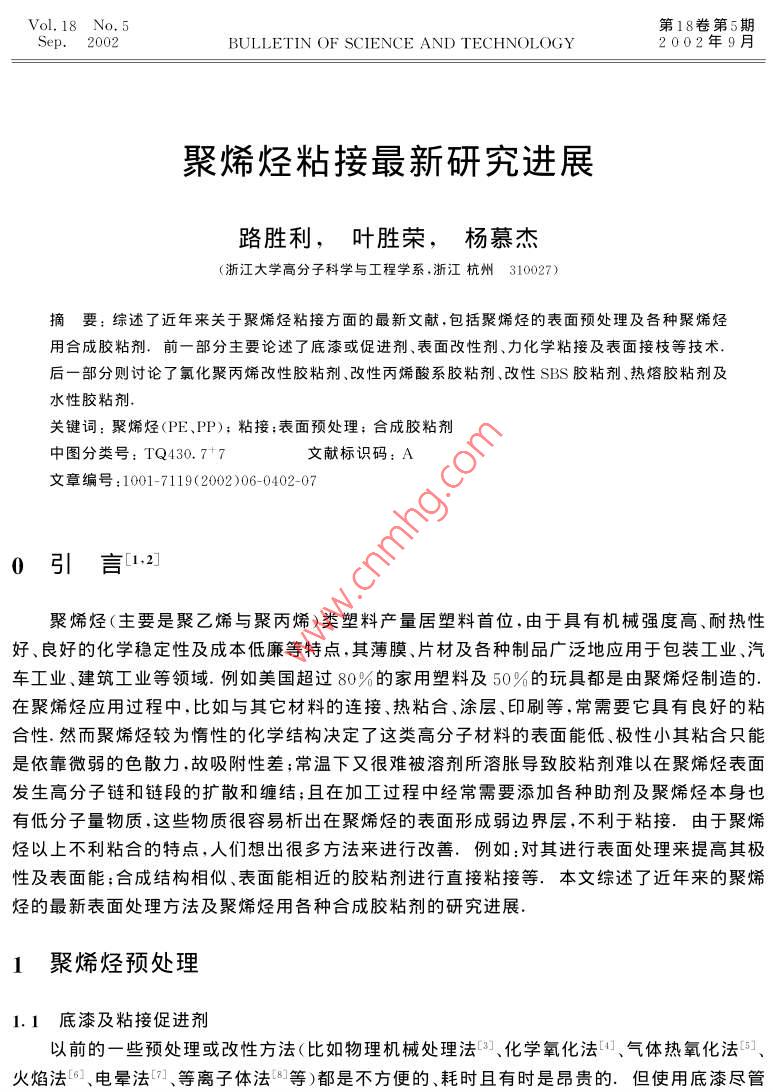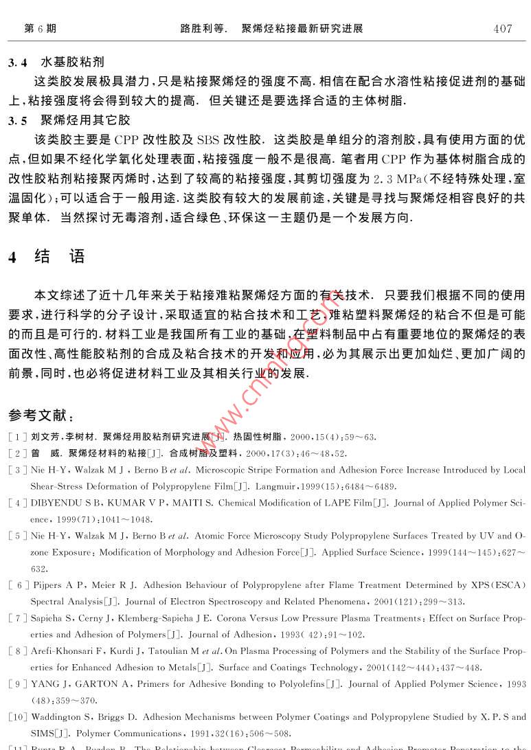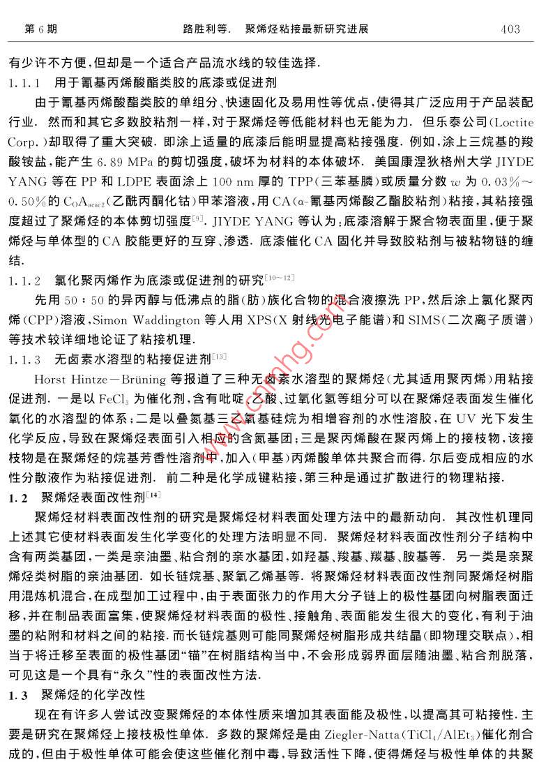Vol.18 No.5第18卷第5期Sep.2002BULLETIN OF SCIENCE AND TECHNOLOGY2002年9月聚烯烴粘接最新研究進(jìn)展路勝利,葉勝榮,楊慕杰(浙江大學(xué)高分子科學(xué)與工程學(xué)系,浙江杭州310027)摘要:綜述了近年來關(guān)于聚烯烴粘接方面的最新文獻(xiàn),包括聚烯烴的表面預(yù)處理及各種聚烯烴用合成膠粘劑.前一 部分主要論述了底漆或促進(jìn)劑、表面改性劑、力化學(xué)粘接及表面接枝等技術(shù).后-部分則討論了氯化聚丙烯改性膠粘劑、改性丙烯酸系膠粘劑.改性SBS膠粘劑.熱熔膠粘劑及水性膠粘劑.關(guān)鍵詞:聚烯烴(PE、PP);粘接;表面預(yù)處理;合成膠粘劑.中圖分類號: TQ430. 7+7文獻(xiàn)標(biāo)識碼: A文章編號:1001-7119(2002 )06- 0402-070引言1.2]聚烯烴(主要是聚乙烯與聚丙烯)類塑料產(chǎn)量居塑料首位,由于具有機(jī)械強度高、耐熱性好、良好的化學(xué)穩(wěn)定性及成本低廉等特點,其薄膜、片材及各種制品廣泛地應(yīng)用于包裝工業(yè)、汽車工業(yè)、建筑工業(yè)等領(lǐng)域.例如美國超過80%的家用塑料及50%的玩具都是由聚烯烴制造的.在聚烯烴應(yīng)用過程中,比如與其它材料的連接、熱粘合、涂層、印刷等,常需要它具有良好的粘合性.然而聚烯烴較為惰性的化學(xué)結(jié)構(gòu)決定了這類高分子材料的表面能低、極性小其粘合只能是依靠微弱的色散力,故吸附性差;常溫下又很難被溶劑所溶脹導(dǎo)致膠粘劑難以在聚烯烴表面發(fā)生高分子鏈和鏈段的擴(kuò)散和纏結(jié);且在加工過程中經(jīng)常需要添加各種助劑及聚烯烴本身也有低分子量物質(zhì),這些物質(zhì)很容易析出在聚烯烴的表面形成弱邊界層,不利于粘接、由于聚烯烴以上不利粘合的特點,人們想出很多方法來進(jìn)行改善.例如:對其進(jìn)行表面處理來提高其極性及表面能;合成結(jié)構(gòu)相似、表面能相近的膠粘劑進(jìn)行直接粘接等、本文綜述了近年來的聚烯烴的最新表面處理方法及聚烯烴用各種合成膠粘劑的研究進(jìn)展.1聚 烯烴預(yù)處理1.1底漆及粘接促進(jìn)劑以前的-些預(yù)處理或改性方法(比如物理機(jī)械處理法[3]、化學(xué)氧化法[4]、氣體熱氧化法[5]、火焰法[6]、電暈法[7]、 等離子體法[8]等)都是不方便的、耗時且有時是昂貴的.但使用底漆盡管收稿日期:2001-09-18;修訂 日期:2001-12-20作者簡介:路勝利,男,1976年生,山東濟(jì)寧人,博士.第6期路勝利等.聚烯烴粘接最新研究進(jìn)展403有少許不方便,但卻是-個適合產(chǎn)品流水線的較佳選擇.1.1.1用于氰基丙烯酸酯類膠的底漆或促進(jìn)劑由于氰基丙烯酸酯類膠的單組分、快速固化及易用性等優(yōu)點,使得其廣泛應(yīng)用于產(chǎn)品裝配.行業(yè)、然而和其它多數(shù)膠粘劑一樣,對于聚烯烴等低能材料也無能為力.但樂泰公司(LoctiteCorp.)卻取得了重大突破.即涂上適量的底漆后能明顯提高粘接強度.例如,涂.上三烷基的羧酸銨鹽,能產(chǎn)生6.89MPa的剪切強度,破壞為材料的本體破壞.美國康涅狄格州大學(xué)JIYDEYANG等在PP和LDPE表面涂上100nm厚的TPP(三苯基膦)或質(zhì)量分?jǐn)?shù)w為0.03%~0.50%的CoAcer(乙酰丙酮化鈷)甲苯溶液,用CA(a-氰基丙烯酸乙酯膠粘劑)粘接,其粘接強度超過了聚烯烴的本體剪切強度[9]. JIYDE YANG等認(rèn)為:底漆溶解于聚合物表面里,便于聚烯烴與單體型的CA膠能更好的互穿、滲透.底漆催化CA固化并導(dǎo)致膠粘劑與被粘物鏈的纏結(jié).1.1.2氯化聚丙烯作為底漆或促進(jìn)劑的研究[10~12]先用50: 50的異丙醇與低沸點的脂(肪)族化合物的混合液擦洗PP,然后涂上氯化聚丙烯(CPP)溶液,Simon Waddington等人用XPS(X射線光電子能譜)和SIMS(二次離子質(zhì)譜)等技術(shù)較詳細(xì)地論證了粘接機(jī)理.1.1.3無鹵素水溶型的粘接促進(jìn)劑[13]Horst Hintze - Brining等報道了三種無鹵素水溶型的聚烯烴(尤其適用聚丙烯)用粘接促進(jìn)劑.-是以FeCls為催化劑,含有吡啶、乙酸、過氧化氫等組分可以在聚烯烴表面發(fā)生催化氧化的水溶型的體系;二是以疊氮基三乙氧基硅烷為相增容劑的水性溶膠,在UV光下發(fā)生化學(xué)反應(yīng),導(dǎo)致在聚烯烴表面引入相應(yīng)的含氮基團(tuán);三是聚丙烯酸在聚丙烯上的接枝物,該接枝物是在聚烯烴的烷基芳香性溶劑中,加入(甲基)丙烯酸單體共聚合而得.爾后變成相應(yīng)的水性分散液作為粘接促進(jìn)劑、前二種是化學(xué)成鍵粘接,第三種是通過擴(kuò)散進(jìn)行的物理粘接.1.2聚烯烴表面改性劑C4]聚烯烴材料表面改性劑的研究是聚烯烴材料表面處理方法中的最新動向,其改性機(jī)理同上述其它使材料表面發(fā)生化學(xué)變化的處理方法明顯不同.聚烯烴材料表面改性劑分子結(jié)構(gòu)中含有兩類基團(tuán),一類是親油墨、粘合劑的親水基團(tuán),如羥基、羧基、羰基、胺基等.另一類是親聚烯烴類樹脂的親油基團(tuán).如長鏈烷基、聚氧乙烯基等.將聚烯烴材料表面改性劑同聚烯烴樹脂用混煉機(jī)混合,在成型加工過程中,由于表面張力的作用大分子鏈上的極性基團(tuán)向樹脂表面遷移.并在制品表面富集,使聚烯烴材料表面的極性、接觸角、表面能發(fā)生很大的變化,有利于油墨的粘附和材料之間的粘接.而長鏈烷基則可能同聚烯烴樹脂形成共結(jié)晶(即物理交聯(lián)點),相當(dāng)于將遷移至表面的極性基團(tuán)“錨”在樹脂結(jié)構(gòu)當(d