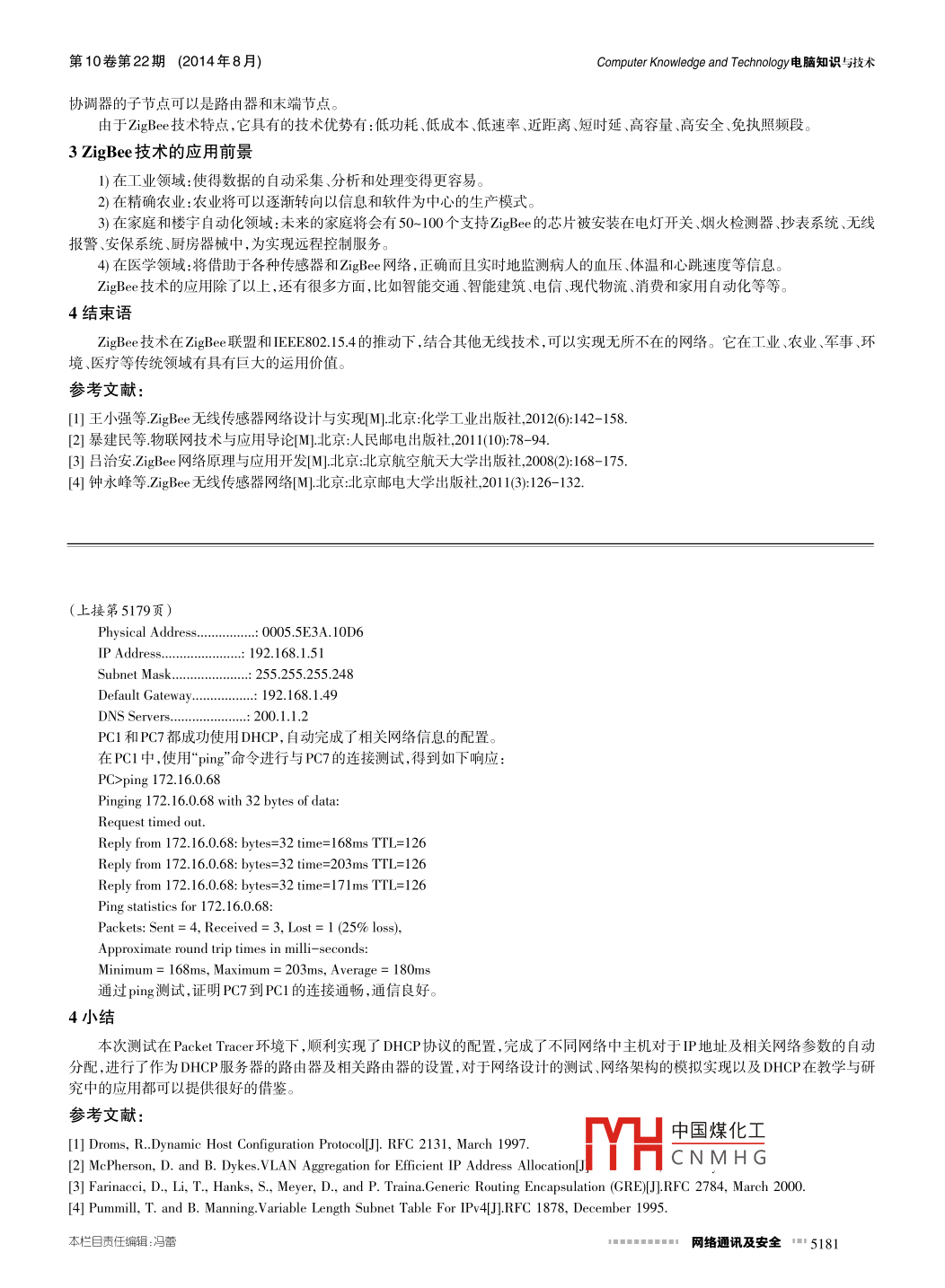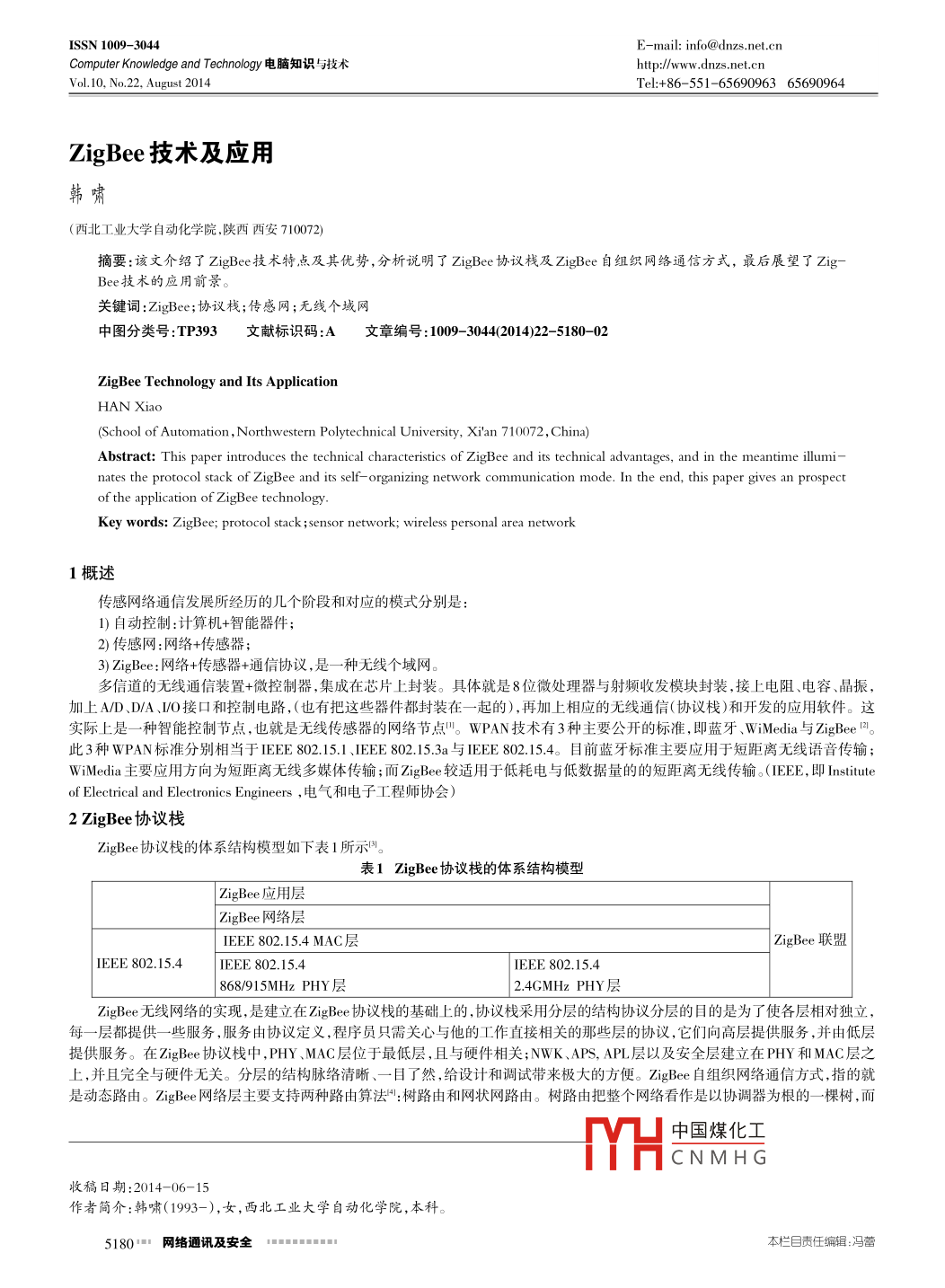 SN1009-304E-mail: info@@dnzs net cnComputer Knowledge and Technology電腦知識與技術(shù)http://www.dnzs.net.cnVol 10. No 22. August 2014Tel:+86-551-6569096365690964Zig Bee技術(shù)及應(yīng)用韓嘯(西北工業(yè)大學(xué)自動化學(xué)院,陜西西安710072)摘要:該文介紹了 Zigbee技術(shù)特點及其優(yōu)勢,分析說明了 ZigBee協(xié)議棧及 ZigBee自組織網(wǎng)絡(luò)通信方式,最后展望了zigBee技術(shù)的應(yīng)用前景關(guān)鍵詞: ZigBee;協(xié)議棧;傳感網(wǎng);無線個域網(wǎng)中圖分類號:TP393文獻標識碼:A文章編號:100930442014)22-5180-02ZigBee Technology and Its ApplicationHAN XIao(School of Automation, Northwestern Polytechnical University, Xi'an 710072, China)Abstract: This paper introduces the technical characteristics of ZigBee and its technical advantages, and in the meantime illuminates the protocol stack of ZigBee and its self-organizing network communication mode. In the end, this paper gives an prospectKey words: ZigBee; protocol stack; sensor network; wireless personal area network1概述傳感網(wǎng)絡(luò)通信發(fā)展所經(jīng)歷的幾個階段和對應(yīng)的模式分別是:1)自動控制:計算機+智能器件;2)傳感網(wǎng):網(wǎng)絡(luò)+傳感器3) Zigbee:網(wǎng)絡(luò)+傳感器+通信協(xié)議,是一種無線個域網(wǎng)。多信道的無線通信裝置+微控制器,集成在芯片上封裝。具體就是8位微處理器與射頻收發(fā)模塊封裝,接上電阻、電容、晶振,加上A/D、DA、VO接口和控制電路,(也有把這些器件都封裝在一起的),再加上相應(yīng)的無線通信(協(xié)議棧)和開發(fā)的應(yīng)用軟件。這際上是一種智能控制節(jié)點,也就是無線傳感器的網(wǎng)絡(luò)節(jié)點"。WPAN技術(shù)有3種主要公開的標準,即藍牙、 WiMedia與 ZigBee l此3種wPAN標準分別相當(dāng)于IEEE802.151、IEEE802.153a與IEE802.154。目前藍牙標準主要應(yīng)用于短距離無線語音傳輸;WiMedia主要應(yīng)用方向為短距離無線多媒體傳輸;而 ZigBee較適用于低耗電與低數(shù)據(jù)量的的短距離無線傳輸。(IEEE,即 Instituteof electrical and electronics engineers,電氣和電子工程師協(xié)會)2 Zigbee協(xié)議棧Zigbee協(xié)議棧的體系結(jié)構(gòu)模型如下表1所示。表1 ZigBee協(xié)議棧的體系結(jié)構(gòu)模型Zigbee應(yīng)用層Zigbee網(wǎng)絡(luò)層802154MAC層zie聯(lián)盟IEEE80215.4802.154IEEE802.15.4868/915 MHZ PHY層24 GMHz PHY層Zigbee無線網(wǎng)絡(luò)的實現(xiàn),是建立在 Zigbee協(xié)議棧的基礎(chǔ)上的,協(xié)議棧采用分層的結(jié)構(gòu)協(xié)議分層的目的是為了使各層相對獨立,每一層都提供一些服務(wù),服務(wù)由協(xié)議定義,程序員只需關(guān)心與他的工作直接相關(guān)的那些層的協(xié)議,它們向高層提供服務(wù),并由低層提供服務(wù)。在 Zigbee協(xié)議棧中,PHY、MAC層位于最低層,且與硬件相關(guān);NWK、APS,APL層以及安全層建立在PHY和MAC層之上,并且完全與硬件無關(guān)。分層的結(jié)構(gòu)脈絡(luò)清晰、一目了然,給設(shè)計和調(diào)試帶來極大的方便。 Zigbee自組織網(wǎng)絡(luò)通信方式,指的就是動態(tài)路由。 Zigbee網(wǎng)絡(luò)層主要支持兩種路由算法":樹路由和網(wǎng)狀網(wǎng)路由。樹路由把整個網(wǎng)絡(luò)看作是以協(xié)調(diào)器為根的一棵樹,而H中國煤化工CNMHG稿日期:2014-06-15作者簡介:韓嘯(1993-),女,西北工業(yè)大學(xué)自動化學(xué)院,本5180網(wǎng)絡(luò)通訊及安全1m第10卷第22期(2014年8月)Computer Knowledge and Technology電腦知識技術(shù)協(xié)調(diào)器的子節(jié)點可以是路由器和末端節(jié)點。由于 Zigbee z技術(shù)特點,它具有的技術(shù)優(yōu)勢有:低功耗、低成本、低速率、近距離、短時延、高容量、高安全、免執(zhí)照頻段3 Zigbee技術(shù)的應(yīng)用前景1)在工業(yè)領(lǐng)域:使得數(shù)據(jù)的自動采集、分析和處理變得更容易。2)在精確農(nóng)業(yè):農(nóng)業(yè)將可以逐漸轉(zhuǎn)向以信息和軟件為中心的生產(chǎn)模式。3)在家庭和樓宇自動化領(lǐng)域:未來的家庭將會有50-100個支持 Zigbee的芯片被安裝在電燈開關(guān)、煙火檢測器、抄表系統(tǒng)、無線報警、安保系統(tǒng)、廚房器械中,為實現(xiàn)遠程控制服務(wù)。4在醫(yī)學(xué)領(lǐng)域:將借助于各種傳感器和 Zigbee網(wǎng)絡(luò),正確而且實時地監(jiān)測病人的血壓體溫和心跳速度等信息。Zigbee技術(shù)的應(yīng)用除了以上,還有很多方面,比如智能交通、智能建筑、電信、現(xiàn)代物流、消費和家用自動化等等4結(jié)束語ZigBee技術(shù)在 ZigBee聯(lián)盟和IEE802.154的推動下,結(jié)合其他無線技術(shù),可以實現(xiàn)無所不在的網(wǎng)絡(luò)。它在工業(yè)、農(nóng)業(yè)、軍事、環(huán)境、醫(yī)療等傳統(tǒng)領(lǐng)域有具有巨大的運用價值。參考文獻王小強等 Zigbe無線傳感器網(wǎng)絡(luò)設(shè)計與實現(xiàn)M]北京:化學(xué)工業(yè)出版社,2012(6:142-1582]暴建民等物聯(lián)網(wǎng)技術(shù)與應(yīng)用導(dǎo)論[M]北京:人民郵電出版社,2011(10:78-943]呂治安, ZigBee l網(wǎng)絡(luò)原理與應(yīng)用開發(fā)[M]北京:北京航空航天大學(xué)出版社,2008(2:168-1754]鐘永峰等 ZigBe無線傳感器網(wǎng)絡(luò)[M北京:北京郵電大學(xué)出版社2011(3:126-132(上接第5179頁)Physical Address0005.5E3A.10D6IP Address192.168.1.51Subnet mask255.255255.248Default gateway192.168.1.49DNS ServersPC1和PC7都成
