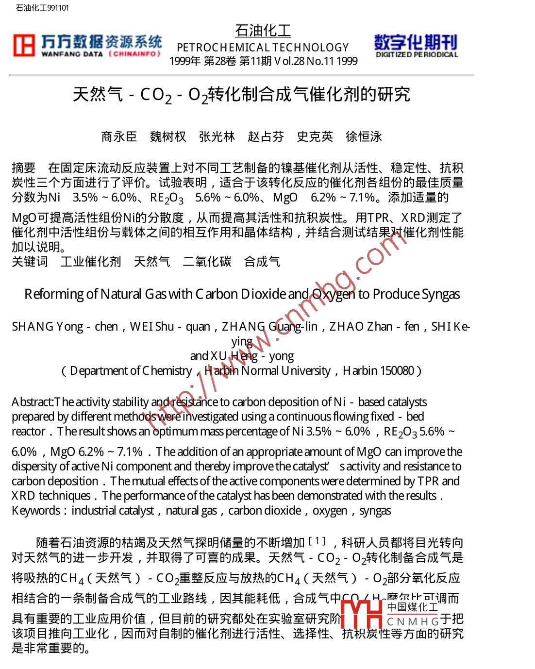 天然氣-CO2-O2轉(zhuǎn)化制合成氣催化劑的研究