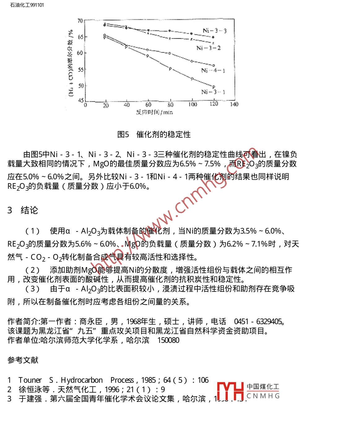 石油化工991101舊萬數(shù)據(jù)資源系統(tǒng)石油化工PETROCHEMICAL TECHNOLOGY數(shù)穿化期刊WANFANG DAT▲( CHINAINEI1999年第28卷第11期Vol.28No.111999DIGITIZED PERIODICAL天然氣-CO2-02轉(zhuǎn)化制合成氣催化劑的研究商永臣魏樹權(quán)張光林趙占芬史克英徐恒泳摘要在固定床流動反應(yīng)裝置上對不同工藝制備的鎳基催化劑從活性、穩(wěn)定性、抗積炭性三個方面進行了評價。試驗表明,適合于該轉(zhuǎn)化反應(yīng)的催化劑各組份的最佳質(zhì)量分?jǐn)?shù)為N3.5%-60%、RE2O356%60%、Mg62%-7.1%。添加適量的Mgo可提高活性組份Ni的分散度,從而提高其活性和抗積炭性。用TPR、ⅩRD測定了催化劑中活性組份與載體之間的相互作用和晶體結(jié)構(gòu),并結(jié)合測試結(jié)果對催化劑性能加以說明。關(guān)鍵詞工業(yè)催化劑天然氣二氧化碳合成氣Reforming of Natural Gas with C arbon Dioxide and Oxygen to Produce SyngasSHANG Yong-chen, WEI Shu-quan, ZHANG Guang-lin, ZHAO Zhan-fen, SHI Keyingand XU Heng- yongDepartment of Chemistry, H arbin Normal University, Harbin 150080)Abstract: T he activity stability and resistance to carbon deposition of Ni-based catalystsprepared by different methods were investigated using a continuous flowing fixed-bedreactor. The result shows an optimum mass percentage of Ni 3.5%-6.0%, RE203 5.6%6.0%, Mgo 6.2%-7.1%. The addition of an appropriate amount of Mgo can improve thedispersity of active Ni component and thereby improve the catalyst activity and resistance tocarbon deposition. the mutual effects of the active components were determined by tpr andXRD techniques. the performance of the catalyst has been demonstrated with the resultsKeywords: industrial catalyst, natural gas, carbon dioxide, oxygen, syngas隨著石油資源的枯竭及夭然氣探明儲量的不斷增加[1],科研人員都將目光轉(zhuǎn)向?qū)μ烊粴獾倪M一步開發(fā),并取得了可喜的成果。天然氣-CO2-O2轉(zhuǎn)化制備合成氣是將吸熱的CH4(天然氣)-CO2重整反應(yīng)與放熱的CH4(天然氣)-O2部分氧化反應(yīng)相結(jié)合的一條制備合成氣的工業(yè)路線,因其能耗低,合成氣中屮歷爾比可調(diào)而中國煤化工具有重要的工業(yè)應(yīng)用價值,但目前的研究都處在實驗室研究階CNMHG于把該項目推向工業(yè)化,因而對自制的催化劑進行活性、選擇性、抗枳炭性等方面的研究是非常重要的。fle∥/Eyqk/ shg/shg9 B/shg9911/1101hm(第1/7頁)201032382018石油化工9911011試驗部分1.1催化劑的制備以江蘇宜興耐火材料廠生產(chǎn)的車輪狀a-A2O3為載體,工業(yè)級N(NO3)2為活性組份,工業(yè)級的RE(NO3)3(RE指稀土元素)和Mg(NO3)2為助劑,采用浸漬法制備工業(yè)性試驗使用的催化劑。其系列催化劑的組成見表1。1.2試驗及分析方法在常壓固定床雙套管石英反應(yīng)器中,裝入300mg催化劑(催化劑評價前粉碎至1830目,下同),700℃還原30min,然后引入摩爾比為天然氣/CO2/O2=1114/0.3的原料氣在750°℃C進行反應(yīng),尾氣經(jīng)冷凝除水后,用103氣相色譜儀分析尾氣中各組份的摩爾分?jǐn)?shù),以(CO+H2)的摩爾分?jǐn)?shù)表征催化劑活性。色譜柱采用TDX-01(1m)與 Paxpak-QS(6m)作固定相。表1催化劑的組成質(zhì)量分?jǐn)?shù)/%催化劑Ni Mgo RE20Ni-1-13497.76567Ni-1-23.54747567Ni-1-33.517.11567N-1-43.57650567Ni-1-53636.30567Ni-2-1542246547N-2-2584255547Ni-2-36.162.445.47Ni-2-4629248547N-2-56452.36547Ni-3-1440663672Ni-3-2434744590Ni-3-34.486.544.89Ni-4-16036704.59N-4-2545523567中國煤化工N-4-35480640CNMHGfle∥/Eyqk/ shg/shg9 B/shg9911/1101hm(第2/7頁)201032382018石油化工99110113Mgo含量對催化劑抗積炭性能的影響積炭反應(yīng)采用的反應(yīng)器見文獻[2],催化劑裝量1。首先在氫氣流下升溫至750°C,恒溫還原3min,原料氣n(CH4)/n(CO2)=1/14,連續(xù)反應(yīng)h后控制在一定溫度下通入氧氣進行燒炭,以燒炭時升高的溫度來表征催化劑的積炭量。14催化劑的程序升溫還原稱取100mg催化劑在Ar氣吹掃下升溫至500℃進行預(yù)脫附,然后降至室溫。H2-Ar混合氣(H2的體積分?jǐn)?shù)為540%)程序升溫至920°C,流量30m/min,升溫速率145°C/min1.5催化劑的表征采用原子吸收分光光度計檢測催化劑中金屬組份的含量。其中稀土金屬含量用重量法分析。晶相和晶相變化用丹東射線儀公司生產(chǎn)的Y-4Q全自動X射線衍射儀測定,使用條件為CuKa射線、電壓40kV、電流25mA2結(jié)果與討論2.1鎳負載量對催化劑活性的影響由圖1(Nⅰ-2系列催化劑)可見,隨著Nⅰ負載量的增大,催化劑的活性逐漸升高,這是由于活性中心數(shù)目逐漸增多;當(dāng)N的質(zhì)量分?jǐn)?shù)≥6.16%后,催化劑活性升勢平緩,但反應(yīng)后的催化劑積炭,說明在RE2O3的質(zhì)量分?jǐn)?shù)為547%、MgO的質(zhì)量分?jǐn)?shù)為25%時鎳負載量應(yīng)低于6.16%。e68678+665.2565860626466N的質(zhì)量分?jǐn)?shù)/%圖1鎳負載量對催化劑活性的影響22MgO對催化劑活性及抗積炭性的影響堿士金屬氧化物MgO的添加,可以調(diào)變催化劑的酸堿性,v凵中國煤化工劑的抗積炭性,Mgo質(zhì)量分?jǐn)?shù)不同的催化劑的催化性能評價結(jié)果如CNMHG由圖2可見,隨MgO含量的增加,催化劑的活性(Ni-1-2除外)逐漸升高,Mg的質(zhì)量分?jǐn)?shù)大于6.2%為宜。由圖3可知,Nio主還原峰向高溫方向移動,使活性金屬氧fle∥/Eyqk/ shg/shg9 B/shg9911/1101hm(第3/7頁)201032382018石油化工991101化物NiO與載體之間的作用逐漸增強,提高了催化劑的穩(wěn)定性。從表2中的催化劑積炭結(jié)果可看出,Ni-1-1、Ni-1-2Ni-1-3著MgO負載量的降低,燒炭時溫升增大,說明催