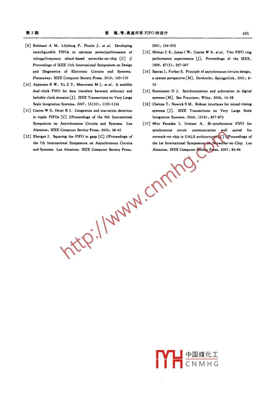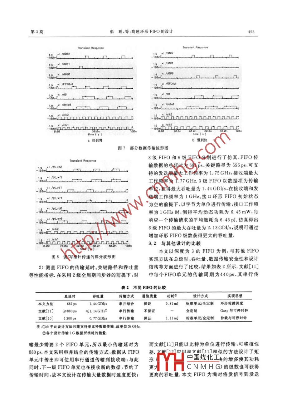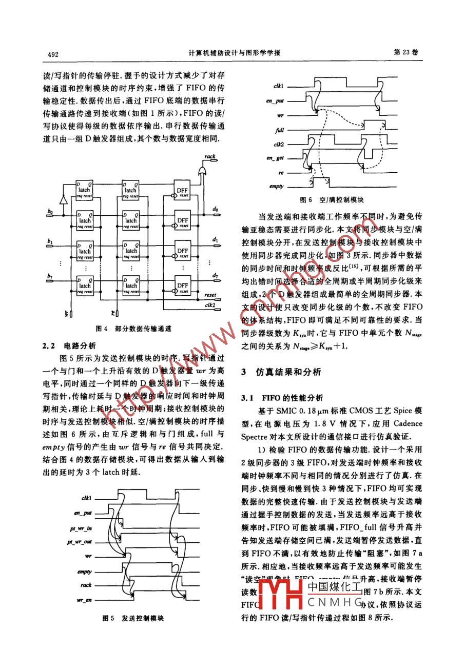 第23卷第3期計算機(jī)輔助設(shè)計與圖形學(xué)學(xué)報Vol. 23 No. 32011 年3月Journal of Computer -Aided Design &. Computer GraphicsMar. 2011高速環(huán)形FIFO的設(shè)計彭瑤”,周端”,楊銀堂”,朱樟明”"(西安電子科技大學(xué)微電子研究所安710071)2)(西安電子科技大學(xué)計算機(jī)學(xué)院西安 710071)(xyyiei@163. com)摘要:針對全局異步局部同步系統(tǒng)中不同時鐘域間的通信問題.提出一種可用于多核片上系統(tǒng)的環(huán)形FIFO.采用獨特的運行協(xié)議和串并結(jié)合的數(shù)據(jù)傳輸萬式以及保證通俏質(zhì)址的雙軌編碼方法,設(shè)計了一種新穎的FIFO體系結(jié)構(gòu),使其可支持不同寬度數(shù)據(jù)的發(fā)送和接收,保證數(shù)據(jù)的完整商速傳輸.在0. 18 pm標(biāo)準(zhǔn)CMOS工藝下,FIFO的傳輸延時為681 ps,每響應(yīng)一-個傳輸 請求的平均能耗為6. 45 pJ,可滿足多核片上系統(tǒng)和片上網(wǎng)絡(luò)芯片速度高、功耗低、魯櫸性強和重用性好的設(shè)計要求。關(guān)鍵詞:高速低功耗;不同時鐘域;FIFO;協(xié)議;全局異步局部同步中圈法分類號: TN402Design for High-Speed Circular FIFOPeng Yao" , Zhou Duan2 , Yang Yintang” ,and Zhu Zhangming"1)( lnstitute of Microeletronics , Xidian Univerity, Xi'an 710071)2)(School of Computer Science and Technology, Xidian University, Xi'an 710071)Abstract: This paper proposes a novel circular FIFO used in multiprocessor system-on-chip (SoC) forthe data transfer between different time domains in globally asynchronous locally synchronoussystems. With the transmission mode combining both serial and parallel communication, data ofdifferent widths can be sent and received quickly by the circular FIFO handled under special operationprotocol. Meanwhile, the data integrity is ensured during the communication by the two-rail encodingtransfer manner. Based on SMIC 0. 18 μm CMOS technology , simulation results have shown that thedelay is 681ps with the average energy consumption of 6.45 pJ for one transfer request responded,which can meet the requirements of high speed, low power, strong robustness and good reusability inthe design of multiprocessor SoC and network-on-chip.Key words: high-speed low power; different time domains; FIFO; protocol; globally asynchronouslocally synchronous隨著芯片集成度的不斷增加,單一時鐘信號產(chǎn)設(shè)計高速、低功耗"超大規(guī)模集成電路片上系統(tǒng)[2],生的功耗越來越高,將它分配到整個芯片的難度也尤其是成為片.上網(wǎng)絡(luò)104芯片的有效方法.在全局越來越大.全局異步局部同步的設(shè)計思想已逐步成為異步局部同步系統(tǒng)( globally asynchronous locally收稿日期:2010 07-27;修回 日期:2010-11 26. 基金項目:國家自然科學(xué)基金(60725415.60971066);國家“八六三”高技術(shù)研究發(fā)饜計劃(090A012258 20A01220)0"寬帶腺半超導(dǎo)體”國家重點實驗室基金(ZHD中國煤化工生,主要研究方向為IP核設(shè)計.VLSI設(shè)計:周端(1957-).女.博士.教授、碩士生導(dǎo)師,主要研究方向YHFi銀堂(1962- -).男.博士.教授.博士生導(dǎo)師.主要研究方向為深亞微米模擬集成電路及IP核設(shè)計.VLSCN M H G1978- -).男,博士,教 .授.碩士生導(dǎo)師,主要研究方向為高性能SocC/NoC體系結(jié)構(gòu)設(shè)計.第3期彭瑤,等;高速環(huán)形 FIFO的設(shè)計489synchronous, GALS)中,不同時鐘域間的通信是其管,讓FIFO的體系結(jié)構(gòu)建立在傳輸控制邏輯和數(shù)設(shè)計的重點和難點.據(jù)傳輸通道分離.數(shù)據(jù)同步化模塊和讀/寫指針分離FIFO是實現(xiàn)不同時鐘域間數(shù)據(jù)通信的主要方的基礎(chǔ)上,使得本文設(shè)計的FIFO支持串并結(jié)合的式[s7],通常選撣的設(shè)計方法有應(yīng)用仲裁機(jī)制、采用數(shù)據(jù)傳輸方式和不同寬度的數(shù)據(jù)傳輸模式,滿足不可停時鐘和應(yīng)用Gasp(或asp" )協(xié)議等. Cummings同傳輸可靠性的要求;最小傳輸時延為3個鎖存器SUNG公司[8]提出的FIFO利用仲裁機(jī)制和格雷碼延時,提高了數(shù)據(jù)傳輸效率,增強了FIFO 的可重用轉(zhuǎn)換器實現(xiàn),由發(fā)送端和接收端的計數(shù)器分別產(chǎn)生性,避免了傳輸亞穩(wěn)態(tài),實現(xiàn)了不同時鐘域間數(shù)據(jù)的讀/寫指針,并在數(shù)據(jù)傳輸過程中,通過比較讀/寫指完整高速傳輸.針控制數(shù)據(jù)的傳輸.雖然后續(xù)研究得出一系列優(yōu)化方案[°] ,但都是使用多個功能塊集成的方法實現(xiàn),設(shè)FIFO的體系結(jié)構(gòu)和協(xié)議計復(fù)雜度高. Apperson等(10] 將Cummings SUNG設(shè)計的FIFO和可停時鐘相結(jié)合,停止時鐘易使依環(huán)形體系結(jié)構(gòu)的FIFO解決了多核系統(tǒng)中不同賴時鐘進(jìn)行數(shù)據(jù)刷新的RAM中數(shù)據(jù)丟失,且多核時鐘域間的通信問題,使讀/寫操作并行,數(shù)據(jù)遵從芯片中-一個核的時鐘停止后,當(dāng)此核的時鐘信號被釋先人先出的順序.由于收發(fā)雙方的工作頻率不同可放時需要重新對其他核傳人的數(shù)據(jù)采樣,容易出錯. .能引起數(shù)據(jù)傳輸亞穩(wěn)態(tài),本文設(shè)計中著重考慮了這文獻(xiàn)[11-13]應(yīng)用Gasp(或asp" )協(xié)議實現(xiàn)FIFO,一問題.由特別的模塊產(chǎn)生FIFO的讀/寫信號控制FIFO的1.1環(huán)形 FIFO體系結(jié)構(gòu)讀寫.但該類方法使用捆綁數(shù)據(jù)的Gasp協(xié)議,要求圖1所示為環(huán)形FIFO的體系結(jié)構(gòu)示意圖,其傳輸控制信號必須嚴(yán)格滿足數(shù)