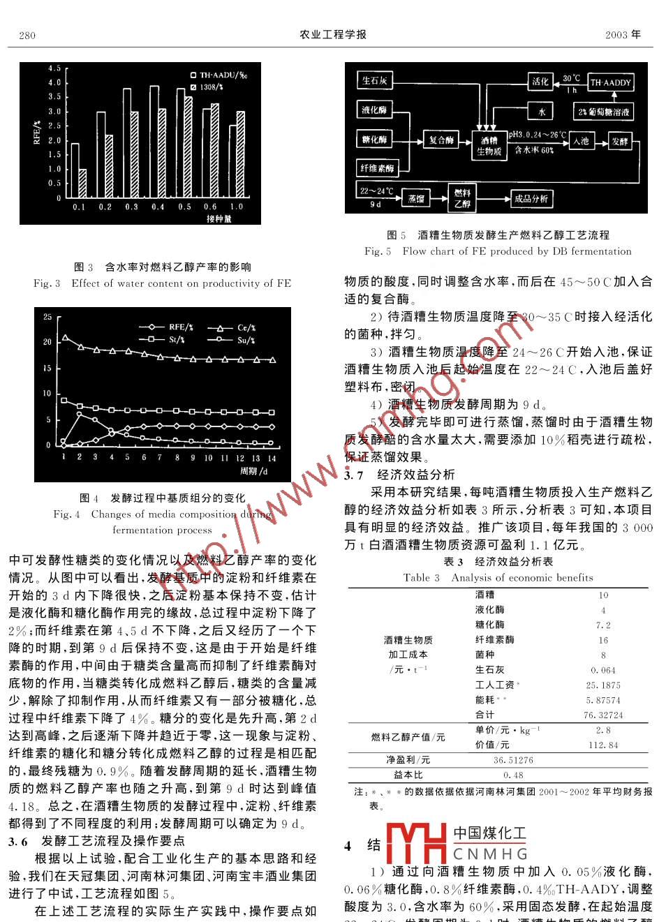 第19卷第4期農(nóng)業(yè)工程學報VO2782003年7月Transactions of the CSaeJuly 2003利用酒糟生物質(zhì)發(fā)酵生產(chǎn)燃料乙醇的試驗研究宋安東l2,張建威,吳云漢1,馬向東(1.河南農(nóng)業(yè)大學生物技術與食品科學學院,鄭州4500052.農(nóng)業(yè)部農(nóng)村可再生能源重點開放實驗室,鄭州450002)摘要:研究了采用固態(tài)發(fā)酵工藝利用酒糟生物質(zhì)生產(chǎn)燃料乙醇的工藝。向酒糟生物質(zhì)中加λ0.05%液化酶,0.06%糖化酶,0.8%纖維素酶,0.4‰TH-AADY,調(diào)整酒糟生物質(zhì)的酸度為3.0,含水率為60%,起始溫度為22~24C,發(fā)酵周期為9d的條件下,燃料乙醇產(chǎn)率可達4.18%。中試結(jié)果表明,該工藝可正常生產(chǎn)燃料乙醇,產(chǎn)率為4.03%。本研究可以為酒糟生物質(zhì)資源的合理利用、消除酒糟對環(huán)境的污染、開發(fā)可再生新能源提供一條新工藝關鍵詞:酒糟生物質(zhì);發(fā)酵;燃料乙醇中圖分類號:Q939文獻標識碼文章編號:1002-6819(2003)04-0278-041引言21%,糖分含量為0.8%2.2菌種。酒糟生物質(zhì)( Distillers biomass,DB)是白酒生產(chǎn)過活性干酵母TH-AADY,由湖北宜昌食用酵母基程排放的廢棄物,毎生產(chǎn)1t白酒(4θ度)就排放酒糟生地提供,用2%的葡萄糖溶液30℃活化h備用。酒精物質(zhì)3~4t。我國是個飲料酒生產(chǎn)和消費的大國,僅白酵母1308( Saccharmyces cerevisia),由河南天冠集團提酒2001年產(chǎn)量就達到850萬t,僅此一項毎年我國排放供,用豆芽汁葡萄糖培養(yǎng)基進行擴大培養(yǎng),每代培養(yǎng)時酒糟生物質(zhì)就達3000萬t。酒糟生物質(zhì)的含水率大間為24h,備用(60%~70%),酸度高(3.0左右),同時含有一定的殘2.3酶制劑余糖分、淀粉,因此,酒糟生物質(zhì)不易保存,極易腐爛變糖化酶(50000u/g)由(中外合資)無錫星達生物質(zhì),發(fā)酸發(fā)臭,造成了嚴重的環(huán)境污染同時酒糟生物質(zhì)工程有限公司提供,液化酶(2000u/g)由北京美的生中的殘余糖分、淀粉、豐富的纖維素和半纖維素等資源物技術有限公司提供,纖維素酶(2500u/g)由本實驗也不能得到合理的利用,造成巨大的資源浪費。目前對室采用黑曲酶F2固體曲盤法生產(chǎn)于酒糟生物質(zhì)的利用大都局限于烘干或直接作為飼料、2.4測定方法栽培食用菌等方面的初級利用,利用水平和利用率不燃料乙醇含量測定采用變性燃料乙醇國標高、附加值較低。因此,尋求一種新的酒糟生物質(zhì)利用GB18350-2001,然后計算酒糟生物質(zhì)的燃料乙醇產(chǎn)率途徑是很有必要的(RFE);酸度測定用0.1NaOH滴定法;糖度測定用在當今傳統(tǒng)化石能源的供給日益緊張,人類對使用DNS法;淀粉測定采用國標GB5009.9-85;纖維素測定傳統(tǒng)化石能源所造成的嚴重環(huán)境污染有了充分認識的用國標GB5009.1085情況下,燃料乙醇( Fuel ethonal,FE)作為一種新型的2.5復合酶糖化效果研究可再生、清潔能源而越來越受到世人的重視2·3。巴西、燃料乙醇發(fā)酵的最終基質(zhì)是可發(fā)酵性糖類,如葡萄美國、印度等國家已有近200萬輛機動車使用燃料乙糖,在采用酒糟生物質(zhì)生產(chǎn)燃料乙醇的過程中,酒糟生醇,我國的河南天冠集團率先倡導并推動了燃料乙醇的物質(zhì)中的淀粉、纖維素和半纖維素可以在液化酶、糖化使用。目前燃料乙醇的生產(chǎn)主要以糧食或薯類為原酶和纖維素酶的作用下糖化產(chǎn)生可發(fā)酵性糖類。在p料,產(chǎn)品成本高利用酒糟生物質(zhì)為原料生產(chǎn)燃料乙值為4.5~5.0,溫度為30C時,采用表1設計的各種酶醇還很少報道。本文就通過固態(tài)發(fā)酵用酒糟生物質(zhì)生產(chǎn)的比例來研究復合酶對酒糟生物質(zhì)處理24h的效果,燃料乙醇的工藝技術進行了試驗研究-。該試驗的設計采用L(34)正交表進行,以糖化效果最好的組合來配比復合酶。2材料與方法表1試驗因素水平表2.1材料Table 1 Experimental factors and levels酒糟生物質(zhì)樣品取自河南林河集團(生產(chǎn)濃香型白中國煤化工2酒),含水率64%,淀粉含量為8.9%,纖維素含量為CNMHGO.05%0纖維素酶(C0.8%收稿日期:200207-08基金項目:河南省科技廳重點攻關資助項目(0123011700作者簡介:宋安東(1972-)男,河南宜陽人,講師,博士生,主要從2.6發(fā)酵條件研究事發(fā)酵工閂荬環(huán)境工程、能源微生物學等的研究工作。鄭州市采用不同的菌種,調(diào)整酒糟生物質(zhì)不同的酸度,不河南農(nóng)業(yè)大學生物技術與食品科學學院,450005同的含水率,在30C,300mL三角瓶中裝入酒糟生物第4期宋安東等:利用酒糟生物質(zhì)發(fā)酵生產(chǎn)燃料乙醇的試驗研究質(zhì)密閉發(fā)酵12d發(fā)酵過程中毎天取樣測定發(fā)酵酒醅的述復合酶添加量,用生石灰來調(diào)整酒糟生物質(zhì)的酸度,燃料乙醇產(chǎn)率,研究不同條件下酒糟生物質(zhì)旳發(fā)酵情用 TH-AADY發(fā)酵12d。不同酒糟生物質(zhì)起始酸度對燃料乙醇產(chǎn)率的影響結(jié)果如圖2所示3結(jié)果與分析口 TH.AADU/1308/13.1復合酶糖化酒糟生物質(zhì)的研究根據(jù)表1的安排,正交試驗的結(jié)果如表2所示。表2糖化酒糟生物質(zhì)試驗結(jié)果Table 2 Experimental results of saccharification of DB組合糖度/%試驗號1(0.01%)1(0.02%)1(0.6%)0.10.20.30.40.50.61.02(0.06%)2(0.8%)6.1823456783(0,1%)3(1.0%)2(0.05%)5.91圖1菌種對燃料乙醇產(chǎn)率的影響Fig 1 Effect of strains on productivity of Fuel Ethonal(FE)3(0.1%)086217.1716.447Xxx822968吸5,725,486.045,740