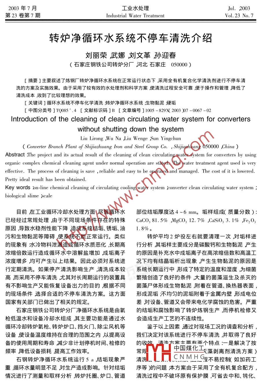 2003年7月工業(yè)水處理Jul.2003第23卷第7期Industrial Water TreatmentVol.23 No. 7轉(zhuǎn)爐凈循環(huán)水系統(tǒng)不停車清洗介紹.劉麗榮武娜劉文革孫迎春.(石家莊鋼鐵公司轉(zhuǎn)爐分廠河北石家莊050000 )[摘要]主要敘述了煉鋼廠轉(zhuǎn)爐凈循環(huán)水系統(tǒng)在正常運行狀態(tài)下采用全有機復合化學清洗劑進行不停車清洗的方案及實施效果。由于采用了較有效的水處理劑和科學方案使清洗過程安全可靠便于操作和管理降低了清洗成本收到了比較理想的效果。[關(guān)鍵詞]循環(huán)水系統(tǒng)不停車化學清洗轉(zhuǎn)爐凈循環(huán)水系統(tǒng)生物黏泥硬垢[中圖分類號]TQ085*.4 [ 文獻標識碼]B [ 文章編號] 1005 -829X( 2003 )07 -0067 -02Introduction of the cleaning of clean circulating water system for converterswithout shutting down the systemLiu Lirong ,Wu Na Liu Wenge Sun Yingchun( Converter Branch Plant of Shjiazhuang lron and Steel Group Co. , Shijiazhuang 050000 ,China )Abstract .The project and its actual result of the cleaning of clean circulating water system for converters by usingorganic complex chemical cleaning agent under normal operation are stated. The water treatment agent used is veryeffective. The process of cleaning is save , reliable and easy to be operated and managed. The cost of it is lowered.Pretty ideal result has been obtained.Key words on-line chemical cleaning of circulating cooling water system :converter clean circulating water system ;biological slime ;scale目前在工業(yè)循環(huán)冷卻水處理方面盡管循環(huán)水部位結(jié)垢厚度達4~6 mm。垢樣組成(質(zhì)量分數(shù)):已經(jīng)經(jīng)過常規(guī)處理,由于不同現(xiàn)場條件存在的特殊CaCO3 81.5% ,MgCO3 12. 7% ,CaSiO3 3.1% ,Fe2O3原因?qū)е滤€(wěn)劑性能下降造成系統(tǒng)結(jié)垢、銹垢、油1. 8%。污和生物黏泥等障礙使系統(tǒng)不能正常運行。類似轉(zhuǎn)爐平均2爐役左右就要清理-次,對垢樣進的現(xiàn)象有水冷物料泄漏造成循環(huán)水質(zhì)惡化,長期高行分析其垢樣主要成分是碳酸鈣和生物黏泥產(chǎn)生濃縮倍數(shù)運行造成循環(huán)水中溶解鹽增加,成垢離子的原因是補充水中成垢離子在高濃縮倍數(shù)和高溫工濃度增多均可產(chǎn)生以上結(jié)果。因此必須對系統(tǒng)進況下均有結(jié)晶垢析出現(xiàn)象,產(chǎn) 生生物黏泥的原因是行定期清洗。如果停產(chǎn)清洗影響生產(chǎn)清洗成本較系統(tǒng)長期運行中形成了特定的溫度和濕度,為細菌高,而采用不停車清洗尤其對長周期運行的裝置具繁殖創(chuàng)造了良好的條件大量的菌藻滋生及殺滅的有不影響生產(chǎn)又能恢復設(shè)備出力的目的根據(jù)不同菌藻尸體形成生物黏泥,附著在管道、換熱器表面的現(xiàn)場條件選擇合適的不停車清洗方案。這方面形成泥垢不均勻的泥垢附著于金屬內(nèi)壁形成電位國家有關(guān)部門已做出了相關(guān)的規(guī)定。差對設(shè)備、管道又會帶來電化學腐蝕的危害。嚴重石家莊鋼鐵公司轉(zhuǎn)爐分廠凈循環(huán)水系統(tǒng)是由氧的結(jié)垢和腐蝕影響了轉(zhuǎn)爐煉鋼生產(chǎn),而停機檢修又槍低溫水和設(shè)備冷卻水組成其主要功能是通過水會造成生產(chǎn)工藝的不連續(xù)性。循環(huán)冷卻轉(zhuǎn)爐氧槍、轉(zhuǎn)爐爐口、擋火門、除塵風機等鑒于以上因素通過對現(xiàn)場工況的調(diào)查和分析,設(shè)備使設(shè)備溫度維持在合理的范圍之內(nèi)以提高設(shè)我們決定對該系統(tǒng)進行不停車清洗,并取得了良好備的使用周期和壽命減少非計劃停機時間、檢修的的收效清洗方案主要有兩個特點:-是解決了按頻率降低設(shè)備損耗提高工作效率。常規(guī)中國煤化工藻剝離劑清洗方案)石鋼轉(zhuǎn)爐凈循環(huán)水系統(tǒng)運行5a,結(jié)垢現(xiàn)象嚴清洗.CN MH C星不易控制如加藥工重循環(huán)水量明顯不足對生產(chǎn)造成影響。針對結(jié)垢序等)的問題本方案由于采用了全有機復合配方,情況進行了測量和取樣分析轉(zhuǎn)爐托圈、爐口、管道清洗過程中不破壞原有保護膜,可省去中和、鈍化、.一67一經(jīng)驗交流工業(yè)水處理2003-0723(7)預膜過程便于操作和管理。二是解決了由于換熱1.3 方案的實施和監(jiān)控器管徑較小(最小只有6mm)常規(guī)清洗可能造成( 1 )清洗周期以硬度連續(xù)3 d無明顯變化為止。堵塞的問題采用本方案污垢在清洗過程中逐步松在清洗時首先投加TW-504加藥地點選在泵的入散,分批分層溶解去除,不會產(chǎn)生大塊脫落,不產(chǎn)生口處加藥質(zhì)量濃度為100mg/L,進行生物黏泥剝大量氣泡無堵塞現(xiàn)象發(fā)生。離去除,使硬垢裸露出來便于投加TW - 308C時,1清洗方 案和實施硬垢更容易溶解脫落。加藥24 h后轉(zhuǎn)為投加TW1.1現(xiàn)場工況條件- 308C。.系統(tǒng)容積700m’,循環(huán)水量1200~1500(2)將TW-308C按150mg/L-次性投放循m'/h補水量50 m'/h ,設(shè)備及管道材質(zhì)為碳鋼、鑄環(huán)水中加藥地點選在泵的入口處,,開 泵循環(huán)期間鐵、紫銅,垢主要成分為CaCO3 ,MgCO3 ,CaSi0, ,控制排污量,24h后轉(zhuǎn)為正常加藥,采用連續(xù)滴加Fe2O3。方式每日補加藥劑50 mg/I(以保有水量計)每隔補充水水質(zhì):pH 7.3 ,電導率553 μS/cm 總固24h取樣監(jiān)測循環(huán)水的硬度,并記錄,當硬度為.溶物650mg/L總硬220mg/L鈣硬(以CaCO,計)2 000 mg/L時一次性排掉 或補水進行置換然后補179.3 mg/L 總堿(以C