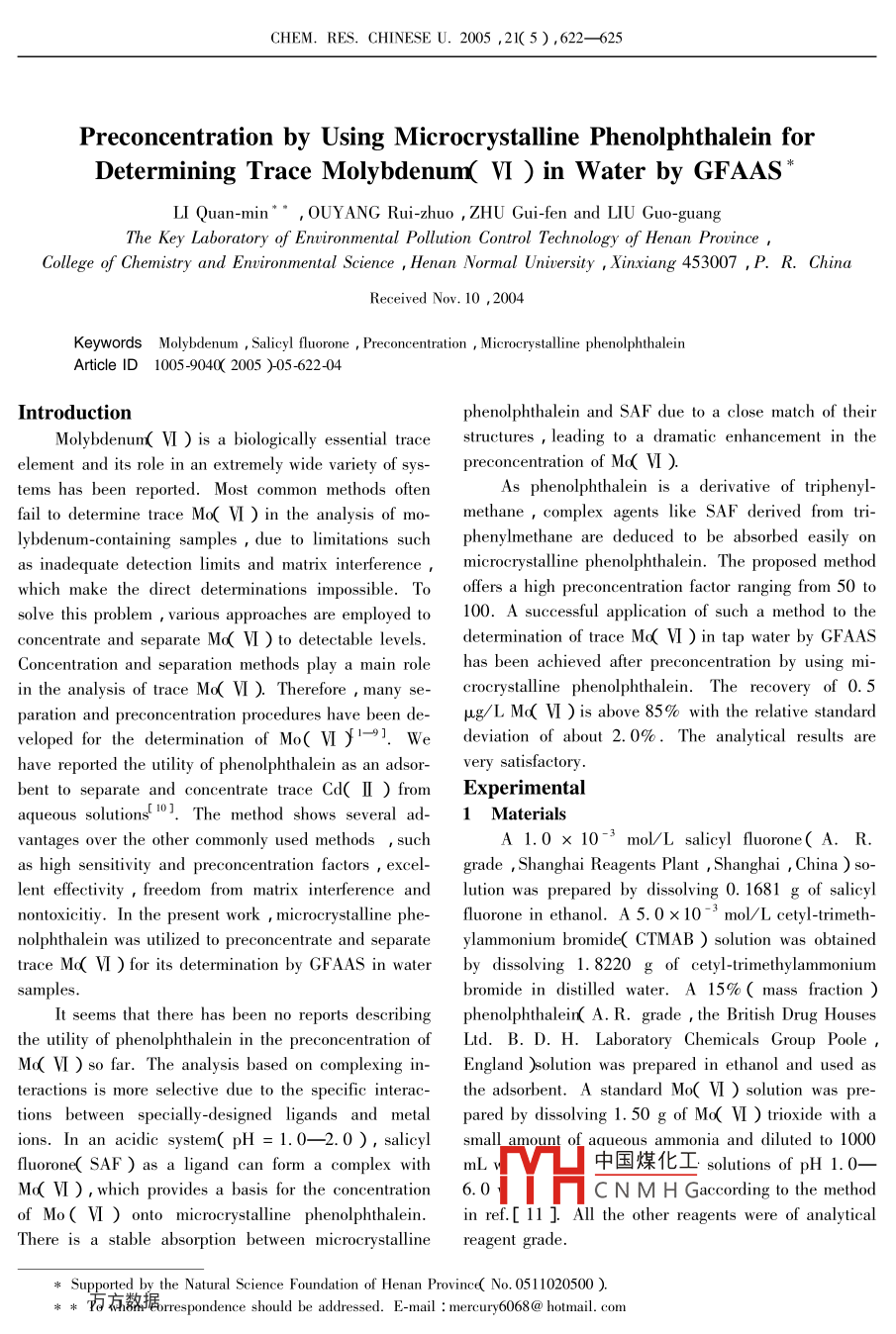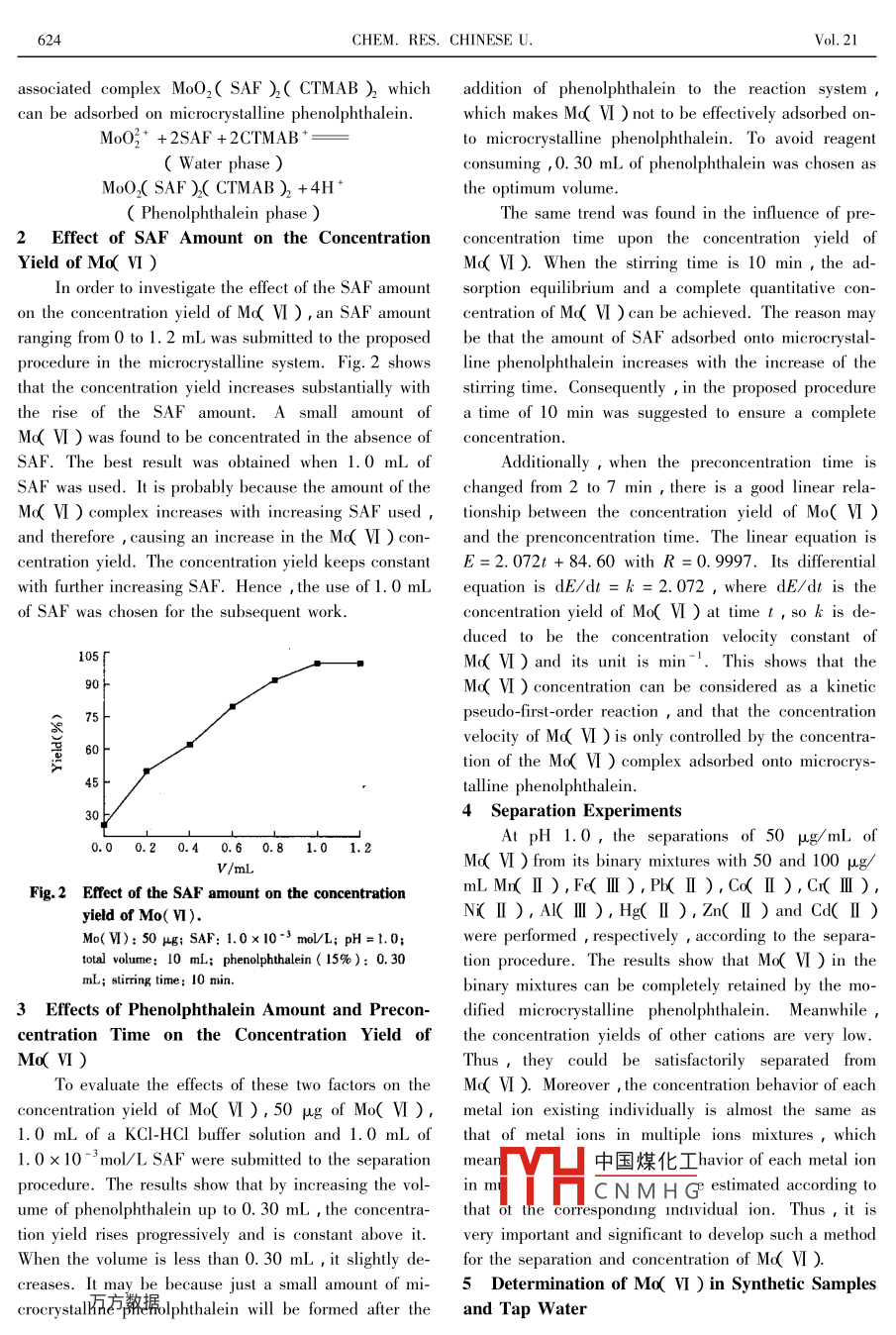 CHEM. RES. CHINESE U.2005 ,21(5),622- -625Preconcentration by Using Microcrystalline Phenolphthalein forDetermining Trace Molybdenum( VI ) in Water by GFAASLI Quan-min””, OUYANG Rui-zhuo ,ZHU Gui-fen and LIU Guo-guangThe Key Laboratory of Enwironmental Pollution Control Technology of Henan Province ,College of Chemistry and Environmental Science , Henan Normal University ,Xinxiang 453007 ,P. R. ChinaReceived Nov. 10 ,2004Keywords Molybdenum , Salicyl fluorone , Preconcentration , Microcrystalline phenolphthaleinArticle ID 1005 _9040( 2005 )-05-622-04Introductionphenolphthalein and SAF due to a close match of theirMolybdenum( VI ) is a biologically essential tracestructures , leading to a dramatic enhancement in theelement and its role in an extremely wide variety of sys-preconcentration of Md( VI ).tems has been reported. Most common methods oftenAs phenolphthalein is a derivative of triphenyl-fail to determine trace Mo( VI ) in the analysis of mo-methane , complex agents like SAF derived from tri-lybdenum-containing samples , due to limitations suchphenylmethane are deduced to be absorbed easily onas inadequate detection limits and matrix interference,microcrystalline phenolphthalein. The proposed methodwhich make the direct determinations impossible. Tooffers a high preconcentration factor ranging from 50 tosolve this problem , various approaches are employed to100. A successful application of such a method to theconcentrate and separate Md VI ) to detectable levels.determination of trace Md VI ) in tap water by GFAASConcentration and separation methods play a main rolehas been achieved after preconcentration by using mi-in the analysis of trace Md( VI ). Therefore , many secrocrystalline phenolphthalein. The recovery of 0. 5paration and preconcentration prcedures have been de-μg/L Md( VI )is above 85% with the relative standardveloped for the determination of Mo( VI )-9]. Wdeviation of about 2. 0%. The analytical results arehave reported the utility of phenolphthalein as an adsor-very satisfactory.bent to separate and concentrate trace Cd( II ) fromExperimentalaqueous solutionsThe method shows several ad-1 Materialsvantages over the other commonly used methods , suchA 1.0 x 10-3 mol/L salicyl fluorone( A. Ras high sensitivity and preconcentration factors , excel-grade , Shanghai Reagents Plant , Shanghai , China ) so-lent effectivity , freedom from matrix interference andlution was prepared by dissolving 0. 1681 g of salicylnontoxicitiy. In the present work , microcrystalline phe-fluorone in ethanol. A 5.0x 10 -3 mol/L cetyl-trimeth-nolphthalein was utilized to preconcentrate and separateylammonium bromide( CTMAB ) solution was obtainedtrace Md( VI ) for its determination by GFAAS in waterby dissolving 1. 8220 g of cetyl-trimethy lammoniumsamples.bromide in distilled water. A 15% ( mass fraction )It seems that there has been no reports describingphenolphthalein( A. R. grade , the British Drug Housesthe utility of phenolphthalein in the preconcentration ofLtd. B. D. H. Laboratory Chemicals Group Poole ,Md( VI ) so far. The analysis based on complexing in-England )solution was prepared in ethanol and used asteractions is more selective due to the specific interac-the adsorbent. A standard Mo( VI ) solution was pre-tions between specially-designed ligands and metalpared by dissolving 1.50 g of Mo( VI ) trioxide with aions. In an acidic system( pH = 1.0- -2.0 ) , salicylsmall amount of aqueous ammonia and diluted to 1000fluorone( SAF ) as a ligand can form a complex withmL ~中國煤化工solutions of pH 1.0-Md( VI ) , which provides a basis for the concentration6.0YHC N M H Gaccording to the methodof Mo( VI ) onto micocrystalline phenolphthalein.in ref.[ 11 ] All the other reagents were of analyticalThere is a stable absorption between microcrystallinereagent grade.。 Supported by _the Natural Science Foundation of Henan Province( No. 0511020500 ).* *石熬據(jù)rrespondence should be addressed. E-mail : mercury6068 @ hotmail. comNo. 5LI Quan-min et al.6232 A pparatusescentration of Mo( VI ) was examined by varying pHA Z-5000 atom absorption spectrometer( Japan )from 1.0 to 6. 0 under optimum conditions. As shownequipped with an A-type graphite furnace was used forin Fig. 1 , acidity exerts a notable effect on Mo( VI )the determination of Mo( VI ). All the absorption mea-concentration. In a pH range of 1.0一-2. 0 , the concen-surements were performed under the following operatingtration yield was found to be 100% and decreased dra-conditions : wavelength ,313.3 nm ; slit setting ,matically with the decrease in acidity. It is possible0.4 nm ;lamp current , 17 mA. A Model 722 spectro-that at a high acidity ,Md( VI ) exists in an aqueous so-photometer( Xiamen Analytical Instrument Plant , Xia-lution in the form of MoO2 +[12] , which can form a com-men , China ) was employed for the photometric mea-plex of MoO2 SAF by chelating with SAFI31. Then thesurements. A Shanghai Model pHs-2 pH meter wascomplex is adsorbed onto microcrystalline phenolphthal-used to measure all the pH values.ein via intermolecular interactions. However , various3 Procedurespolymerized species , such as Mo,O24 and MoO2- are3.1Test of Separation Conditionssuccessively formed with increasing the pH valuAn aliquot of metal ion solution was placed into awhich causes a decrease in the MoO2 + concentration.50 mL beaker. A given amount of the 1.0 x 10The concentration yield of Mo( VI ) decreases due tomol/L SAF solution was added to it. The pH was ad-the decreasing ability of these species to form comp-justed and the solution was diluted to 10 mL with dis-lexes with SAF. Hence , the rest of the study was car-tilled water. The resulted solution was shaken well andried out at pH=1.0.allowed to stand for a few seconds. Then 0. 30 mL of a15% solution of phenolphthalein in ethanol was added100F■to it under continuous stirring. The supernatant liquid95(1.0 mL) was taken and added to a 25 mL gradedflask. Then ,2.5 mLof 5.0