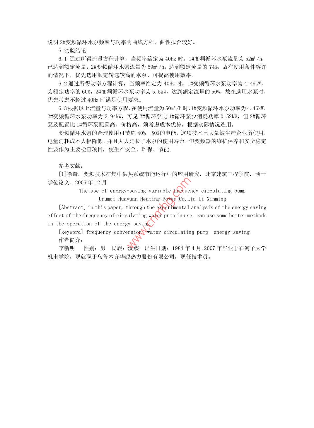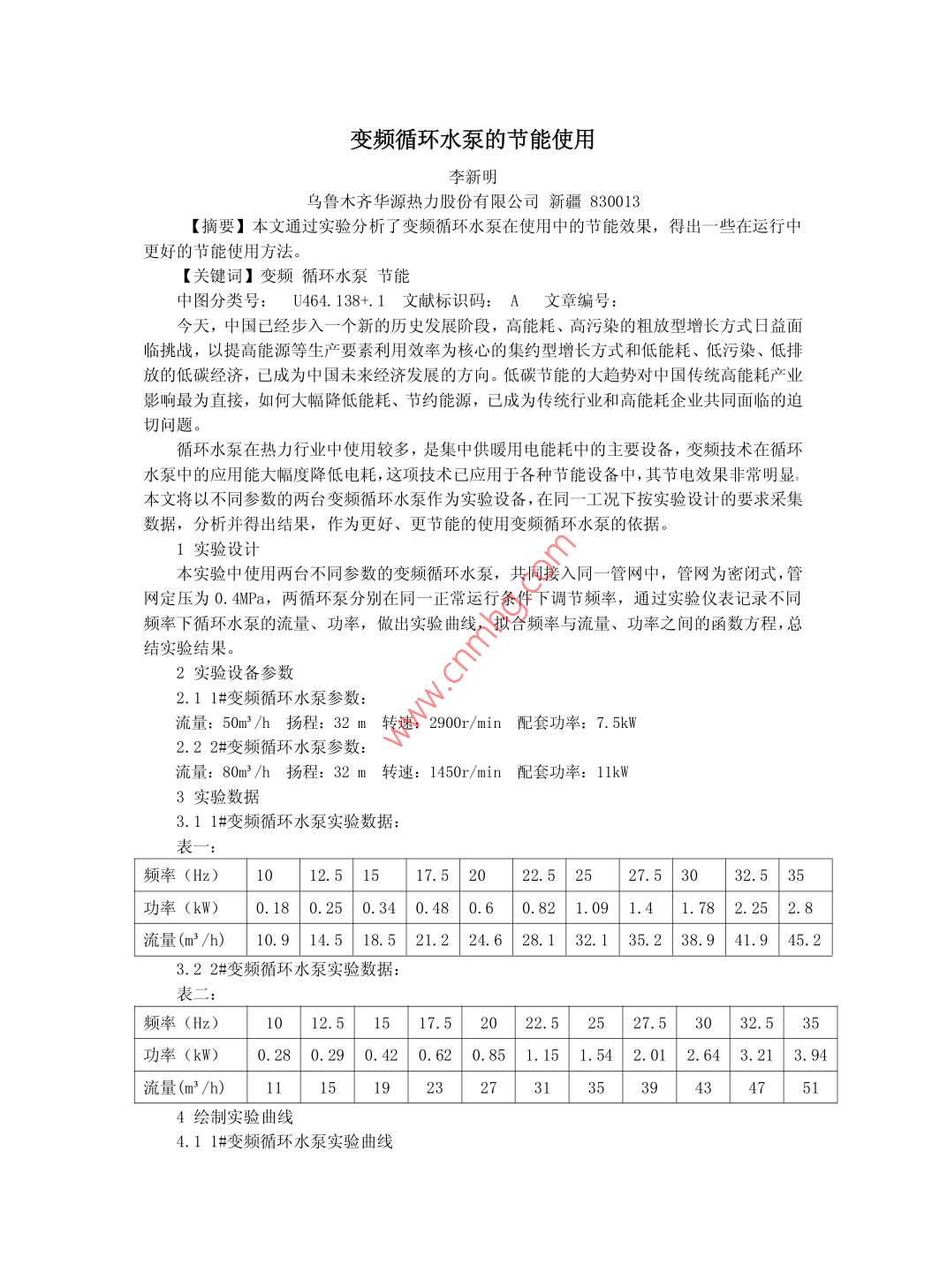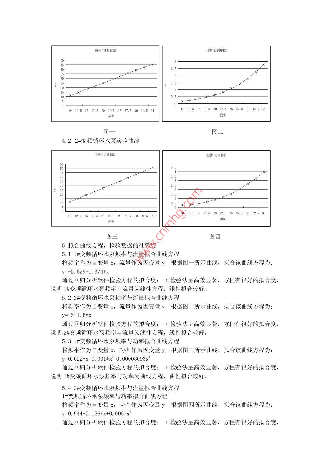 變頻循環(huán)水泵的節(jié)能使用李新明烏魯木齊華源熱力股份有限公司新疆830013【摘要】本文通過實驗分析了變頻循環(huán)水泵在使用中的節(jié)能效果,得出一些在運行中更好的節(jié)能使用方法?!娟P(guān)鍵詞】變頻循環(huán)水泵節(jié)能中圖分類號:U464.138+.1文獻(xiàn)標(biāo)識碼:A文章編號今天,中國已經(jīng)步入一個新的歷史發(fā)展階段,高能耗、高污染的粗放型增長方式日益面臨挑戰(zhàn),以提高能源等生產(chǎn)要素利用效率為核心的集約型增長方式和低能耗、低污染、低排放的低碳經(jīng)濟(jì),已成為中國未來經(jīng)濟(jì)發(fā)展的方向。低碳節(jié)能的大趨勢對中國傳統(tǒng)高能耗產(chǎn)業(yè)影響最為直接,如何大幅降低能耗、節(jié)約能源,已成為傳統(tǒng)行業(yè)和高能耗企業(yè)共同面臨的迫切問題。循環(huán)水泵在熱力行業(yè)中使用較多,是集中供暖用電能耗中的主要設(shè)備,變頻技術(shù)在循環(huán)水泵中的應(yīng)用能大幅度降低電耗,這項技術(shù)已應(yīng)用于各種節(jié)能設(shè)備中,其節(jié)電效果非常明顯。本文將以不同參數(shù)的兩臺變頻循環(huán)水泵作為實驗設(shè)備,在同一工況下按實驗設(shè)計的要求采集數(shù)據(jù),分析并得出結(jié)果,作為更好、更節(jié)能的使用變頻循環(huán)水泵的依據(jù)1實驗設(shè)計本實驗中使用兩臺不同參數(shù)的變頻循環(huán)水泵,共同接入同一管網(wǎng)中,管網(wǎng)為密閉式,管網(wǎng)定壓為0.MPa,兩循環(huán)泵分別在同一正常運行條件下調(diào)節(jié)頻率,通過實驗儀表記錄不同頻率下循環(huán)水泵的流量、功率,做出實驗曲線,擬合頻率與流量、功率之間的函數(shù)方程,總結(jié)實驗結(jié)果。2實驗設(shè)備參數(shù)2.11#變頻循環(huán)水泵參數(shù)流量:50m3/h揚程:32m轉(zhuǎn)速:2900r/min配套功率:7.5kW2.22#變頻循環(huán)水泵參數(shù):流量:80m3/h揚程:32m轉(zhuǎn)速:1450r/min配套功率:11kW3實驗數(shù)據(jù)3.11#變頻循環(huán)水泵實驗數(shù)據(jù)頻率(Hz)1012.51517.52022.52527.53032.535功率(kW)0.180.250.340.480.60.821.091.41.782.252.8流量(m3/h)10.914.518.521.224.628.132.135.238.941.945.23.22#變頻循環(huán)水泵實驗數(shù)據(jù)表頻率(Hz)1012.51517.52022.52527.53032.535功率(k)0.280.290.420.620.851.151.542.012.643.213.94流量(m3/h)1115192327313534繪制實驗曲線4.11#變頻循環(huán)水泵實驗曲線頻率與流量曲線頻率與功率曲線05050505101012.517.52022.52527.53032.53512.51517.52022.52527.53032.535頻率圖圖4.22#變頻循環(huán)水泵實驗曲線頻半與流量曲線頻率與功率曲線0.51012.51517.52022,52527.53032,51012.51517.52022.52527.53032.535須率圖三圖四5擬合曲線方程,檢驗數(shù)據(jù)的準(zhǔn)確度5.11#變頻循環(huán)水泵頻率與流量擬合曲線方程將頻率作為自變量x,流量作為因變量y,根據(jù)圖一所示曲線,擬合該曲線方程為通過回歸分析軟件檢驗方程的擬合度:t檢驗法呈高效顯著,方程有很好的擬合度說明1#變頻循環(huán)水泵頻率與流量為線性方程,線性擬合較好。5.22#變頻循環(huán)水泵頻率與流量擬合曲線方程將頻率作為自變量x,流量作為因變量y,根據(jù)圖二所示曲線,擬合該曲線方程為:y=-5+1.6*x通過回歸分析軟件檢驗方程的擬合度:t檢驗法呈高效顯著,方程有很好的擬合度,說明2#變頻循環(huán)水泵頻率與流量為線性方程,線性擬合較好。5.31#變頻循環(huán)水泵頻率與功率擬合曲線方程將頻率作為自變量x,功率作為因變量y,根據(jù)圖三所示曲線,擬合該曲線方程為y=0.022*x-0.001*x2+0.00008093x2通過回歸分析軟件檢驗方程的擬合度:t檢驗法呈高效顯著,方程有很好的擬合度,說明1#變頻循環(huán)水泵頻率與功率為曲線方程,曲性擬合較好。5.42#變頻循環(huán)水泵頻率與流量擬合曲線方程1#變頻循環(huán)水泵頻率與功率擬合曲線方程將頻率作為自變量x,功率作為因變量y,根據(jù)圖四所示曲線,擬合該曲線方程為y=0.944-0.126*x+0.006*x2通過回歸分析軟件檢驗方程的擬合度:t檢驗法呈高效顯著,方程有很好的擬合度,說明2#變頻循環(huán)水泵頻率與功率為曲線方程,曲性擬合較好6實驗結(jié)論6.1通過所得流量方程計算,當(dāng)頻率給定為40Hz時,1#變頻循環(huán)水泵流量為52m3/h,已達(dá)到額定流量,2#變頻循環(huán)水泵流量為59m3/h,達(dá)到額定流量的74%,故在使用條件容許的情況下,優(yōu)先選用額定轉(zhuǎn)速較高的水泵,可提高使用效率6.2通過所得功率方程計算,當(dāng)頻率給定為40Hz時,1#變頻循環(huán)水泵功率為4.46kW,為額定功率的60%,2#變頻循環(huán)水泵功率為5.5kW,達(dá)到額定流量的50%,故在選用水泵時,優(yōu)先考慮不超過40Hz時滿足使用要求6.3根據(jù)以上流量與功率方程,在使用流量為50m3/h時,1#變頻循環(huán)水泵功率為4.46kW,2#變頻循環(huán)水泵功率為3.94kW,可見2#循環(huán)泵比1#循環(huán)泵少消耗功率0.52kW,但2#循環(huán)泵及配置比1#循環(huán)泵配置高、價格高,須考慮成本優(yōu)勢,根據(jù)實際情況選用變頻循環(huán)水泵的合理使用可節(jié)約40%—50%的電能,這項技術(shù)已大量被生產(chǎn)企業(yè)所使用電量消耗成本大幅降低,并且大大延長了水泵的使用壽命,但變頻器的維護(hù)保養(yǎng)和安全穩(wěn)定性要作為主要檢査項目,使生產(chǎn)安全、環(huán)保、節(jié)能。參考文獻(xiàn)]徐奇.變頻技術(shù)在集中供熱系統(tǒng)節(jié)能