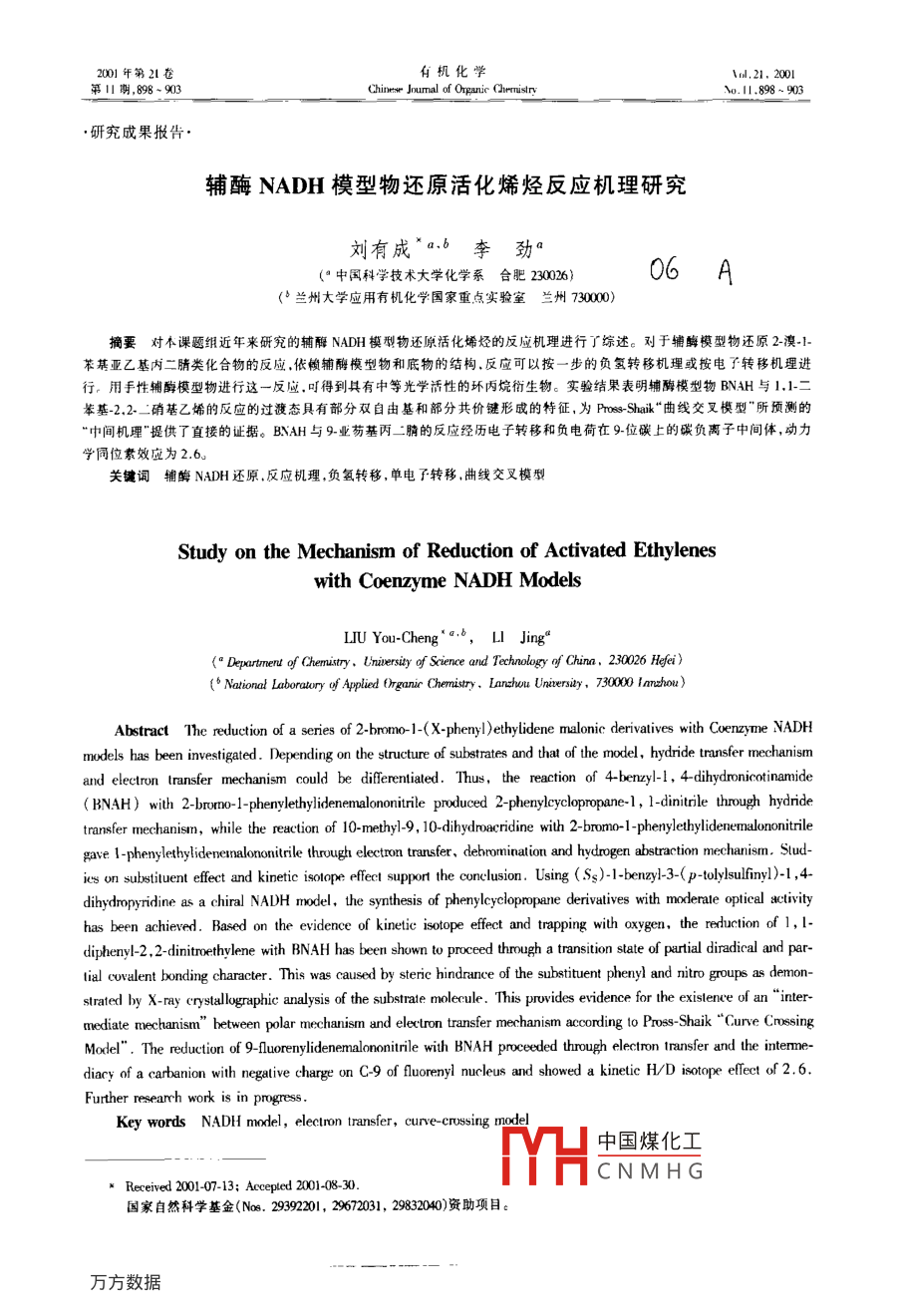 0年第21卷有機化學(xué)Chinese Joumal of Organic (hrmistrvo.ll,898-903·研究成果報告輔酶NADH模型物還原活化烯烴反應(yīng)機理研究劉有成a:b李勁°(“中國科學(xué)技術(shù)大學(xué)化學(xué)系合肥23006)06A(b蘭州大學(xué)應(yīng)用有機化學(xué)國家重點實驗室蘭州7000摘要對不課題細近年來研究的輔酶NADH模型物還原活化烯烴的反應(yīng)機理進行了綜述。對于輔酶模型物還原2溴-1亞乙基內(nèi)二腈類化合物的反應(yīng),依賴輔酶模型物和底物的結(jié)構(gòu),反應(yīng)可以按一步的負氫轉(zhuǎn)移機理或按電子轉(zhuǎn)移機理進行。用手性輔酶模型物進行這一反應(yīng),可得到具有中等光學(xué)活性的環(huán)丙烷衍生物。實驗結(jié)果表明輔酶模型物BNAH與11二苯基-2,2_二硝基乙烯的反應(yīng)的過渡態(tài)具有部分雙自由基和部分共價鍵形成的特征,為 PToss-Shaik“曲線交叉模型”所預(yù)測的“中間機理¨提供了直接的證據(jù)。BNAH與9業(yè)芴基丙二腈的反應(yīng)經(jīng)歷電子轉(zhuǎn)移和負電荷在9位碳上的碳負離子中間體,動力學(xué)同位素效應(yīng)為26關(guān)犍詞輔酶NADH還原,反應(yīng)機理,負氫轉(zhuǎn)移,單電子轉(zhuǎn)移,曲線交叉模型Study on the Mechanism of Reduction of Activated Ethyleneswith Coenzyme NADH ModelsLIU You.Cheng"'a., LI Jing"(o Depxartmerut of Chemistry, Lniversity of Science and Technology of China, 230026 HefeiNational Laboratory of Applied Organic Chemistry, Lanchou Unirersity, 730000 lanzhouAbstract The reduction of a series of 2-bromo-1-(X-phenyl )ethylidene malonic derivatives with Coenzyme NADHmodels has been investigated. Depending on the structure of substrates and that of the model, hydride transfer mechanismand electron transfer mechanism could be differentiated. Thus, the reaction of 4benzyl-1, 4-dihydronicotinamideBNAH) with 2-bromo-1-phenylethylidenemalononitransfer mechanism, while the reaction of 10-methy1-9, 10-dihydroacridine with 2-bromo-1-phenylethylidenemalononitrilegave 1-phenylethylidenemalononitrile through electron transfer, debromination and hydrogen abstraction mechanism. Studies on substituent effect and kinetic isolope effect support the conclusion. Using(Ss)-1-benzyl-3-(p-tolylsulfinyl)-1,4.dihydropyridine as a chiral NADH model, the synthesis of phenylcyclopropane derivatives with moderate optical activityhas been achieved. Based on the evidence of kinetic isotope effect and trapping with oxygen, the reduc tion of 1, Idiphenyl-2, 2-dinitroethvlene with BNAH has been shown to proceed through a transition state of partial diradical and parial covalent bonding character. This was caused by steric hindrance of the substituent phenyl and nitro groups as demonstrated by X-ray crystallographic analysis of the substrate molecule. This provides evidence for the existence of an"inter-mediate mechanism"between polar mechanism and electron transfer mechanism according to Pross-shaik Curve CrossingModel".The reduction of 9-fluorenylidenemalononitriIe with BNAH proceeded through electron transfer and the interme-diacy of a carbanion with negative charge on C-9 of fluorenyl nucleus and showed a kinetic H/D isotope effect of 2.6Further researh work is in progressKey words NADH model, electron transfer, curve-crussing model中國煤化工CNMHGReceived 2001-07-13: Accepted 2001國家自然科學(xué)基金(Nos.2939201,29672031,29832040)資助項目。第11期劉有成等:輔酶NADH模型物還原活化烯烴反應(yīng)機理研究899前言4-:氫煙酰胺腺嘌呤二核苷酸(NADH)是--應(yīng)則是按電子轉(zhuǎn)移、脫溴、奪氫機理進行的( Scheme個典型的輔酶,它在生物氧化-還原反應(yīng)中起著重1)。要的作用。有關(guān)NADH如何轉(zhuǎn)移形式上的一個負氫給反應(yīng)底物的問題一直是令人感興趣的課題,大部CONH分的研究工作都是圍繞如何用實驗區(qū)分步負氫轉(zhuǎn)移機理和以單電子轉(zhuǎn)移為先行步驟的多步反應(yīng)機理CONH,BNAHCH, BrO-P-0-P-0NADHR= PO.H, NADPHCONH2CH2BrCONIINC、CNAcrH,NADHNAD本課題組多年來在國家自然科學(xué)基金的支持下,對輔酶NADH模型物還原反應(yīng)機理進行了深入Scheme地研究,取得了一系列創(chuàng)新性成果,現(xiàn)將部分主要成果匯報如下。為了對這一反應(yīng)的機理作更進一步的了解,我們對BNAH和AcrH2還原五種苯環(huán)對位帶有不同取2結(jié)果與討論代基的2-溴-1-(對X-苯基)亞乙基丙二腈的反應(yīng)進21輔酶NADH模型物還原2溴1苯基亞乙基丙行了研究,通過取代基對反應(yīng)速率的影響來闡明其腈類化合物反應(yīng)反應(yīng)機理2。研究發(fā)現(xiàn)BNAH還原2溴1-(對X苯本課題組首次報道了4芐基-1,4二氫煙酰胺基)亞乙基丙二腈都產(chǎn)生相應(yīng)的2(對X苯基)環(huán)丙(BNAH)與2溴1-苯基亞乙基丙二腈的還原脫溴環(huán)烷-1二腈用其二級反應(yīng)速率常數(shù)與BNAH和2丙烷化反應(yīng)和10甲基,10氫吖啶(AcH1)與2溴1苯基亞乙基丙二腈反應(yīng)的二級反應(yīng)速率常數(shù)溴1苯基亞乙基丙二腈的還原脫溴反應(yīng),發(fā)現(xiàn)前比值(kx/k),對 Hammett ow作圖得到一條直線,反應(yīng)生成2苯基環(huán)丙烷1,二腈,而后一反應(yīng)卻斜率為248。H/D動力學(xué)同位素效應(yīng)均大于3.0生成1苯基亞乙基丙腈;通過對這兩個反應(yīng)的動此結(jié)果進一步證實反應(yīng)是按一步負氫轉(zhuǎn)移的極性機力學(xué)同位素效應(yīng)的測定發(fā)現(xiàn)BNAH與2溴1苯基理進行的。而Act還原2溴1-(對X苯基)亞乙亞乙基內(nèi)二腈反應(yīng)表現(xiàn)出一級動力學(xué)同位素效應(yīng)基丙二腈生成相應(yīng)的1-(對