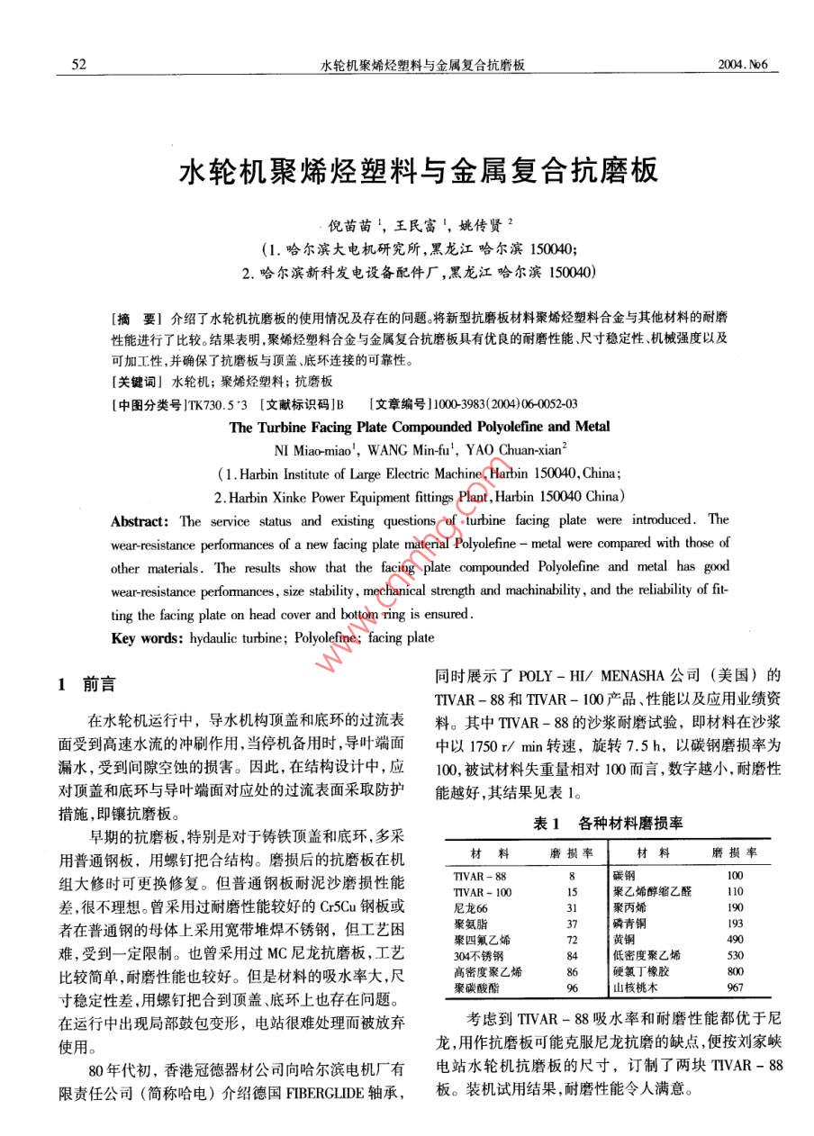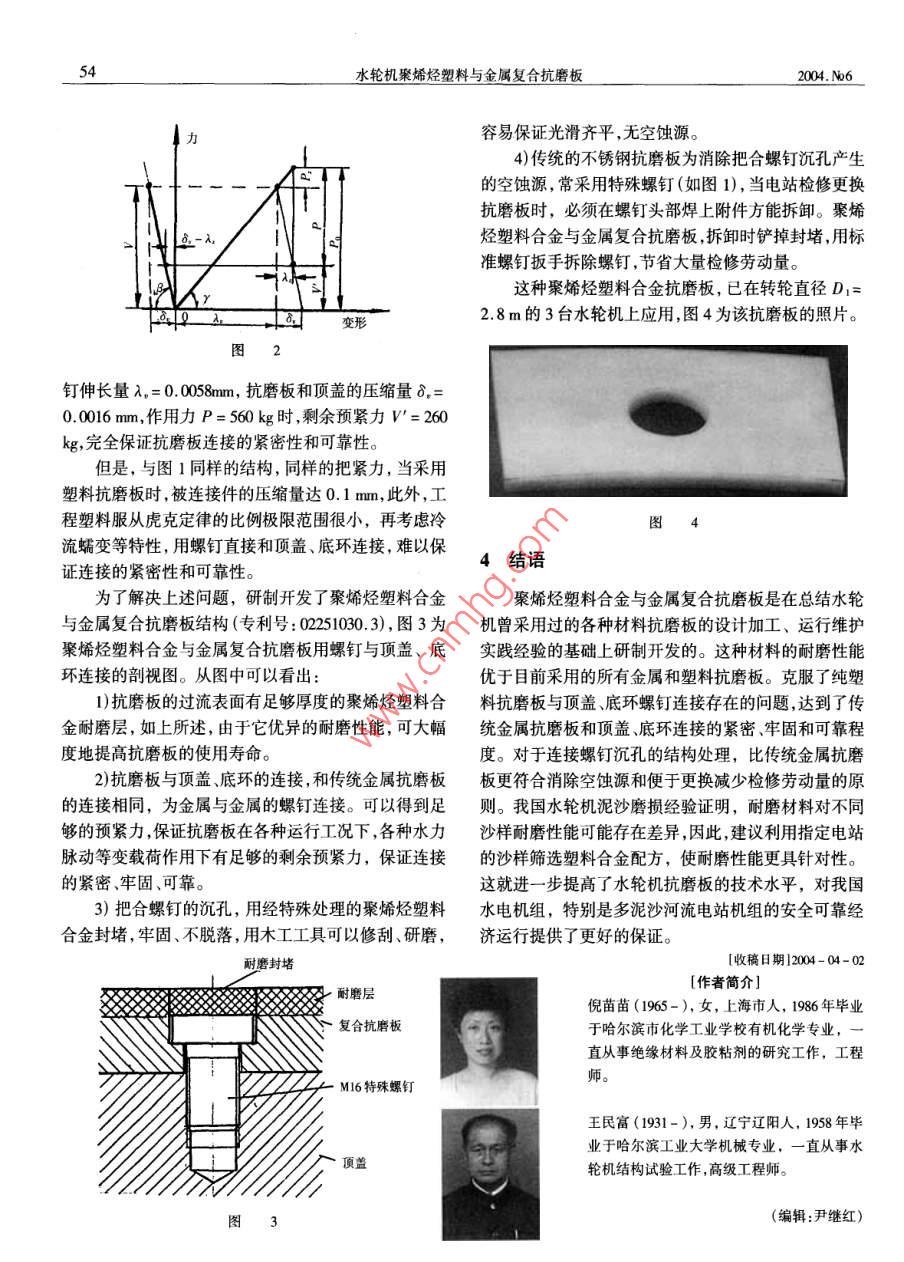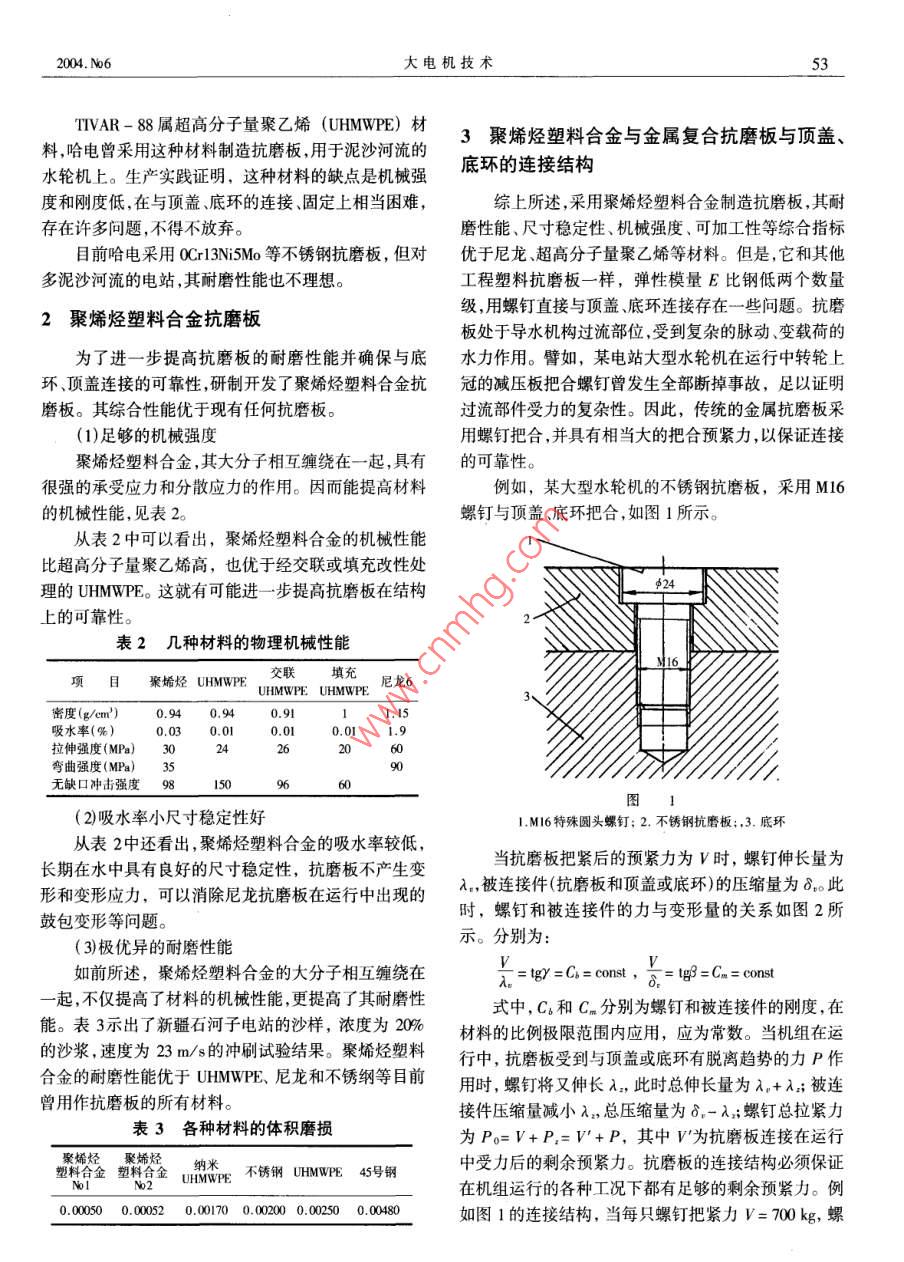 52水輪機(jī)聚烯烴塑料與金屬復(fù)合抗磨板2004. No6_倪苗苗,王民富',姚傳賢(1.哈爾濱大電機(jī)研究所,黑龍江哈爾濱150040;2.哈爾濱新科發(fā)電設(shè)備配件廠,黑龍江哈爾濱150040)[摘要]介紹了水輪機(jī)抗磨板的使用情況及存在的問題。將新型抗磨板材料聚烯烴塑料合金與其他材料的耐磨性能進(jìn)行了比較。結(jié)果表明,聚烯烴塑料合金與金屬復(fù)合抗磨板具有優(yōu)良的耐磨性能,尺寸穩(wěn)定性機(jī)械強(qiáng)度以及可加工性,并確保了抗磨板與頂蓋、底環(huán)連接的可靠性。[關(guān)鍵詞]水輪機(jī);聚烯烴塑料;抗磨板[中圖分類號(hào)]TK730.5"3 [文獻(xiàn)標(biāo)識(shí)碼]B[文章編號(hào)1000-3983(2004)06-0052-03The Turbine Facing Plate Compounded Polyolefine and MetalNI Miao-miao', WANG Min-fu', YAO Chuan-xian2(1. Harbin Institute of Large Elecric Machine , Harbin 150040, China;2. Harbin Xinke Power Equipment fttings Plant, Harbin 150040 China)Abstract: The service status and existing questions of turbine facing plate were introduced. Thewear-resistance performances of a new facing plate material Polyolefine - metal were compared with those ofother materials. The results show that the facing plate compounded Polyolefine and metal has goodwearresistance performances, size stability , mechanical strengh and machnability , and the rliablity of fit-ting the facing plate on head cover and bottorn ring is ensured .Key words: hydaulic turbine; Polyolefine; facing plate同時(shí)展示了POLY- HI/ MENASHA公司(美國)的1前言TIVAR - 88和TTVAR- 100產(chǎn)品、性能以及應(yīng)用業(yè)績資在水輪機(jī)運(yùn)行中,導(dǎo)水機(jī)構(gòu)頂蓋和底環(huán)的過流表料。其中TTVAR - 88的沙漿耐磨試驗(yàn),即材料在沙漿面受到高速水流的沖刷作用,當(dāng)停機(jī)備用時(shí),導(dǎo)葉端面中以1750r/ min轉(zhuǎn)速,旋轉(zhuǎn)7.5h,以碳鋼磨損率為漏水,受到間隙空蝕的損害。因此,在結(jié)構(gòu)設(shè)計(jì)中,應(yīng)100,被試材料失重量相對100而言,數(shù)字越小,耐磨性對頂蓋和底環(huán)與導(dǎo)葉端面對應(yīng)處的過流表面采取防護(hù)能越好,其結(jié)果見表1。措施,即鑲抗磨板。表1各種材料磨損率早期的抗磨板,特別是對于鑄鐵頂蓋和底環(huán),多采用普通鋼板,用螺釘把合結(jié)構(gòu)。磨損后的抗磨板在機(jī)材料磨損率TIVAR- 88碳鋼100組大修時(shí)可更換修復(fù)。但普通鋼板耐泥沙磨損性能TVAR- 10015聚乙烯醇縮乙醛110差,很不理想。曾采用過耐磨性能較好的Cr5Cu鋼板或尼龍66聚丙烯190者在普通鋼的母體上采用寬帶堆焊不銹鋼,但工藝?yán)Ь郯敝琁磷青銅193聚四氟乙烯490難,受到一定限制。也曾采用過MC尼龍抗磨板,工藝304不銹鋼34低密度聚乙烯530比較簡單,耐磨性能也較好。但是材料的吸水率大,尺高密度聚乙烯36硬氯丁橡膠800聚碳酸酯山核桃木967寸穩(wěn)定性差,用螺釘把合到頂蓋、底環(huán)上也存在問題。在運(yùn)行中出現(xiàn)局部鼓包變形,電站很難處理而被放棄考慮到TTVAR-88吸水率和耐磨性能都優(yōu)于尼使用。龍,用作抗磨板可能克服尼龍抗磨的缺點(diǎn),便按劉家峽80年代初,香港冠德器材公司向哈爾濱電機(jī)廠有電站水輪機(jī)抗磨板的尺寸,訂制了兩塊TTVAR- 88限責(zé)任公司(簡稱哈電)介紹德國FIBERGLIDE軸承,板。裝機(jī)試用結(jié)果,耐磨性能令人滿意。2004. No6大電機(jī)技術(shù)53TIVAR - 88屬超高分子量聚乙烯(UHMWPE) 材3聚烯烴塑料合金與金屬復(fù)合抗磨板與頂蓋、料,哈電曾采用這種材料制造抗磨板,用于泥沙河流的底環(huán)的連接結(jié)構(gòu)水輪機(jī)上。生產(chǎn)實(shí)踐證明,這種材料的缺點(diǎn)是機(jī)械強(qiáng)度和剛度低,在與頂蓋、底環(huán)的連接、固定上相當(dāng)困難,綜上所述,采用聚烯烴塑料合金制造抗磨板,其耐存在許多問題,不得不放棄。磨性能、尺寸穩(wěn)定性、機(jī)械強(qiáng)度、可加工性等綜合指標(biāo)目前哈電采用0Cr13Ni5Mo等不銹鋼抗磨板,但對優(yōu)于尼龍、超高分子量聚乙烯等材料。但是,它和其他多泥沙河流的電站,其耐磨性能也不理想。工程塑料抗磨板- -樣,彈性模量E比鋼低兩個(gè)數(shù)量級(jí),用螺釘直接與頂蓋、底環(huán)連接存在一些問題??鼓?聚烯烴塑料合金抗磨板.板處于導(dǎo)水機(jī)構(gòu)過流部位,受到復(fù)雜的脈動(dòng)、變載荷的為了進(jìn)一步提高抗磨板的耐磨性能并確保與底水力作用。譬如,某電站大型水輪機(jī)在運(yùn)行中轉(zhuǎn)輪上環(huán)頂蓋連接的可靠性,研制開發(fā)了聚烯烴塑料合金抗冠的減壓板把合螺釘曾發(fā)生全部斷掉事故,足以證明磨板。其綜合性能優(yōu)于現(xiàn)有任何抗磨板。過流部件受力的復(fù)雜性。因此,傳統(tǒng)的金屬抗磨板采(1)足夠的機(jī)械強(qiáng)度用螺釘把合,并具有相當(dāng)大的把合預(yù)緊力,以保證連接聚烯烴塑料合金,其大分子相互纏繞在一-起,具有的可靠性。很強(qiáng)的承受應(yīng)力和分散應(yīng)力的作用。因而能提高材料例如,某大型水輪機(jī)的不銹鋼抗磨板,采用M16的機(jī)械性能,見表2。螺釘與頂蓋、底環(huán)把合,如圖1所示。從表2中可以看出,聚烯烴塑料合金的機(jī)械性能比超高分子量聚乙烯高,也優(yōu)于經(jīng)交聯(lián)或填充改性處理的UHMWPE。這就有可能進(jìn)--步提高抗磨板在結(jié)構(gòu)上的可靠性。2表2幾種材料的物理 機(jī)械性能M16交聯(lián)填充項(xiàn