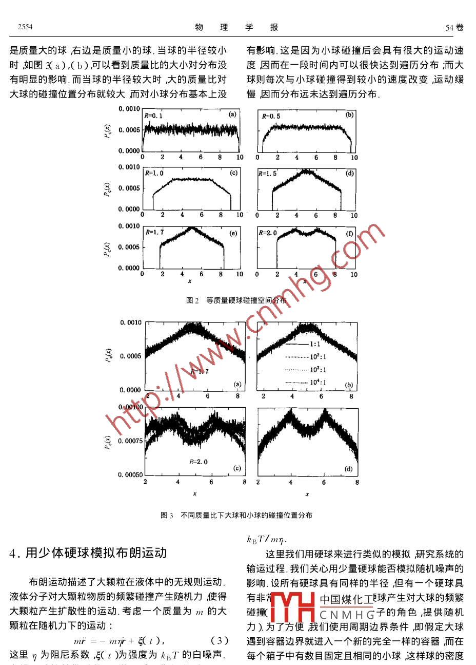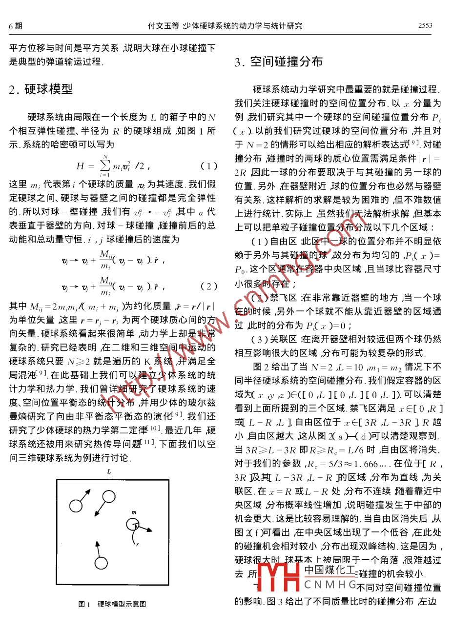 第54卷第6期2005年6月物理學(xué)報(bào)1000-3290/2005/5406y25520ACTA PHYSICA SINICA⊙2005Chin.Phys.So.少體硬球系統(tǒng)的動(dòng)力學(xué)與統(tǒng)計(jì)研究*付文玉侯錫苗賀麗霞鄭志剛北京師范大學(xué)物理系北京100875)004年8月18日收到2004年11月8日收到修改稿)研究了少數(shù)幾個(gè)封閉于箱子中的硬球組成的系統(tǒng)的動(dòng)力學(xué)與統(tǒng)計(jì)行為.著重研究單粒子位形空間的碰撞分布計(jì)算表明硬球的半徑較小時(shí)單粒子統(tǒng)計(jì)分布函數(shù)在空間主要是均勻分布著半徑的增大均勻分布部分逐漸減小,當(dāng)硬球半徑與箱子尺寸比值超過(guò)臨界值時(shí)單粒子分布函數(shù)呈現(xiàn)雙峰形式,還利用少體硬球系統(tǒng)模擬布朗運(yùn)動(dòng)研究表明當(dāng)硬球系統(tǒng)作為介質(zhì)時(shí)系統(tǒng)不存在擴(kuò)散過(guò)程發(fā)現(xiàn)大粒子的平均平方位移與時(shí)間是平方關(guān)系,說(shuō)明大粒子在硬球介質(zhì)中的輸運(yùn)是彈道輸運(yùn)過(guò)程關(guān)鍵詞:硬球,動(dòng)力學(xué),布朗運(yùn)動(dòng),遍歷PACC 0500引言另一方面熱力學(xué)體系非平衡性質(zhì)與微觀動(dòng)力學(xué)特征之間的關(guān)系研究近年來(lái)成為新的熱點(diǎn).一方面統(tǒng)計(jì)力學(xué)的研究對(duì)象——熱力學(xué)系統(tǒng)的一個(gè)根人們探討了熱力學(xué)系統(tǒng)的輸運(yùn)系數(shù)的規(guī)律以及它們本特點(diǎn)就是熱力學(xué)過(guò)程的不可逆性1]不可逆性在與非線性動(dòng)力學(xué)指數(shù)如李雅普諾夫指數(shù)KS熵分熱力學(xué)上由第二定律給出而其微觀動(dòng)力學(xué)根源迄今維等之間的關(guān)系,并已經(jīng)取得了豐富的成果61.另為止一直是統(tǒng)計(jì)力學(xué)中一個(gè)古老而重要的問(wèn)題.在牛一方面對(duì)非平衡問(wèn)題的研究如小體積的的非平衡頓力學(xué)的框架下系統(tǒng)的幾率分布演化由劉維定理給過(guò)程如熱傳導(dǎo)、擴(kuò)散、自由膨脹、絕熱壓縮等這些研出了可逆的描述. boltzmann推導(dǎo)出稀薄氣體單體約究中很多問(wèn)題尚不清楚特別是系統(tǒng)遍歷性在其中的化概率分布的演化方程并推導(dǎo)出H定理使我們從作用少體系統(tǒng)的熱力學(xué)定律成立與表現(xiàn)等問(wèn)題.這統(tǒng)計(jì)層面上看到了不可逆性.為了從動(dòng)力學(xué)上解釋這些研究有助于從微觀動(dòng)力學(xué)上理解宏觀非平衡過(guò)程定理, boltzmann提出了遍歷性假說(shuō)2].遍歷性理的起源值得引起注意論架起了從動(dòng)力學(xué)向統(tǒng)計(jì)過(guò)渡的橋梁.二十世紀(jì)非線動(dòng)力學(xué)與統(tǒng)計(jì)的關(guān)系問(wèn)題研究中一個(gè)非常經(jīng)典性動(dòng)力學(xué)和混沌的硏究使人們對(duì)動(dòng)力學(xué)系統(tǒng)的統(tǒng)計(jì)且有效的模型是硬球系統(tǒng)η8).本文將研究幾個(gè)封閉特征有了深一步旳理解在此期間遍歷性、混合性、K于箱子中的硬球組成的系統(tǒng)的動(dòng)力學(xué)與統(tǒng)計(jì)行為.我流等不同概念提了岀來(lái)3研究表明動(dòng)力學(xué)系統(tǒng)的們首先研究單粒子位形空間的碰撞分布.研究表明全局性混沌是系統(tǒng)統(tǒng)計(jì)成立的根本要素.在此意義碰撞分布可以分為幾個(gè)區(qū)域.當(dāng)硬球的半徑較小時(shí),上系統(tǒng)的無(wú)限大自由度已不是決定性的因素.人們單粒子統(tǒng)計(jì)分布函數(shù)在空間主要是均勻分布隨著半已建立了少自由度系統(tǒng)的統(tǒng)計(jì)力學(xué)及熱力學(xué)4遍徑的增大均勻分布部分逐漸減小.當(dāng)硬球半徑與箱歷性理論也不僅僅是數(shù)學(xué)家們的研究對(duì)象,它也為物子尺寸比值超過(guò)臨界值時(shí)單粒子分布函數(shù)呈現(xiàn)雙峰理學(xué)家理解熱力學(xué)系統(tǒng)中的許多問(wèn)題如相變玻璃形式田八砸琙玄統(tǒng)模擬了大粒子在小態(tài)等提供了新的啟示561硬球中國(guó)煤化工發(fā)現(xiàn)硬球系統(tǒng)不存在擴(kuò)散CNMH應(yīng)子平均國(guó)家重點(diǎn)基礎(chǔ)研究規(guī)劃973項(xiàng)目批準(zhǔn)號(hào)x2000077304),全國(guó)優(yōu)秀博士論文作者專項(xiàng)基金批準(zhǔn)號(hào)200120),教育部青年教師獎(jiǎng)專項(xiàng)基金項(xiàng)目(批準(zhǔn)號(hào)209)高校博士點(diǎn)基金批準(zhǔn)號(hào)027011)霍英東教育基金會(huì)(批準(zhǔn)號(hào)81006)北師大本科生研究基金資助的課題Emai7方數(shù)揭 bnu. edu. cn6期付文玉等少體硬球系統(tǒng)的動(dòng)力學(xué)與統(tǒng)計(jì)研究2553平方位移與時(shí)間是平方關(guān)系說(shuō)明大球在小球碰撞下是典型的彈道輸運(yùn)過(guò)程3.空間碰撞分布2.硬球模型硬球系統(tǒng)動(dòng)力學(xué)硏究中最重要旳就是碰撞過(guò)程我們關(guān)注硬球碰撞時(shí)的空間位置分布.以x分量為硬球系統(tǒng)由局限在一個(gè)長(zhǎng)度為L(zhǎng)的箱子中的N例我們研究其中一個(gè)硬球的空間碰撞位置分布P。個(gè)相互彈性碰撞、半徑為R的硬球組成如圖1所(α)以前我們研究過(guò)硬球的空間位置分布并且對(duì)示.系統(tǒng)的哈密頓可以寫為于N=2的情形可以給出相應(yīng)的解析表達(dá)式9對(duì)碰/2撞分布碰撞時(shí)的兩球的質(zhì)心位置需滿足條件|r|=2R因此一球的分布要取決于與其碰撞的另一球的這里m;