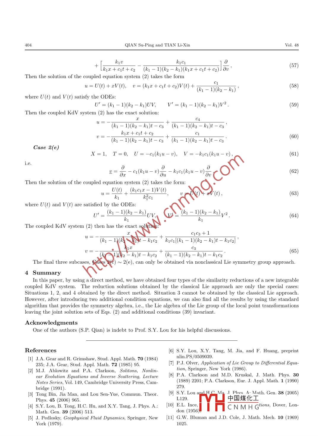 Commun. Theor. Phys. (Beijing, China) 48 (2007) pp. 399- 404@ International Academic PublishersVol. 48, No. 3, September 15, 2007Similarity Reduction Analysis for a Coupled KdV System*QIAN Su-Ping1,2,t and TIAN Li-Xin2'Department of Mathematics, Changshu Institute of Technology, Changshu 215500, China2Nonlinear Scientific Research Center, Faculty of Science, Jiangsu University, Zhenjiang 212013, China(Received September 4, 2006)A bstract Using the direct method for a coupled KdV system, six types of the similarity reductions are obtained. Thegroup explanation of the results is also given. It is pointed out that, in order to find all the results by nonclassical Lieapproach, two additional condition equations should be satisfied at the same time together with two original equations.PACS numbers: 02.30.Jr, 02.30.Ik, 05.45.Yv, 47.32.-y, 47.35.+iKey words: coupled KdV equations, direct method, nonclassical Lie approach1 IntroductionIn this paper, we study a new integrable coupled KdVequation system:tion has been widely used in various natural science fields△{})=ut +ux-(k1- k2 + k(k2)uxespecially in almost all branches of physics. Some kindsof coupled KdV equations have also been introduced in+ k1VUx + k1W0x- VUx = 0,the literature such as one describing two resonantly inter-0?)=v+Uxxr +(k1- kz- 1)vvx + k20Uxacting normal modes of internal-gravity-wave motion ina shallow stratified liquid.1 In principle, many of other+ kzUUx - k1k2Ulx = 0,(2)coupled KdV equations are introduced mathematically be-where k1 and k2 are two arbitrary constants. It is clearcause of their integrability.l2,3] In Ref. [4], by using a long-that the coupled KdV system (2) is a special case for thewave approximation, Lou et al. derived some new typesphysical systems (1). Because of the important applica-of coupled KdV equation systems with some arbitrary pa-tions of the model and because the model has not yet beenrameters from a two-layer fluid model:deeply studied, especially, there is no study on its groupUt + Q1VUx + (a202 + Q3WV + Q4Uxx + o5u2)x= 0,invariant solutions, here, we use CK's direct method toVt +δ10Ux + (δ2u2 + δ3u0 + δ4Vx +δ502)x = 0,(1reduce the partial differential equation (PDE) system toan ordinary differential equation (ODE) system. A groupoceanic phenomena such as the atmospheric blockings,theoretical explanation of the results obtained by the di-the interactions between the atmosphere and ocean,5l therect method is provided in terms of nonclassical symmetryoceanic circulations and even hurricanes or typhoons.reduction method.The study of symmetries is one of the most powerfulmethods in every branch of natural science especially in2 Similarity Reductions from Direct Methodintegrable systems because of the existence of infinitelyThe CK's direct similarity reduction method impliesmany symmetries. To find the Lie point symmetry groupthat it is possible to find full symmetry groups of the Cou-of a nonlinear system, there is a standard method thankspled KdV system by a simple direct method without usingto the famous first fundamental theorem of Lie.7] And theany group theory. All the similarity solutions of the formstandard method had been widely used to find Lie pointsymmetry algebras and groups for almost all the known in-u(x,t) = U(x,t, P(ξ(x, t)(x,))),tegrable systems. However, to find non-Lie point symme-0(x,t)= V(x,t, P(x, t),(x,)),(3)try groups is still quite difficult. Furthermore, even for thewhere U, V, P, Q, and ξ are functions of the indicatedLie point symmetry groups, the final known expressionsvariables and P(E) and Q(ξ) satisfy an ordinary differen-may be quite complicated, and difficult for real applica-tial equation, may be obtained by substituting Eqs. (3tions especially for physicists and other non-mathematicalscientists. In Ref. [8], Clarkson and Kruskal (CK) intro-into Eqs. (2). However, similar to single partial differen-duced a simple direct method to derive symmetry reduc-tial equation case, one can prove that it is sufficient totions of a nonlinear system without using any group the-seek a similarity reduction of Eqs. (2) in a special form: .ory. For many types of nonlinear systems, the method canu(x,t)= ar(x,t) + Br(x, t)P(x,)),be used to find all the possible similarity reductions. Thisv(x,t) = a2(x,t) + B2(x, t)(x,t),(4)fact hints that there is a simple method to find generalizedsymmetry groups for many types of nonlinear equations.rather than the most general forms (3). .*The project supported by National Natural Science Foundation of China under Gr中國煤化工Science Foundationof Jiangsu Province under Grant No. BK2002003, the Project of Technology InnovatiYHC N M H GJiangsu Province inYear 2006 under Grant No. 72, and the Natural Science Directed Foundation of the Jiangsu Higher Education Institutions under GrantNo. 06KJD1 10001t E-mail: qsp@cslg.edu.cn.400QIAN Su-Ping and TIAN Li-XinVol. 48Substituting Eqs. (4) into the equation△| = 0 leads toβ$3P" + 3ξx(βrξx)xP" +[β1ξt + β1ξxxx + kqa2βrξx- (k1- k2 + ki kx2)a1β1ξx+ 3(β1xξx)x]P'-(k1- k2 + kikx)βξx PP' + k;μβ2β1ξaQP' + k1β1μβ2ξx PQ'-險ξxQQ' + (kra1-a2)B2ξxQ' - (k1- k2 + k1kz2)βrβBrxP2 + k1(β1$2)x PQ+ [3rt + Birrr -(ki - k:2 + kikz)(anB1)x + k1(a2β1)x]P - B2B2xQ2 - [(a2B2)x- k1(a12)x]Q+ [ant + Q1xxx- (ki - k2 + k1k2)a1Q1x + kr(a1Q2)x - a2Q2x]=0,(5)where the primes are derivatives with respect to ξ. Equation (5) is an ODEof {P,Q} if and only if the ratios of thecofficients of different derivatives and powers of P and Q are functions ofξ . That is to say, the following constrainedconditions for ξx≠0 must be satisfied:(B132)x = T6(ξ)Br$2,(11)β1β2ξx = T1(E)βζ3,(6)(a2B2)x - k:1(a132)x = F7(ξ)Brξ2,(12)β陘ξ∞= F2(ξ)Br5,(7(B1ξx)xξx = T8(ξ)β1ξ2,(13)(k1a1 - a2)B2ξx = T3()Brs2,(8β2B2x = F4(ξ)β1rζ3 ,(9β陘ξx = Fo(ξ)Brζ3 ,(14)ββ2ξ = Ts(E)βrζ2,(10)β1βrx = Tno()B15,(15)β1ξt + Brxxx + kra2Brξμ -(ki - k2 + k1k2)ar1βnξx + 3(3x2ξx)x = Fn(E)β1ζ ,(16) .β
