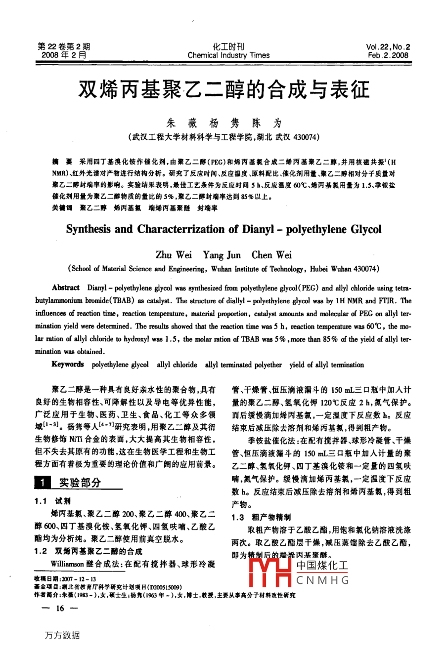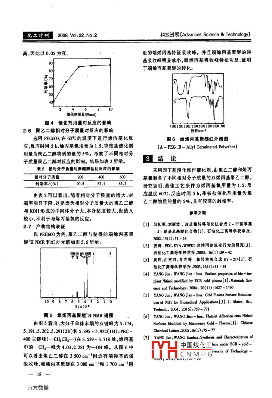 第22卷第2期化工時(shí)刊Vol 22, No. 2208年2月Chemical Industry TimesFeb2.2008雙烯丙基聚乙二醇的合成與表征朱薇楊雋陳為(武漢工程大學(xué)材料科學(xué)與工程學(xué)院,湖北武漢430074)摘要采用四丁基溴化銨作催化劑,由聚乙二醇(PEG)和烯丙基氯合成二烯丙基聚乙二醇,并用核磁共振(HNMR)紅外光譜對(duì)產(chǎn)物進(jìn)行結(jié)構(gòu)分析。研究了反應(yīng)時(shí)間、反應(yīng)溫度、原料配比催化劑用量聚乙二醇相對(duì)分子質(zhì)量對(duì)豪乙二醇封端率的影響。實(shí)驗(yàn)結(jié)果表明,最佳工藝條件為反應(yīng)時(shí)間5h反應(yīng)溫度60℃、烯丙基氯用量為1.5、季銨鹽催化劑用量為聚乙二醇物質(zhì)的量比的5%,聚乙二醇封端率達(dá)到85%以上。關(guān)鍵詞聚乙二醇烯丙基氯端烯丙基聚醚封端率Synthesis and Characterrization of Dianyl- polyethylene GlycolZhu Wei Yang Jun Chen Wei(School of Material Science and Engineering, Wuhan Institute of Technology, Hubei Wuhan 430074)Abstract Dianyl-polyethylene glycol was synthesized from polyethylene glycol( PEG)and allyl chloride using tetrabutylammonium bromide(TBaB)as catalyst. The structure of diallyl- polyethylene glycol was by 1H NMR and FTIR. Theinfluences of reaction time, reaction temperature, material proportion, catalyst amounts and molecular of PEG on allyl ter-mination yield were determined. The results showed that the reaction time was 5 h, reaction temperature was 60C, the mo-lar ration of allyl chloride to hydroxyl was 1.5, the molar ration of TBaB was 5%, more than 85% of the yield of allyl ter-mination was obtainedKeywords polyethylene glycol allyl chloride allyl terminated polyether yield of allyl temination聚乙二醇是一種具有良好親水性的聚合物,具有管、干燥管、恒壓滴液漏斗的150mL三口瓶中加入計(jì)良好的生物相容性、可降解性以及導(dǎo)電等優(yōu)異性能,量的聚乙二醇、氫氧化鉀120℃反應(yīng)2h,氮?dú)獗Wo(hù)廣泛應(yīng)用于生物、醫(yī)藥、衛(wèi)生、食品、化工等眾多領(lǐng)而后緩慢滴加烯丙基氯,一定溫度下反應(yīng)數(shù)h反應(yīng)域-3]。楊雋等人4-7研究表明用聚乙二醇及其衍結(jié)束后減壓除去溶劑和烯丙基氯得到粗產(chǎn)物。生物修飾NT合金的表面,大大提高其生物相容性,季銨鹽催化法:在配有攪拌器、球形冷凝管、干燥但不失去其原有的功能這在生物醫(yī)學(xué)工程和生物工管、恒壓滴液漏斗的150mL三口瓶中加入計(jì)量的聚程方面有著極為重要的理論價(jià)值和廣闊的應(yīng)用前景。乙二醇、氫氧化鉀、四丁基溴化銨和一定量的四氫呋1實(shí)驗(yàn)部分喃,氮?dú)獗Wo(hù)。緩慢滴加烯丙基氯,一定溫度下反應(yīng)數(shù)h。反應(yīng)結(jié)束后減壓除去溶劑和烯丙基氯,得到粗1.1試劑產(chǎn)物。烯丙基氯、聚乙二醇200、聚乙二醇400聚乙二1.3粗產(chǎn)物精制醇600、四丁基溴化銨、氫氧化鉀、四氫呋喃、乙酸乙取粗產(chǎn)物溶于乙酸乙酯,用飽和氯化鈉溶液洗滌酯均為分析純。聚乙二醇使用前真空脫水。兩次。取乙酸乙酯層干燥,減壓蒸餾除去乙酸乙酯12雙烯丙基聚乙二醇的合成即為精制后的端烯丙基聚醚Williamson醚合成法:在配有攪拌器、球形冷凝中國(guó)煤化工收稿日期:2007-12-13CNMHG基金項(xiàng)目:北省教育廳科學(xué)研究計(jì)劃項(xiàng)目(D200515009)作者簡(jiǎn)介:朱薇(1983-),女,碩士生;楊雋(1963年-),女博士教授,主要從事高分子材料改性研究朱薇等雙烯丙基聚乙二醇的合成與表征2008.vo.22,No.2工時(shí)刊14分析與表征23反應(yīng)溫度對(duì)反應(yīng)的影響采用汞鹽加成法測(cè)定不飽和值;以氯仿為溶劑、選用PEC600,在30~70℃的溫度下進(jìn)行烯丙基TMS做內(nèi)標(biāo)用 Mercury Plus-400型核磁共振儀上進(jìn)化反應(yīng),烯丙基氯的相對(duì)用量為20,反應(yīng)時(shí)間5h行HNMR分析;樣品用KBr晶片涂膜制樣,用Ncoe季銨鹽催化劑用量為聚乙二醇物質(zhì)的量的5%??糏mpact420型傅立葉紅外光譜儀測(cè)定試樣的紅外光察反應(yīng)溫度對(duì)反應(yīng)的影響,結(jié)果如圖2所示。譜,其分辨率為△y=4cm-1,64次掃描。2L結(jié)果與討論21季銨鹽催化法與 Williamson法的比較以PEG兩種方法均在60℃下回流反應(yīng)4h制備PEG-400端烯丙基聚醚,烯丙基氯相對(duì)用量2.0(烯丙基氯與聚乙二醇羥基物質(zhì)的量之比)采用四丁基304050607080溴化銨作為季銨鹽催化劑,季銨鹽催化劑用量為聚乙反應(yīng)溫度℃醇物質(zhì)的量的5%。兩種方法所得端烯丙基聚醚圖2反應(yīng)溫度封端率的影響封端率(端烯丙基聚醚中烯丙基占端基的比例,通過從圖2中可以看出,在相同的反應(yīng)時(shí)間下,隨著測(cè)定聚醚不飽和值計(jì)算得出)。如表1所示反應(yīng)溫度的增高,封端率逐漸增大。因此,宜采用較1季銨鹽催化法與 Williamson法的對(duì)比高的反應(yīng)溫度,以縮短反應(yīng)時(shí)間。但是溫度過高容易反應(yīng)方法季銨鹽催化法Williamson法發(fā)生凝膠,產(chǎn)物顏色加深。因此選用60℃。封端率/(%)77.424烯丙基氯用量對(duì)反應(yīng)的影響選用PEc600,在60℃的溫度下進(jìn)行烯丙基化反季銨鹽催化法的封端率高于 Williamson法,并且應(yīng),反應(yīng)時(shí)間5h,季銨鹽催化劑用量為聚醚物質(zhì)的量不必首先進(jìn)行聚醚的醇鹽化轉(zhuǎn)變,減少了反應(yīng)步驟,的5%。烯丙基氯用量對(duì)反應(yīng)的影響如圖3所示。綜合考慮采用季銨鹽催化法。22反應(yīng)時(shí)間對